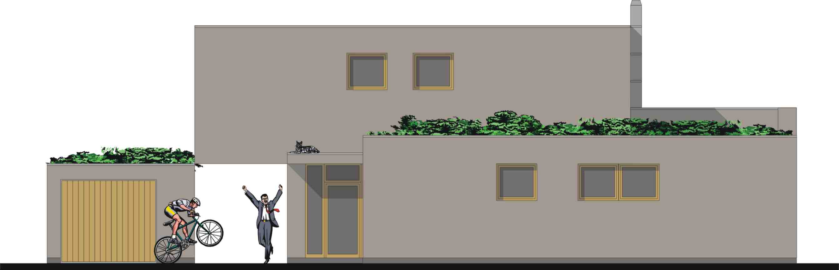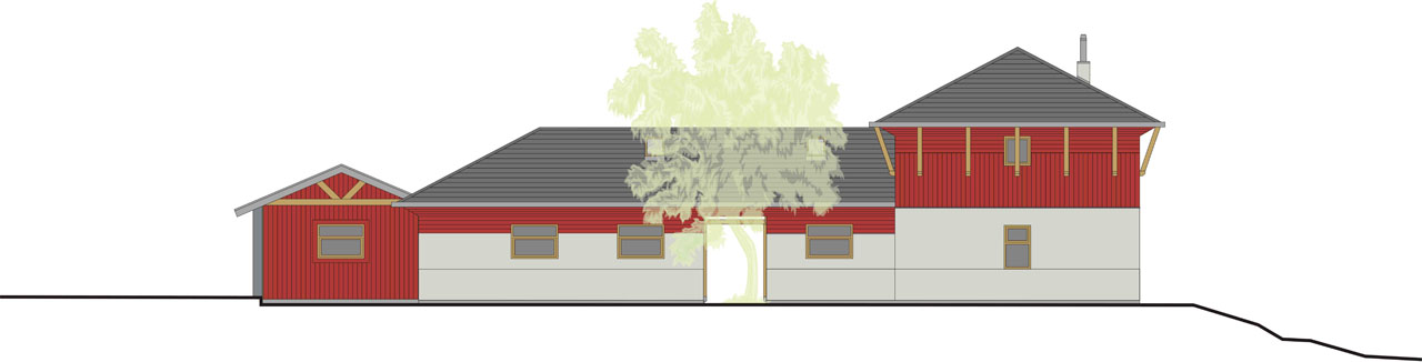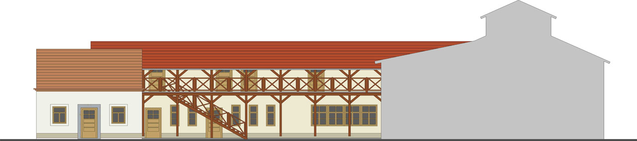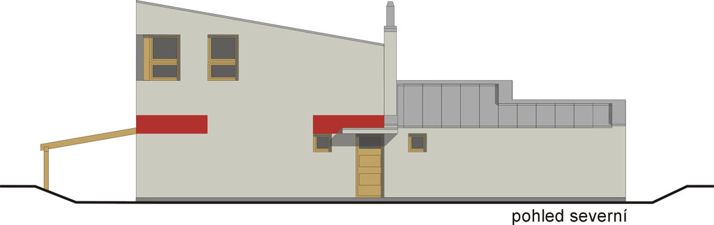 Na místě dnešního polorozpadlého domu vyroste takřka v původní stopě nový dům, natočený do návsi okapovou hranou, s fragmentem původní zdi a malou kavárničkou. Ostatní okenní otvory zůstávají minimální, uliční fasáda je severní a hodně zasažená hlukem z komunikace I. třídy, takže se dům otevírá výhradně k jihu, do dvora.