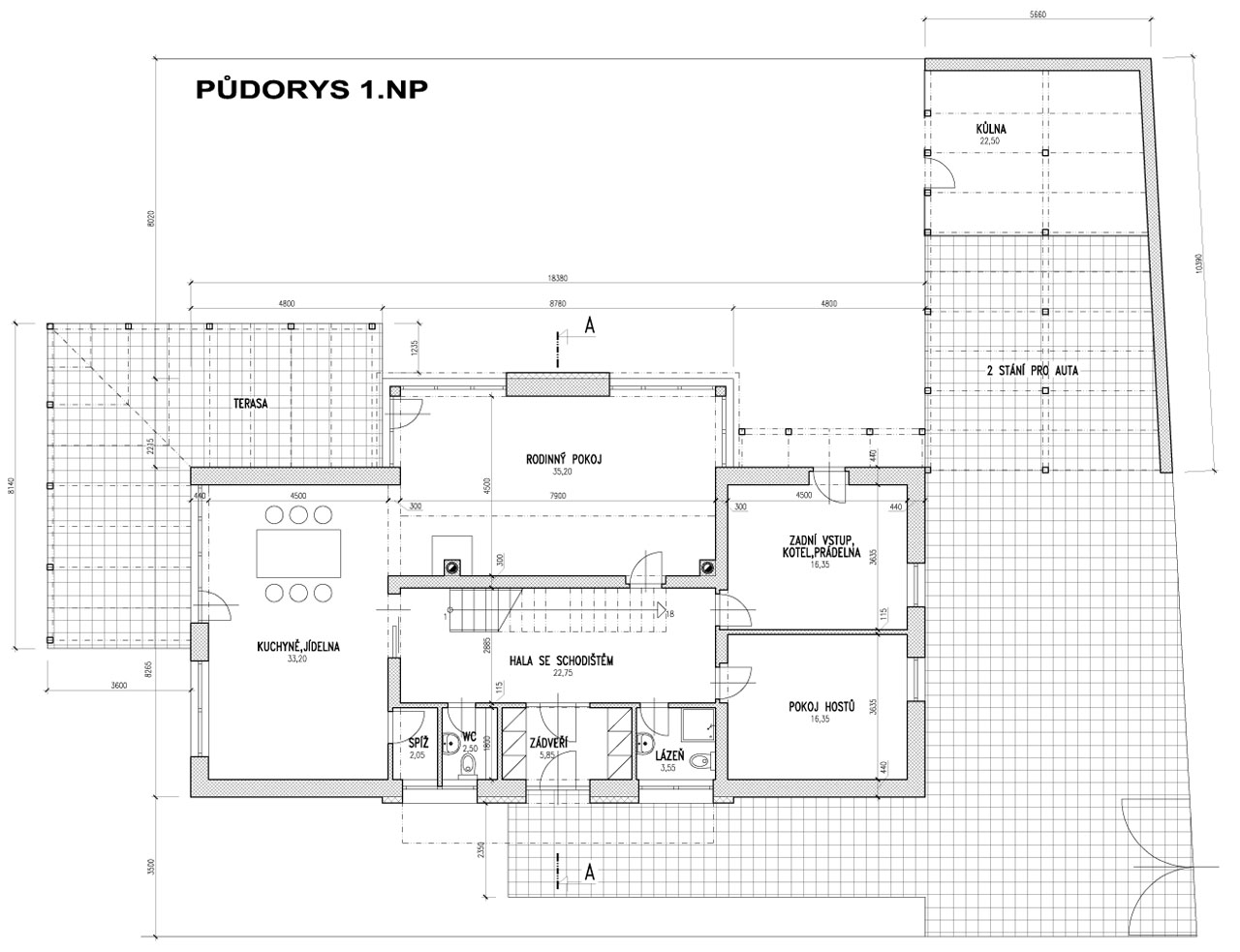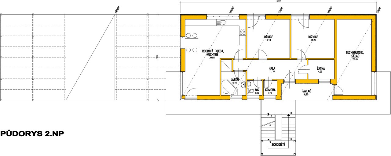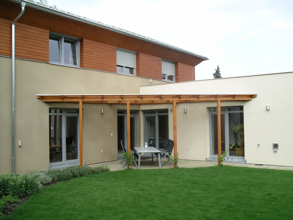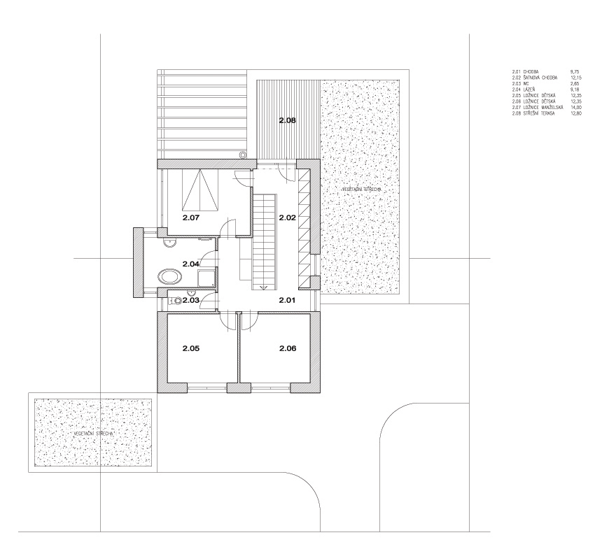 Zahrnuje prostorově úsporné bydlení starších rodičů a v přízemí garsoniéru svobodného syna se samostatným vstupem v patře.
