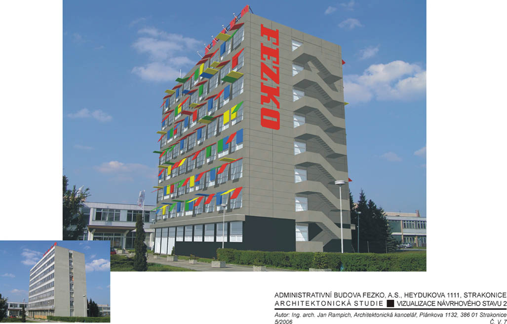 Zásadní rekonstrukce vzhledu administrativní budovy firmy vyrábějící autotextilie aluduje ikonografii jejích úspěšných autopotahů; obklad z fasádních desek Swisspearl a stínící barevné příklopné okenice z perforovaného hliníkového plechu.