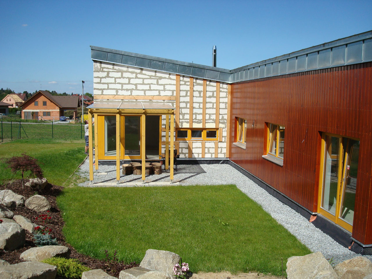 Vstup na mírně svažitý pozemek je od severu, což umožnilo dům orientovat takřka ideálně. Je složený ze dvou hmot, z nichž větší je kryta střechou sedlovou, nižší alternativně střechou sedlovou či plochou.