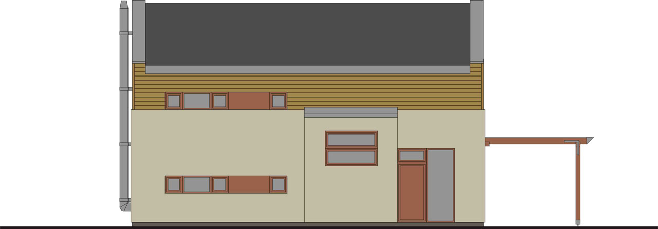 Menší rodinný domek na kraji satelitní výstavby u lesa s požitím účelné formy pultové střechy (zvyšuje světlou výšku v hlavní obytné místnosti) dokazuje, že bungalov nemusí mít vždy jen střechu sedlovou či valbovou. Dům vychází z našeho systému Growing House SKANDISENSE z r. 2005 (viz odkaz).