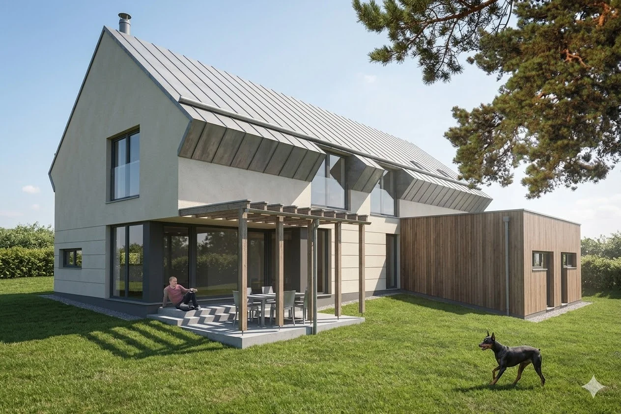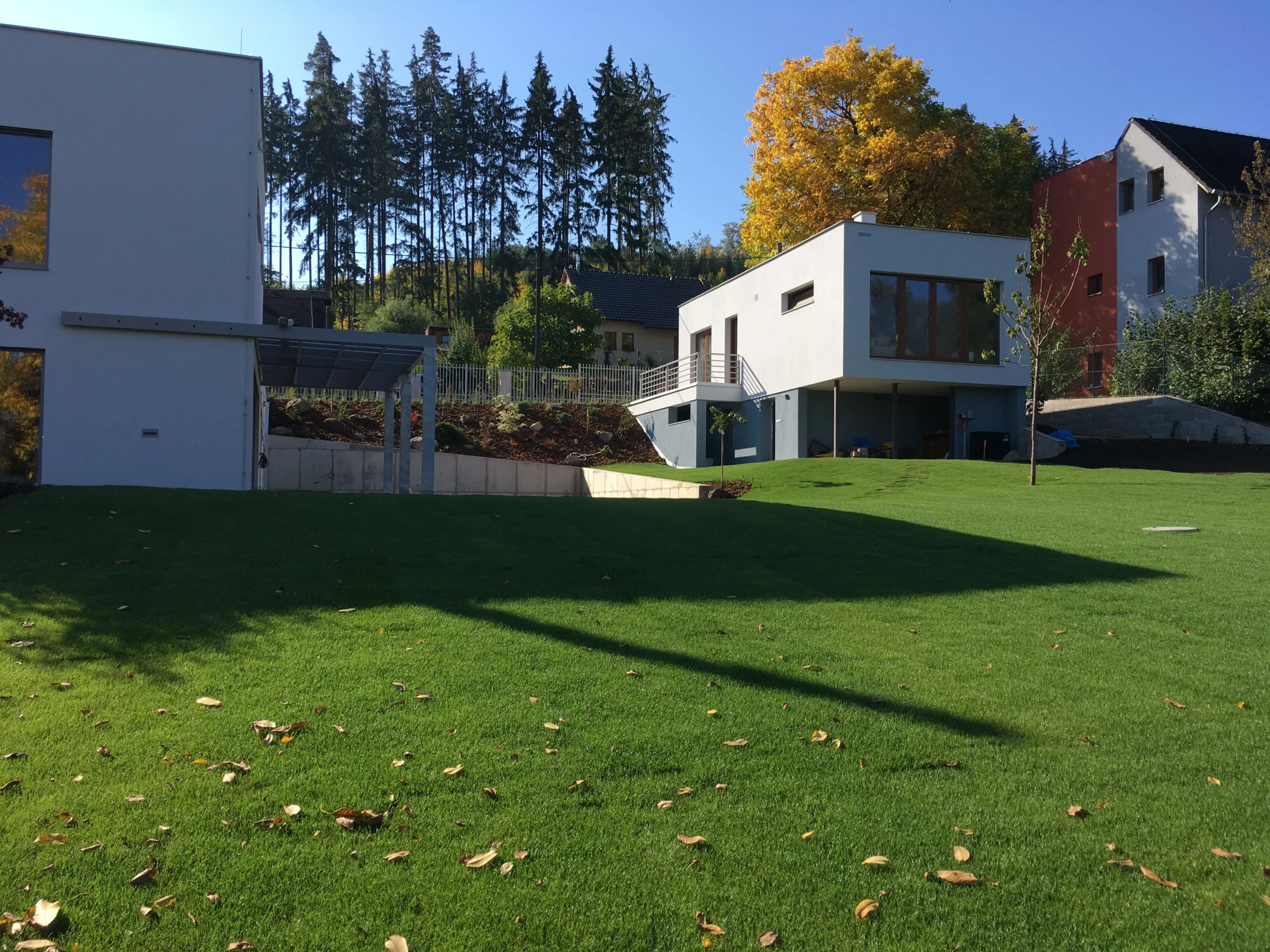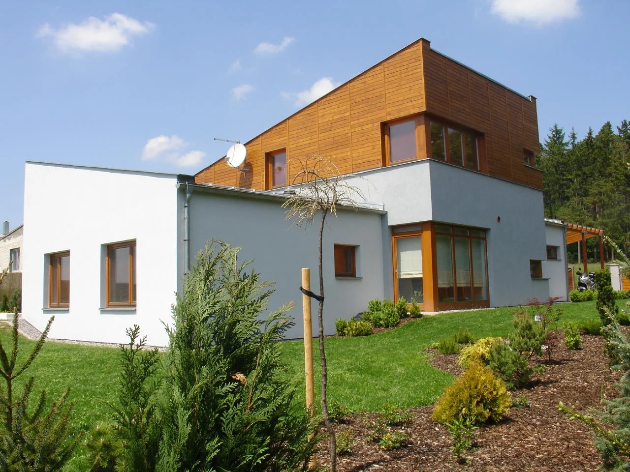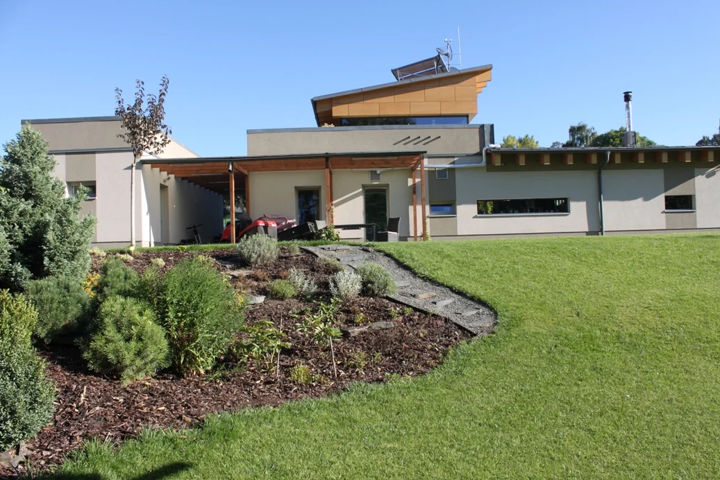 V tomto výjimečném obytném satelitu u Plzně předepisuje regulační plán výhradně sedlovou střechu. Nebylo snadné se tu také vyrovnat s terénem, který značně klesá po úhlopříčce stavební parcely.