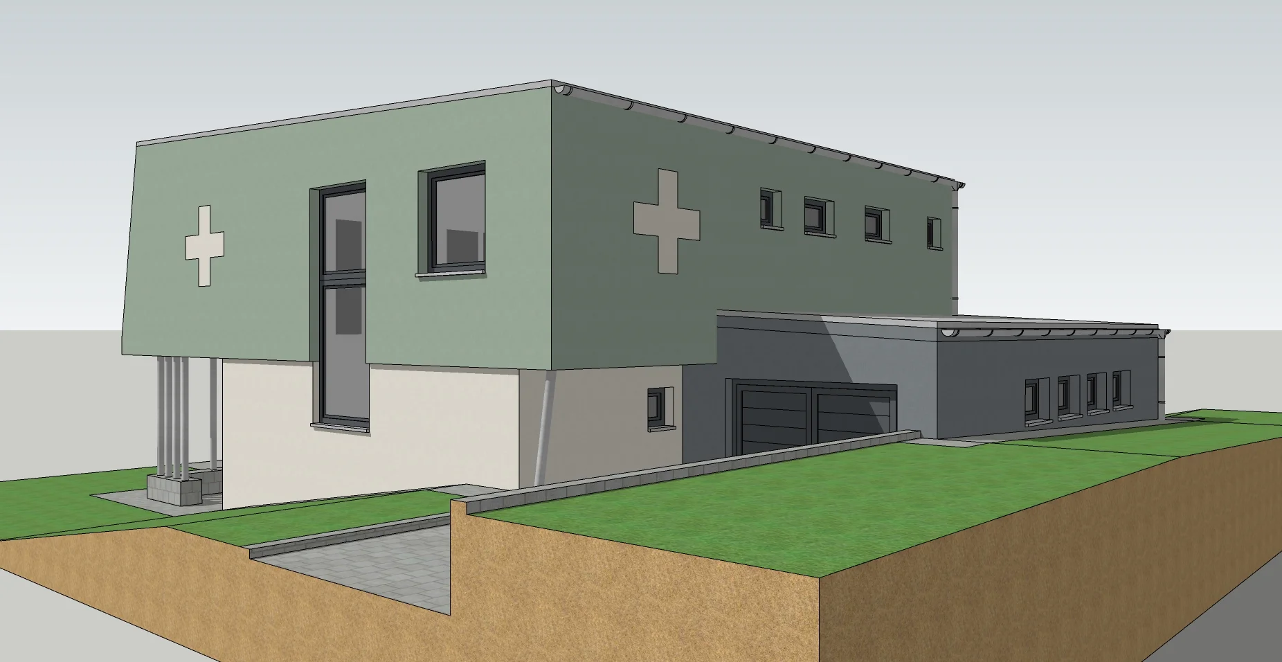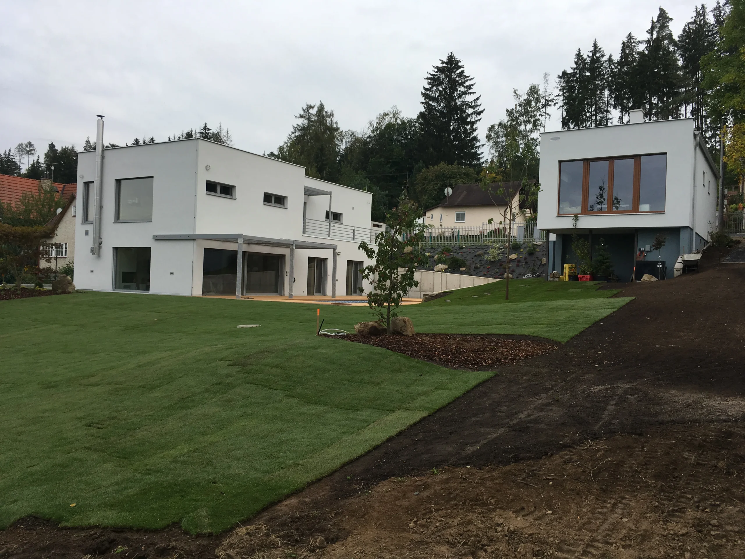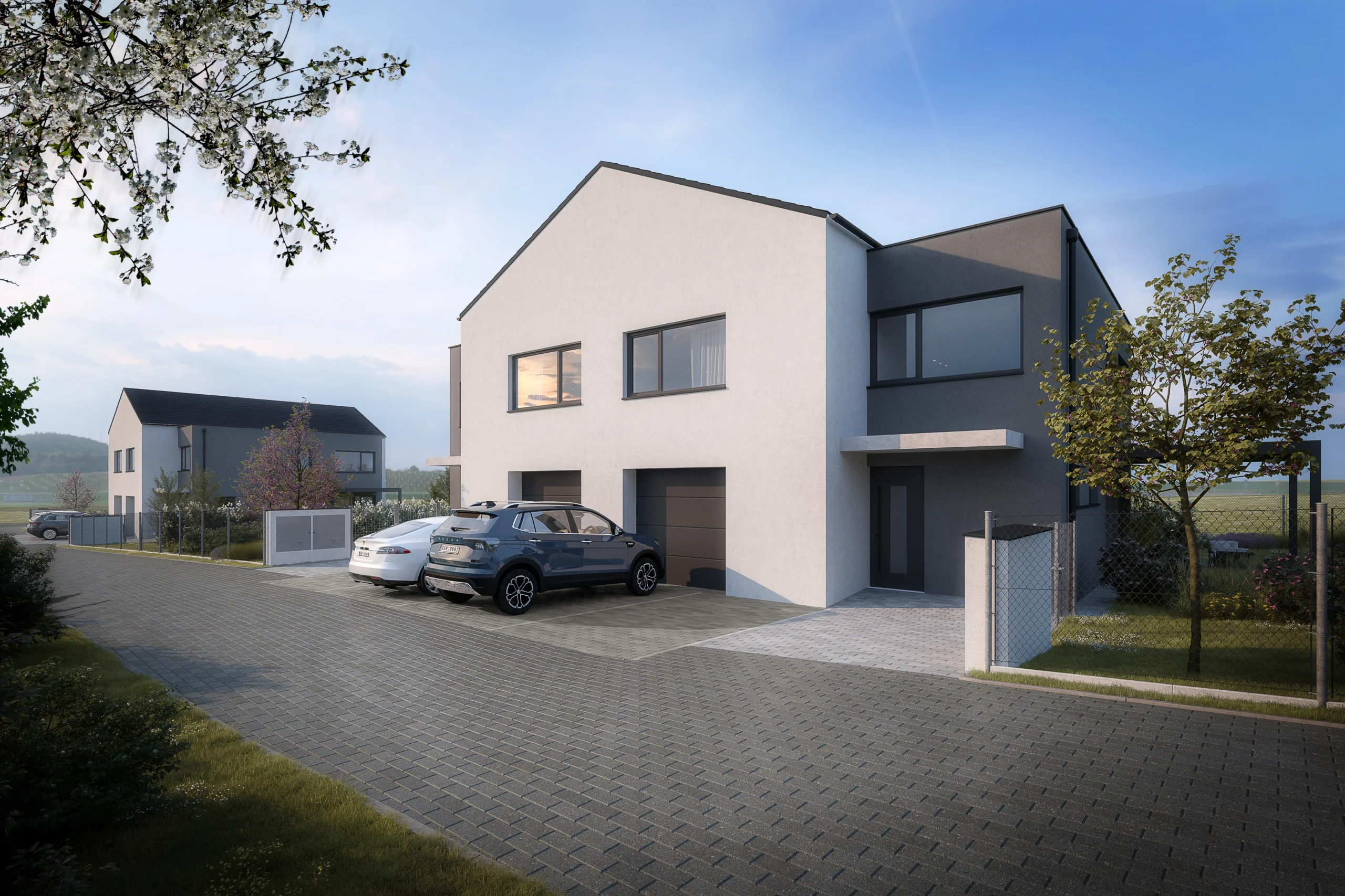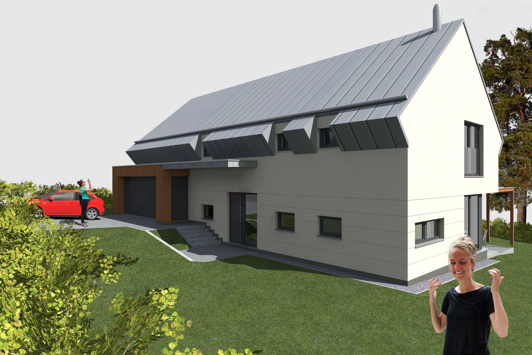 V tomto výjimečném obytném satelitu u Plzně předepisuje regulační plán výhradně sedlovou střechu. Nebylo snadné se tu také vyrovnat s terénem, který značně klesá po úhlopříčce stavební parcely.