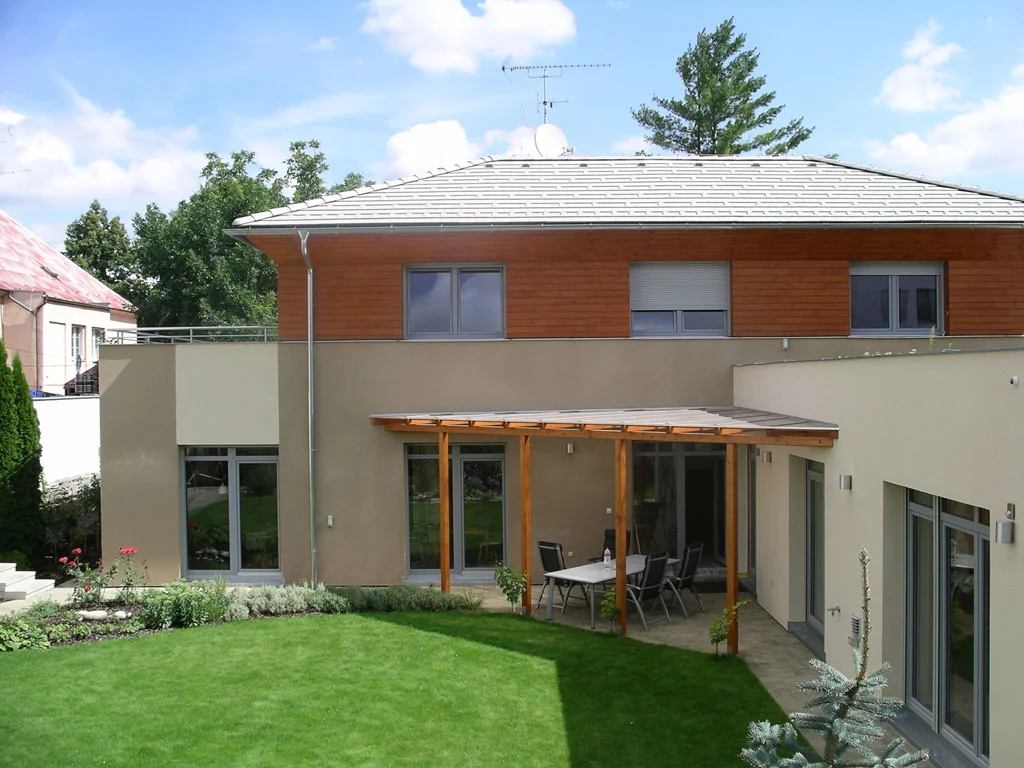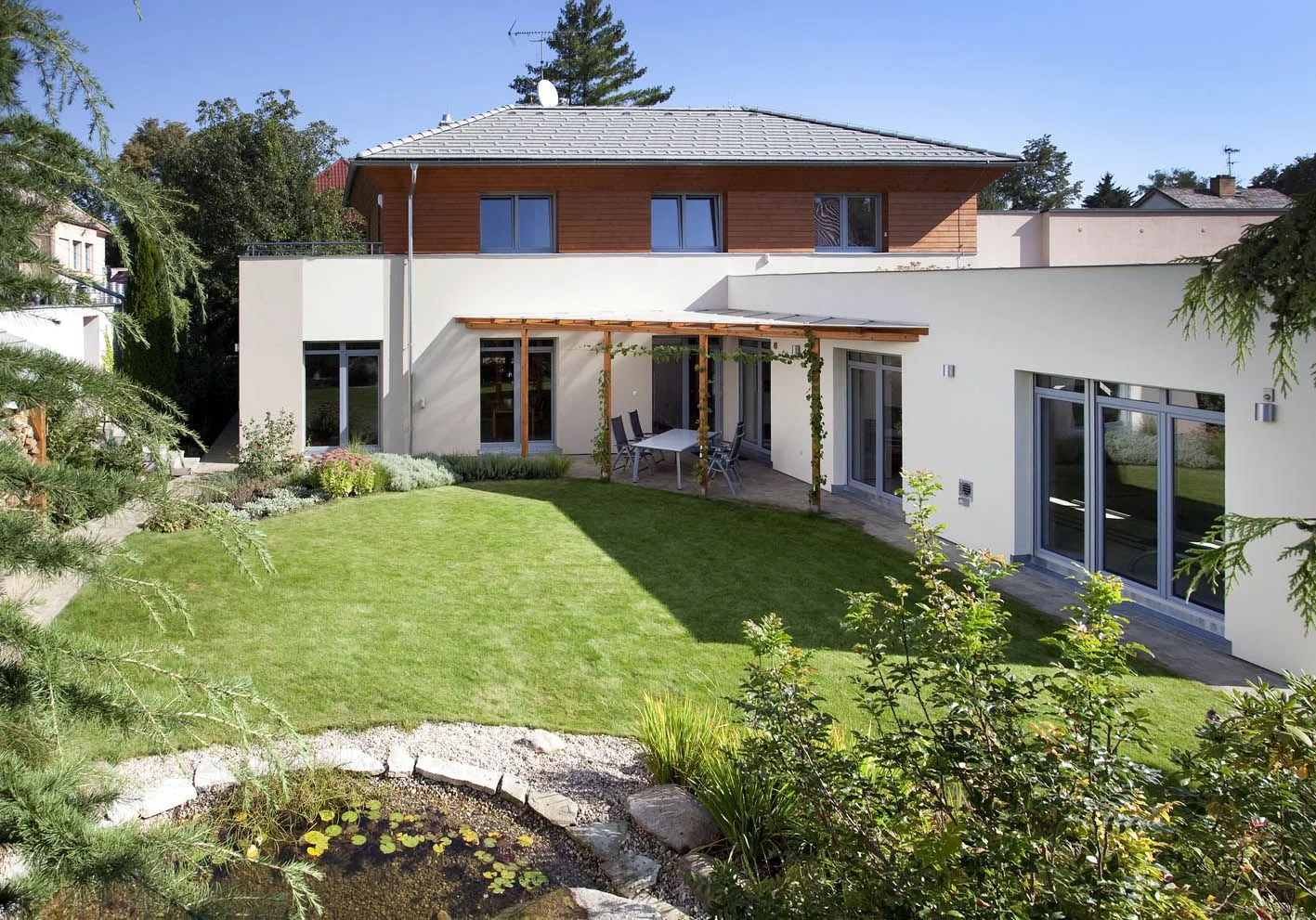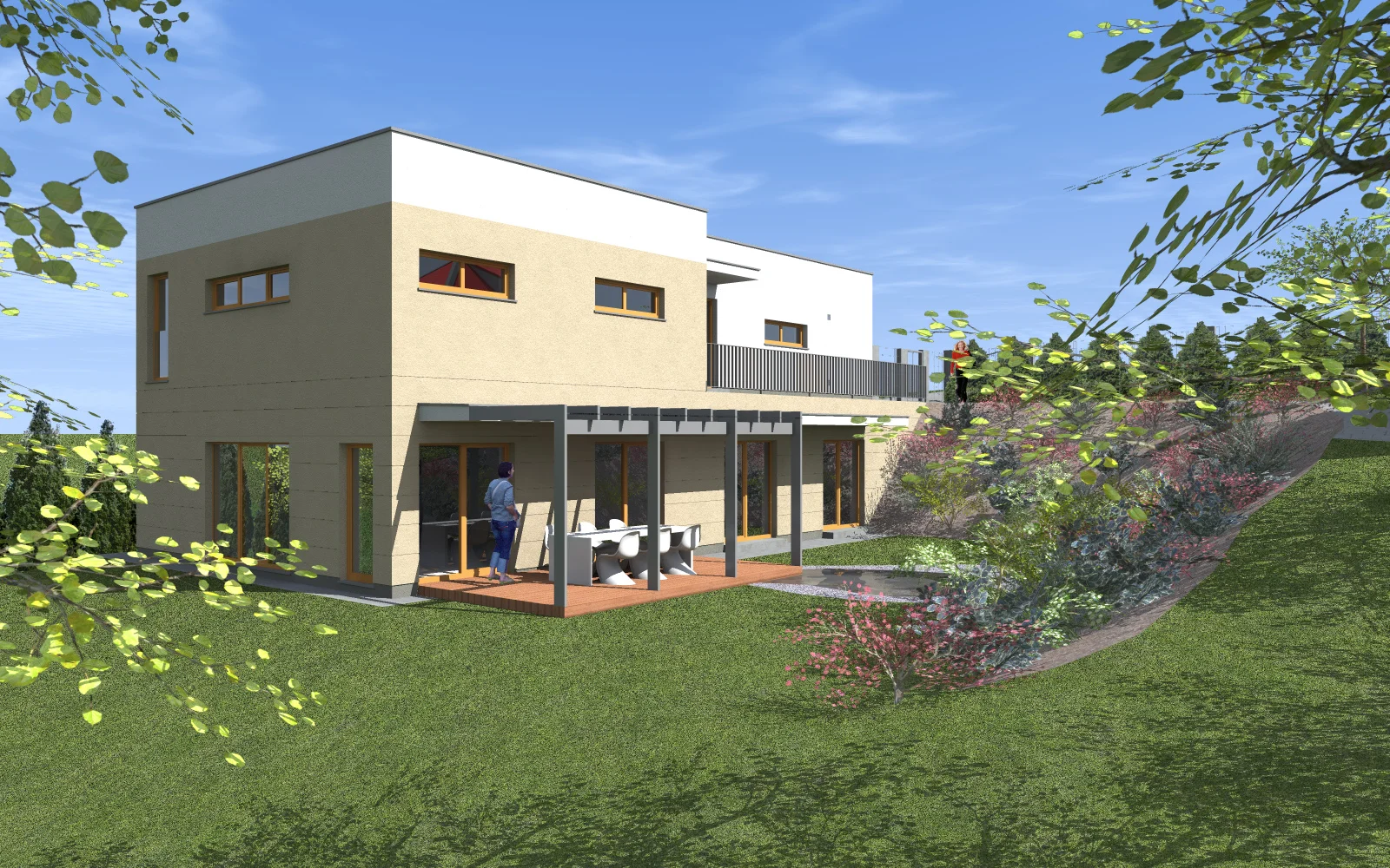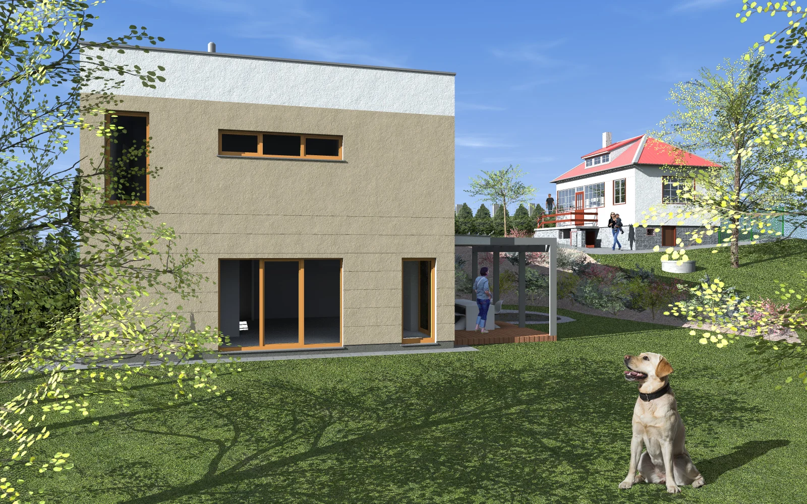 Patrová pultová vilka, spojená dřevěným loubím s garážemi, bude obklopena starým vzrostlým sadem.