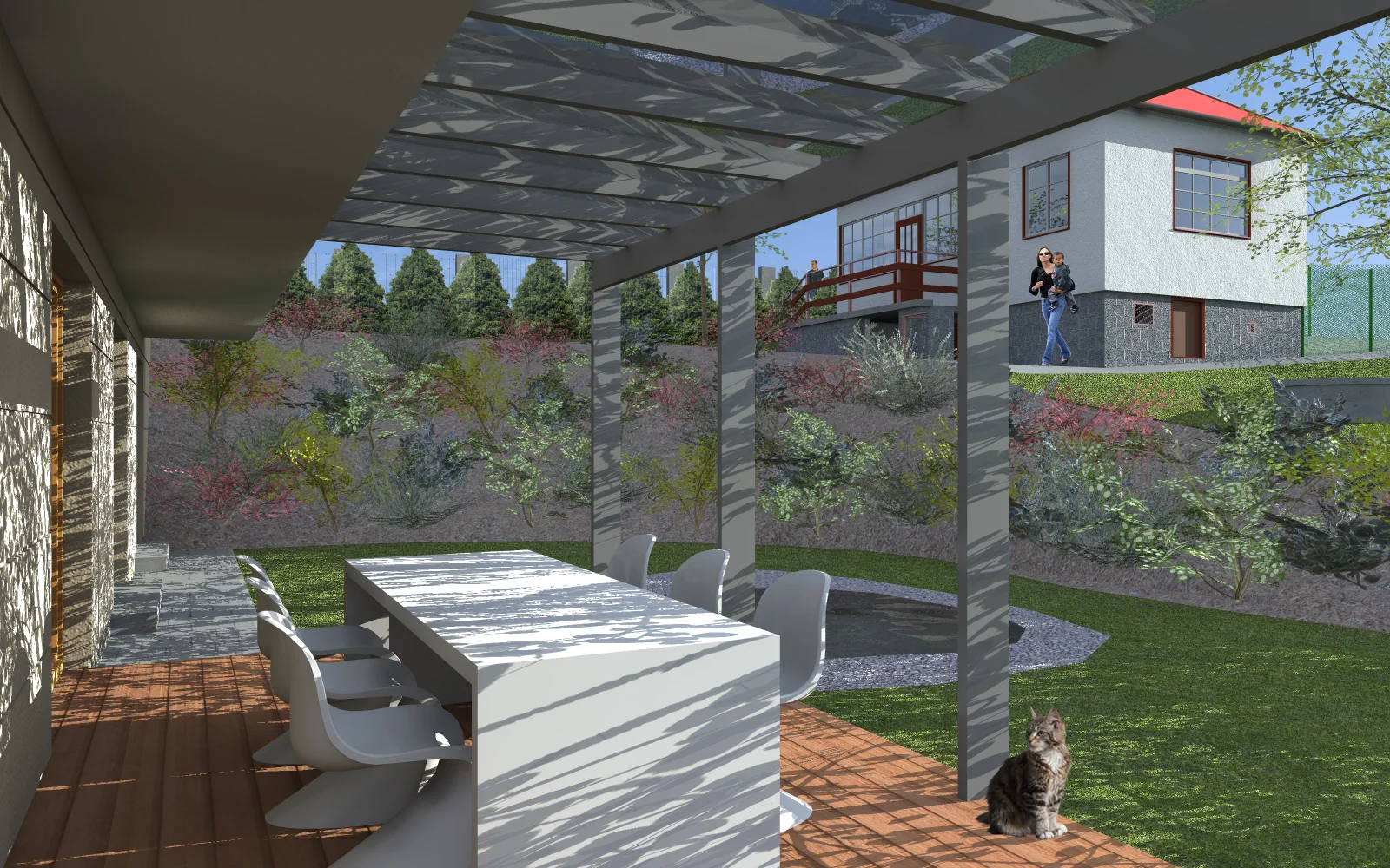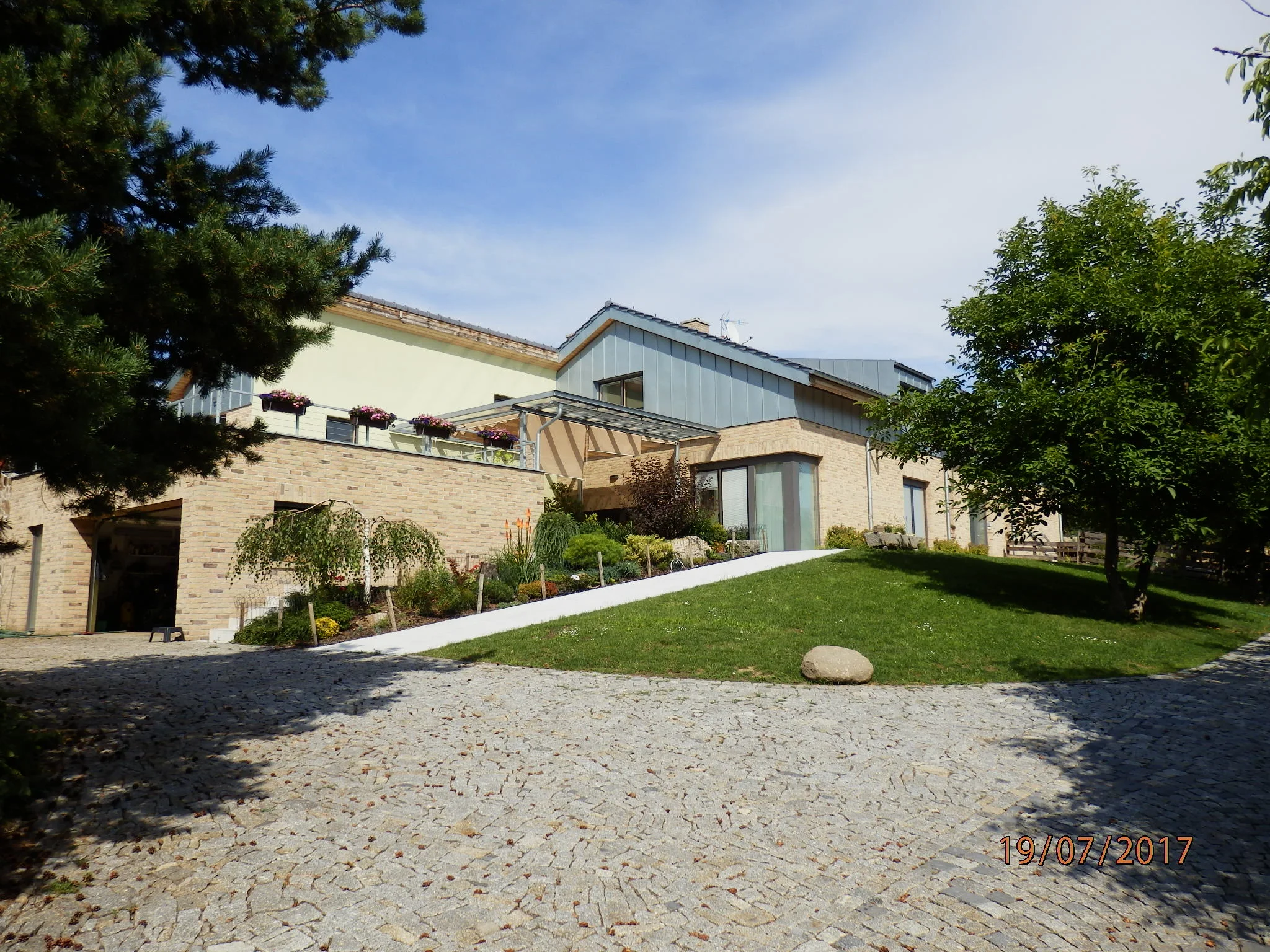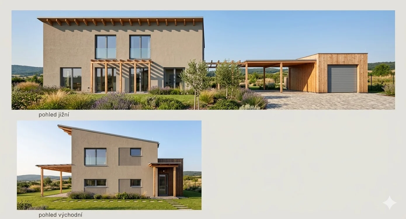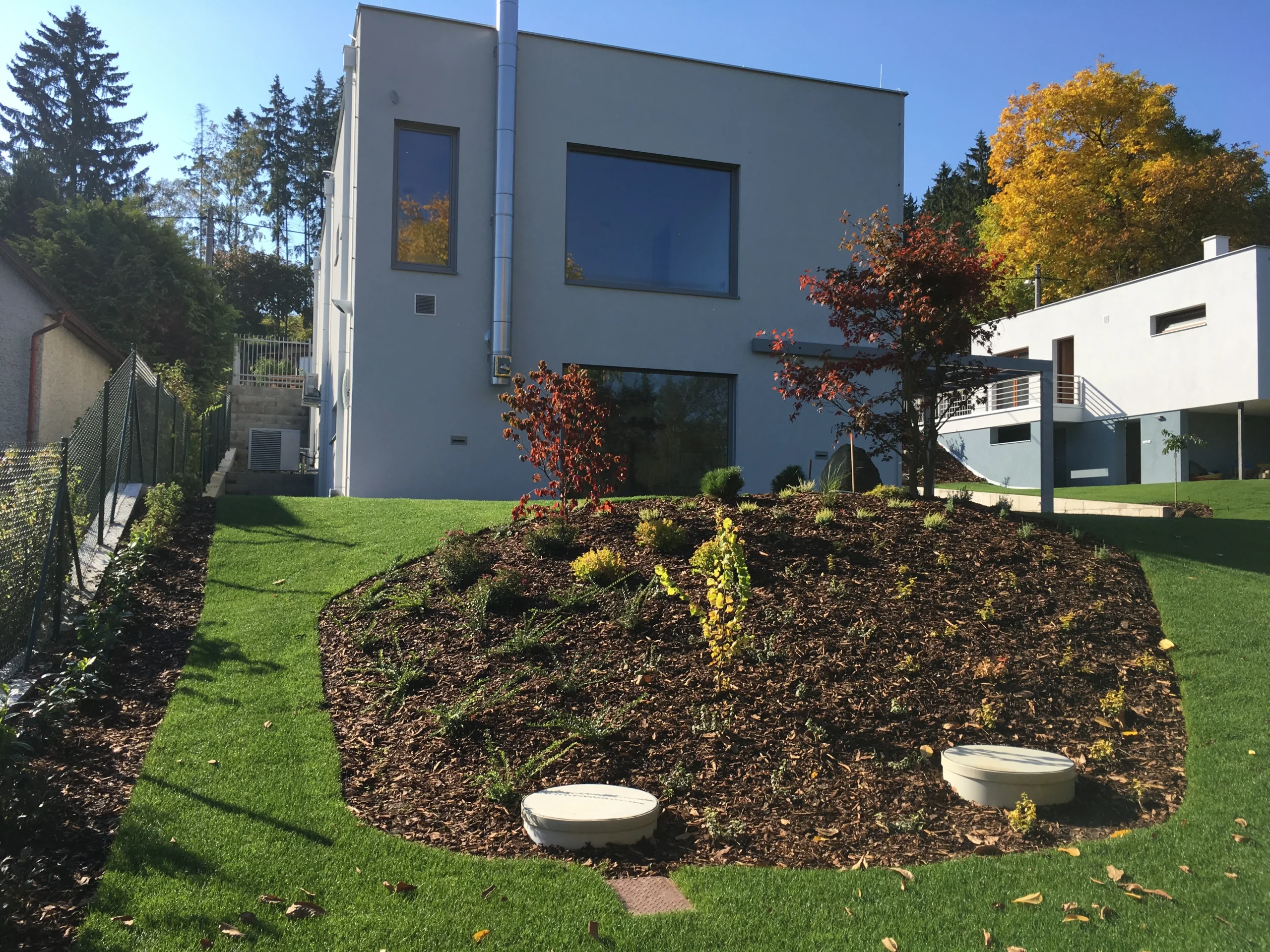 Patrová pultová vilka, spojená dřevěným loubím s garážemi, bude obklopena starým vzrostlým sadem.