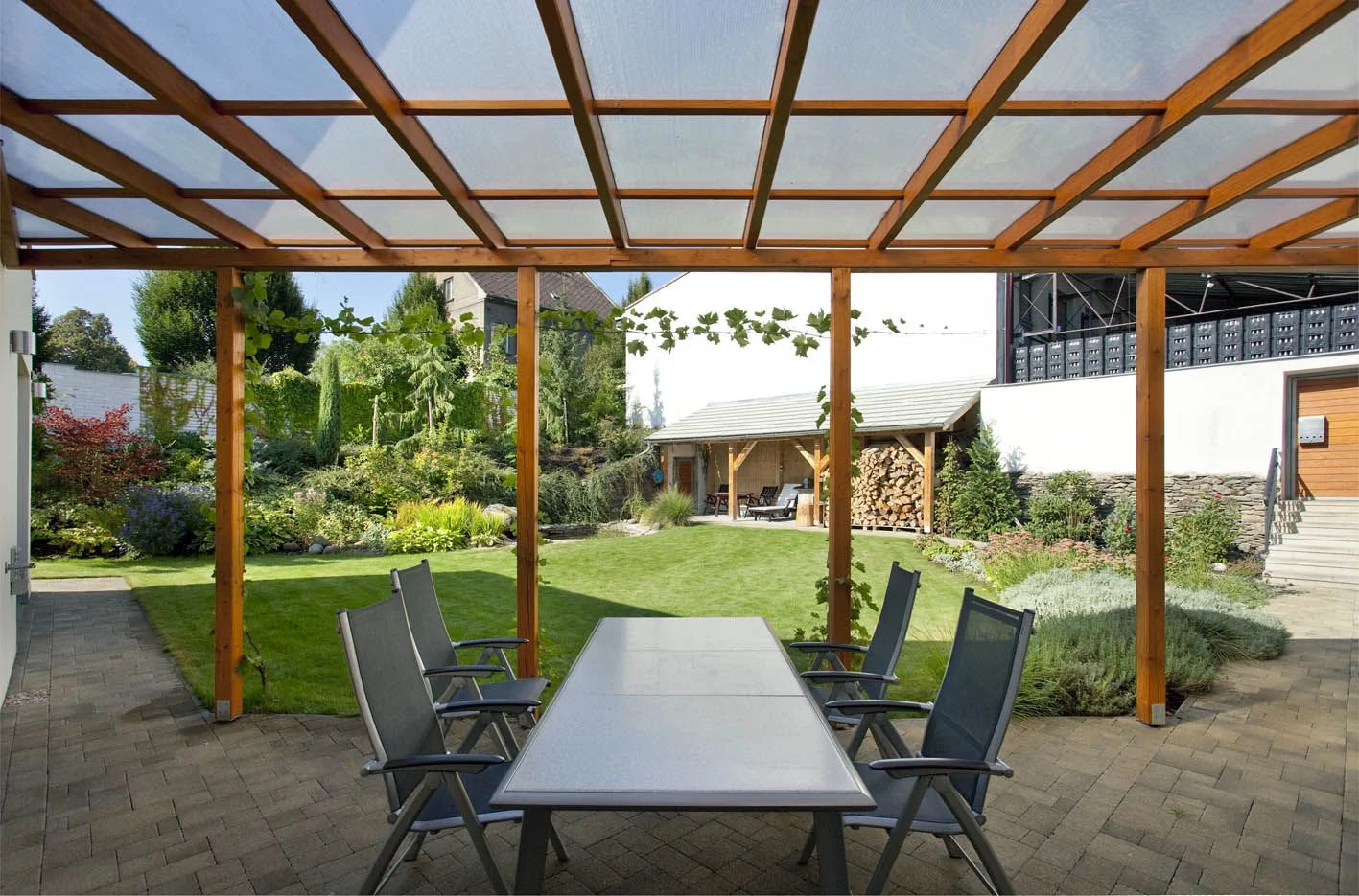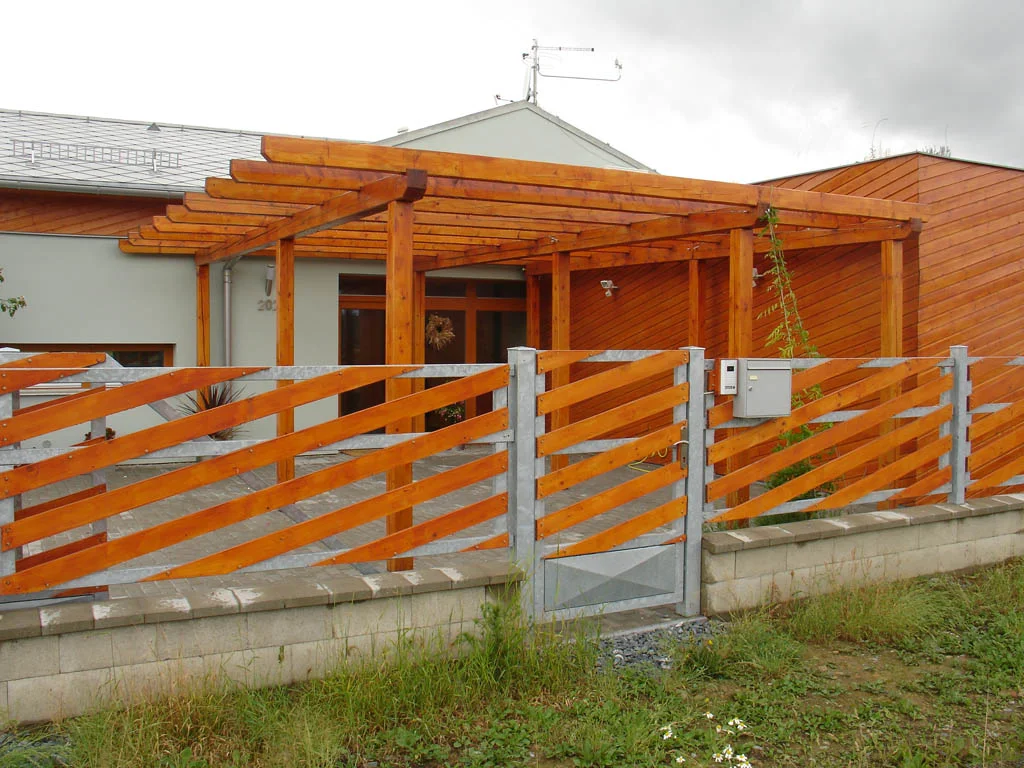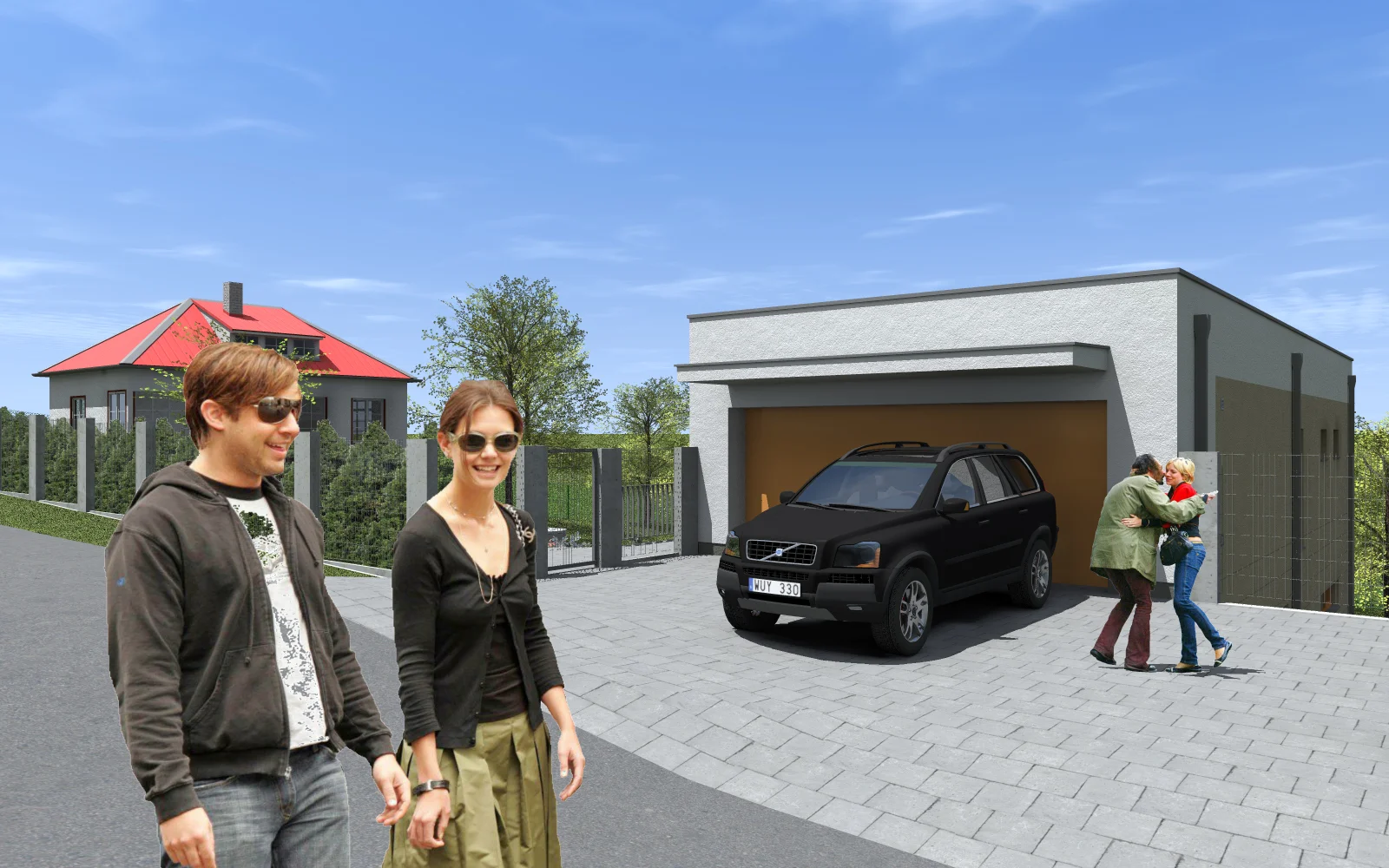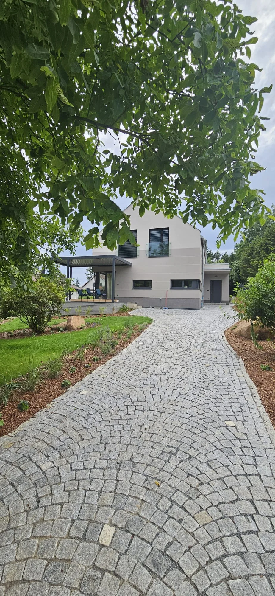 Patrová pultová vilka, spojená dřevěným loubím s garážemi, bude obklopena starým vzrostlým sadem.