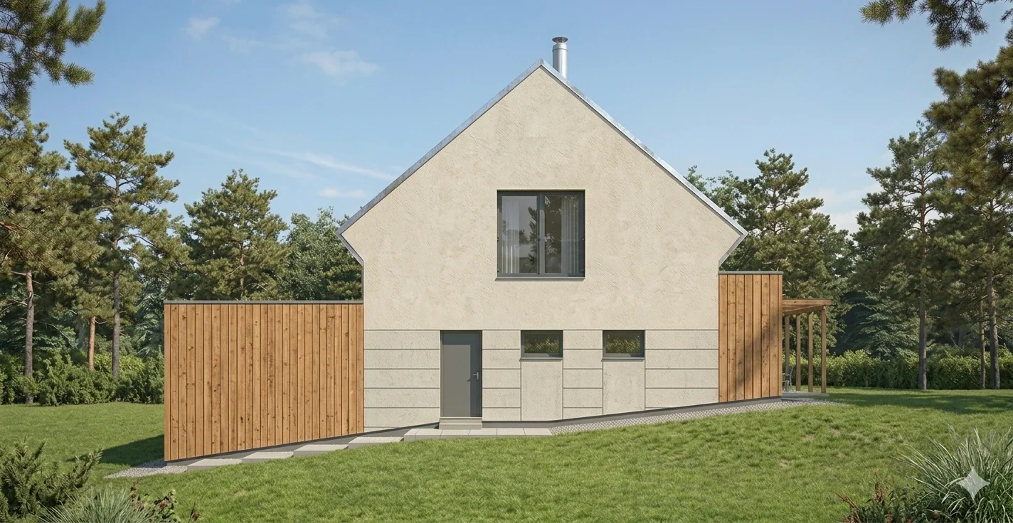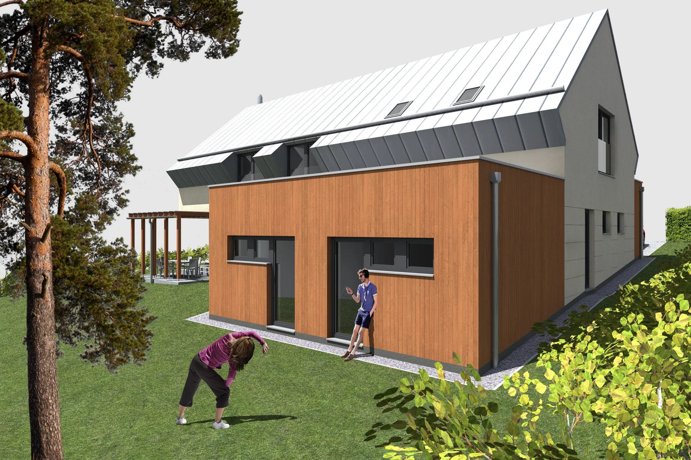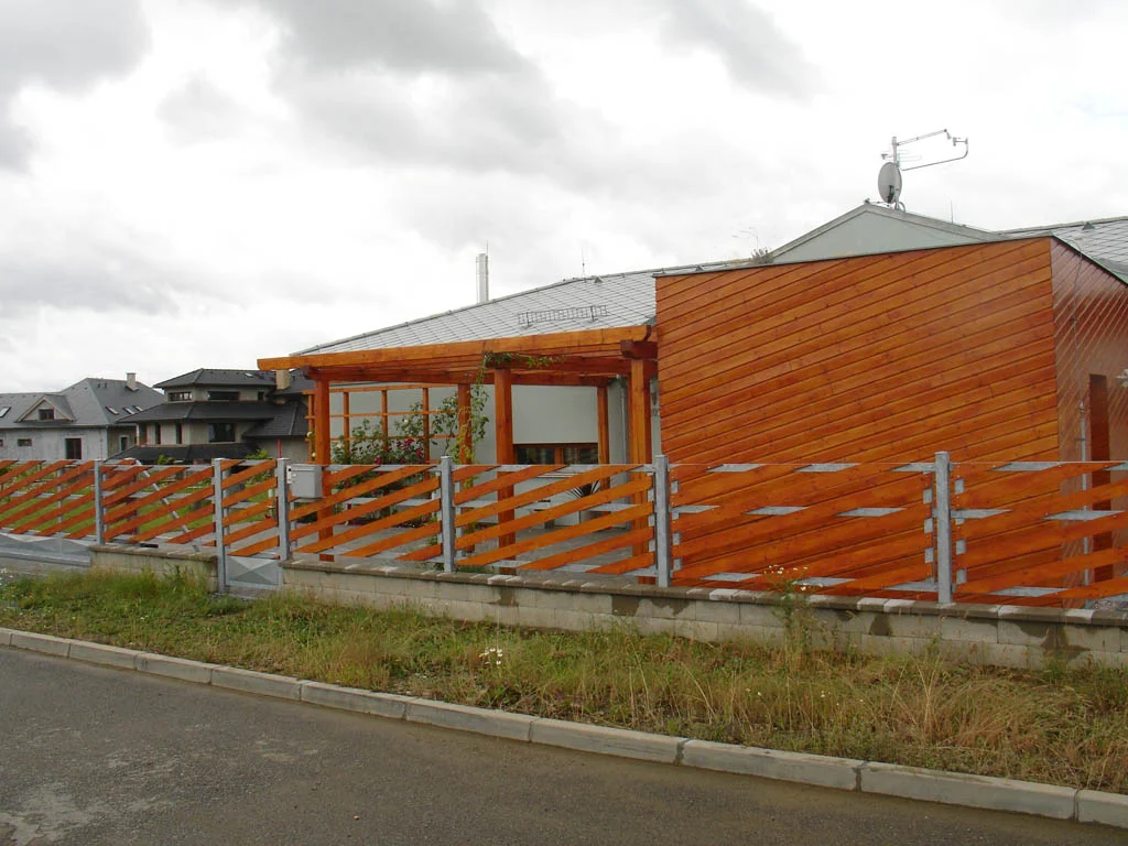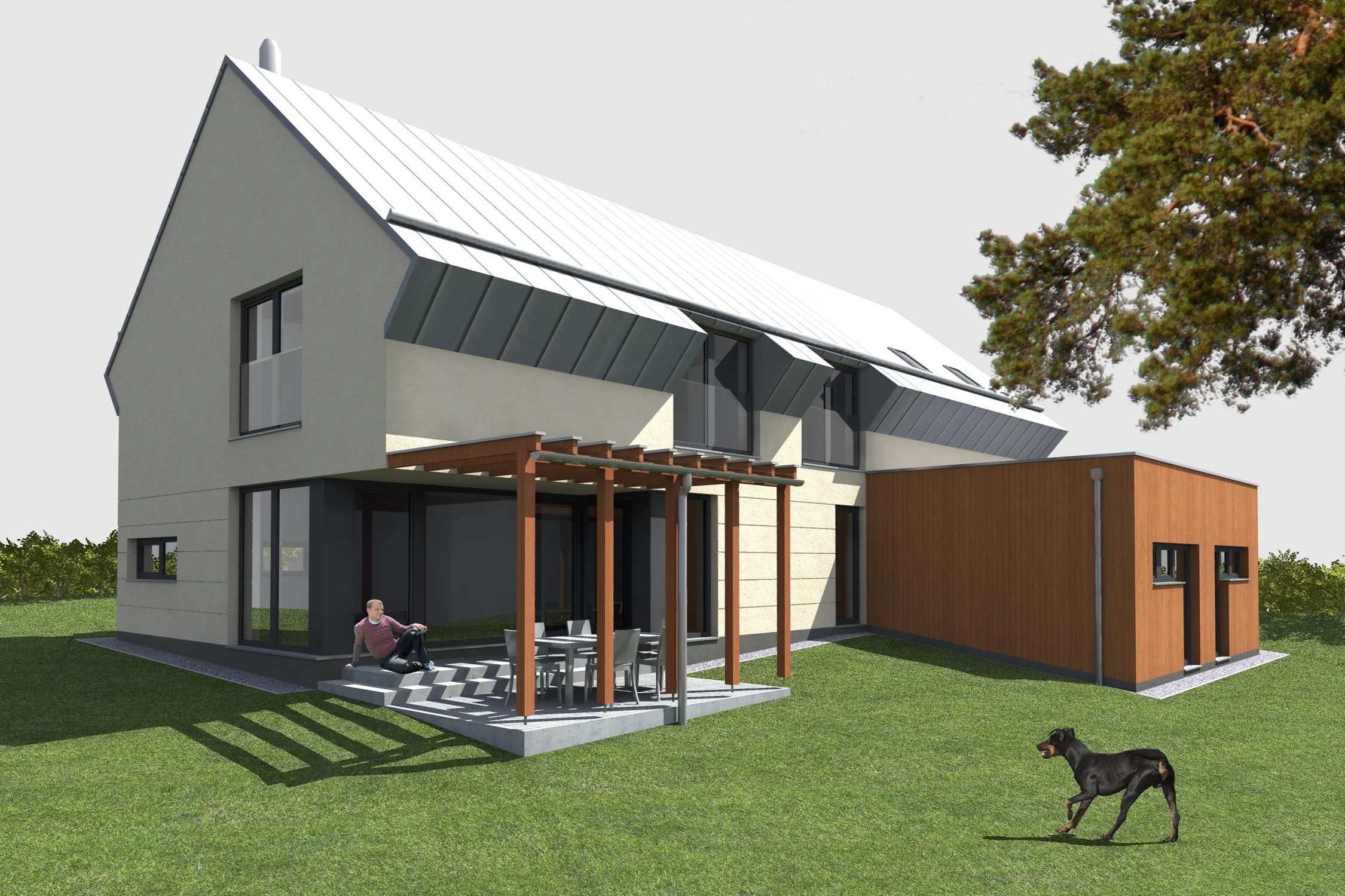 Menší rodinný domek na kraji satelitní výstavby u lesa s použitím účelné formy pultové střechy.