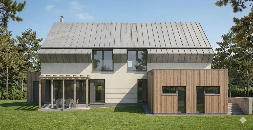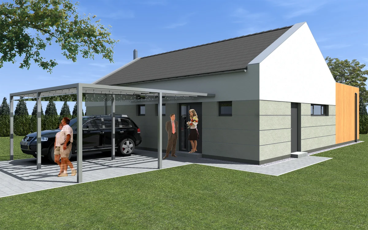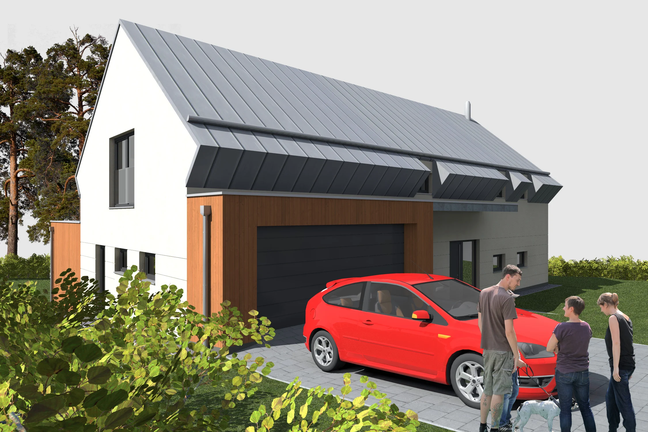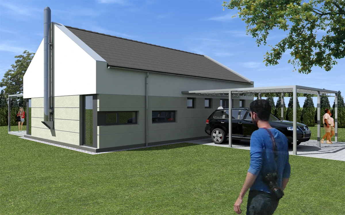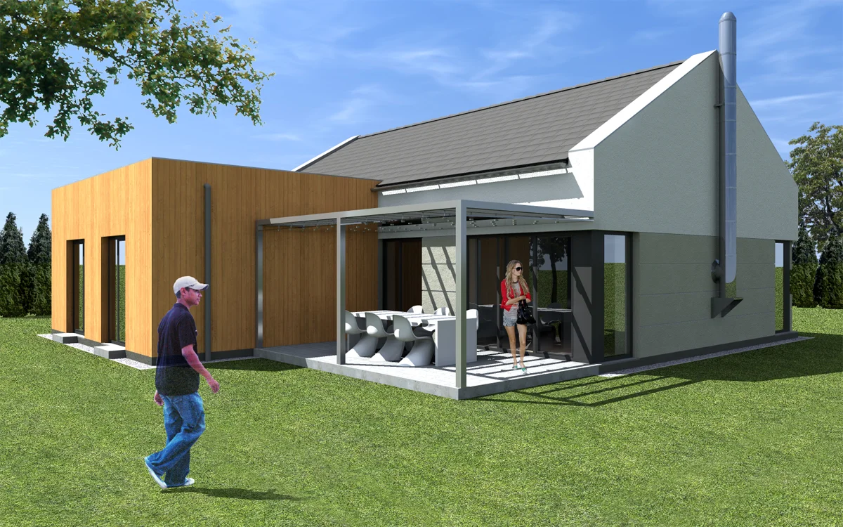 Menší rodinný domek na kraji satelitní výstavby u lesa s použitím účelné formy pultové střechy.