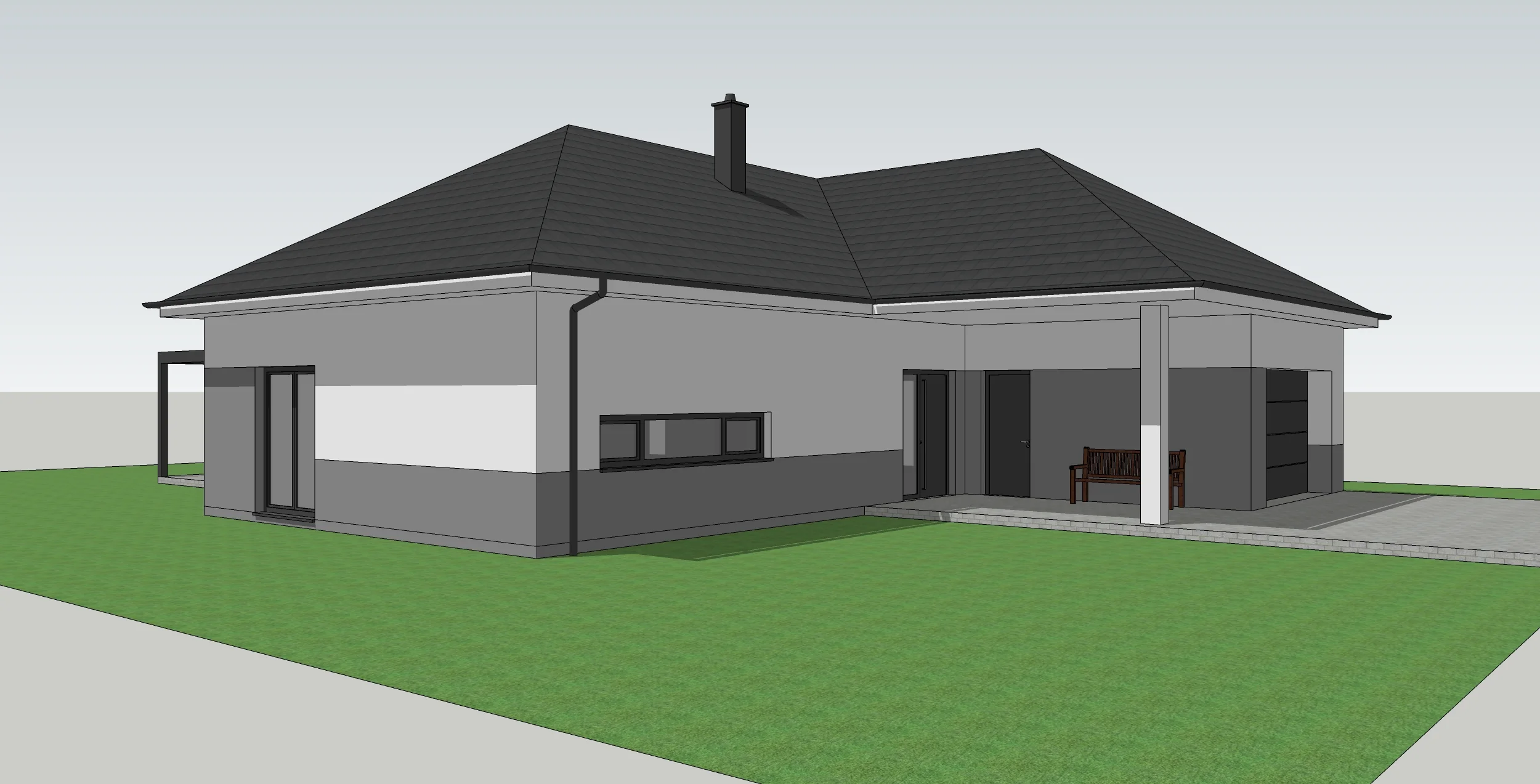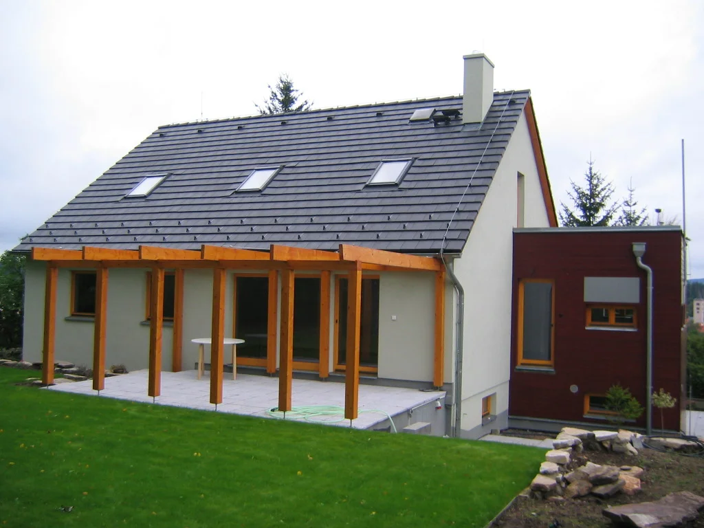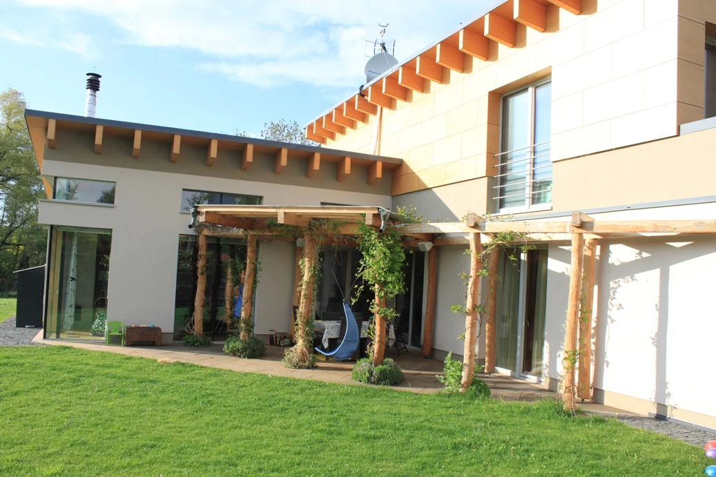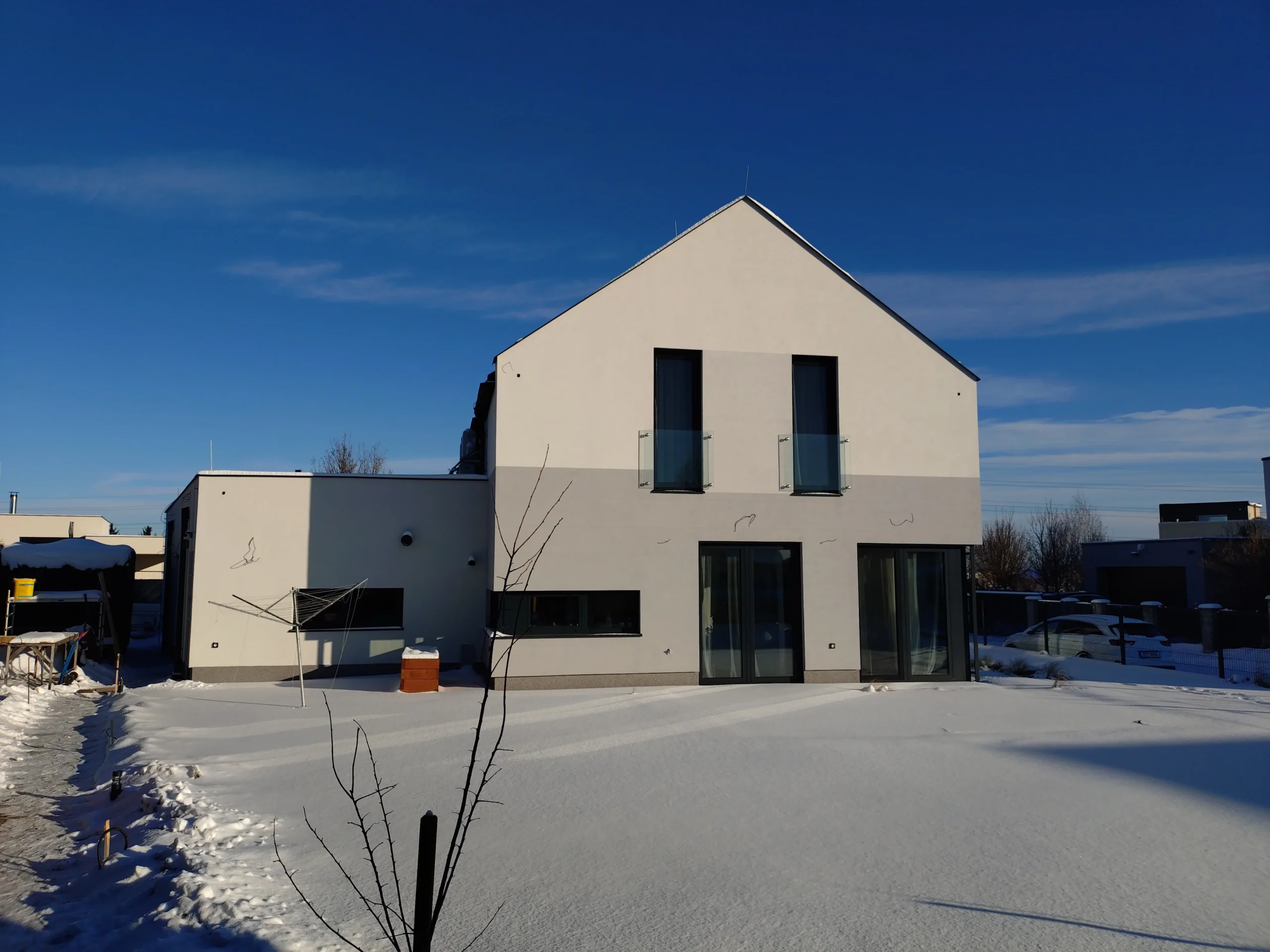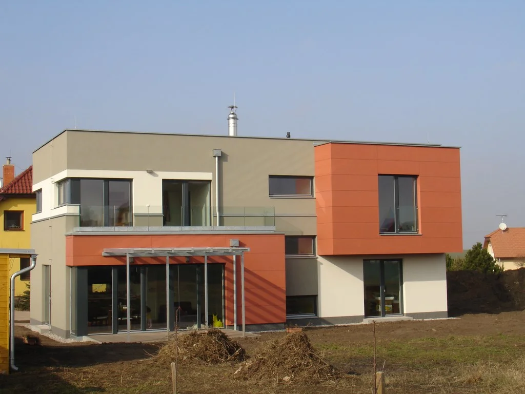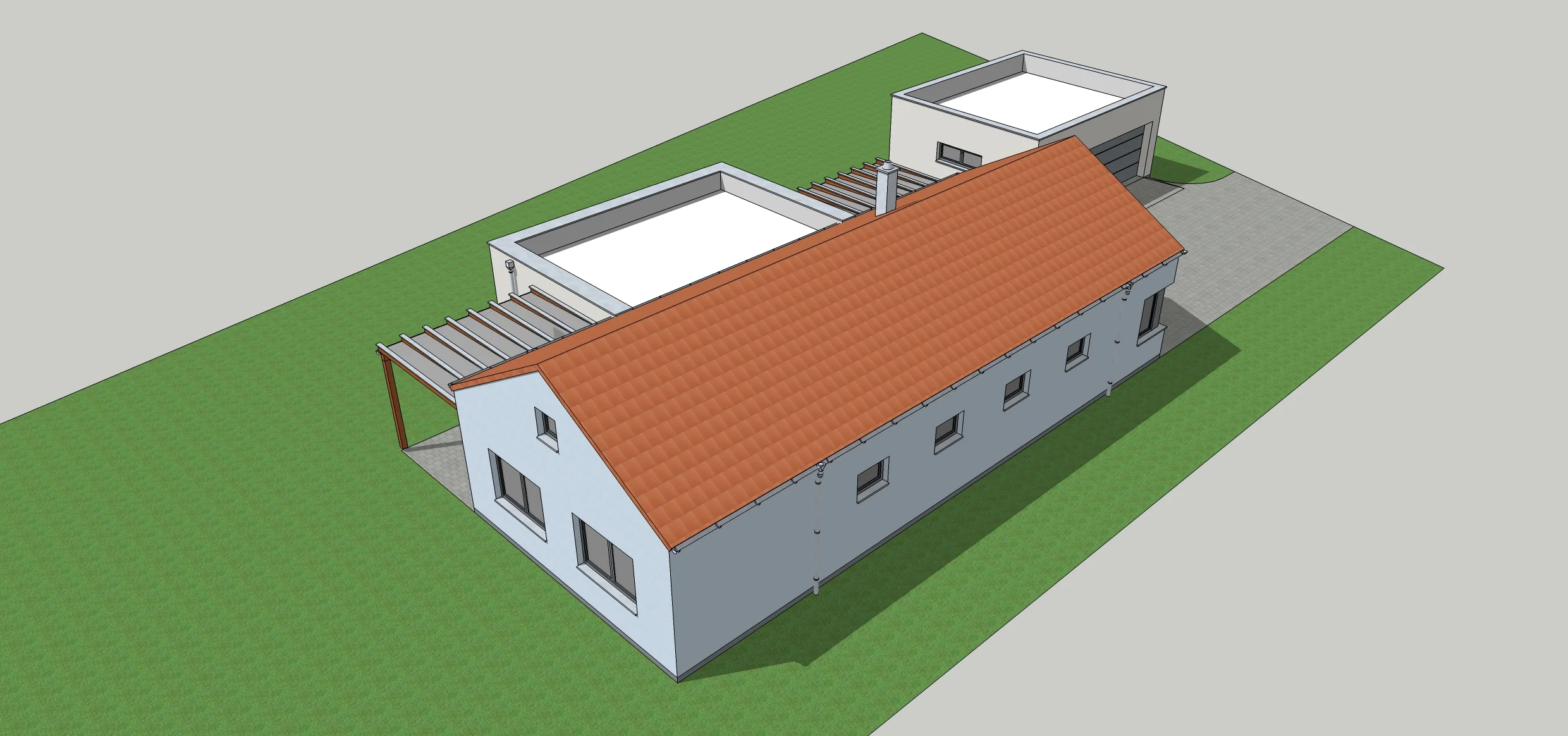 Novostavba rodinného domu má obdélníkový půdorys, který kopíruje tvar pozemku. Sestává z hlavní obytné části s moderními arkýři, samostatně stojící dvojgaráže na severní straně a zastřešené pergoly orientované na jih.