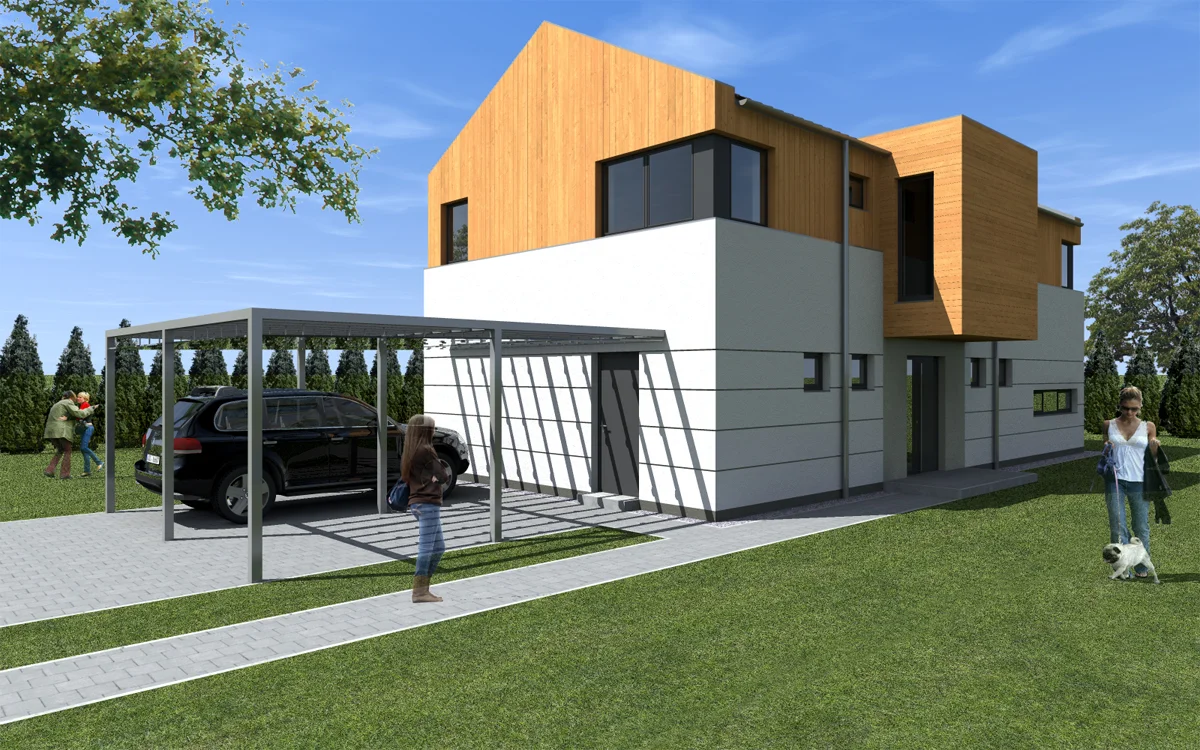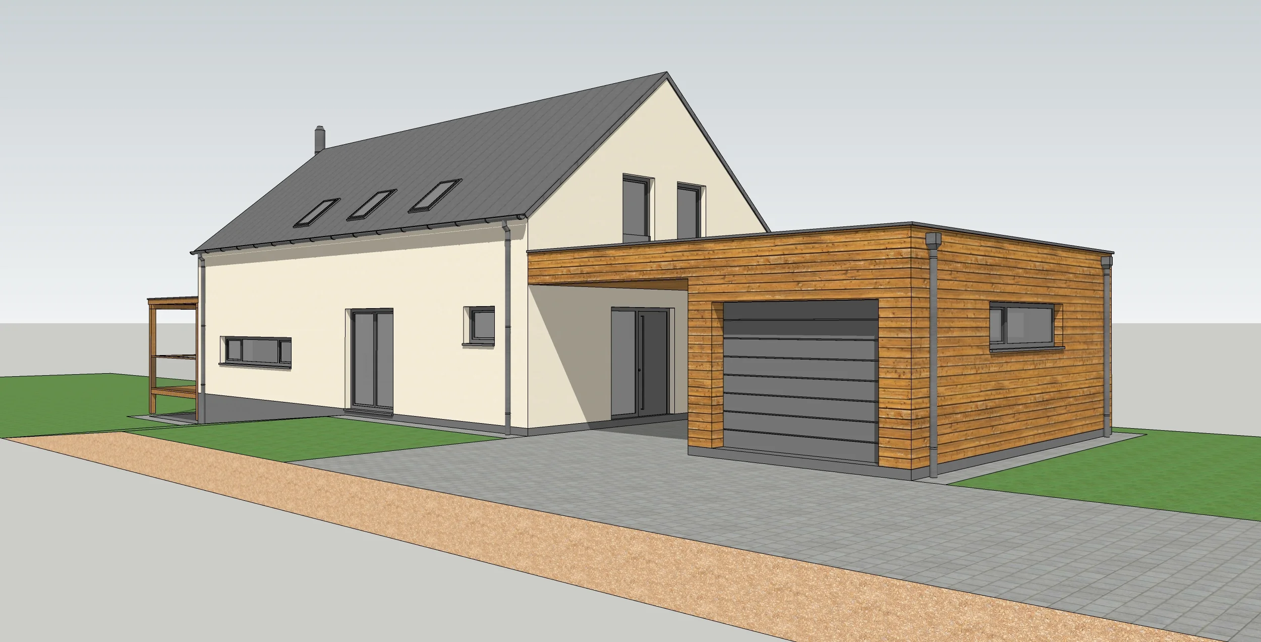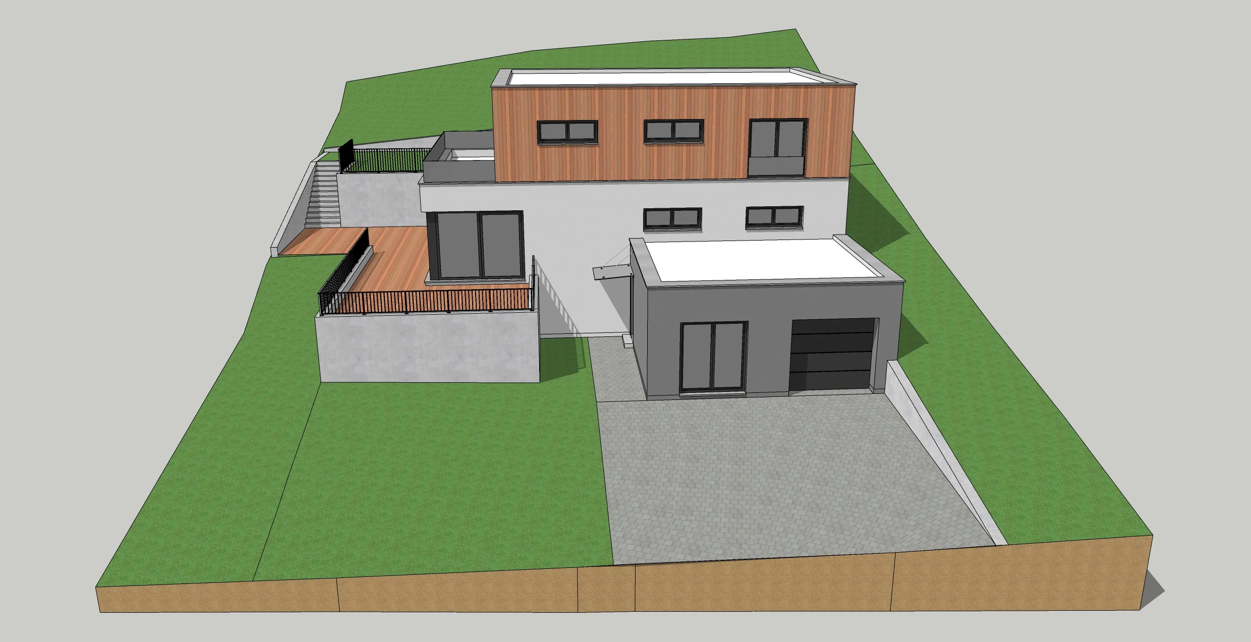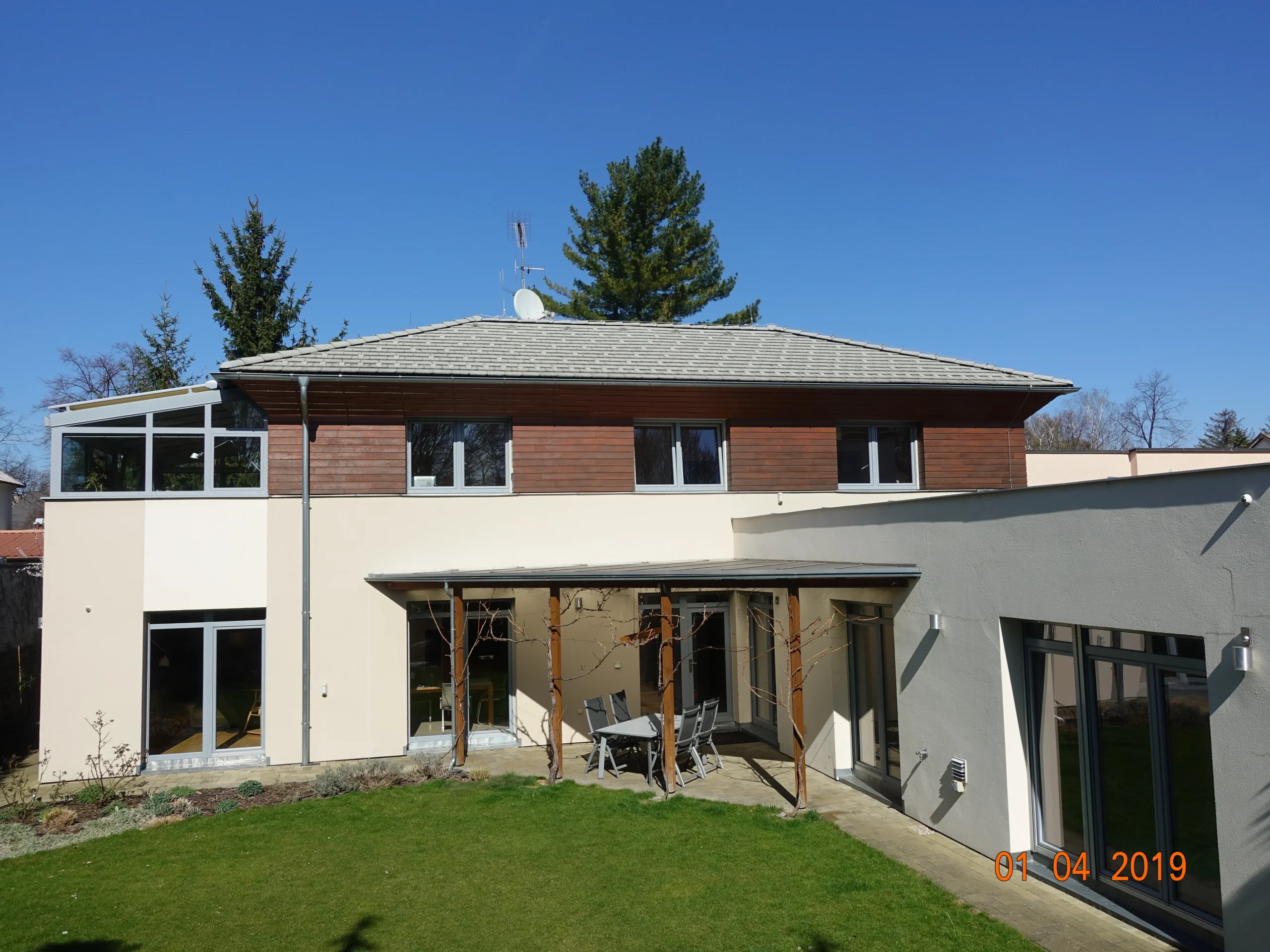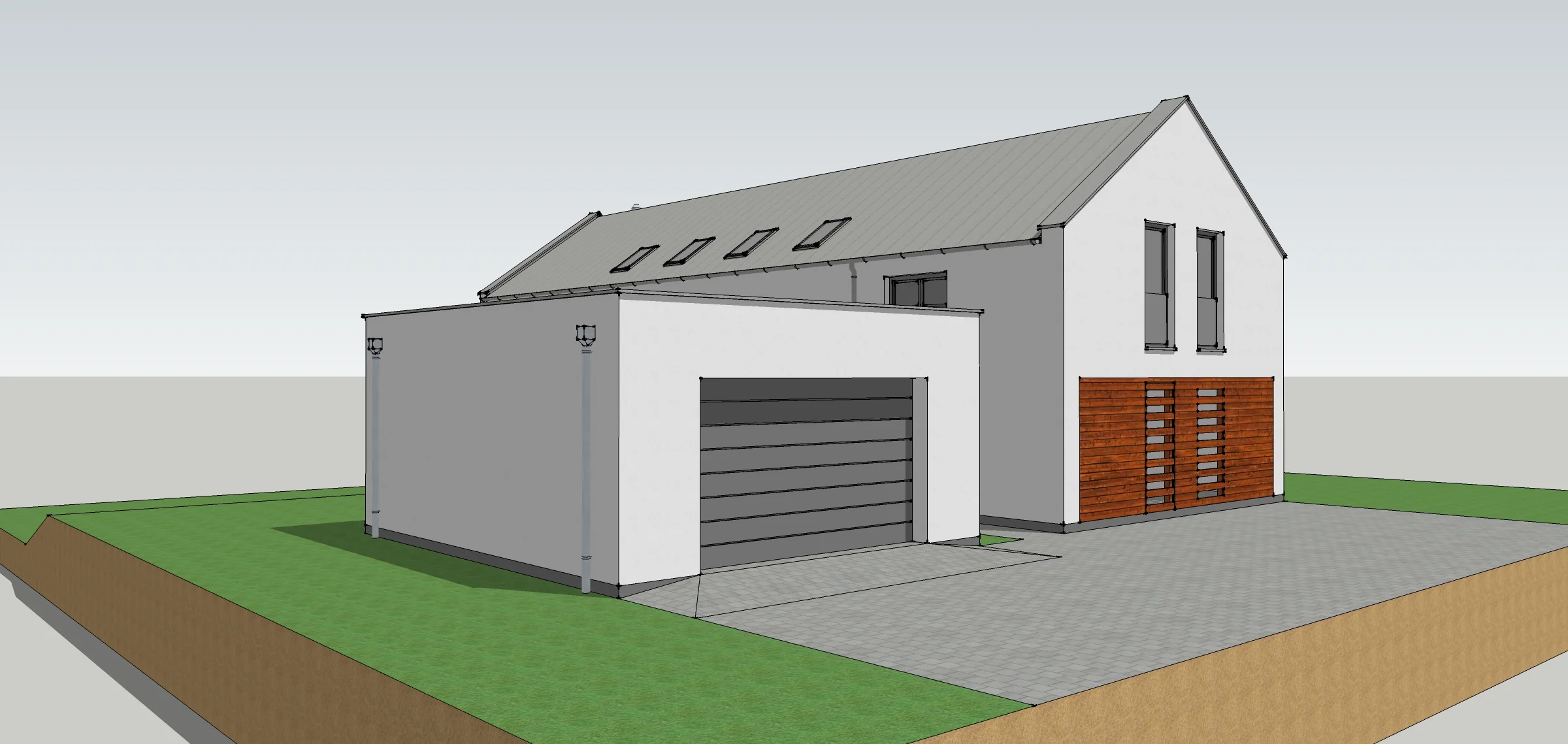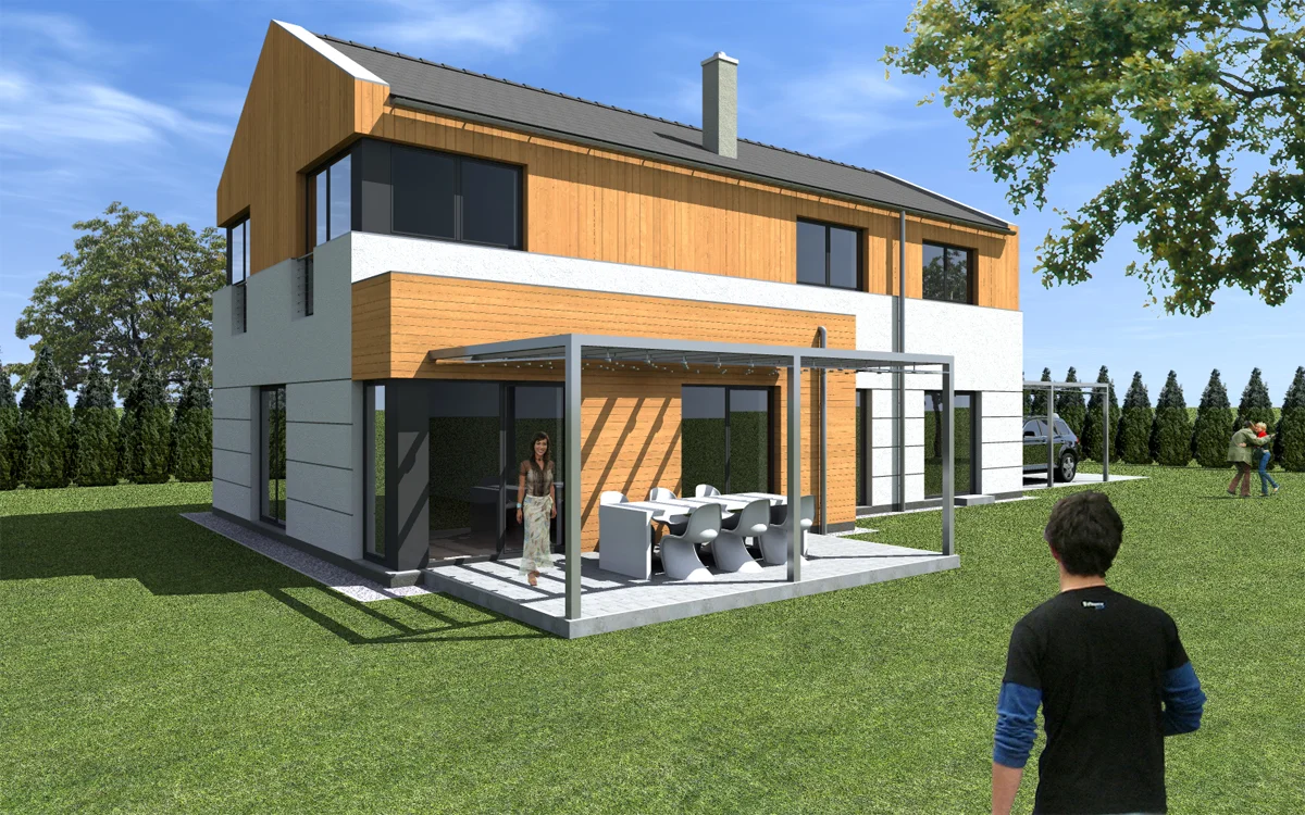 Novostavba rodinného domu má obdélníkový půdorys, který kopíruje tvar pozemku. Sestává z hlavní obytné části s moderními arkýři, samostatně stojící dvojgaráže na severní straně a zastřešené pergoly orientované na jih.