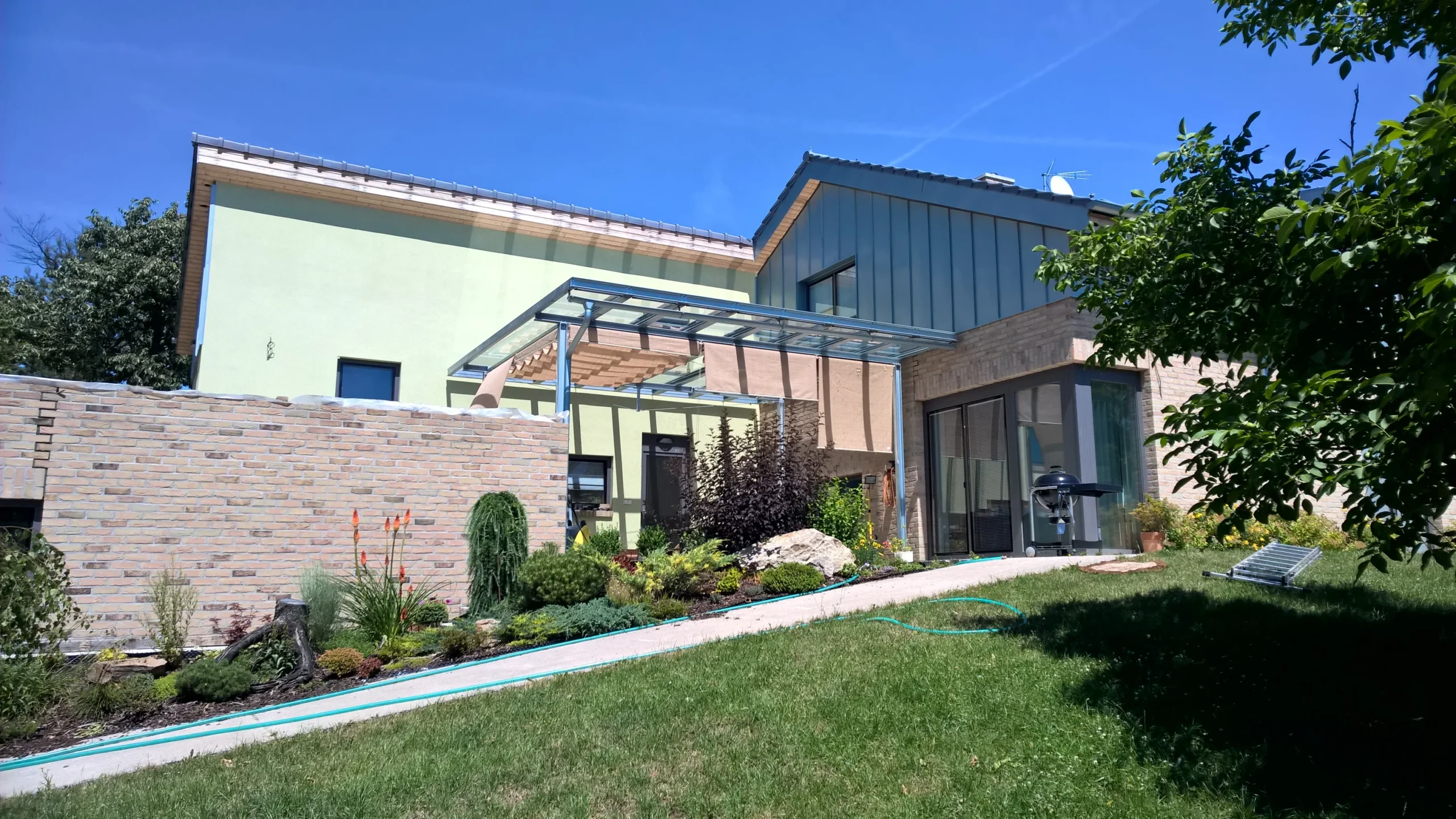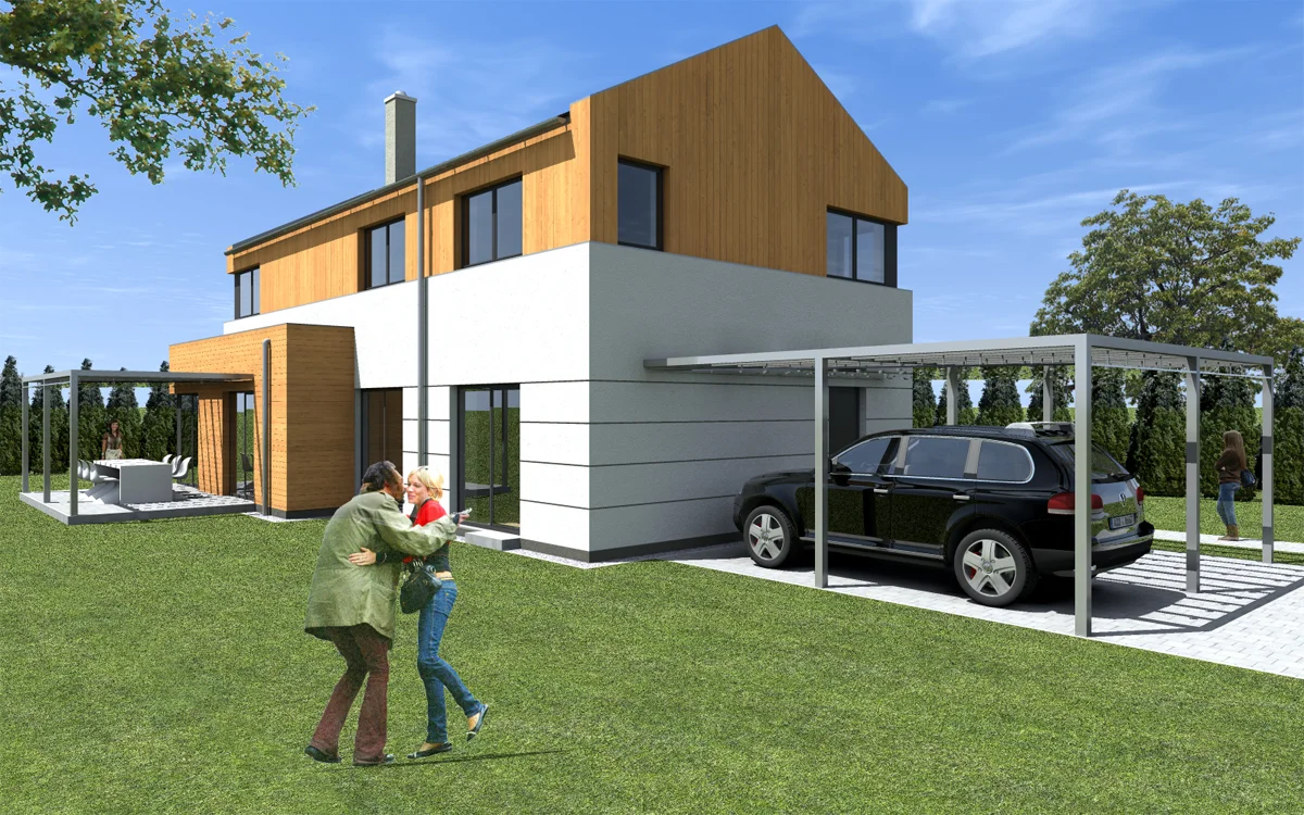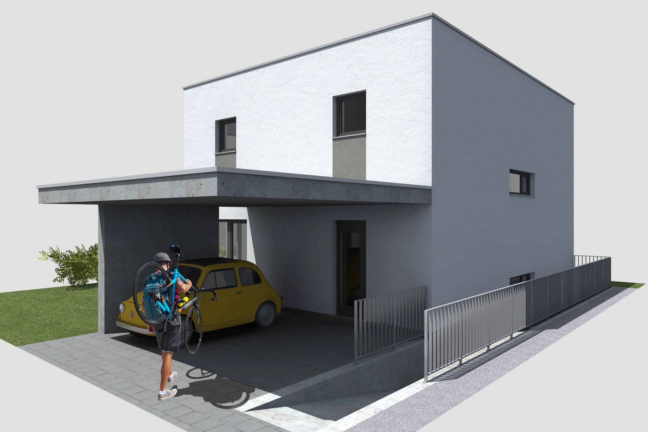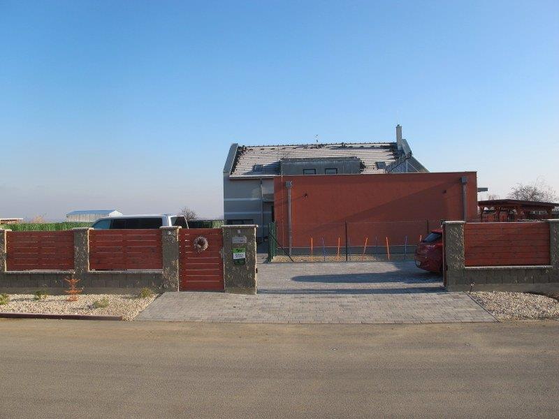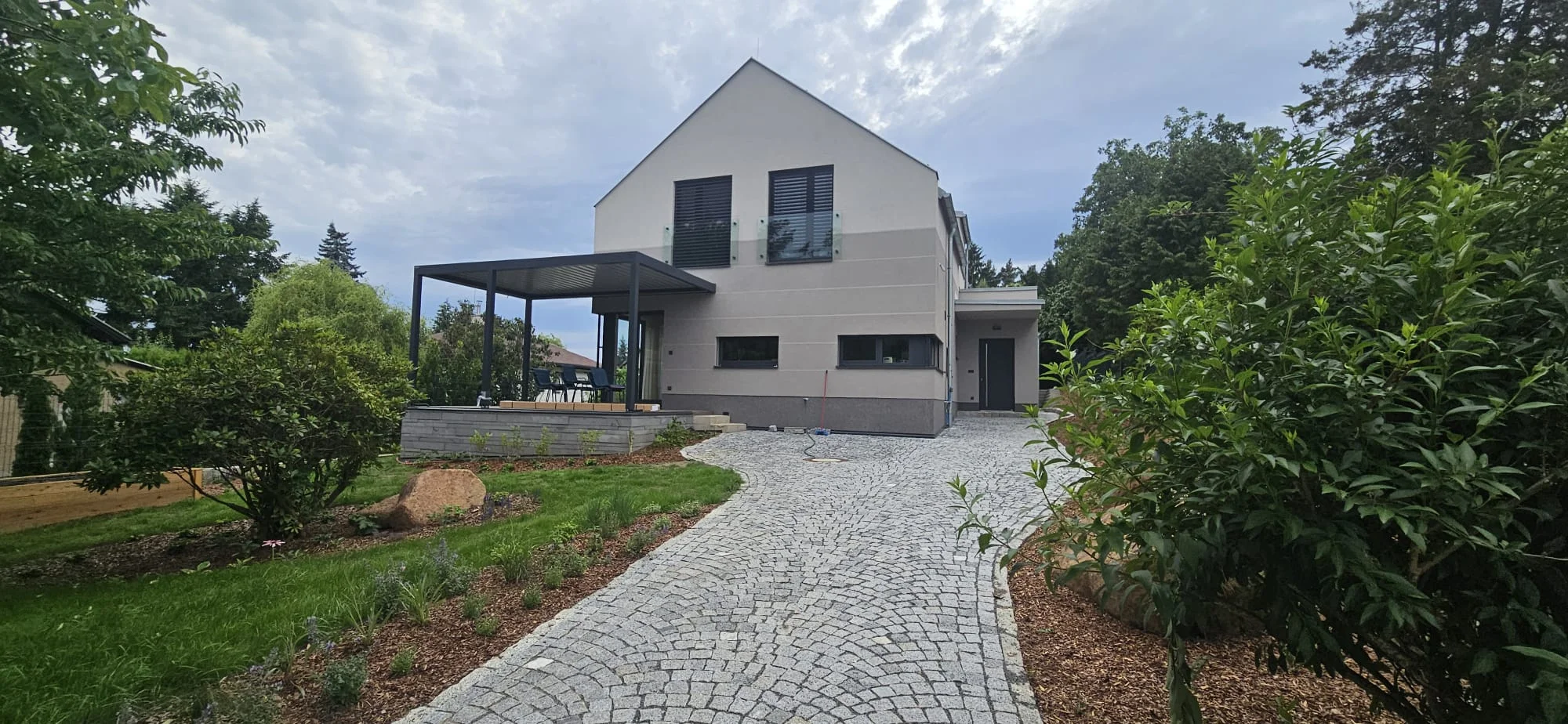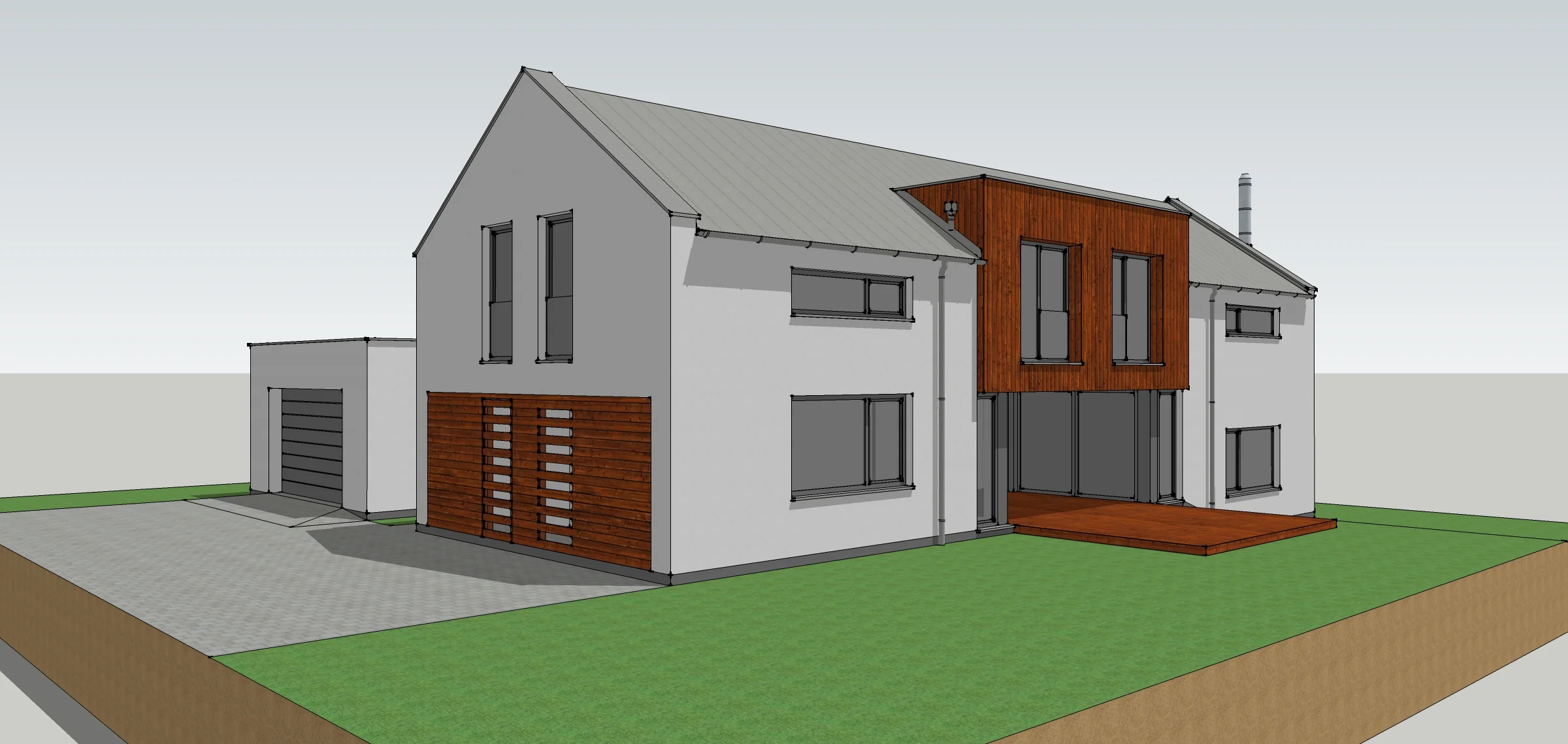 Novostavba rodinného domu má obdélníkový půdorys, který kopíruje tvar pozemku. Sestává z hlavní obytné části s moderními arkýři, samostatně stojící dvojgaráže na severní straně a zastřešené pergoly orientované na jih.