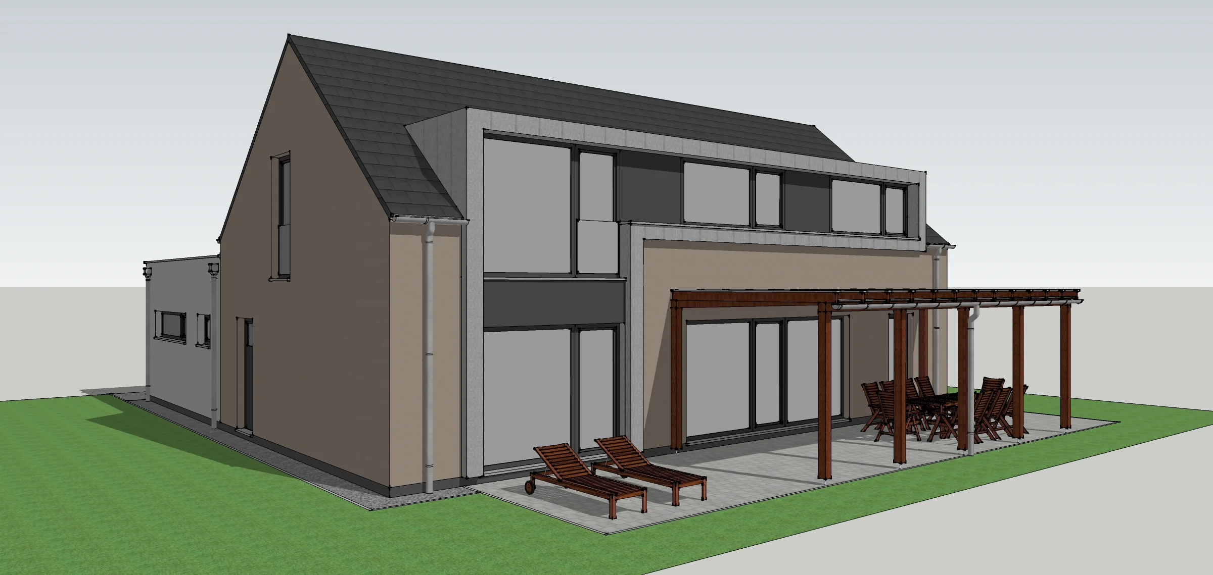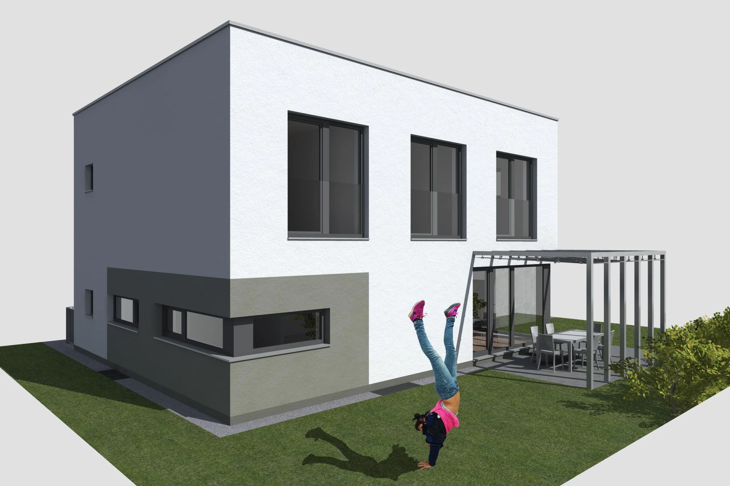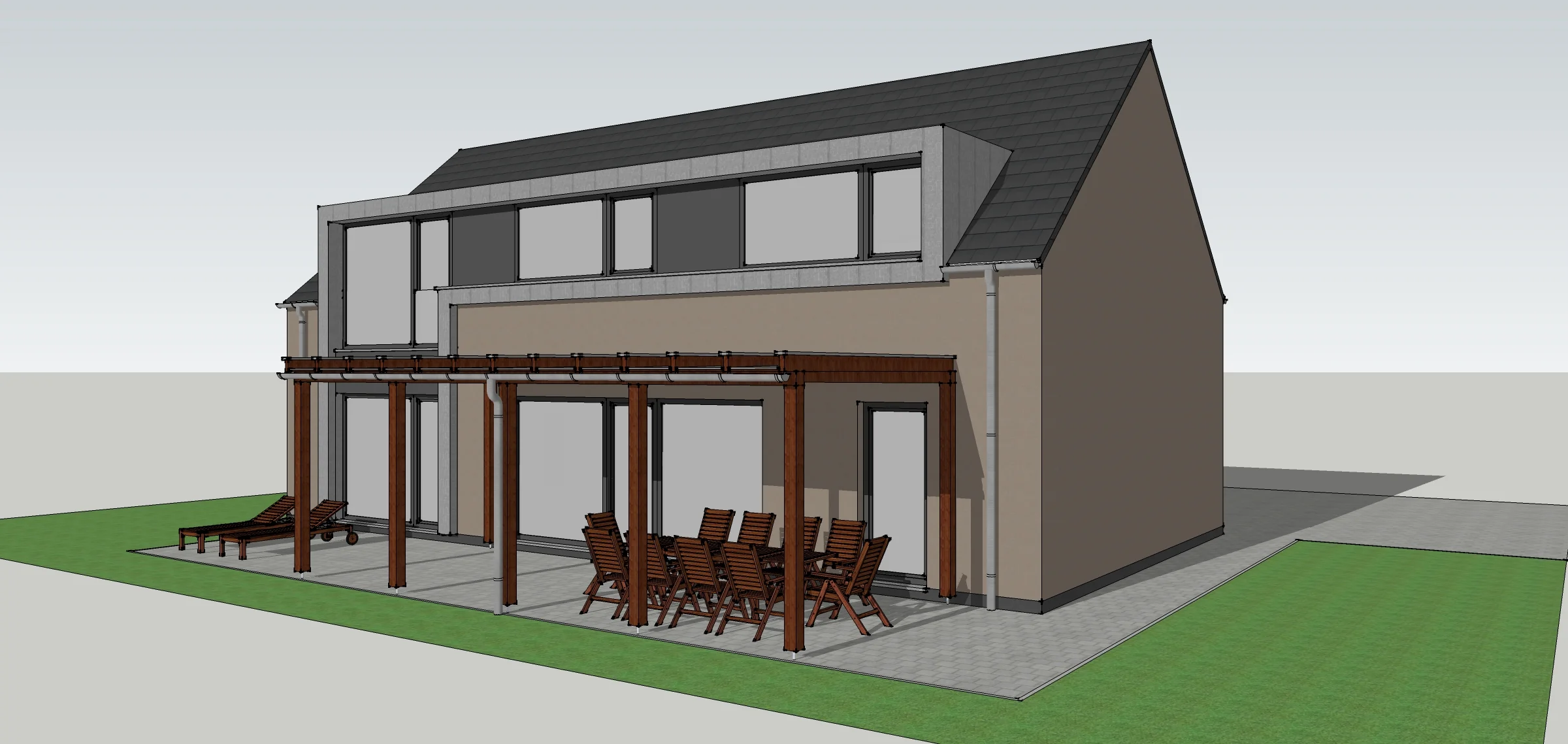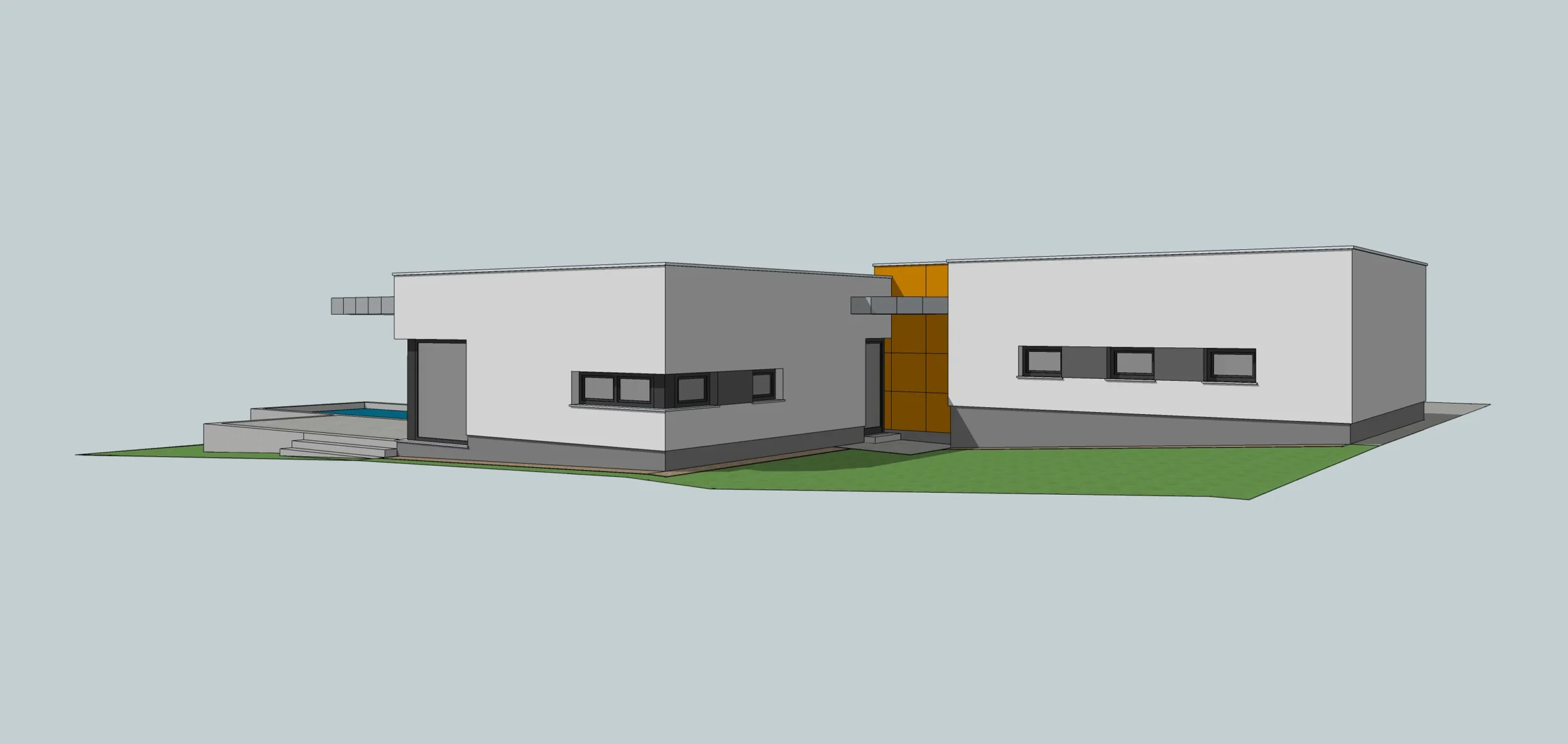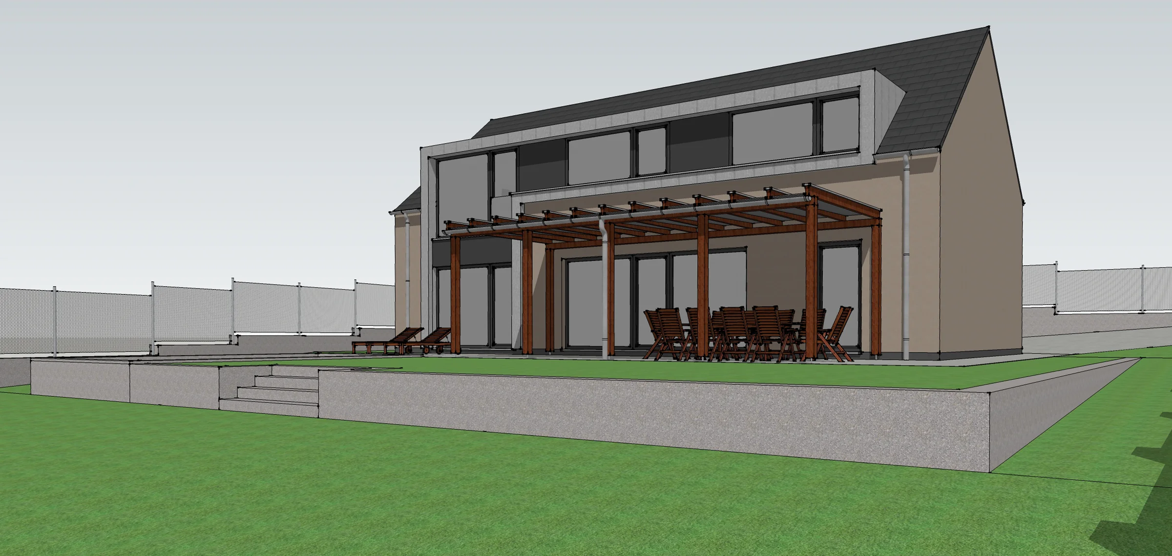 Novostavba rodinného domu má obdélníkový půdorys, který kopíruje tvar pozemku. Sestává z hlavní obytné části s moderními arkýři, samostatně stojící dvojgaráže na severní straně a zastřešené pergoly orientované na jih.