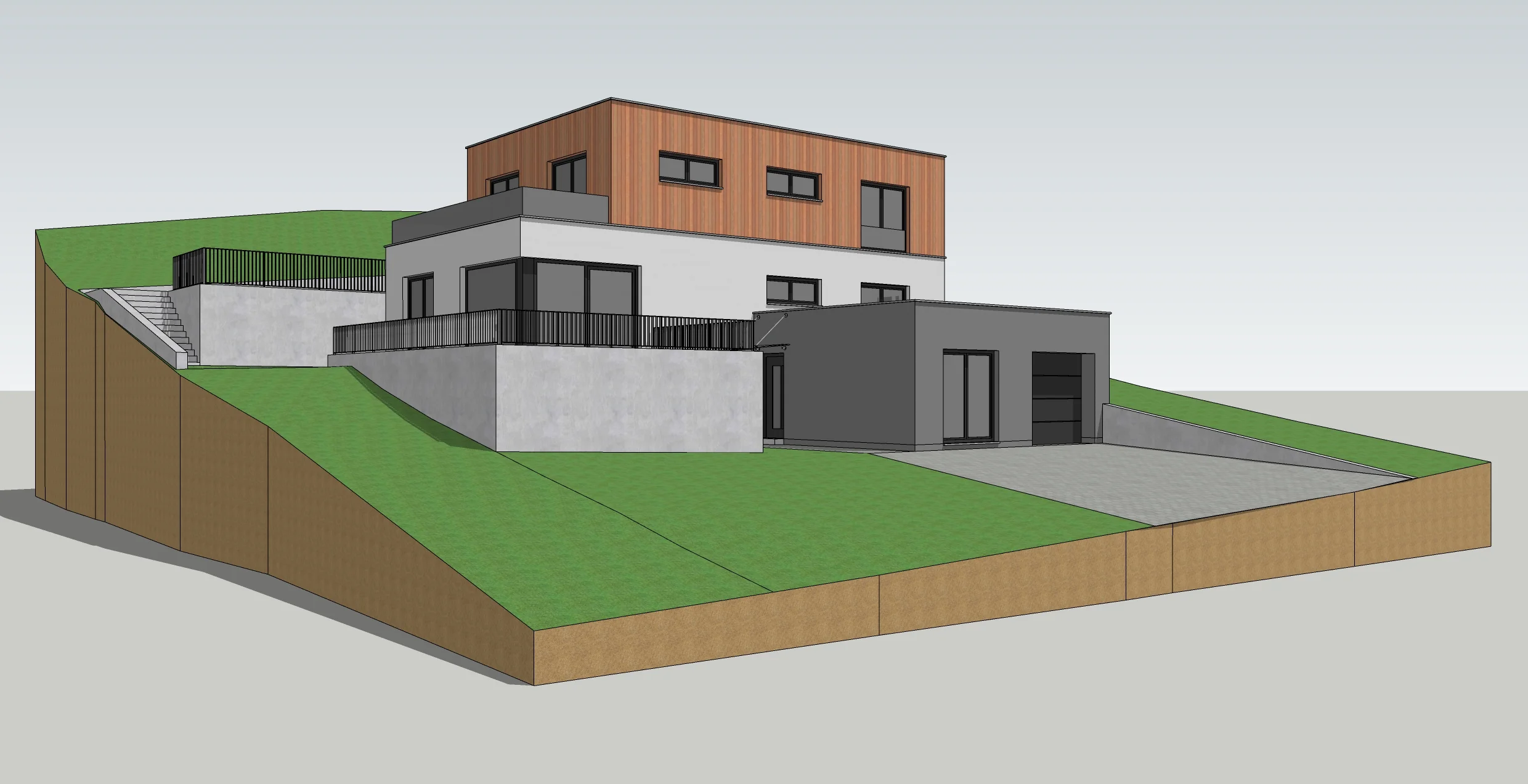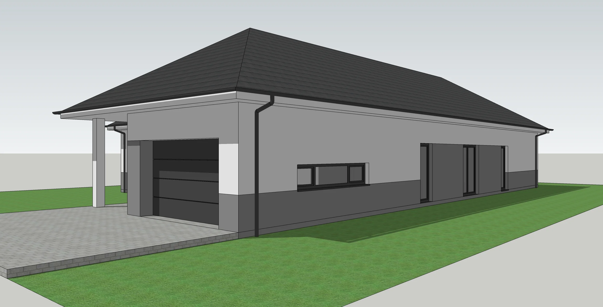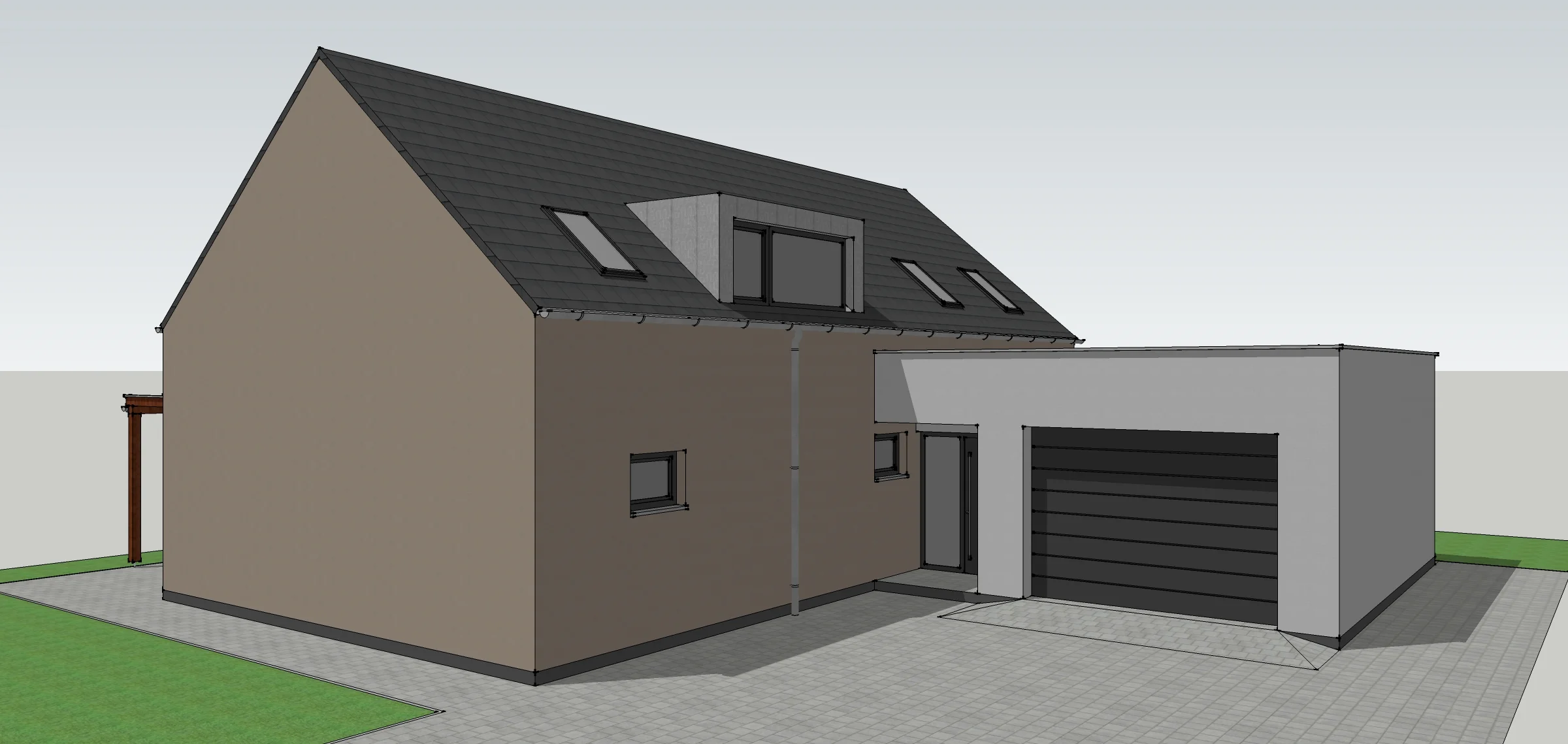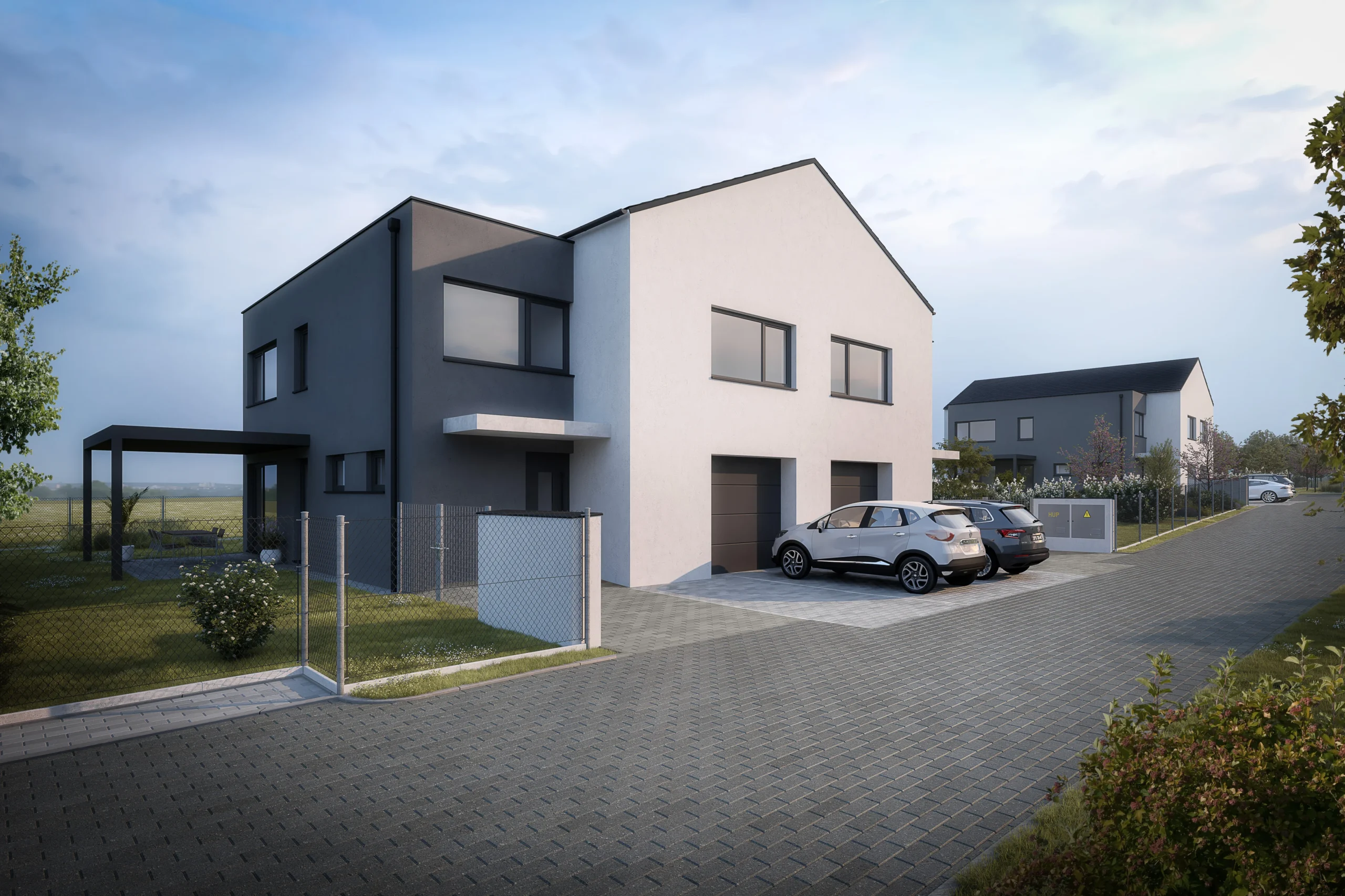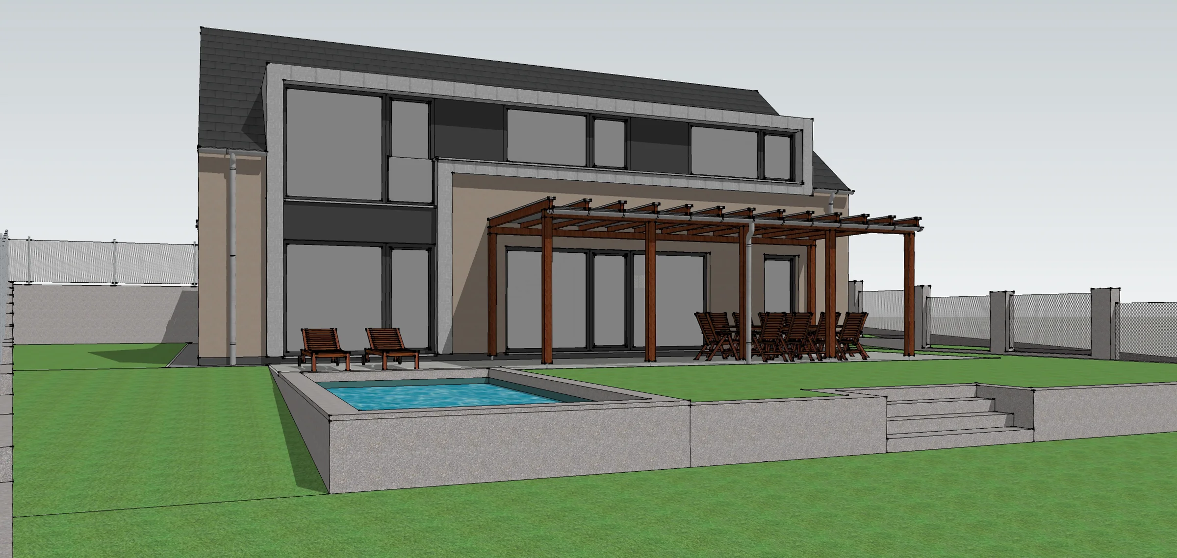 Novostavba rodinného domu má obdélníkový půdorys, který kopíruje tvar pozemku. Sestává z hlavní obytné části s moderními arkýři, samostatně stojící dvojgaráže na severní straně a zastřešené pergoly orientované na jih.