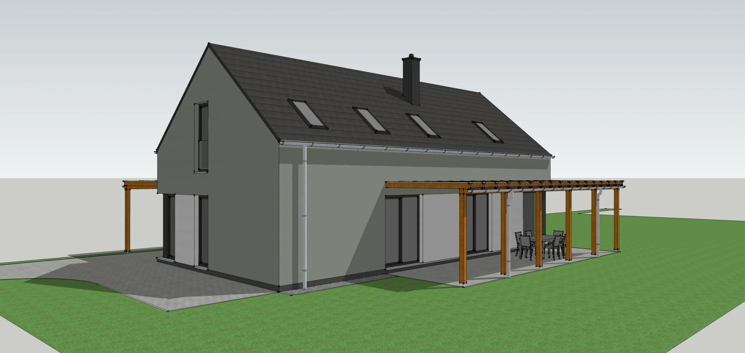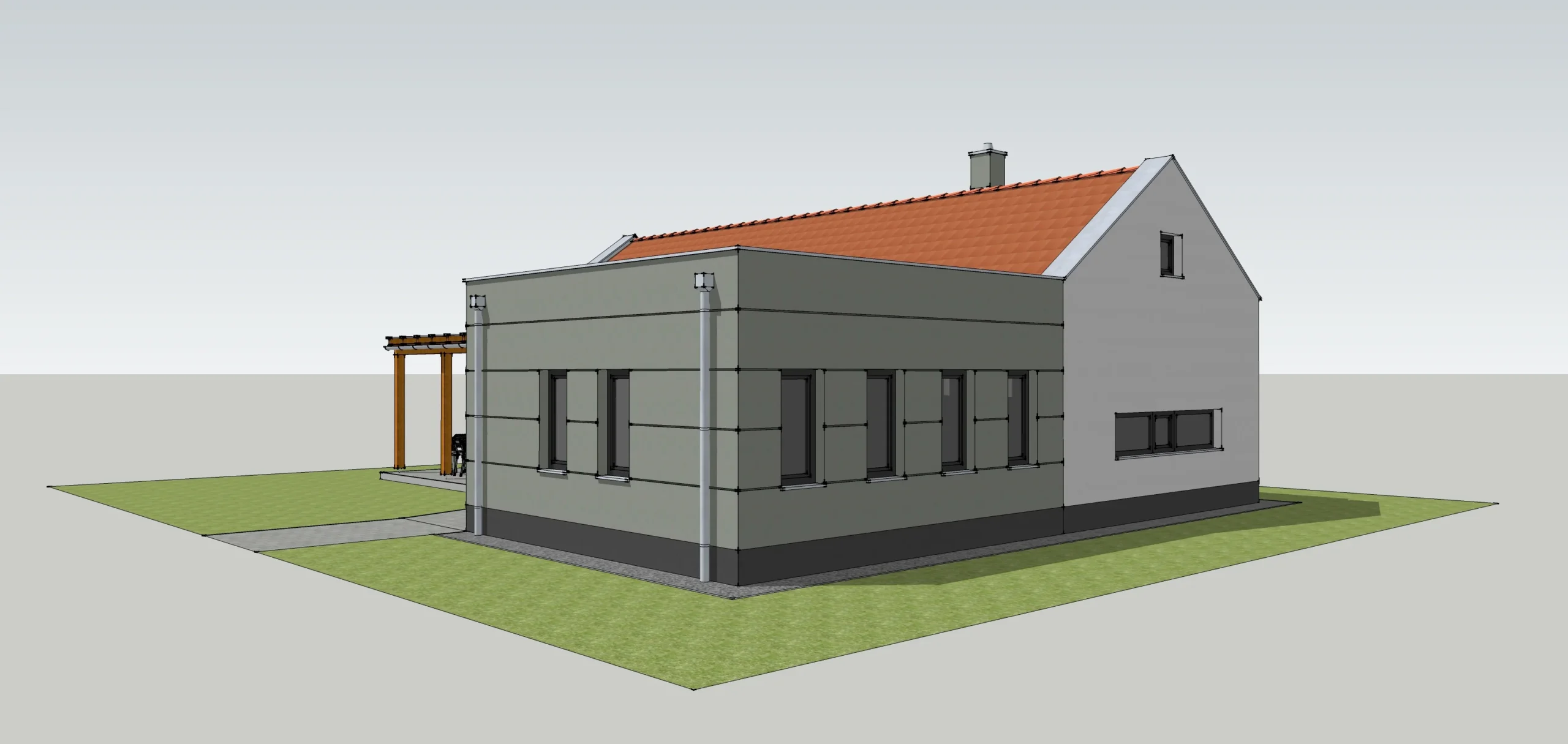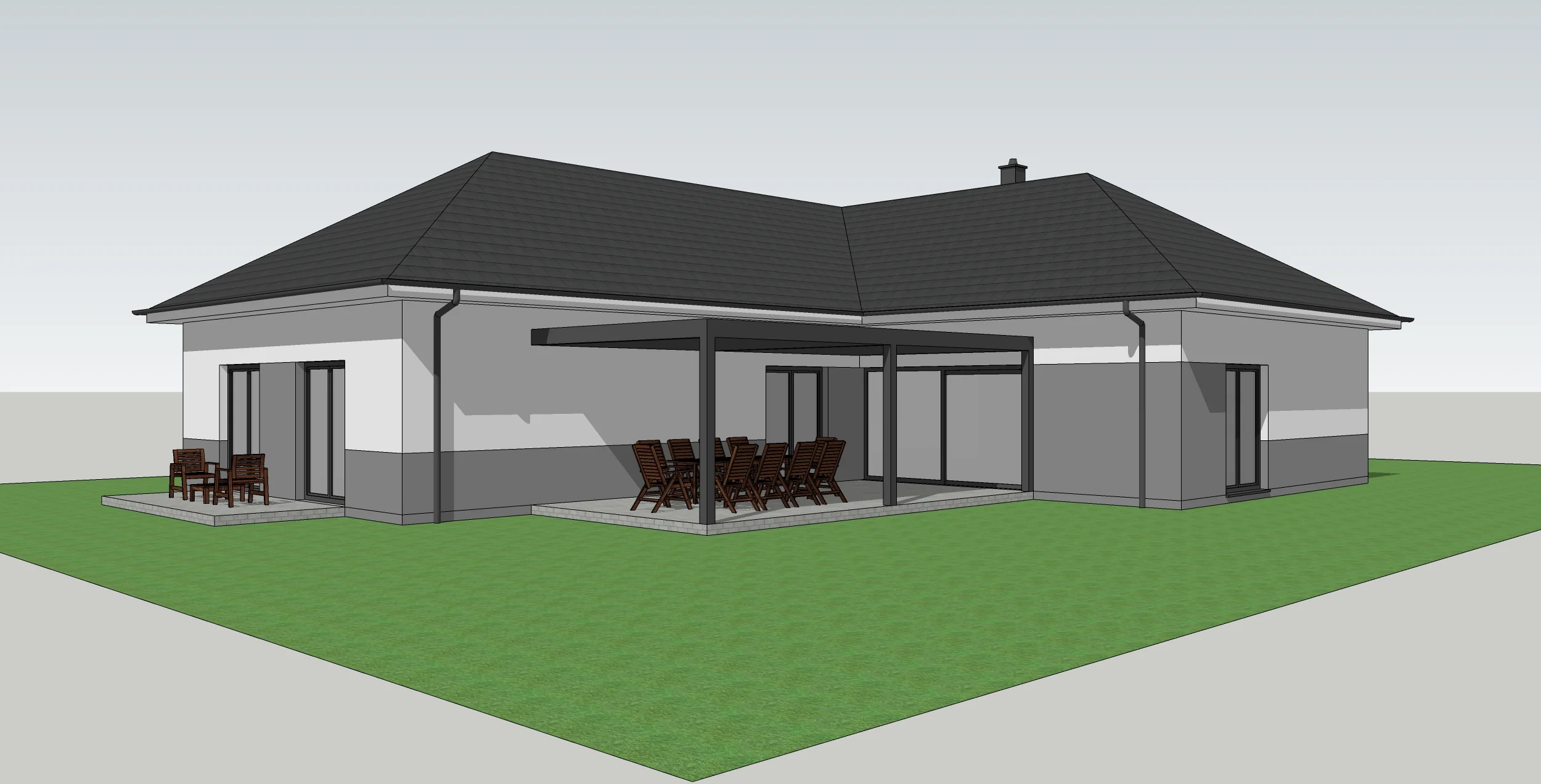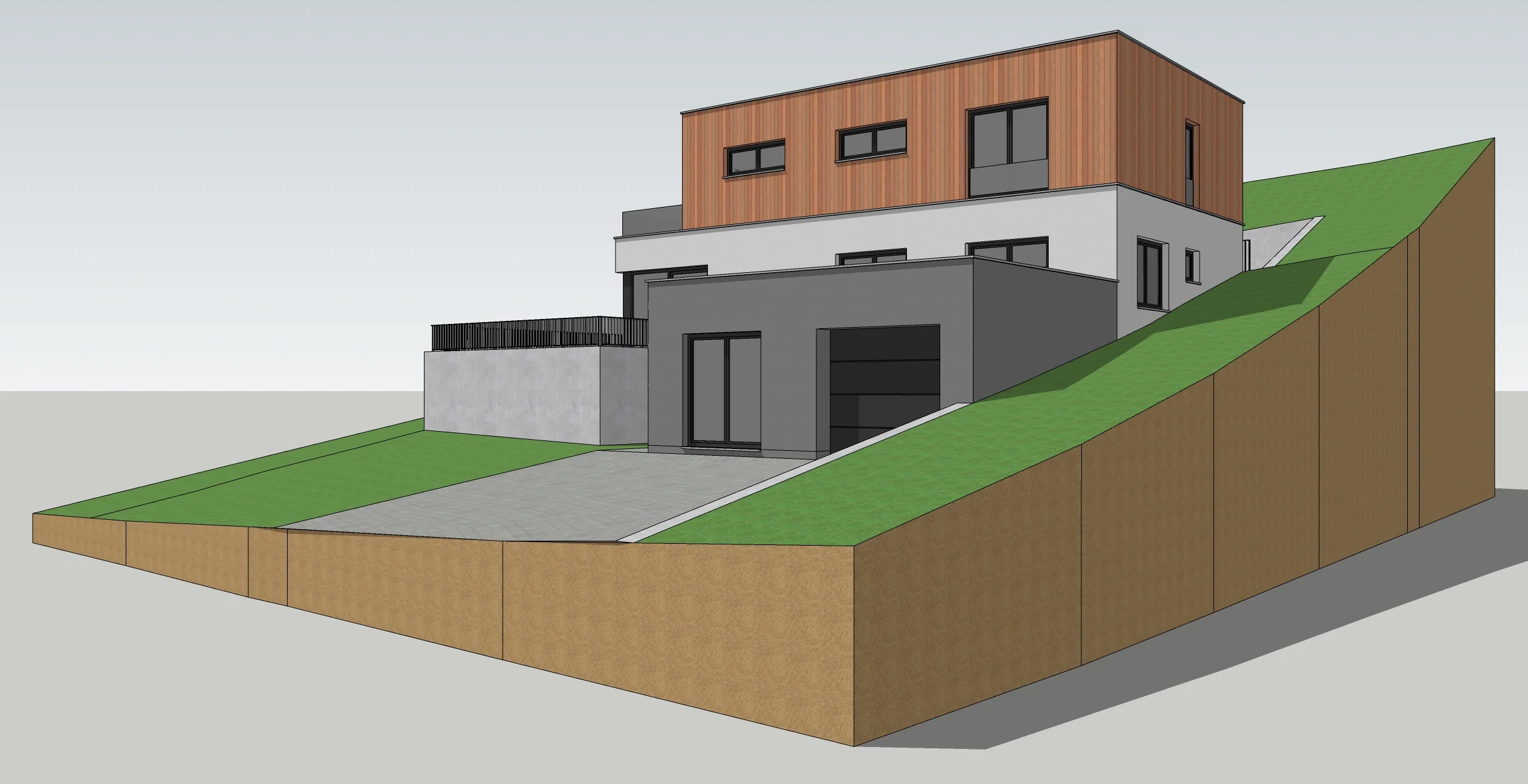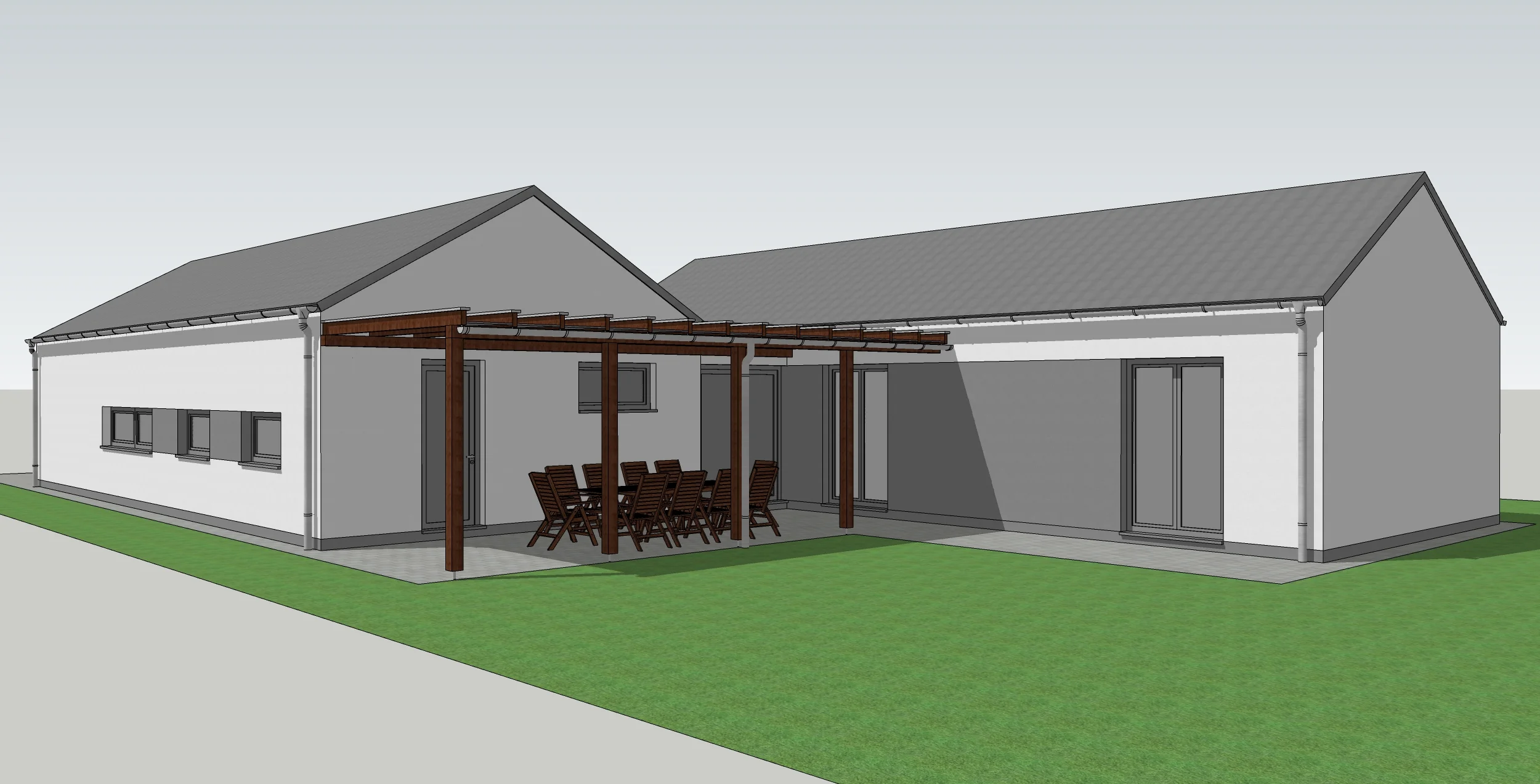Novostavba rodinného domu má obdélníkový půdorys, který kopíruje tvar pozemku. Sestává z hlavní obytné části s moderními arkýři, samostatně stojící dvojgaráže na severní straně a zastřešené pergoly orientované na jih.