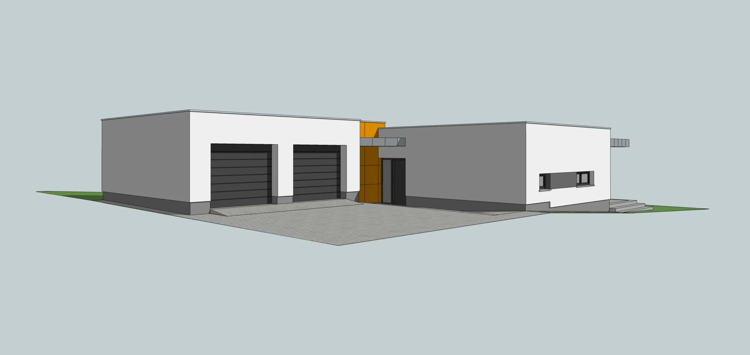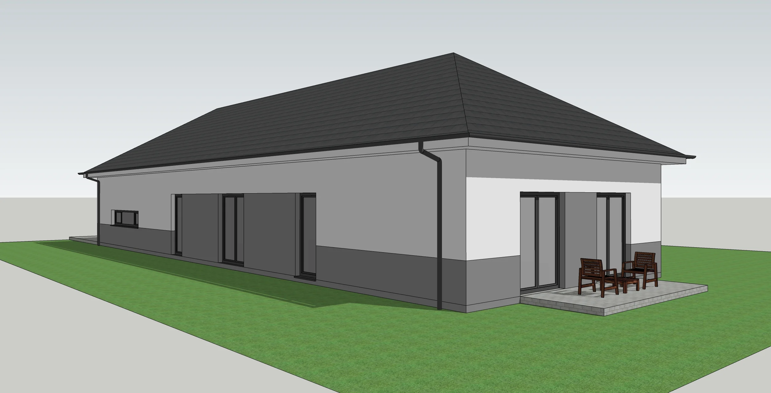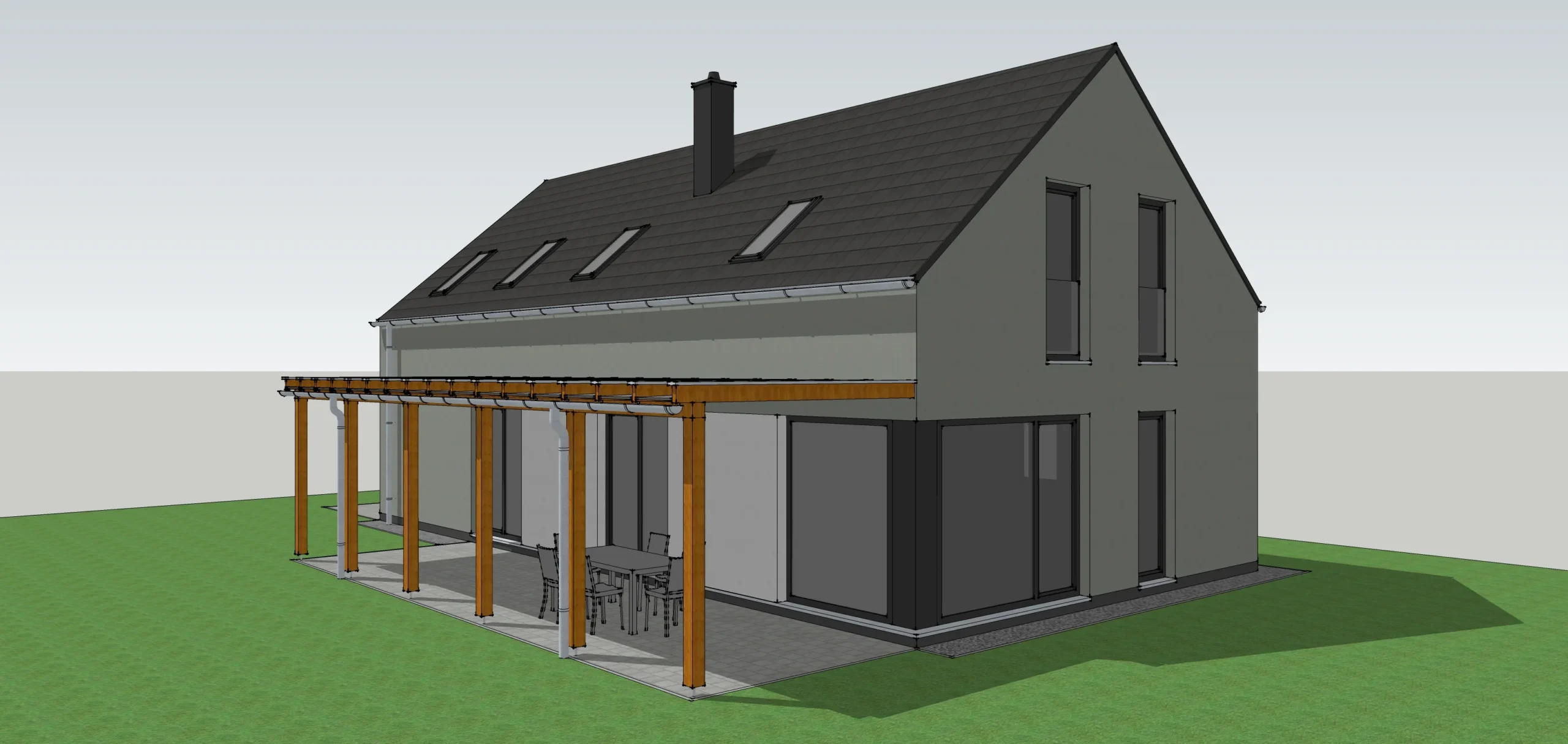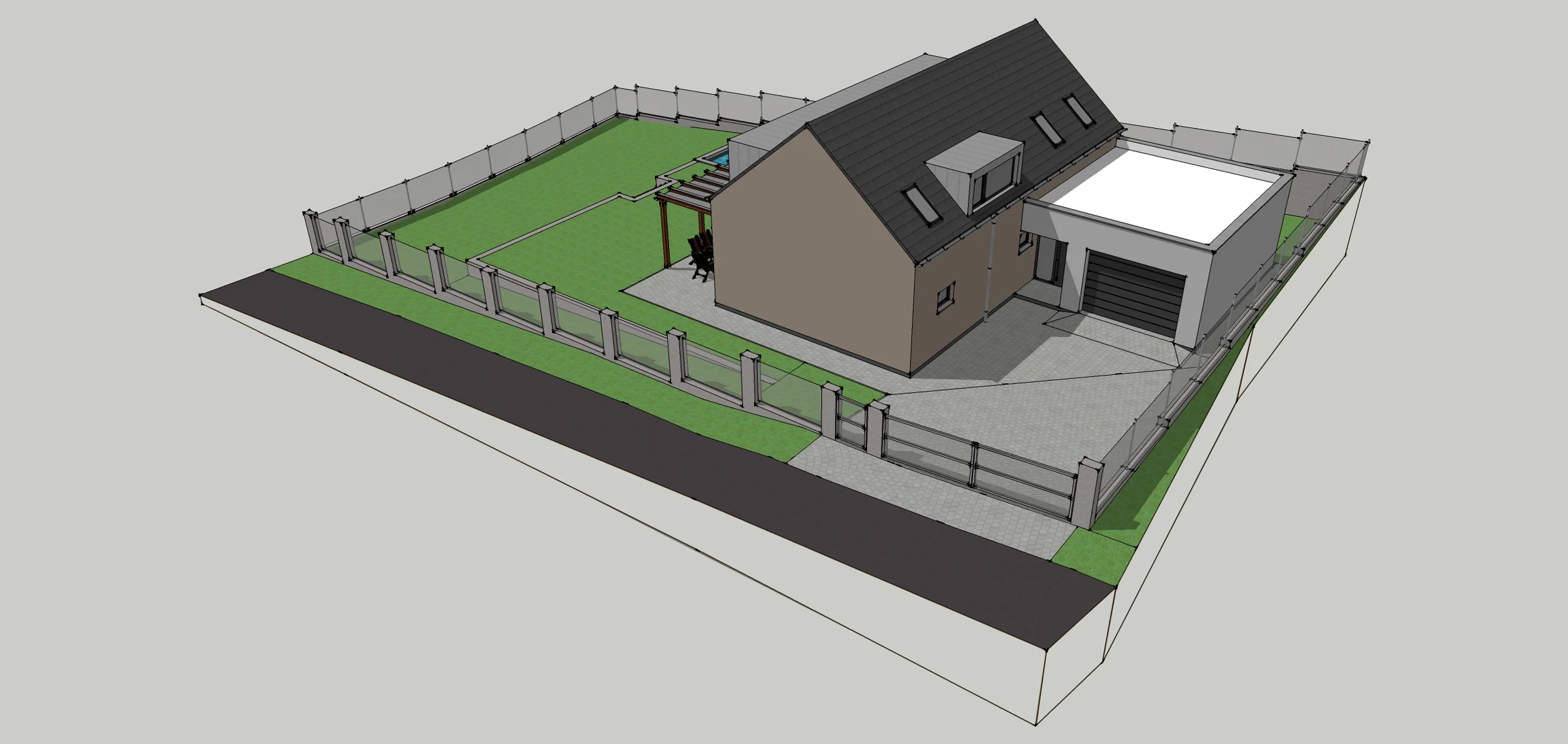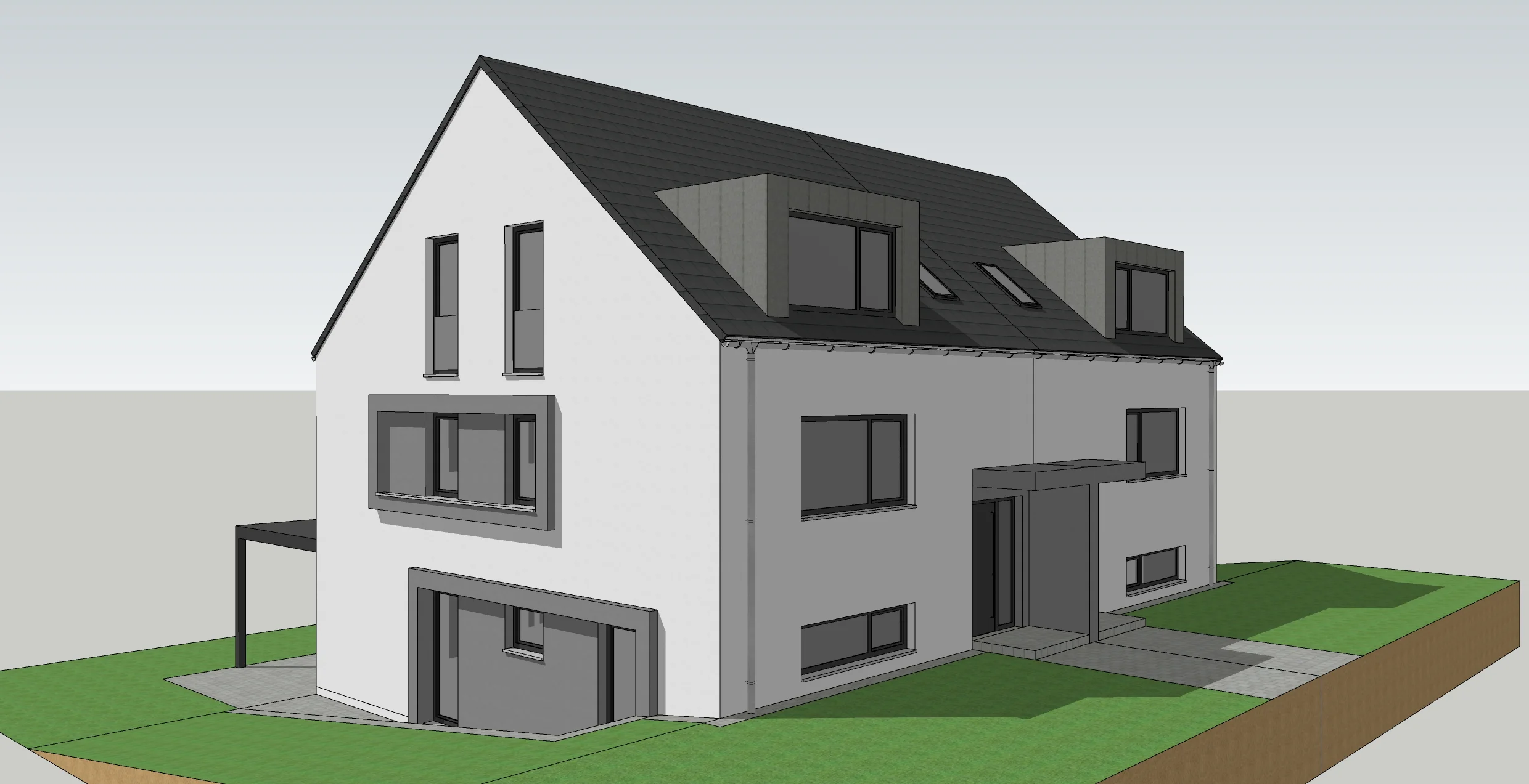 Novostavba rodinného domu má obdélníkový půdorys, který kopíruje tvar pozemku. Sestává z hlavní obytné části s moderními arkýři, samostatně stojící dvojgaráže na severní straně a zastřešené pergoly orientované na jih.