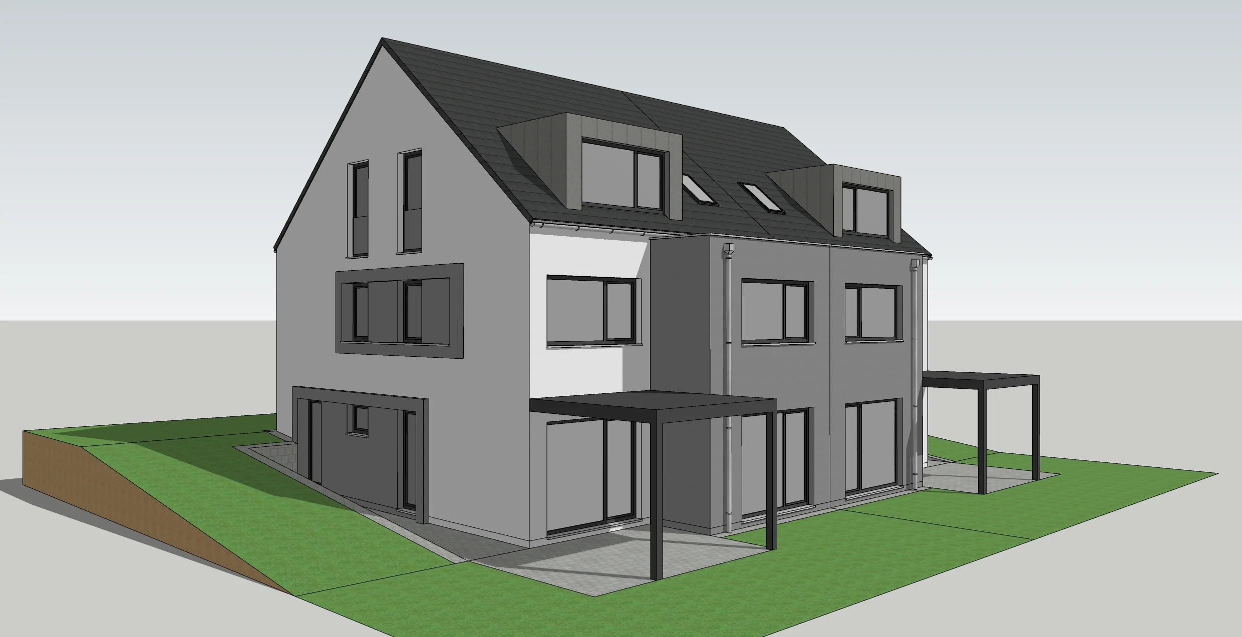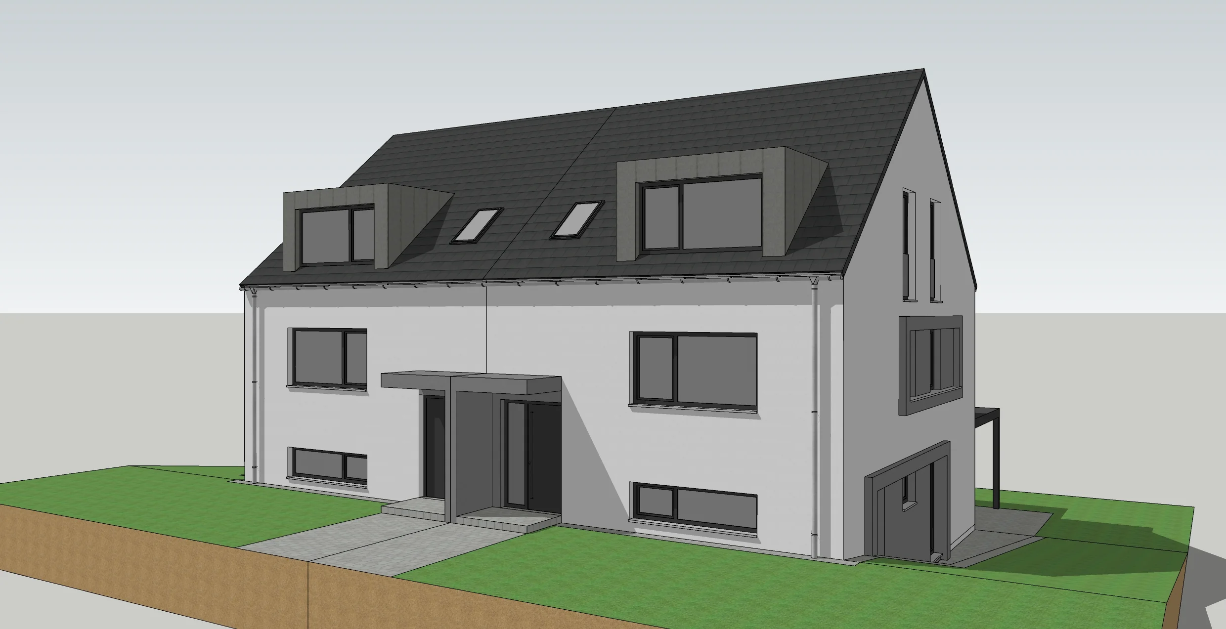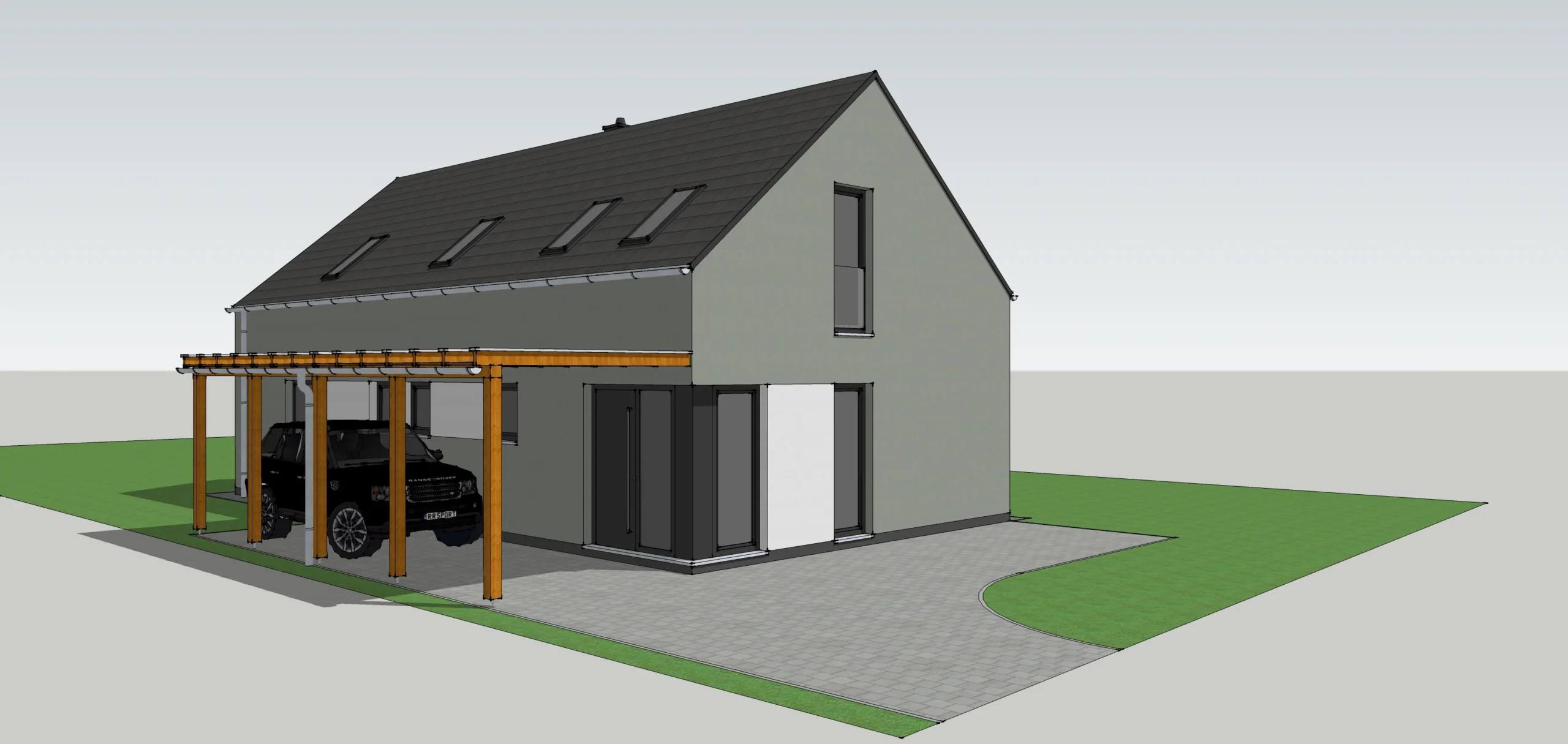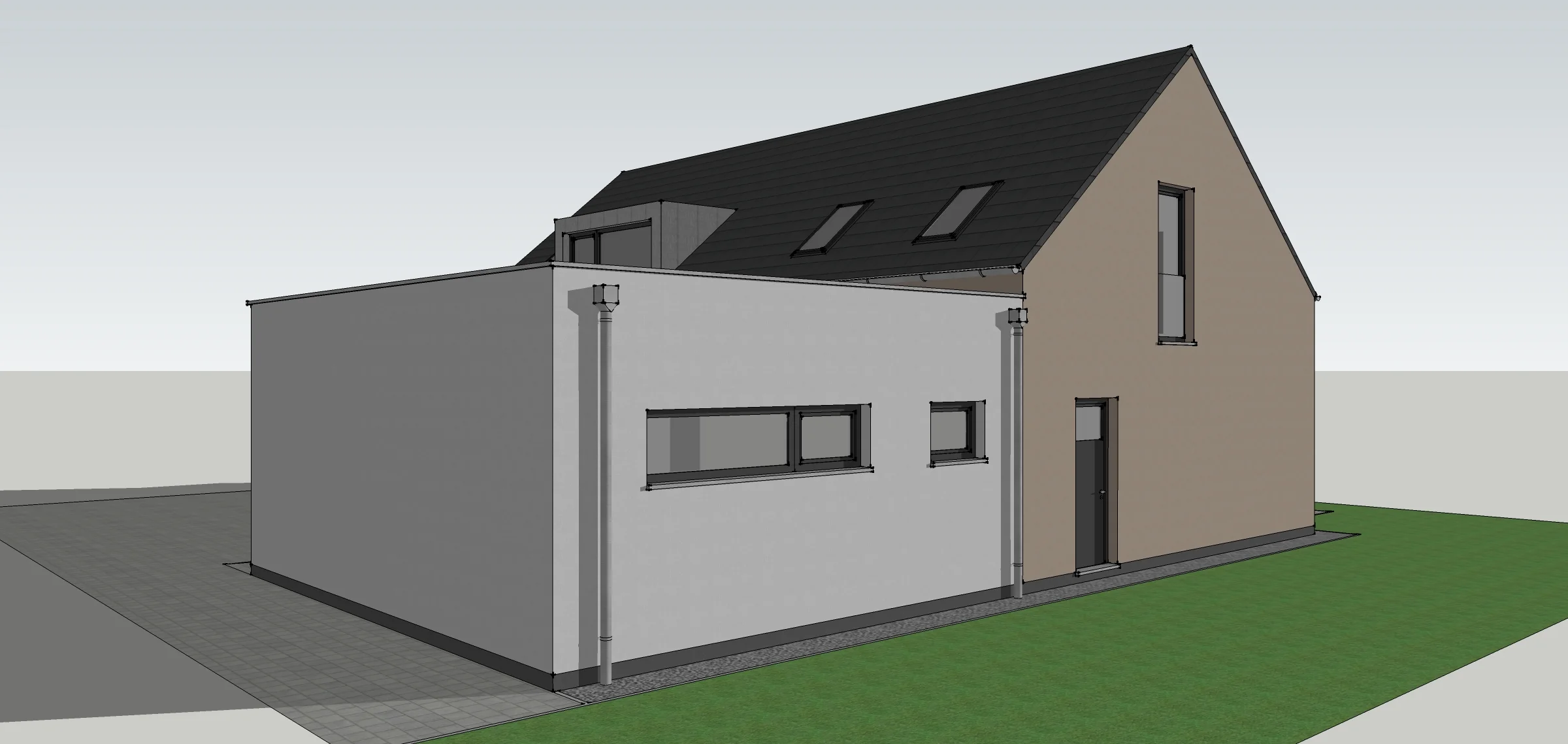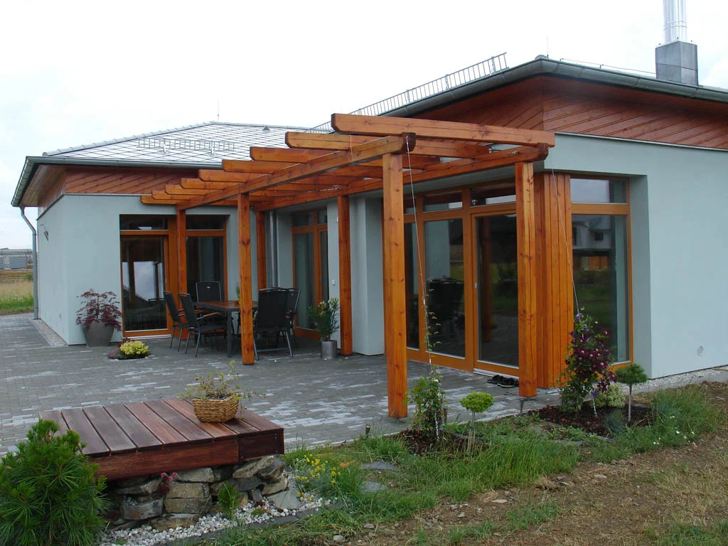 Novostavba rodinného domu má obdélníkový půdorys, který kopíruje tvar pozemku. Sestává z hlavní obytné části s moderními arkýři, samostatně stojící dvojgaráže na severní straně a zastřešené pergoly orientované na jih.
