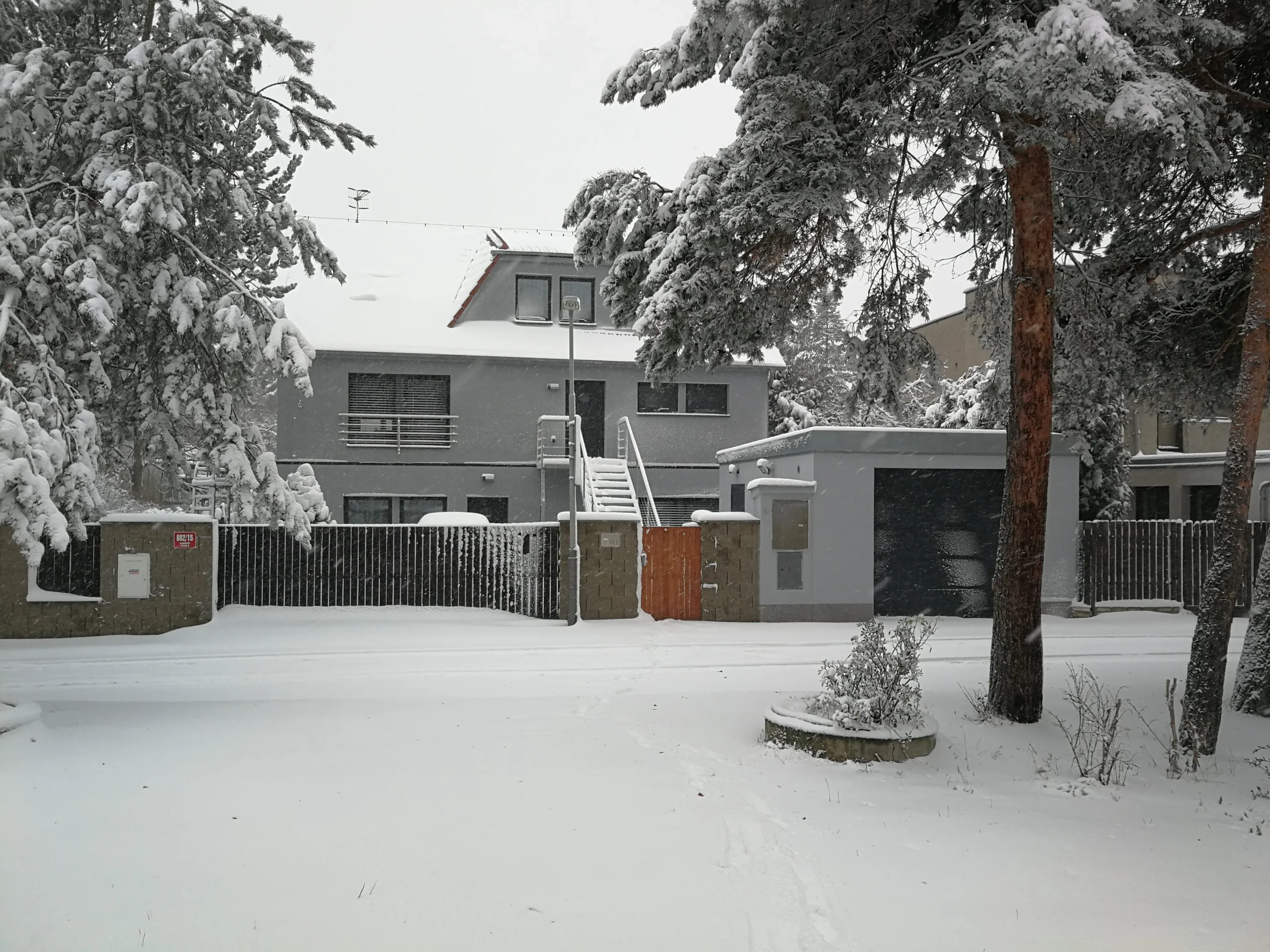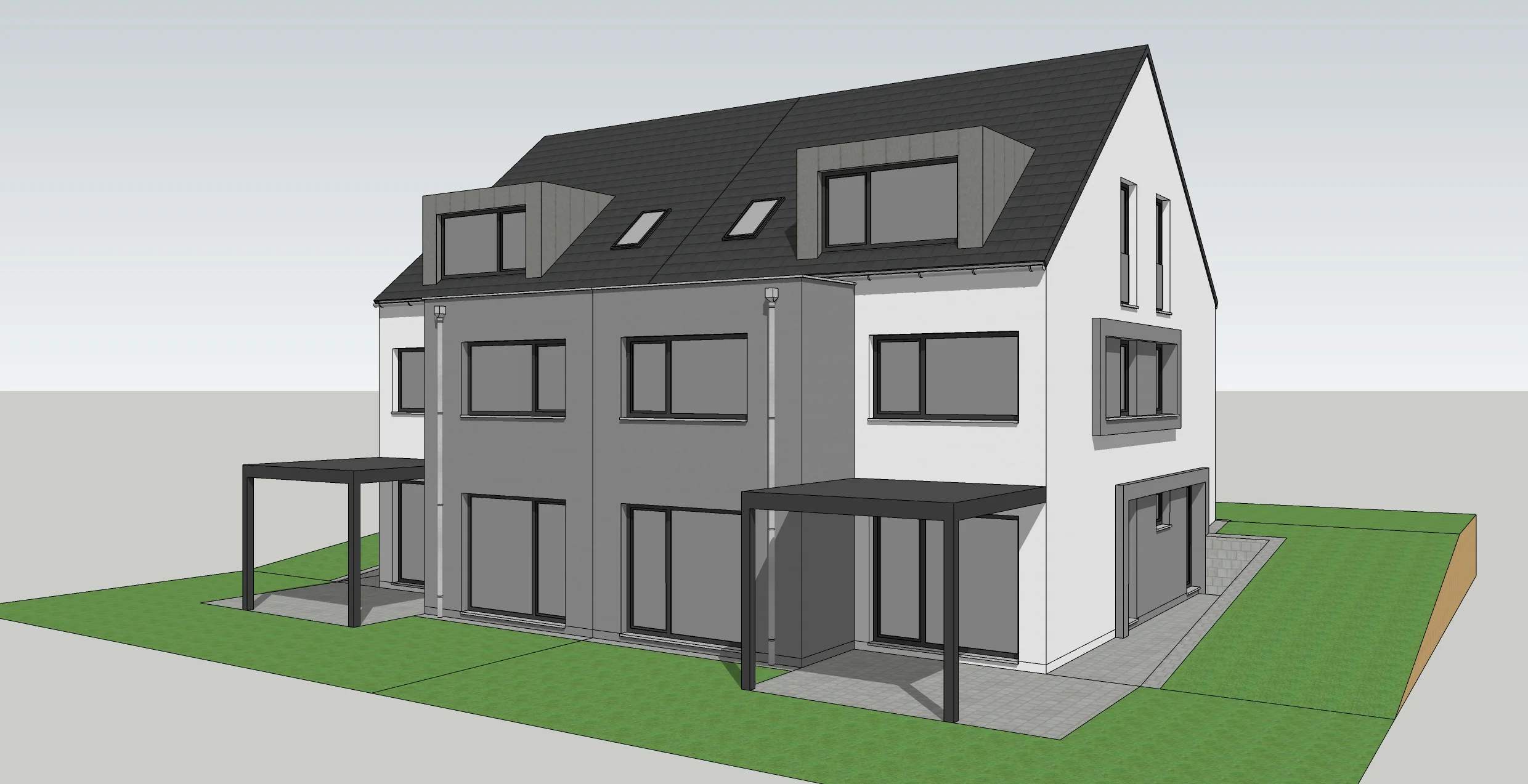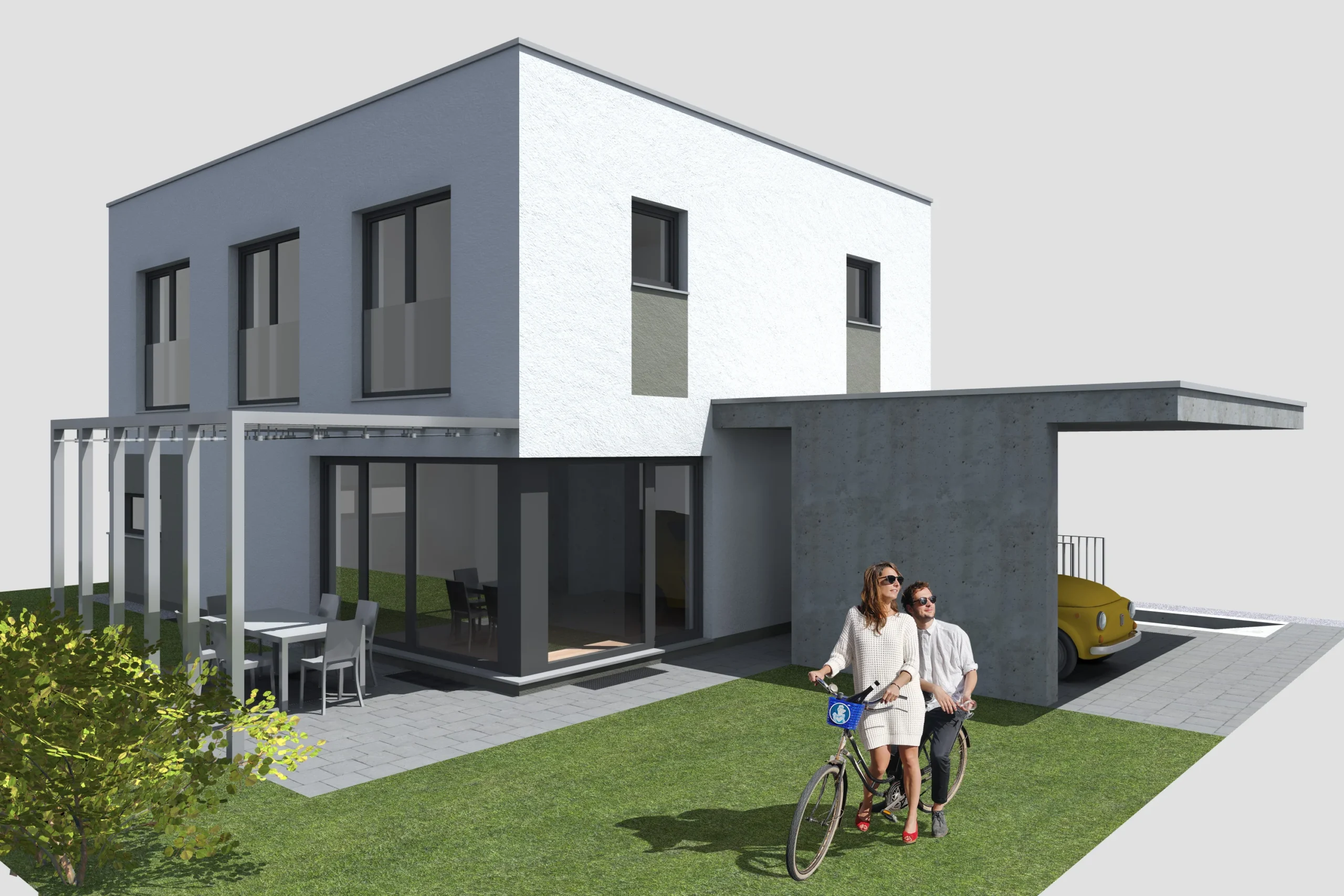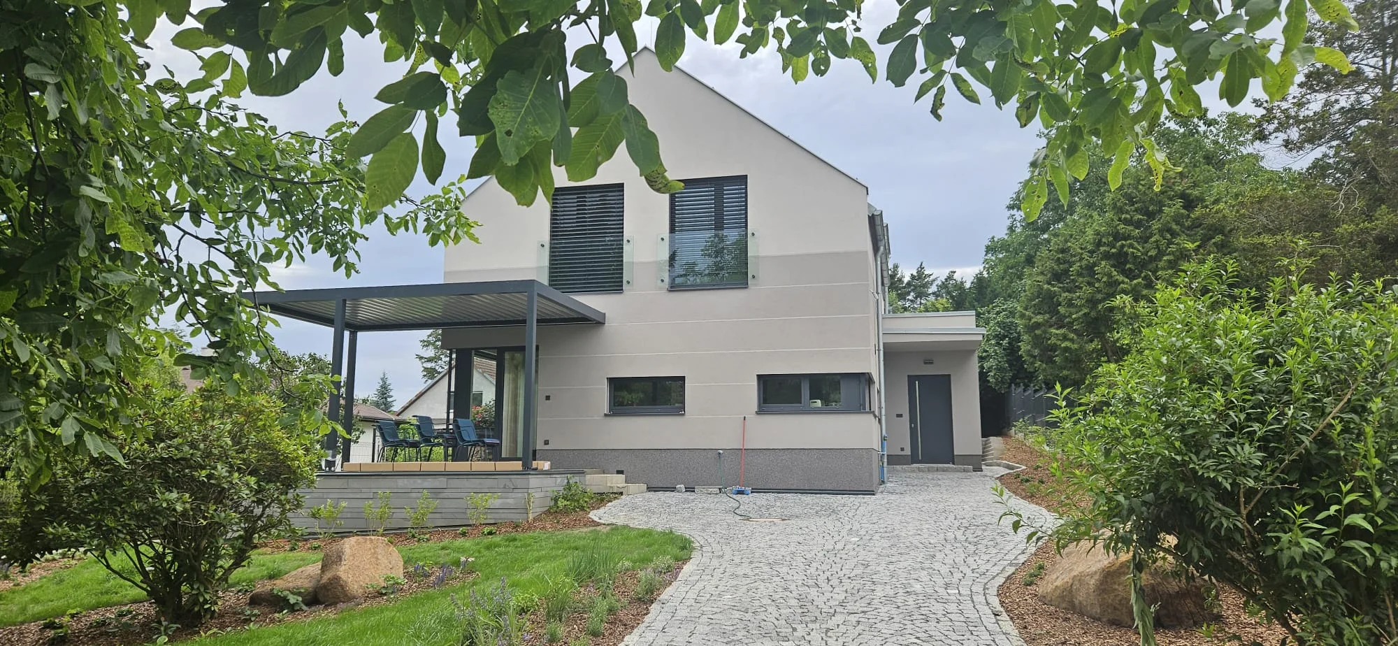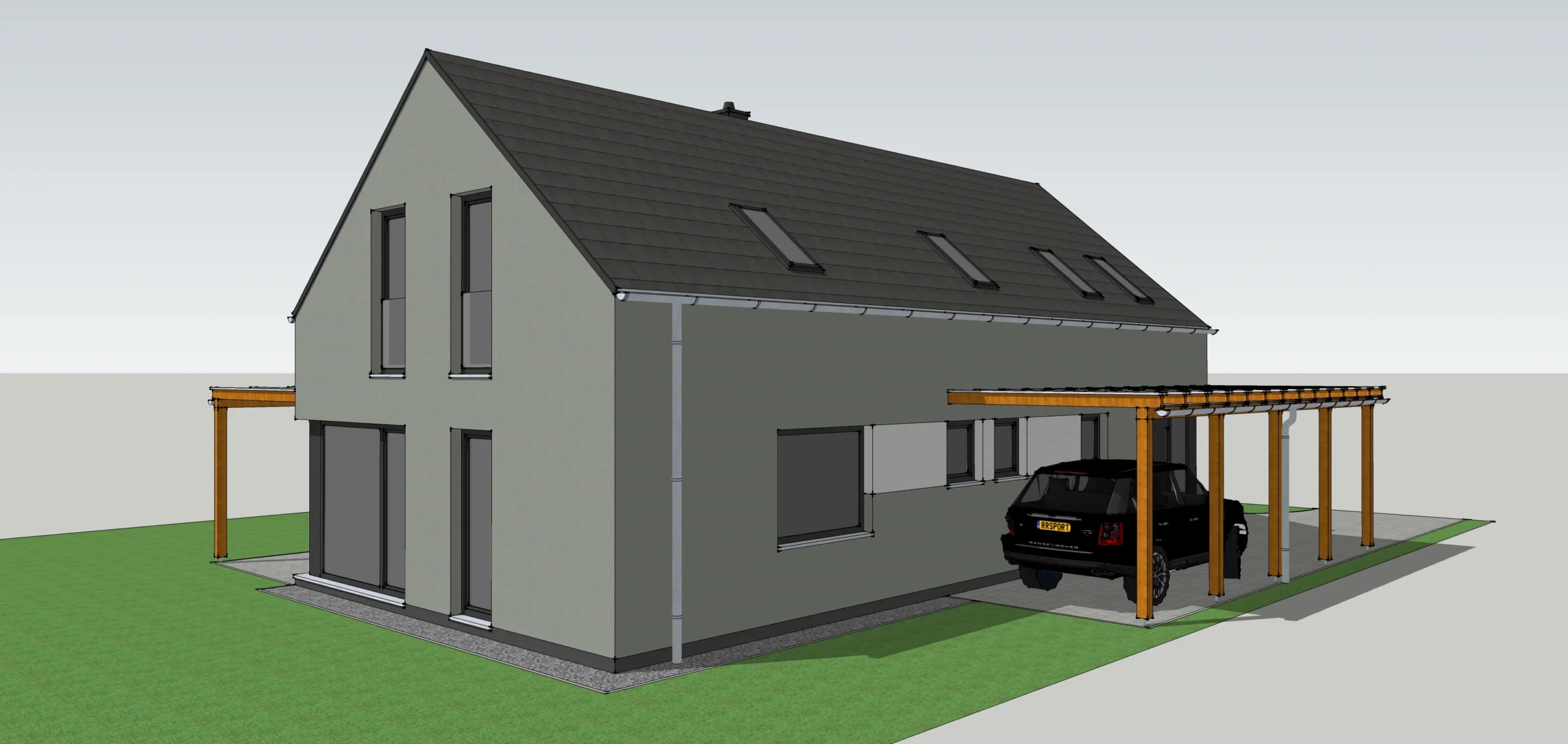 Novostavba rodinného domu má obdélníkový půdorys, který kopíruje tvar pozemku. Sestává z hlavní obytné části s moderními arkýři, samostatně stojící dvojgaráže na severní straně a zastřešené pergoly orientované na jih.