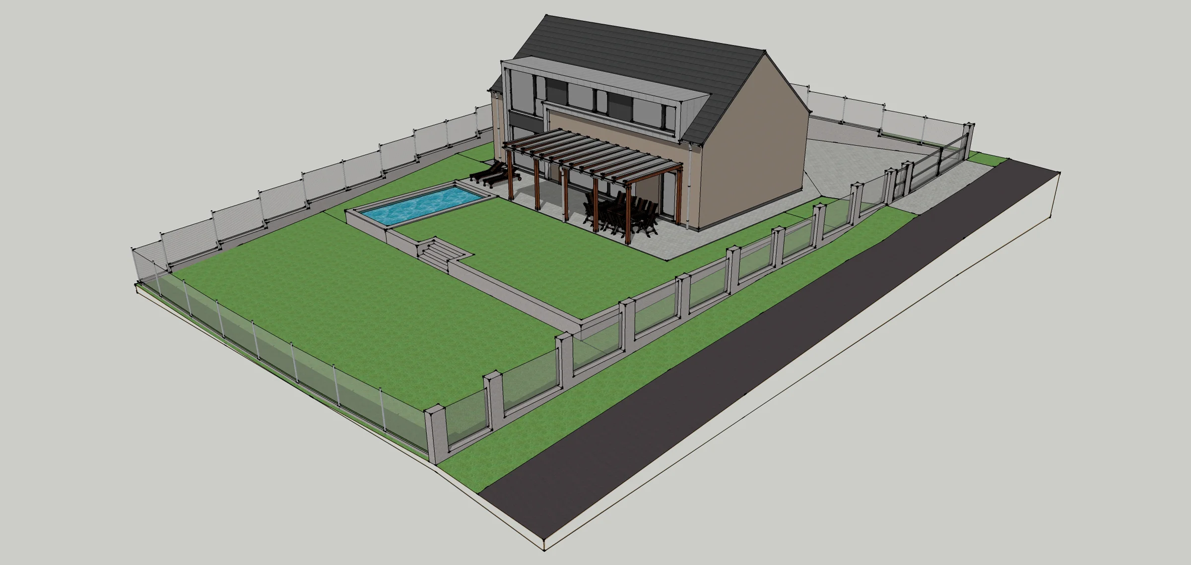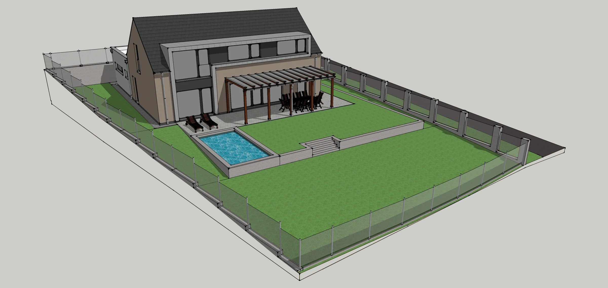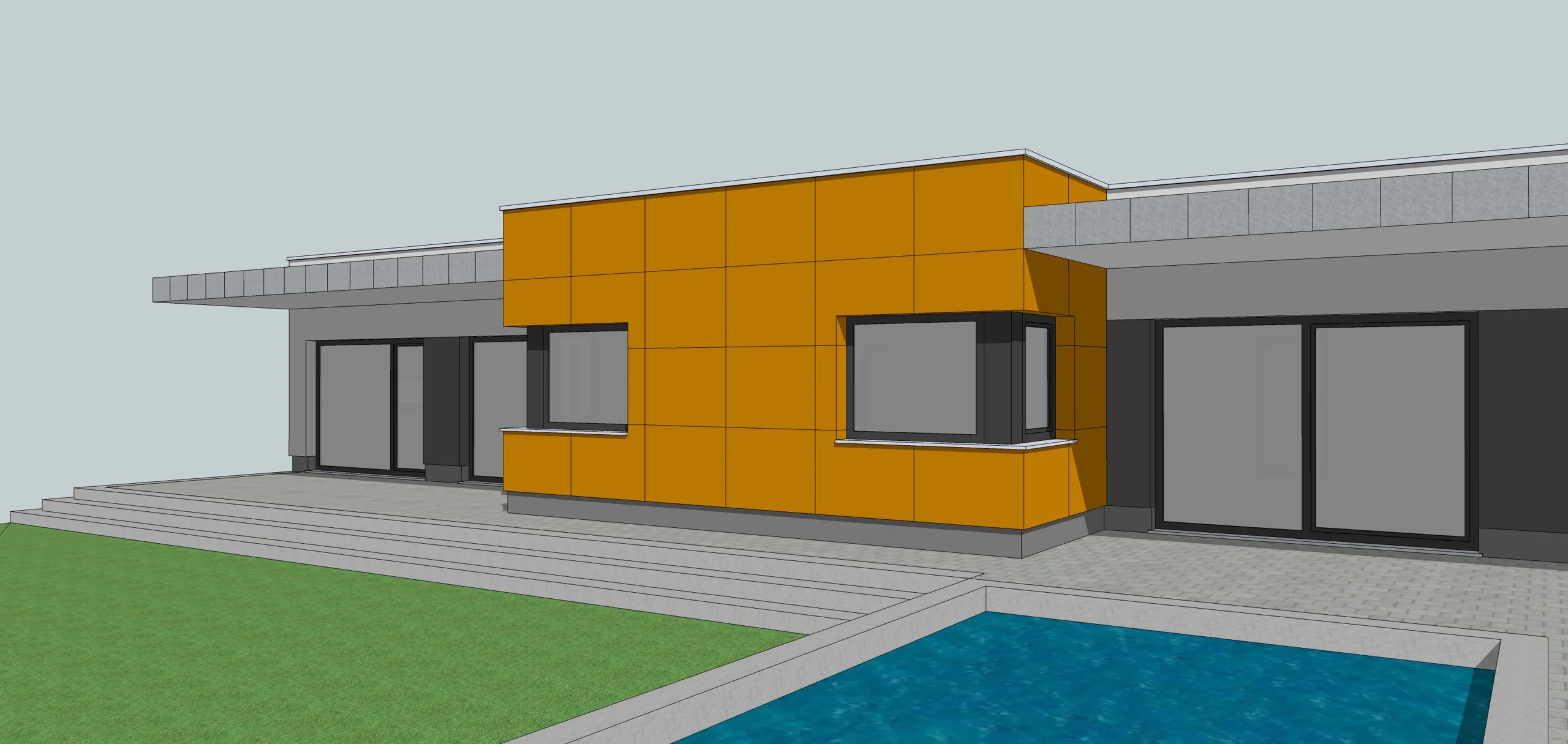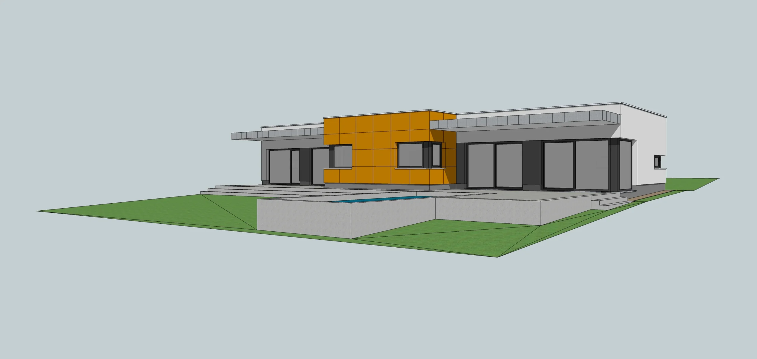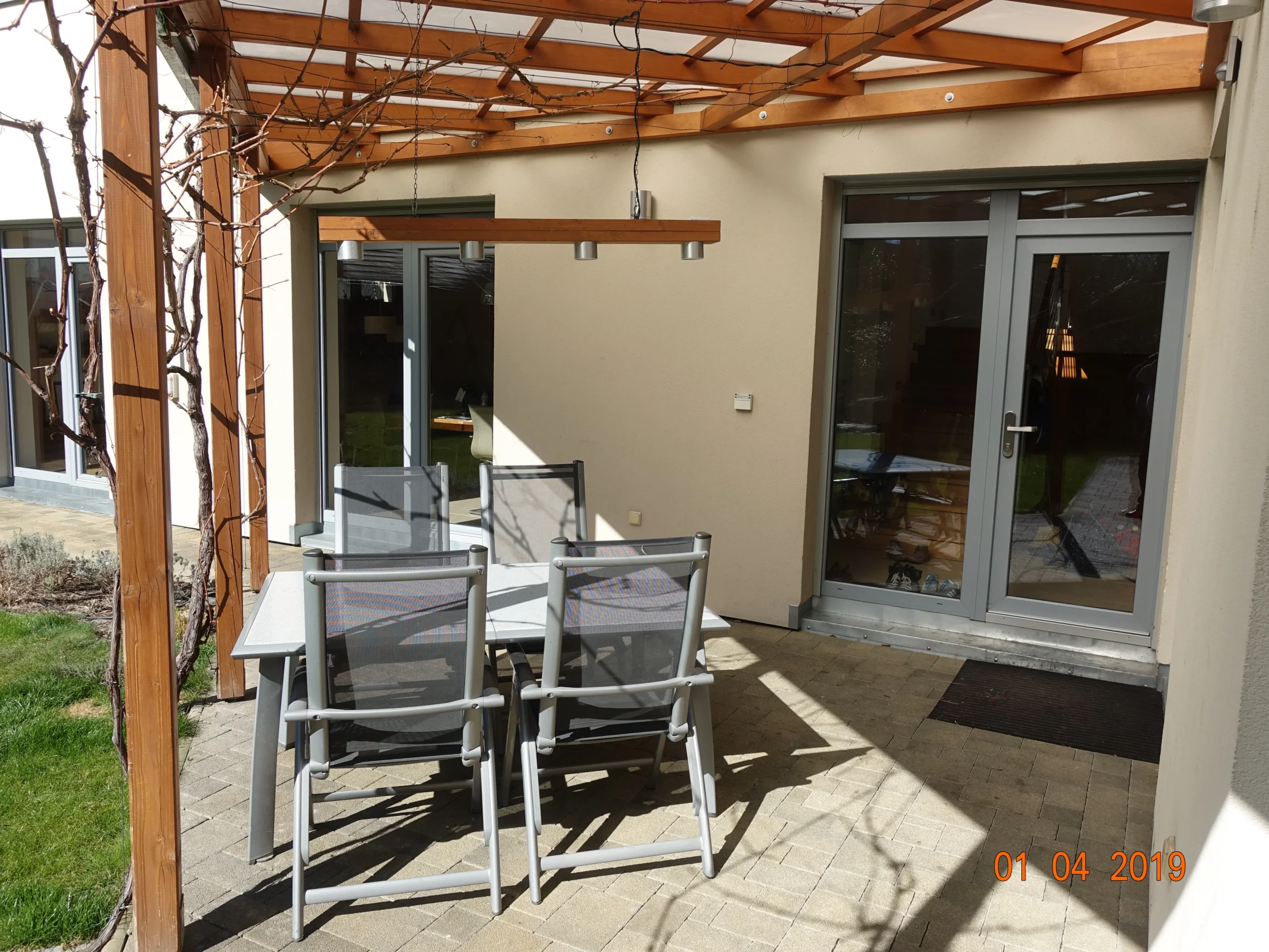 Novostavba rodinného domu má obdélníkový půdorys, který kopíruje tvar pozemku. Sestává z hlavní obytné části s moderními arkýři, samostatně stojící dvojgaráže na severní straně a zastřešené pergoly orientované na jih.