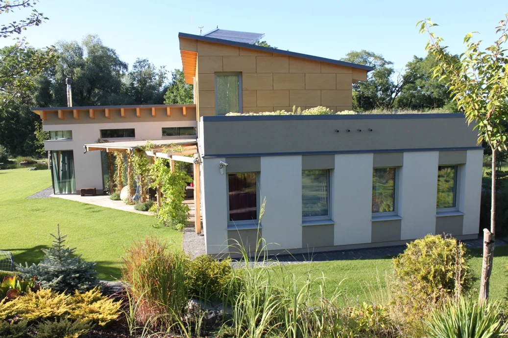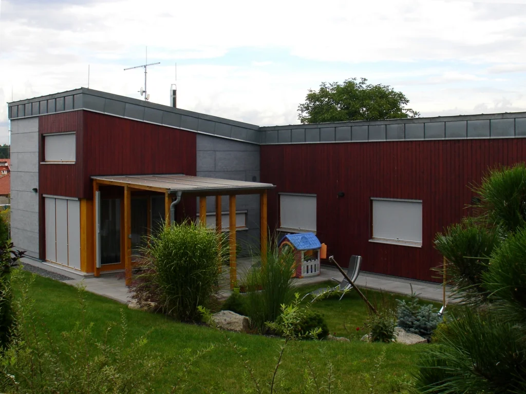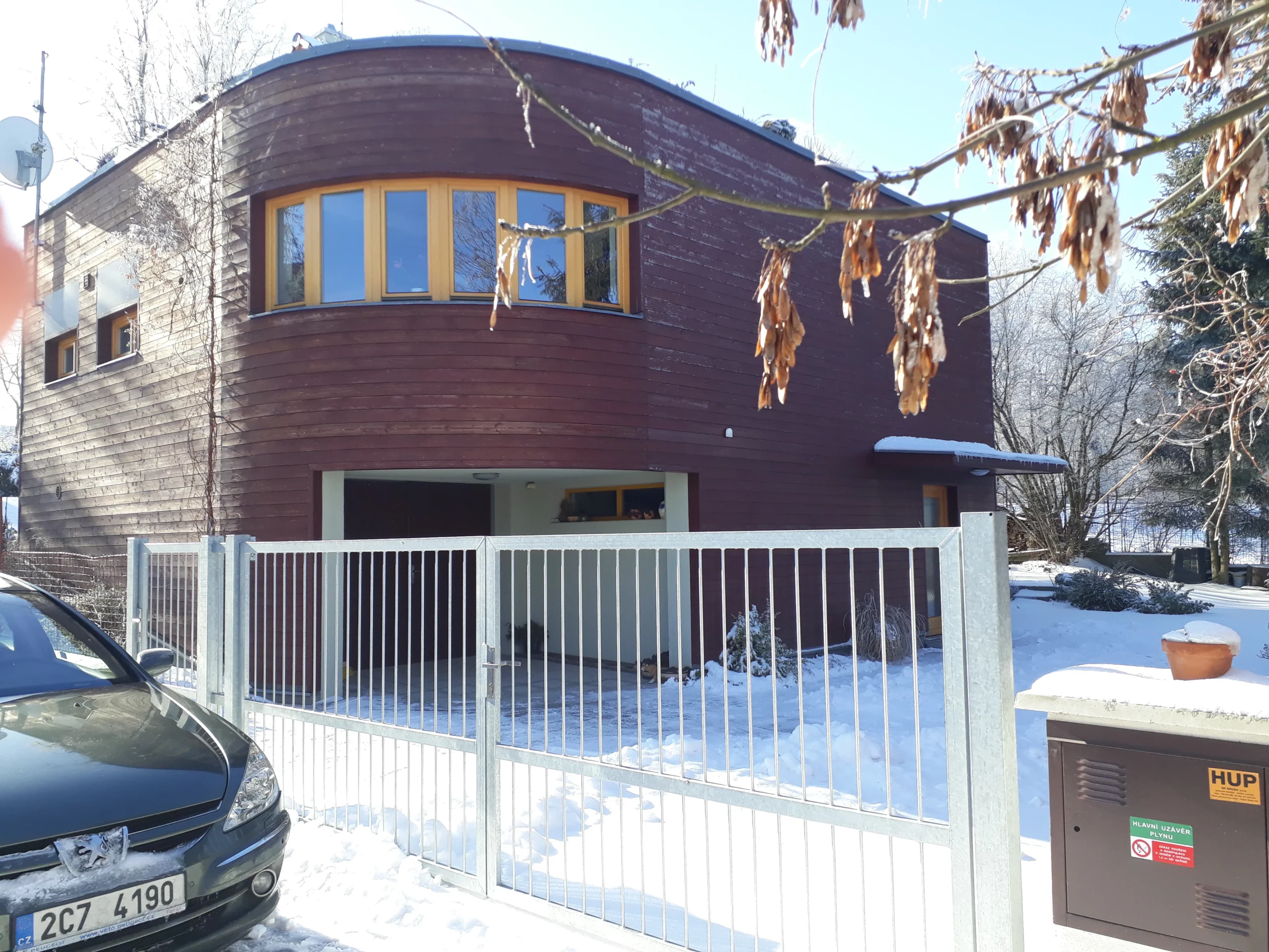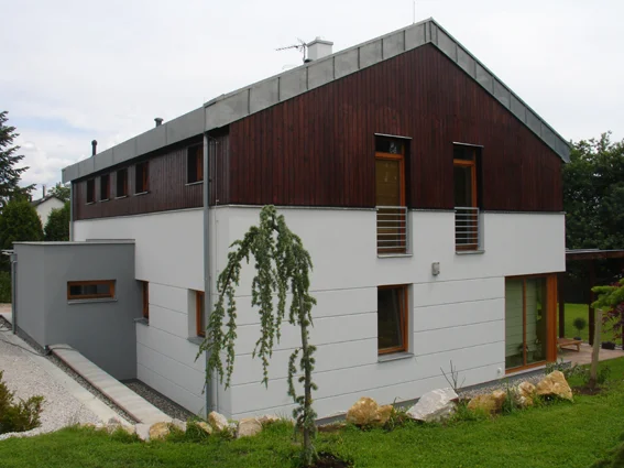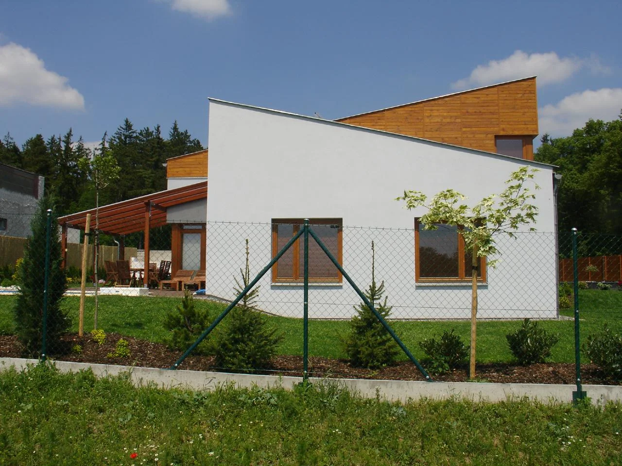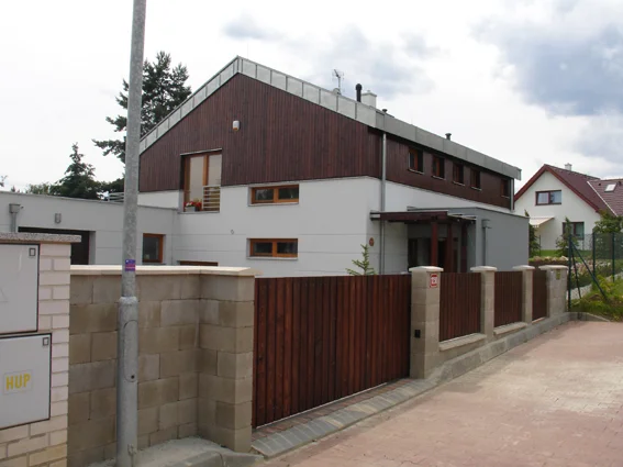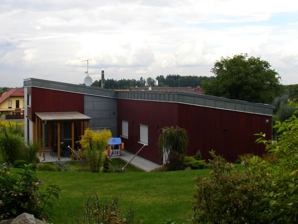 Vstup na mírně svažitý pozemek je od severu, což umožnilo dům orientovat takřka ideálně. Je složený ze dvou hmot, z nichž větší je kryta střechou sedlovou, nižší alternativně střechou sedlovou či plochou.