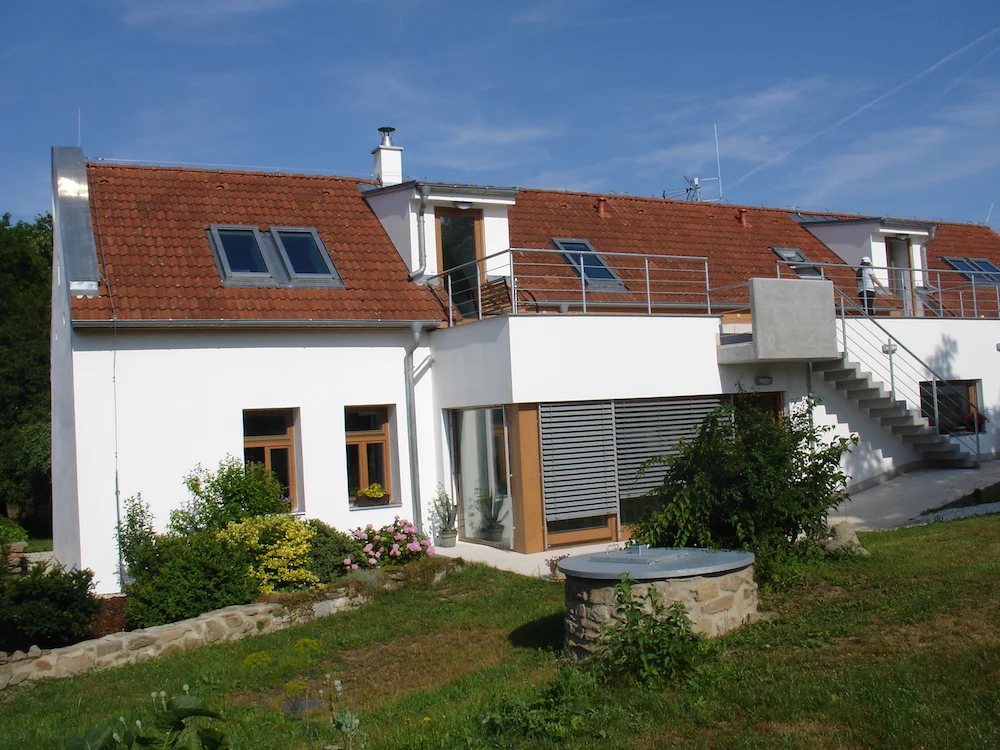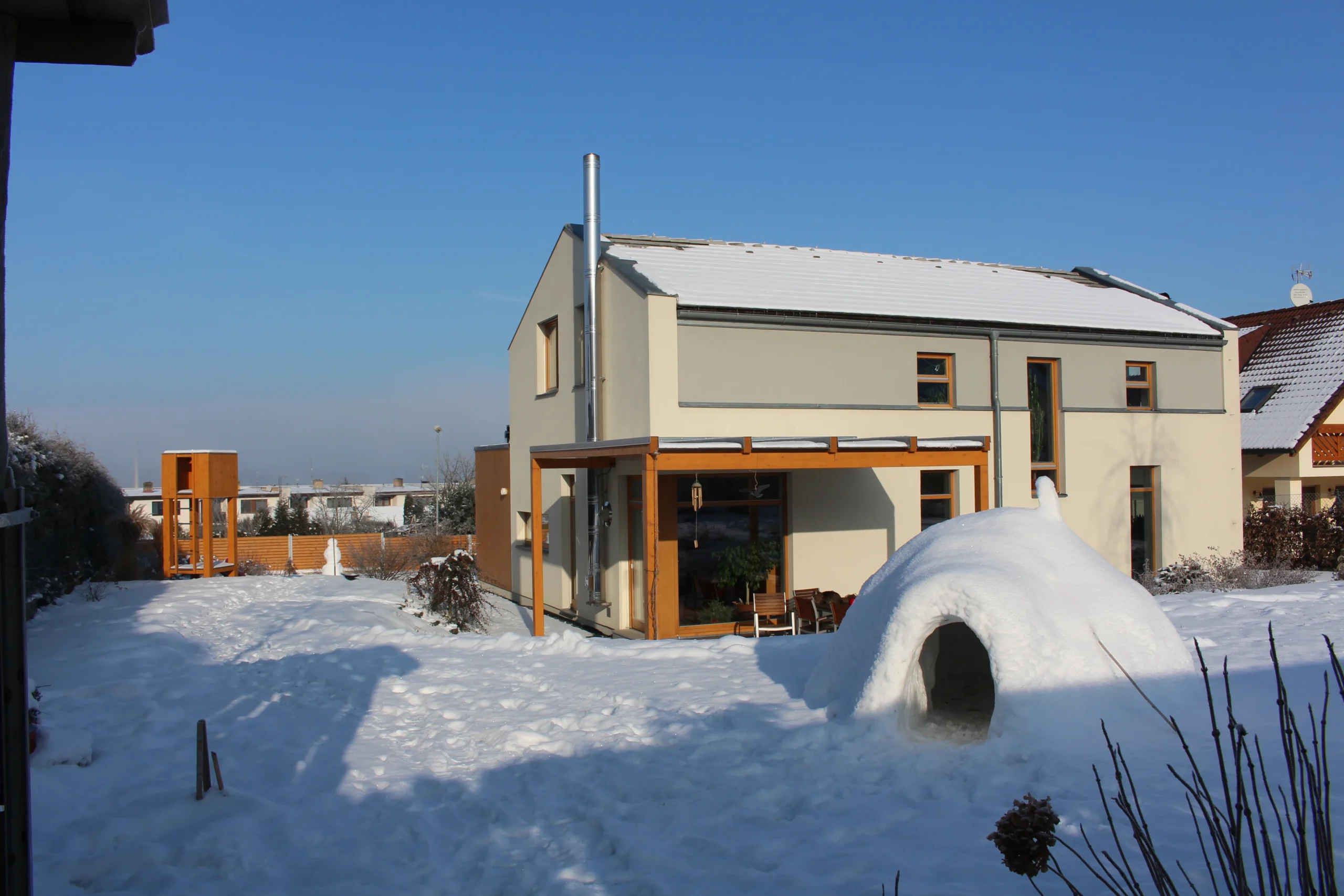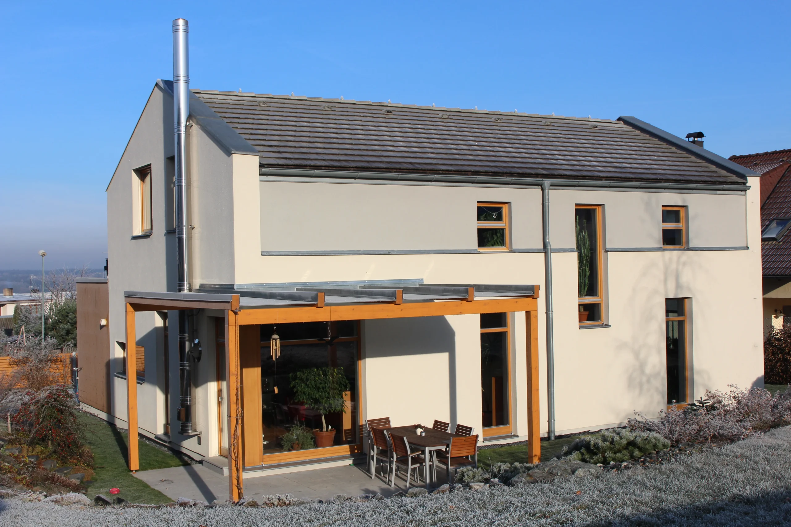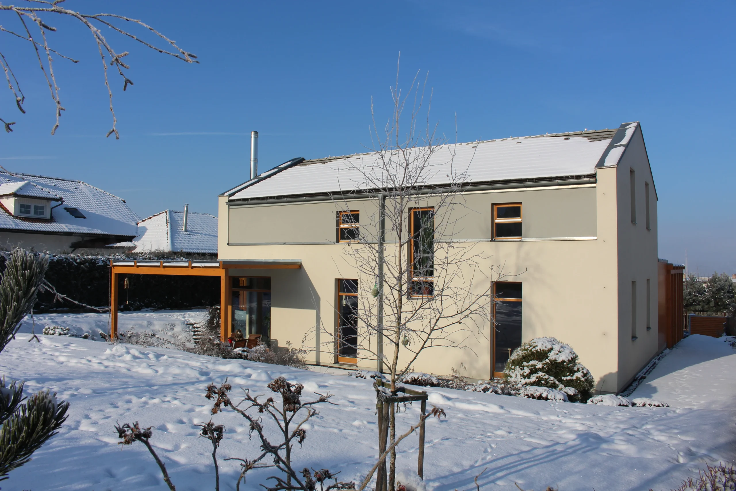 Vstup na mírně svažitý pozemek je od severu, což umožnilo dům orientovat takřka ideálně. Je složený ze dvou hmot, z nichž větší je kryta střechou sedlovou, nižší alternativně střechou sedlovou či plochou.