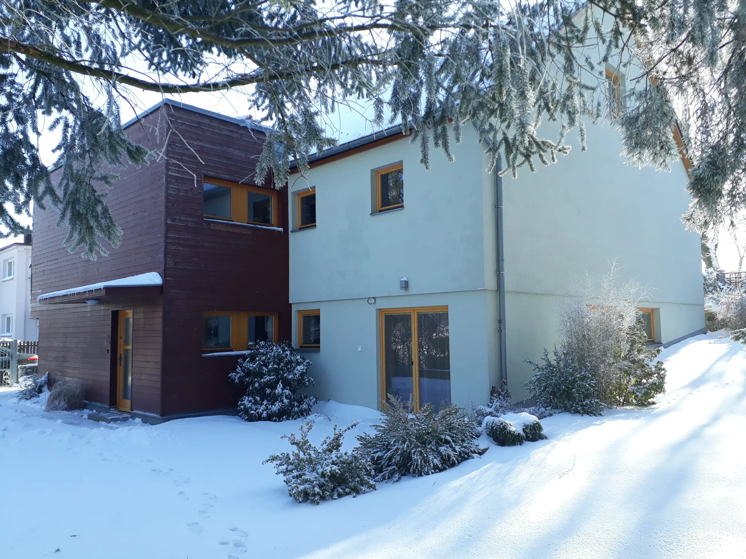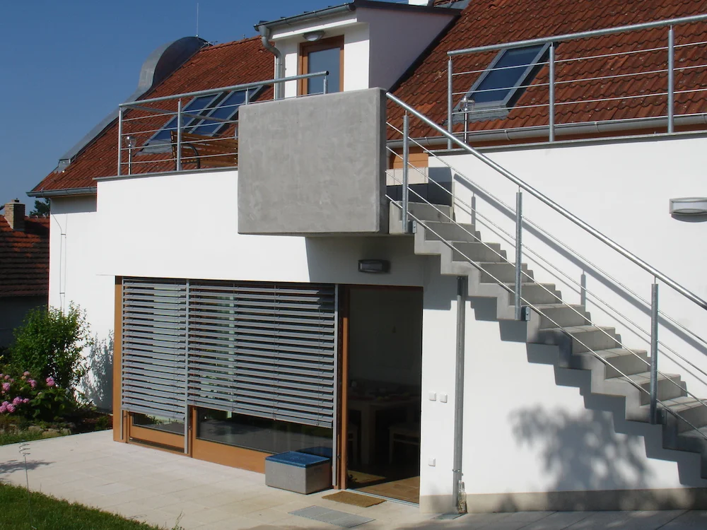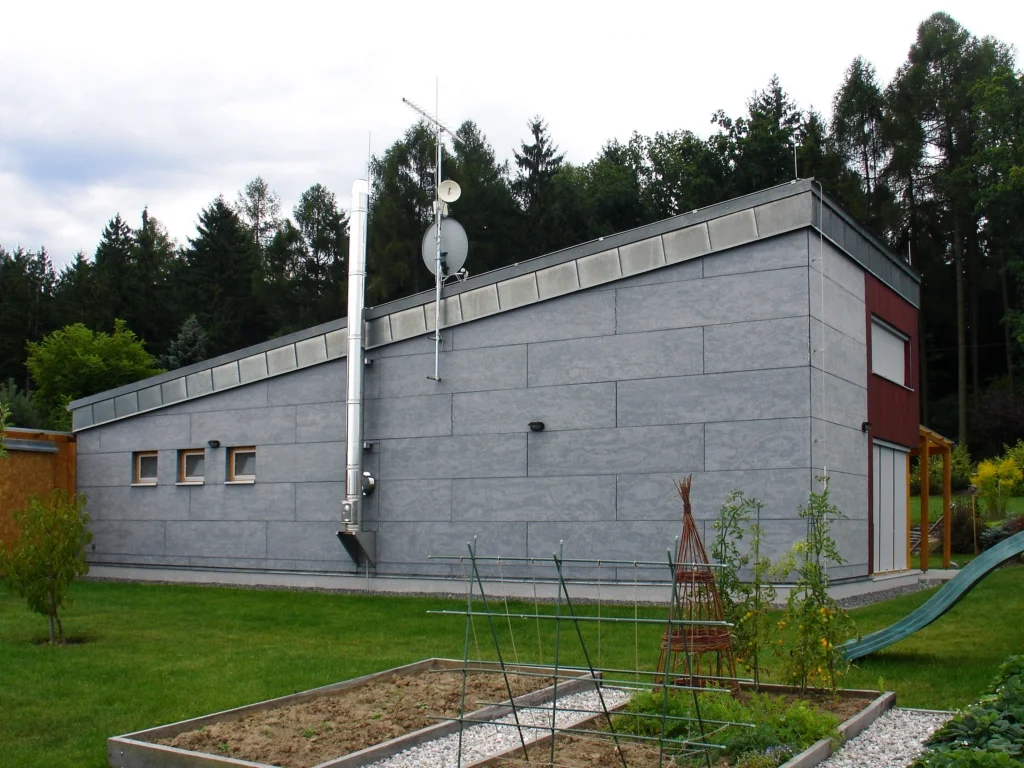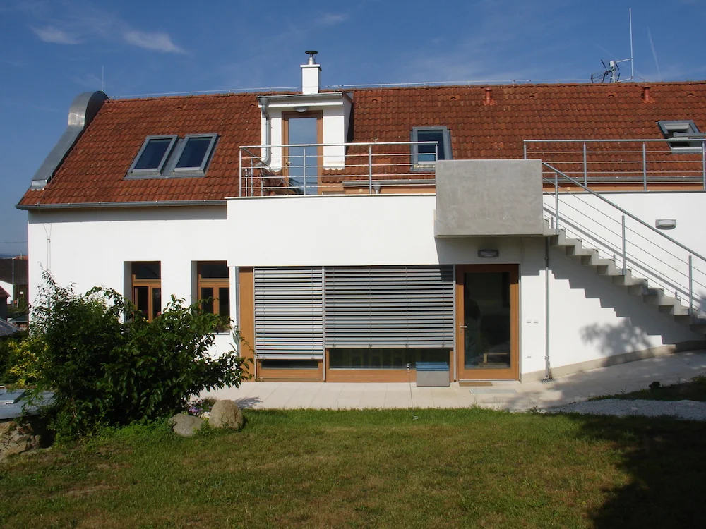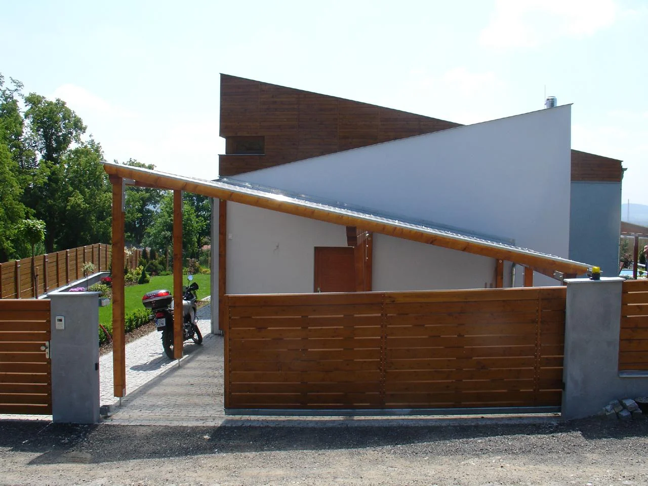 Vstup na mírně svažitý pozemek je od severu, což umožnilo dům orientovat takřka ideálně. Je složený ze dvou hmot, z nichž větší je kryta střechou sedlovou, nižší alternativně střechou sedlovou či plochou.