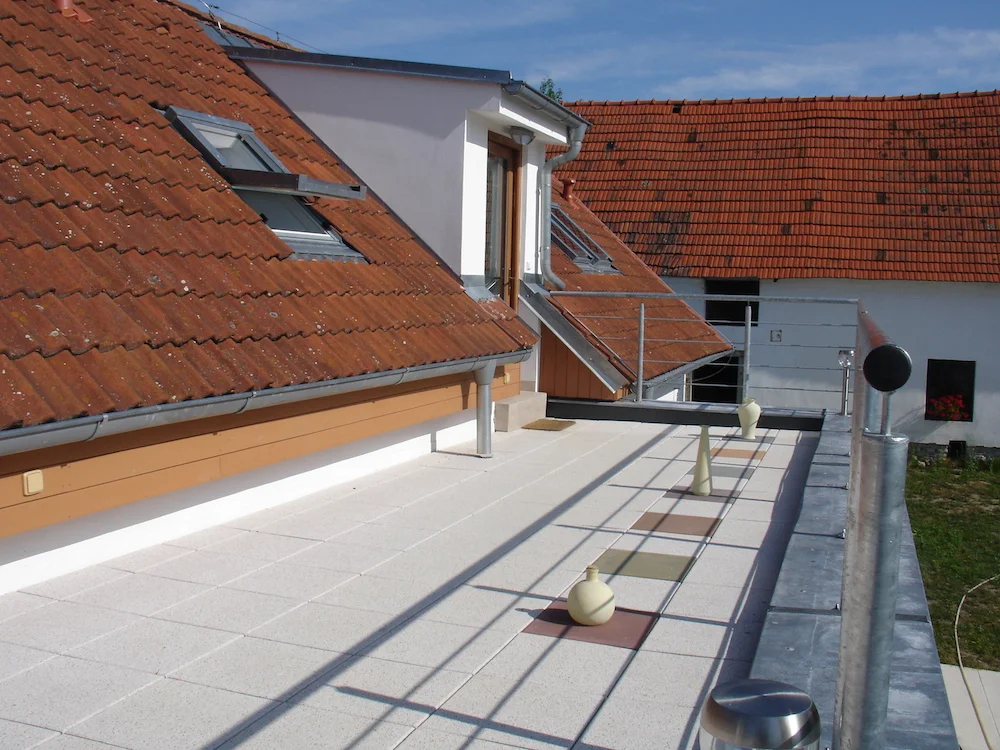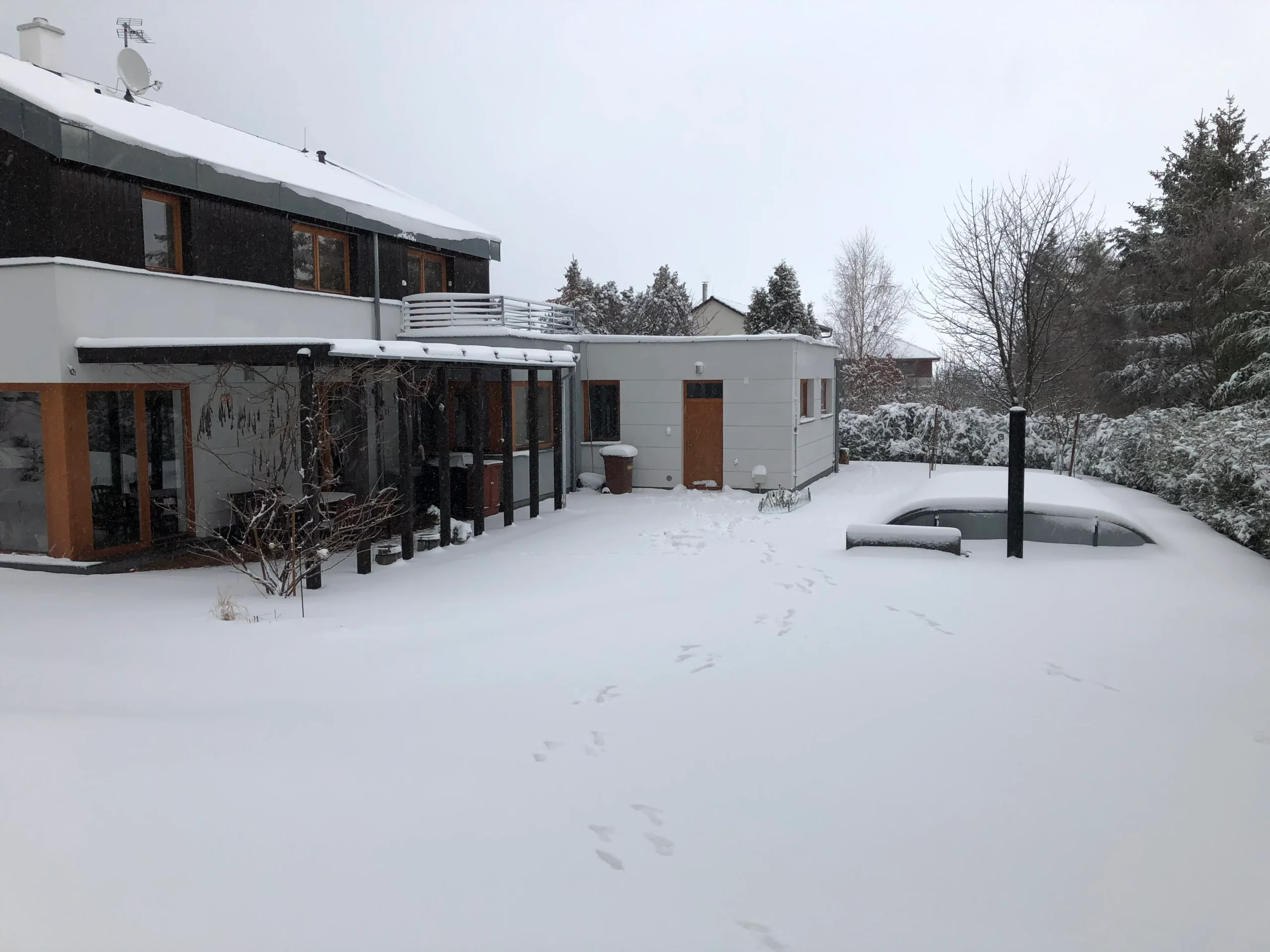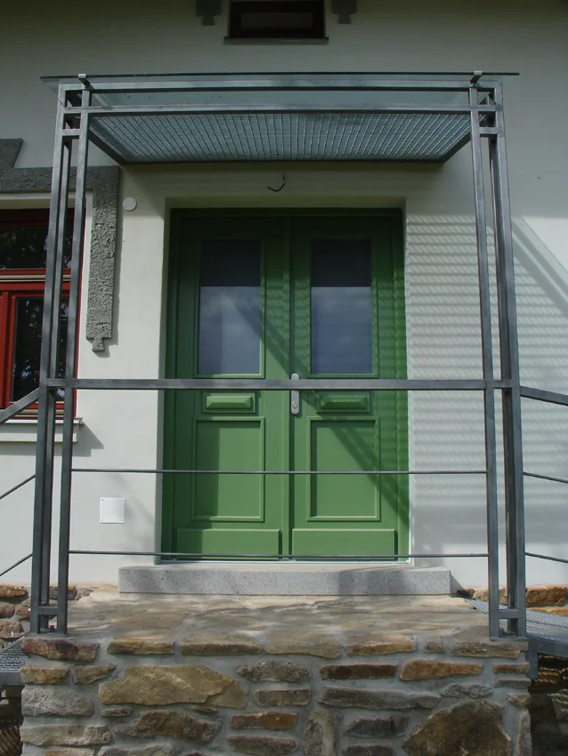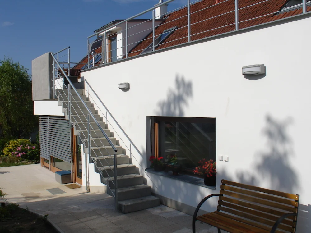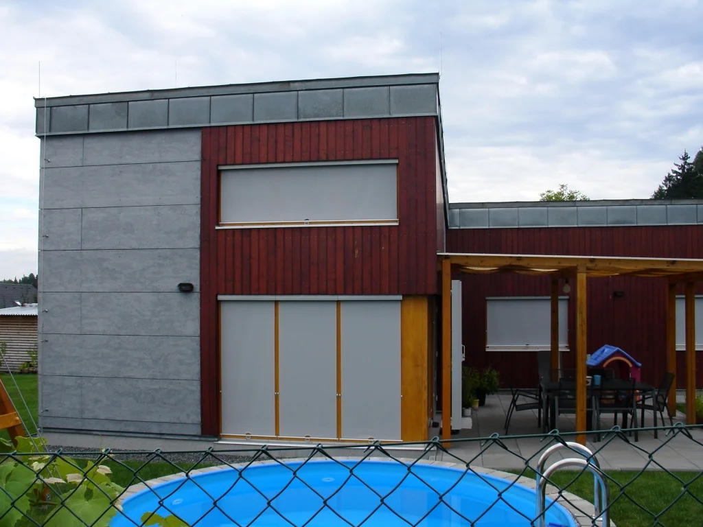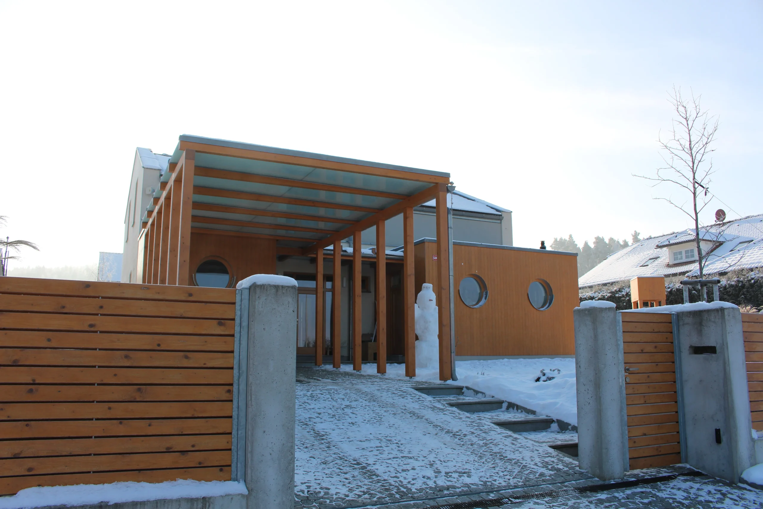 Vstup na mírně svažitý pozemek je od severu, což umožnilo dům orientovat takřka ideálně. Je složený ze dvou hmot, z nichž větší je kryta střechou sedlovou, nižší alternativně střechou sedlovou či plochou.
