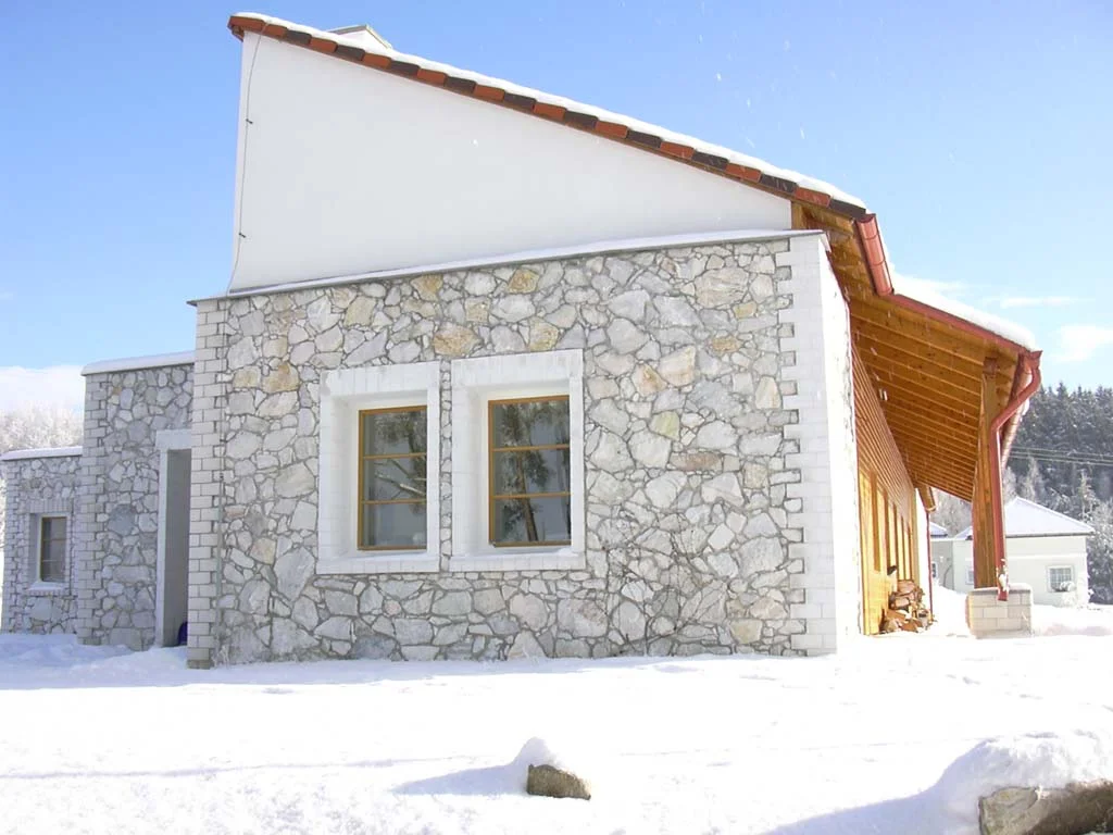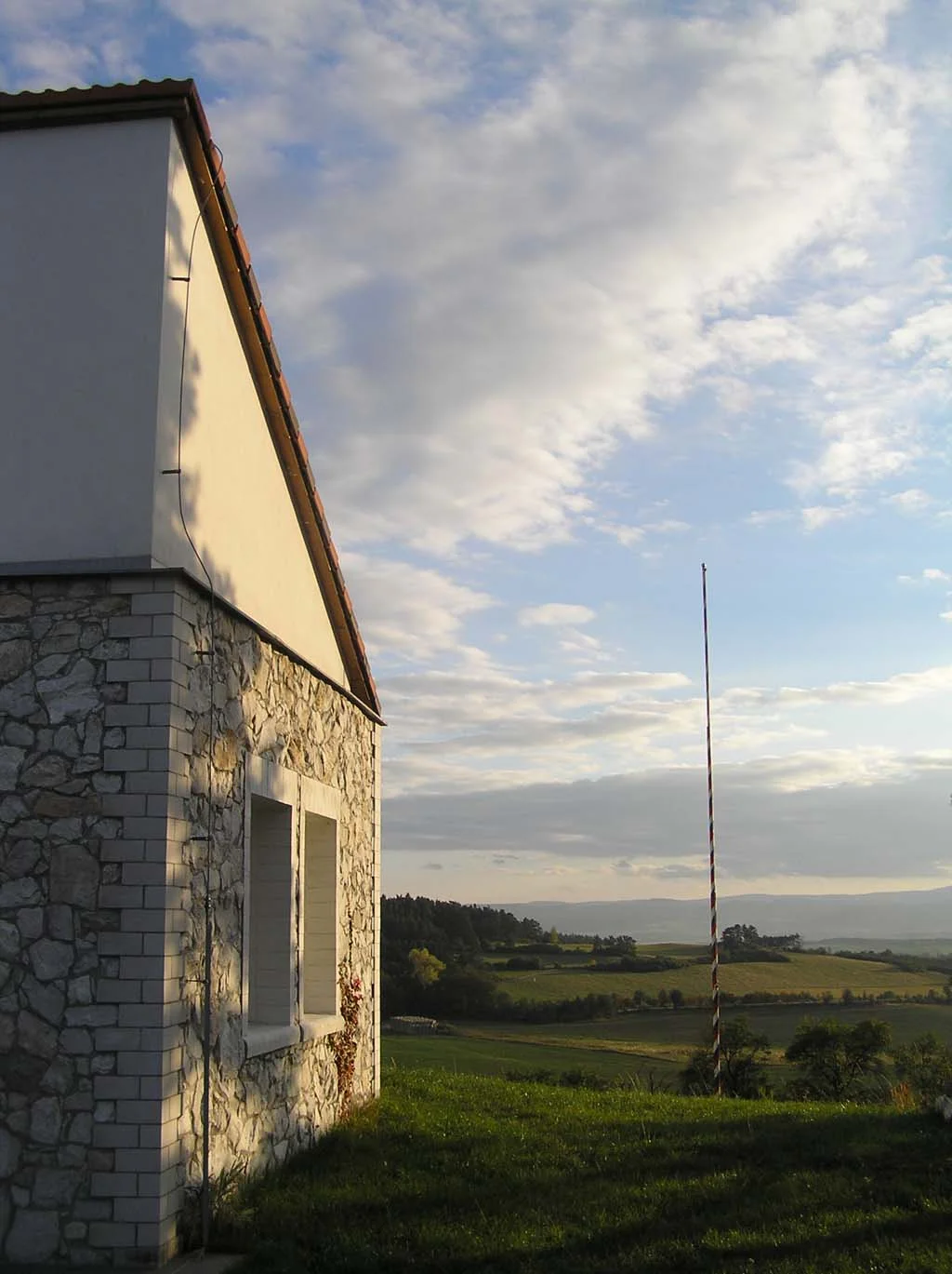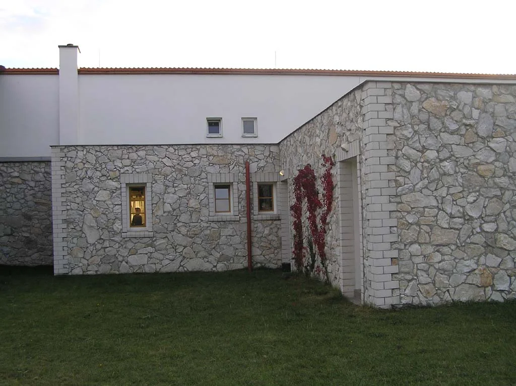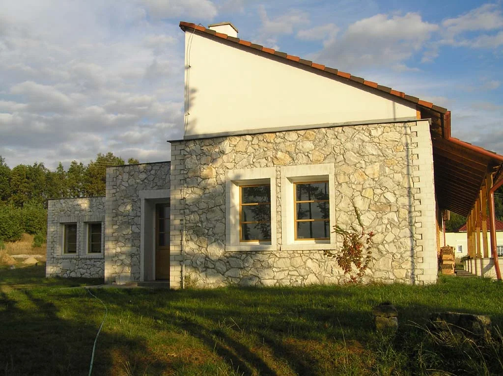 Dům na horizontu má záměrně formu co nejvíce přimknutou k terénu a vycházející z tvarosloví vesnické architektury; obezděno vápencem z místního lomu.