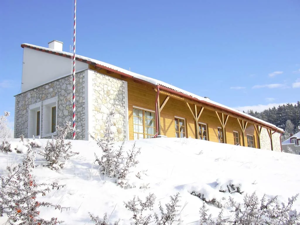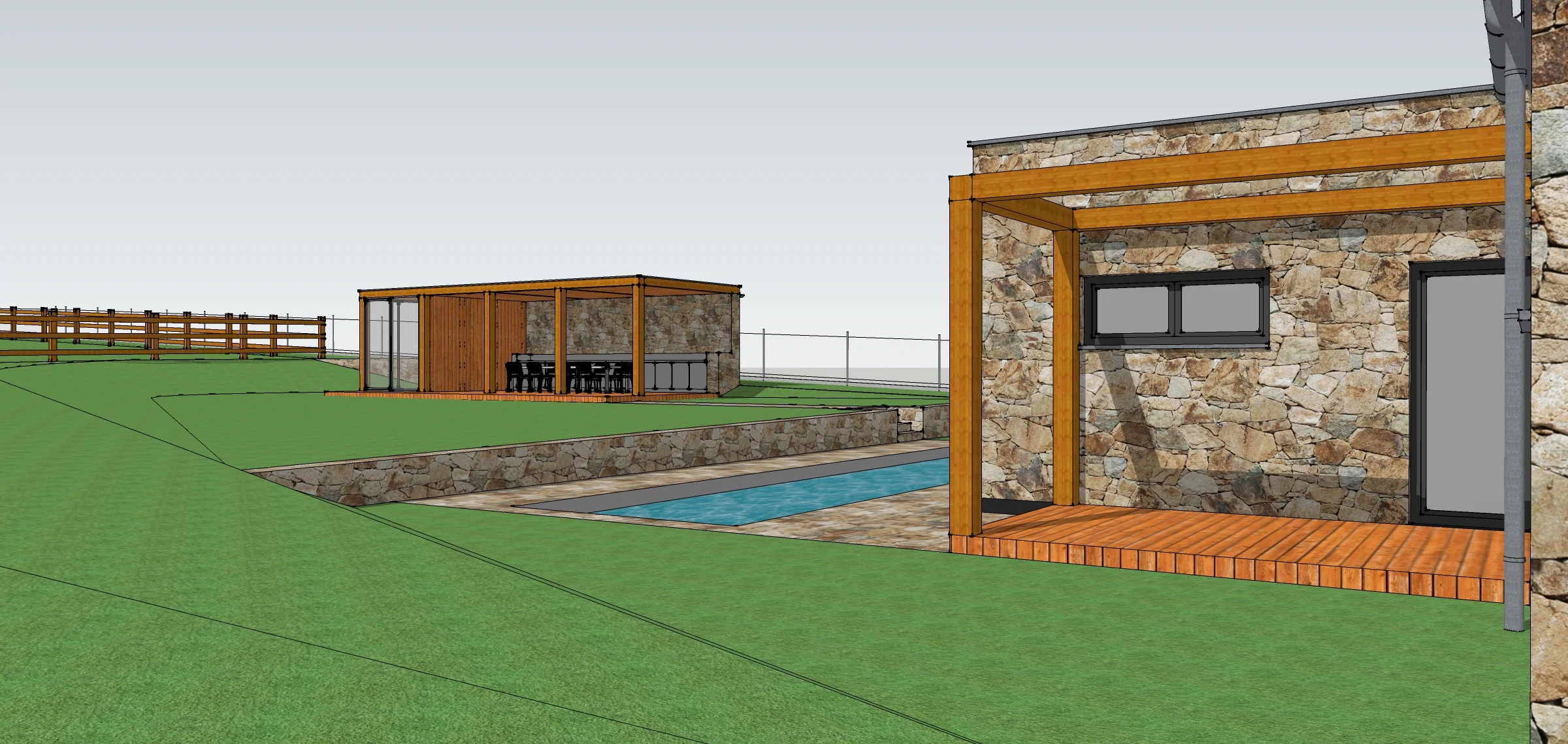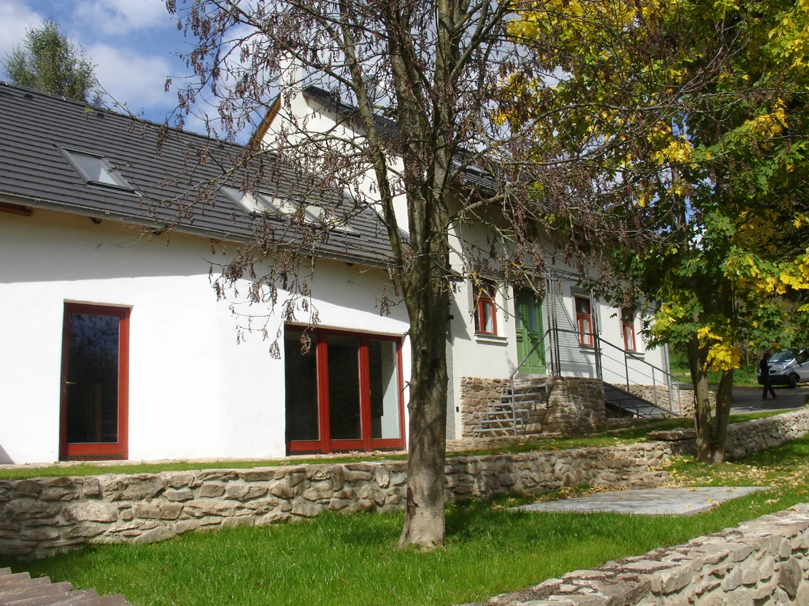 Dům na horizontu má záměrně formu co nejvíce přimknutou k terénu a vycházející z tvarosloví vesnické architektury; obezděno vápencem z místního lomu.