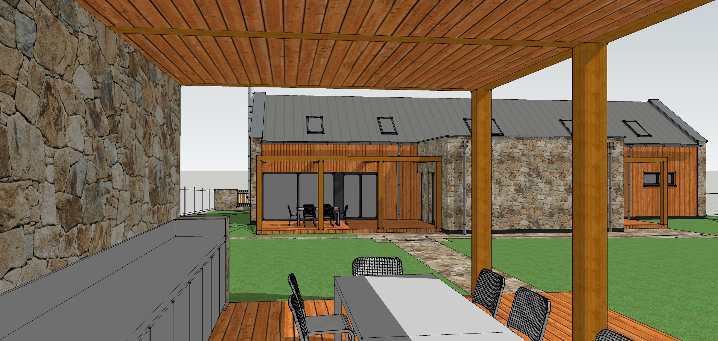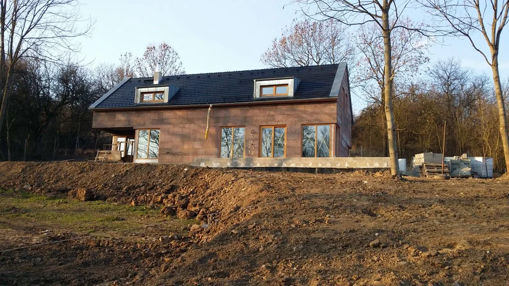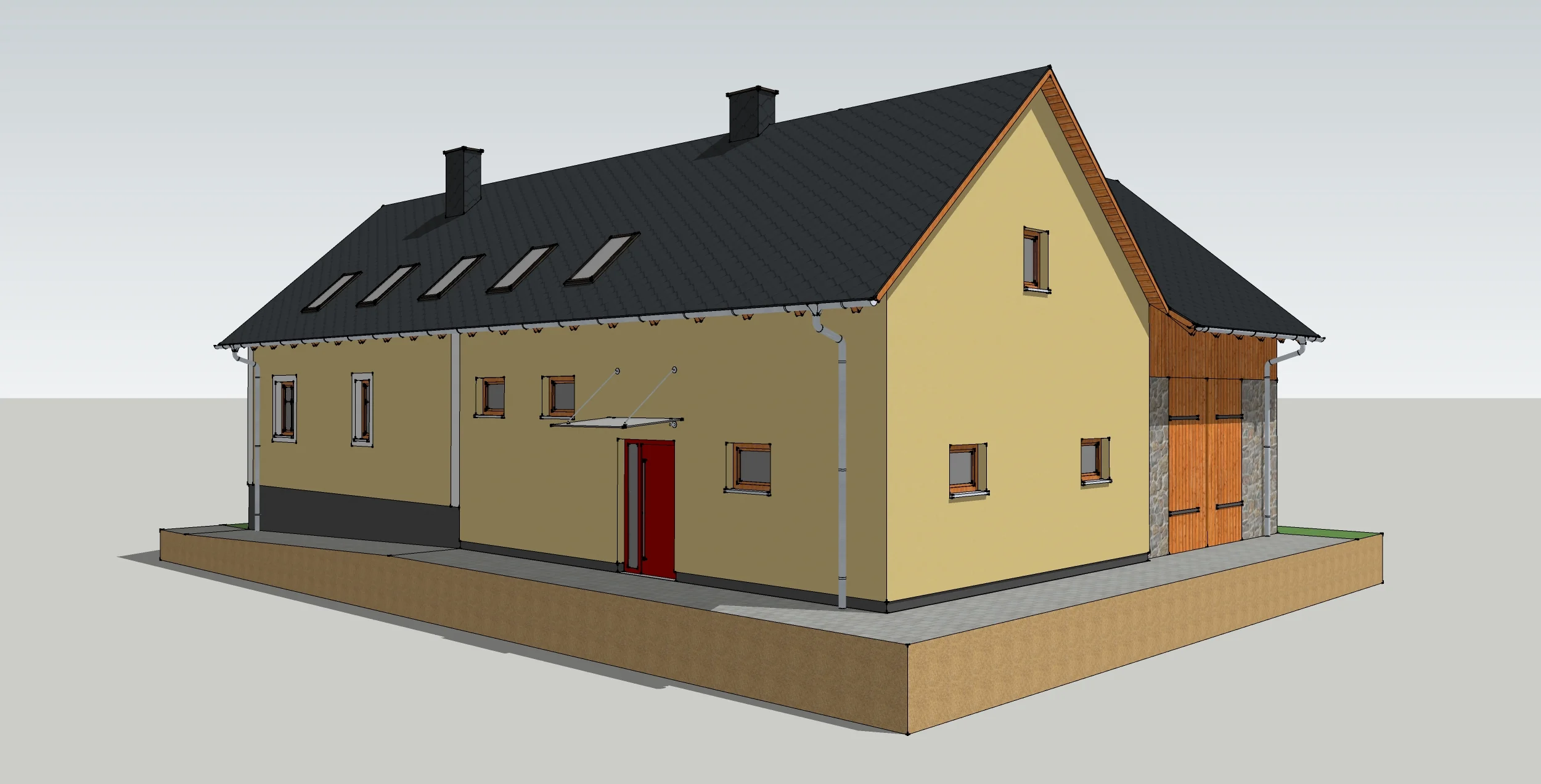 Mladí manželé dostali od rodičů OKAL ze sedmdesátých let na mohutném soklu, obloženém na plocho kladenou tmavou břidlicí; přestavba dům „uklidní“ a vyřeší kvalitní bydlení nové rozrůstající se rodiny.