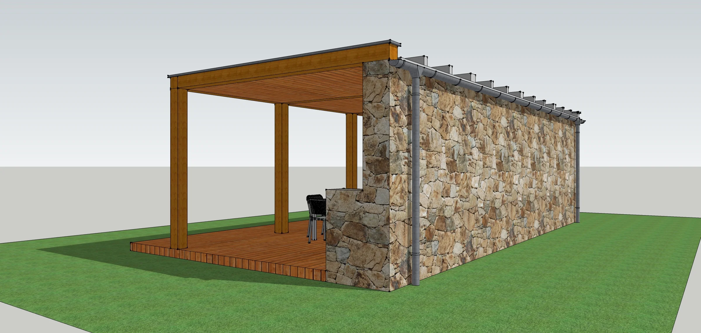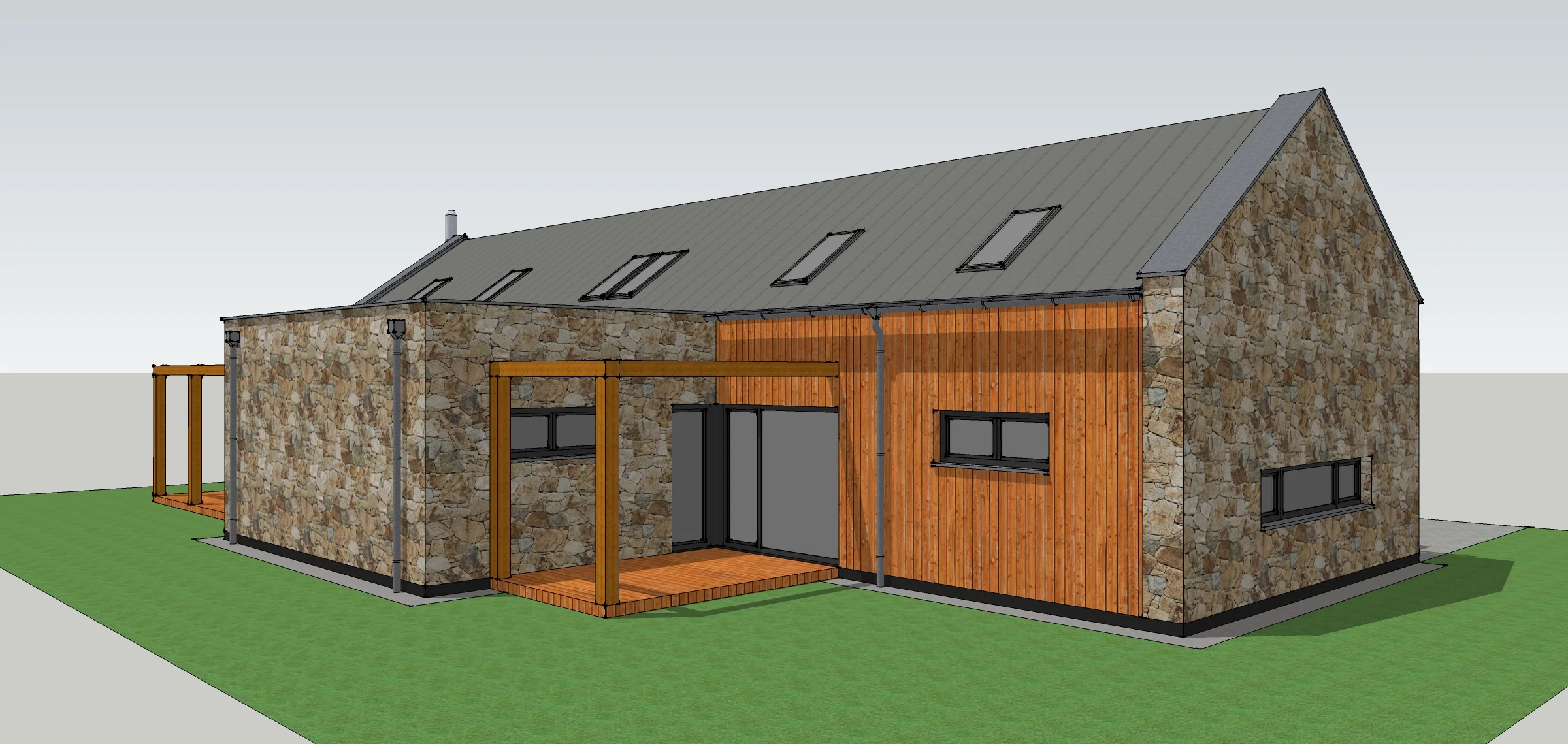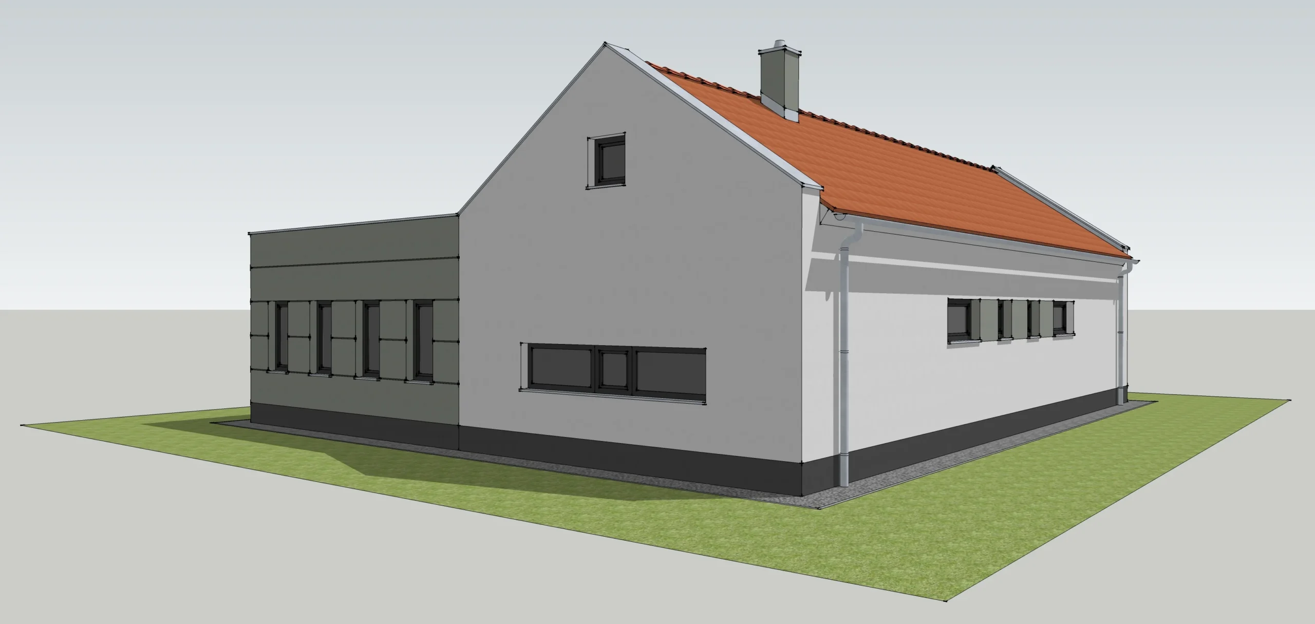 Mladí manželé dostali od rodičů OKAL ze sedmdesátých let na mohutném soklu, obloženém na plocho kladenou tmavou břidlicí; přestavba dům „uklidní“ a vyřeší kvalitní bydlení nové rozrůstající se rodiny.