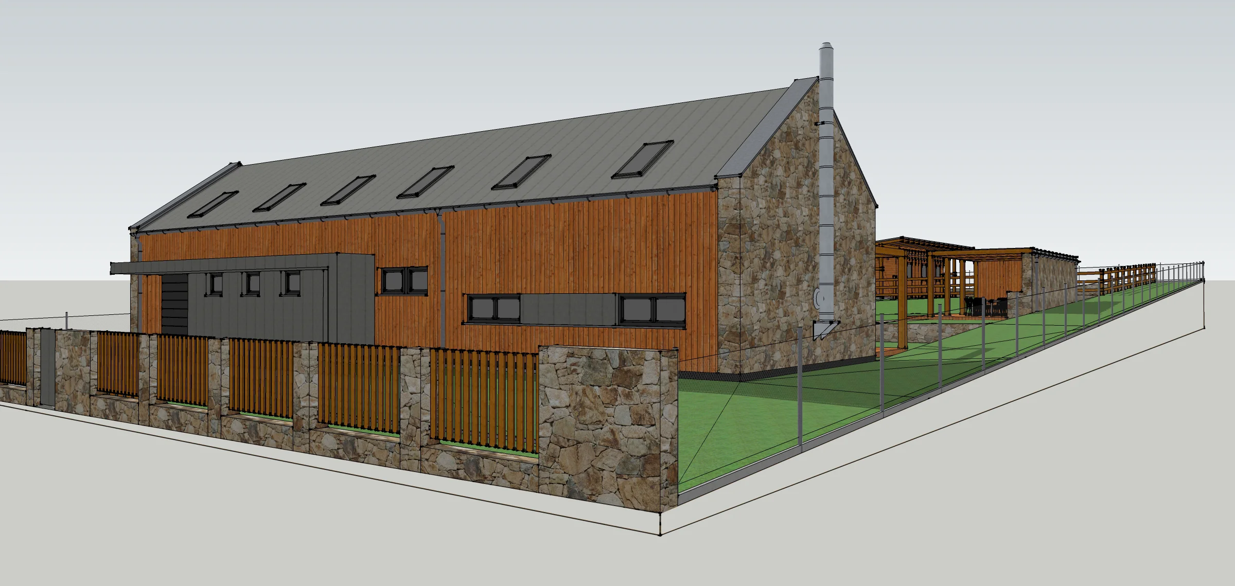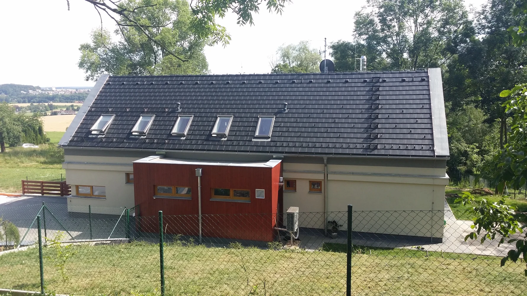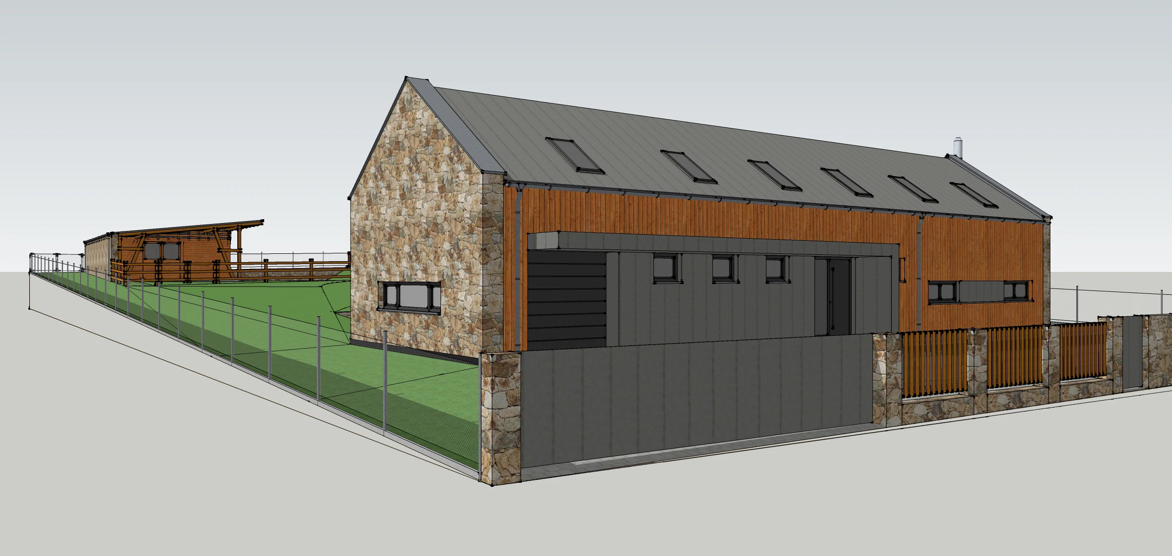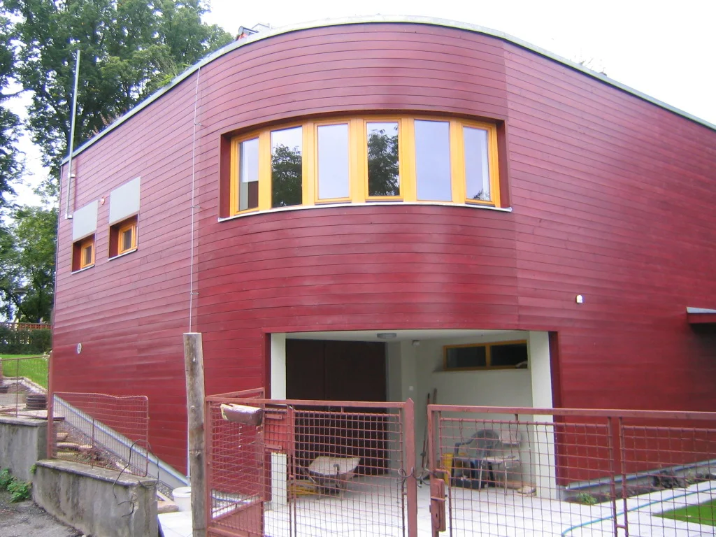 Stavení v kombinaci sedlové a ploché střechy, kde lidé bydlí pod sedlovou a psy pod plochou střechou. Salon pro psy jako rodinný podnik.