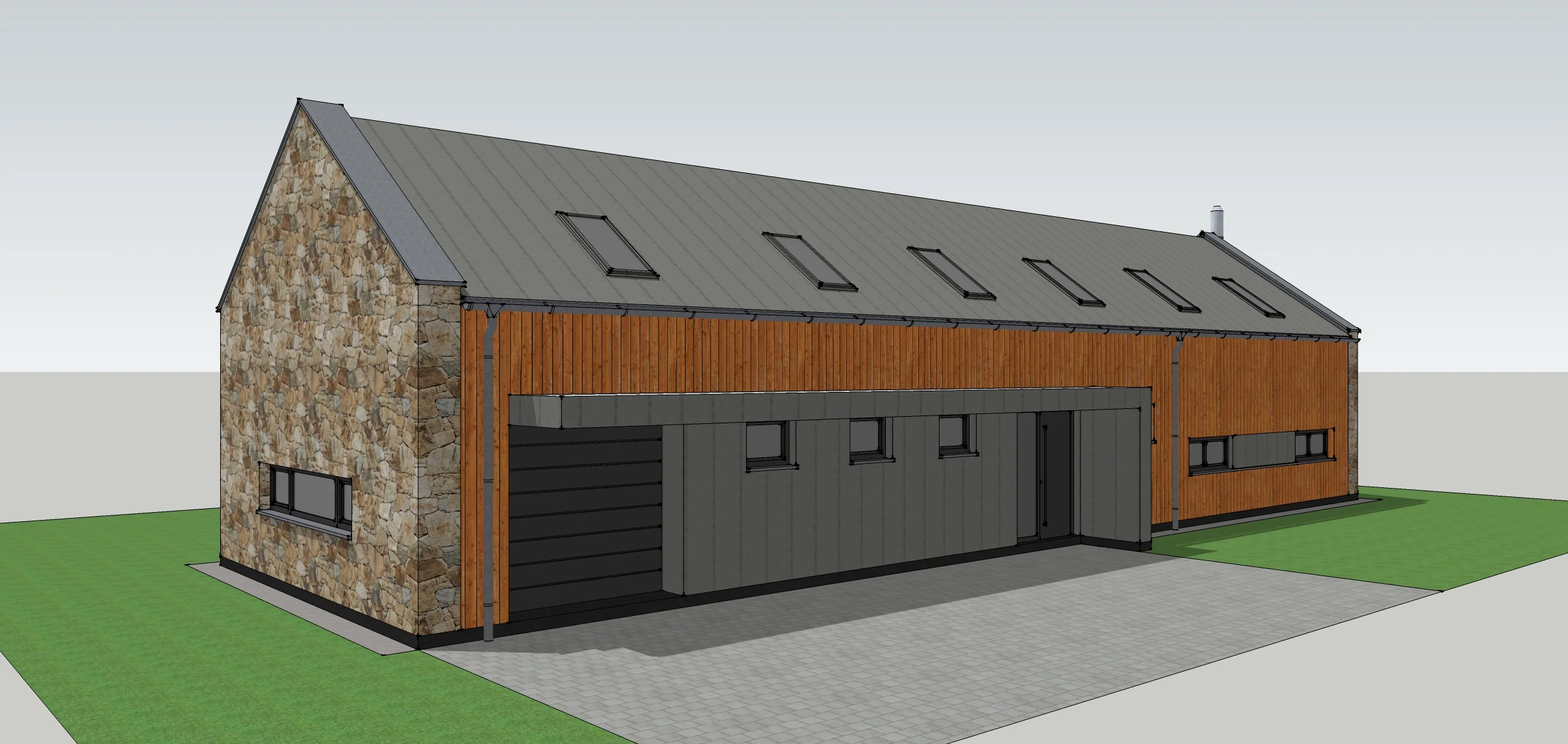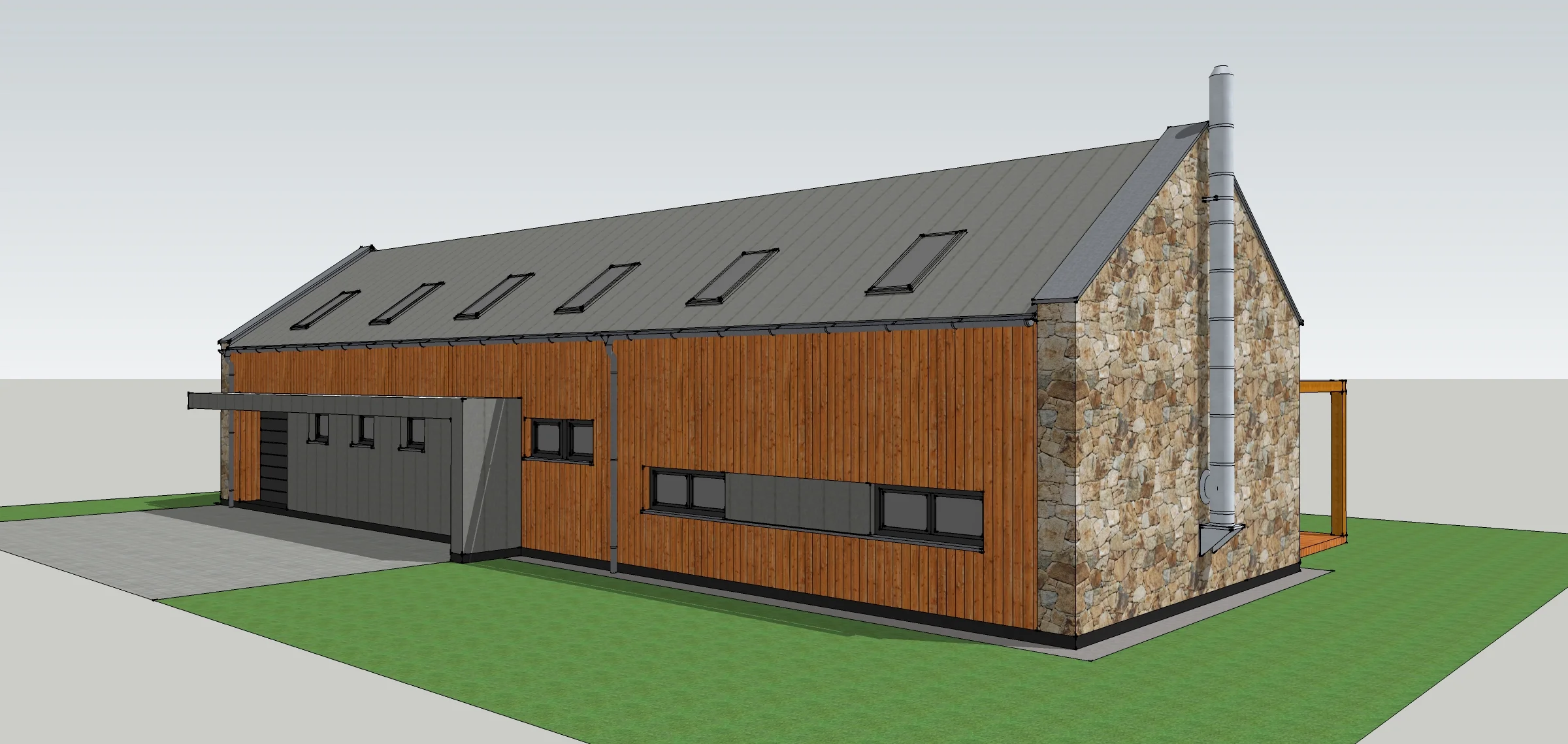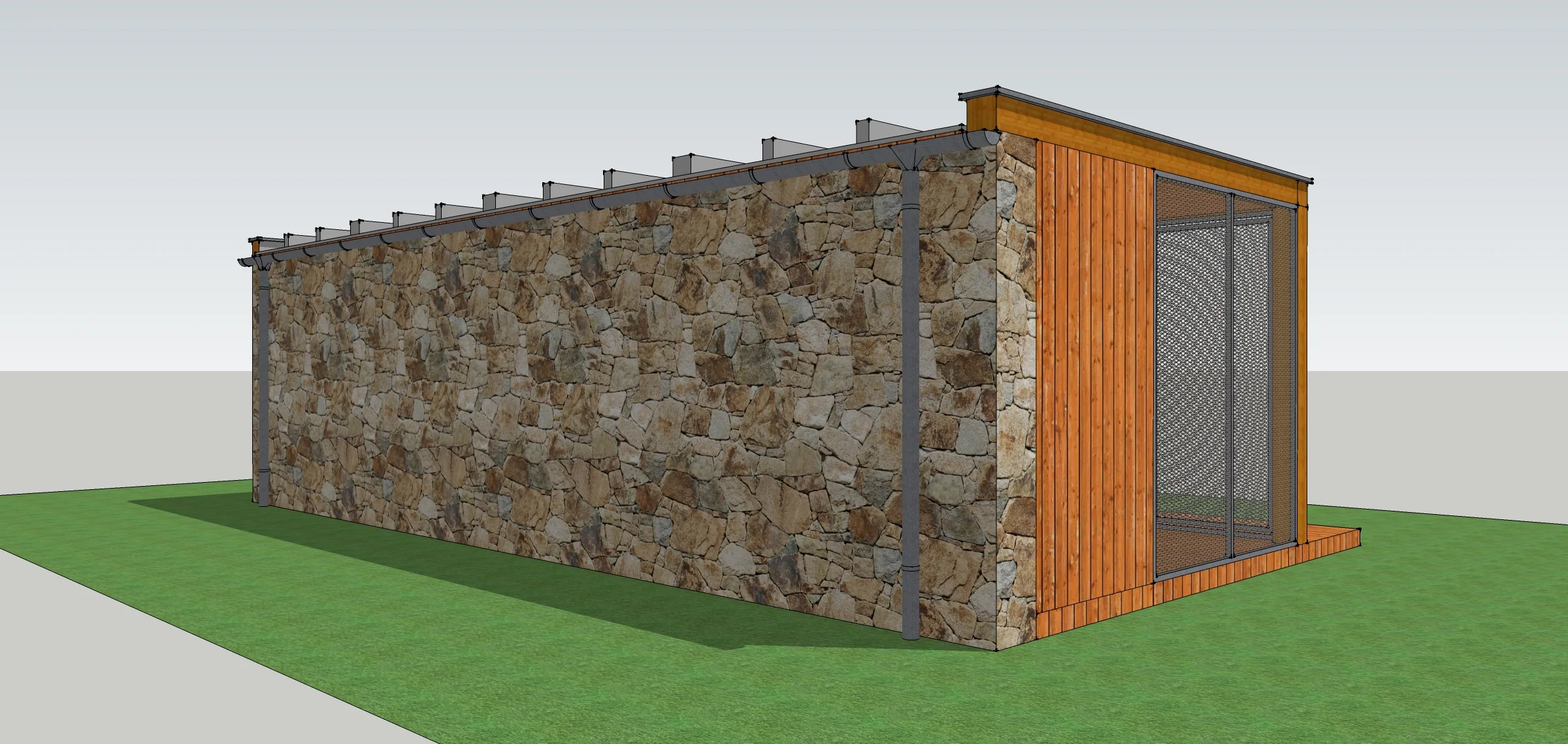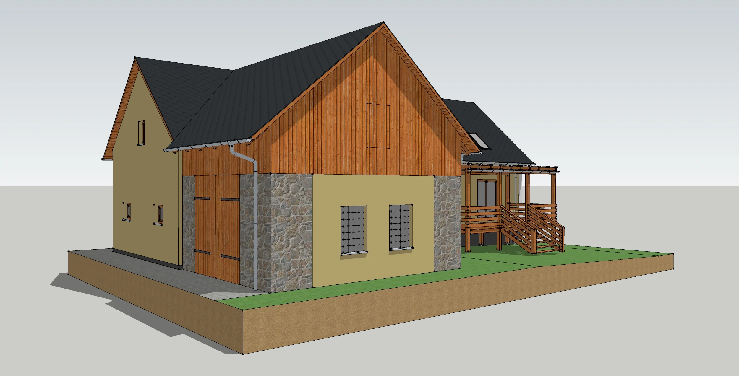Stavení v kombinaci sedlové a ploché střechy, kde lidé bydlí pod sedlovou a psy pod plochou střechou. Salon pro psy jako rodinný podnik.
