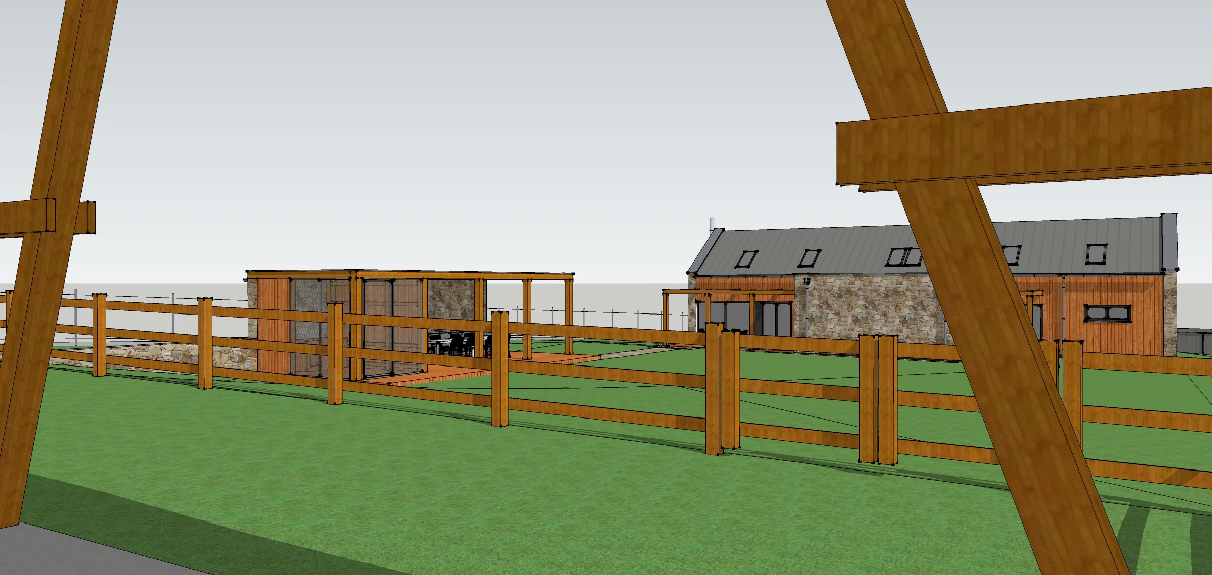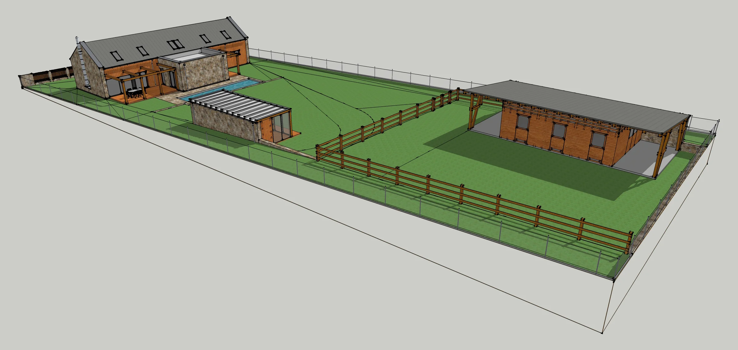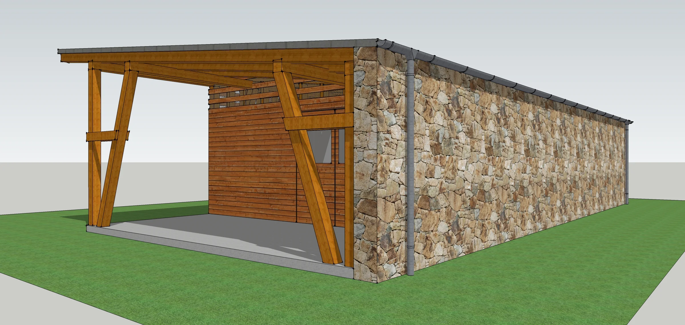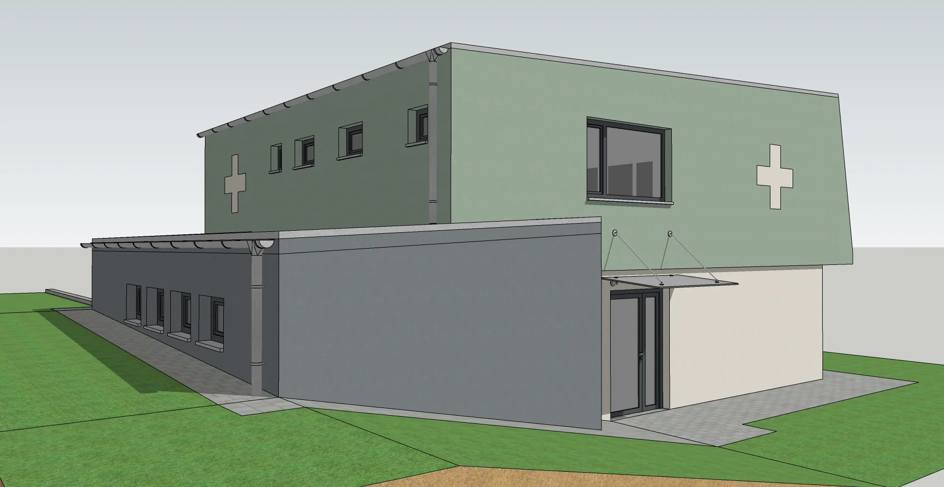 Stavení v kombinaci sedlové a ploché střechy, kde lidé bydlí pod sedlovou a psy pod plochou střechou. Salon pro psy jako rodinný podnik.