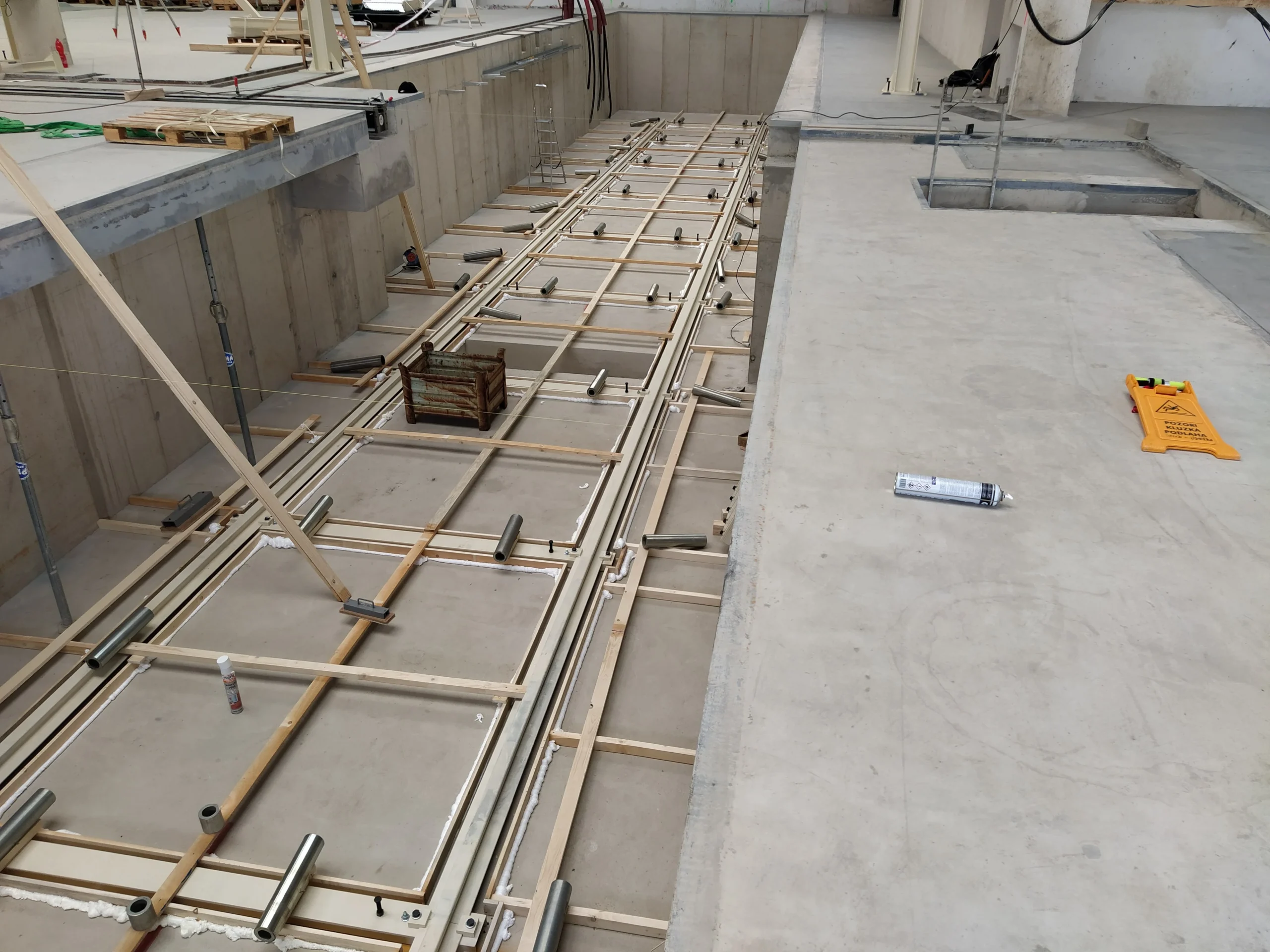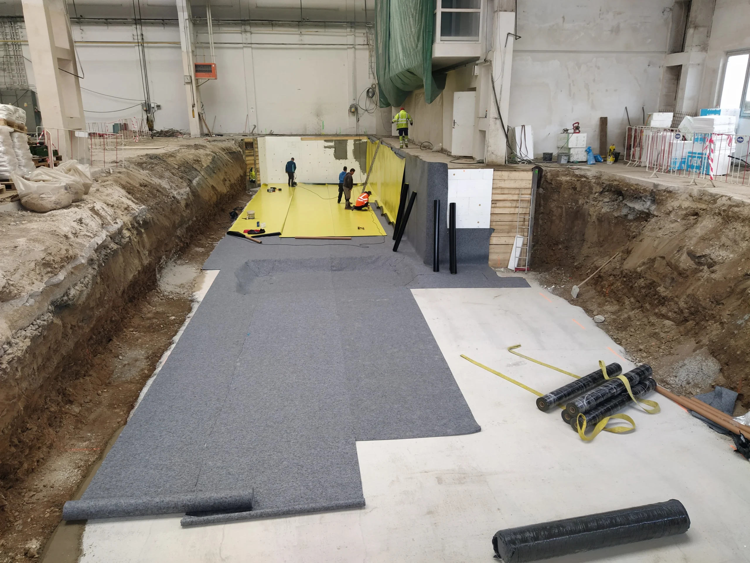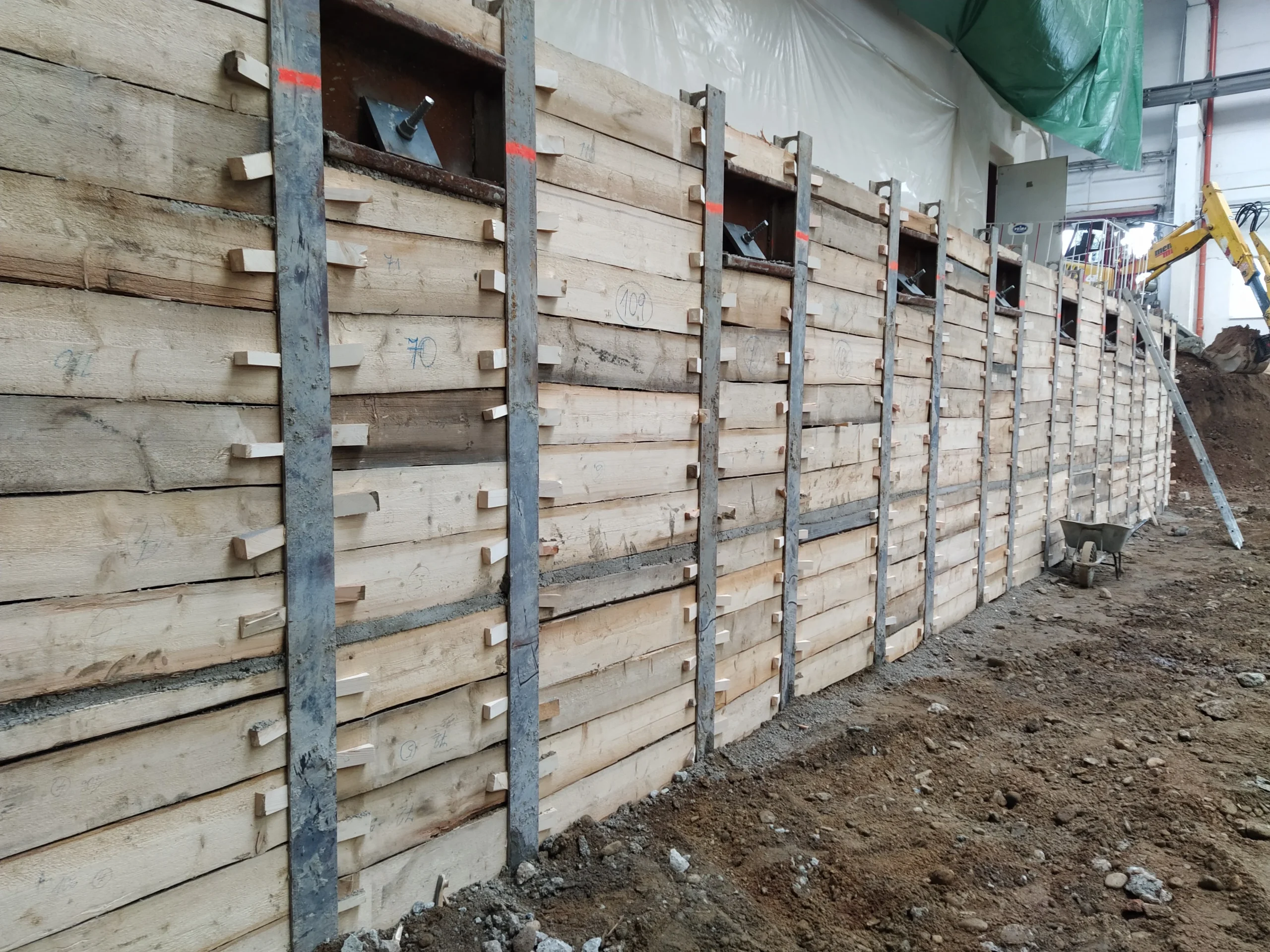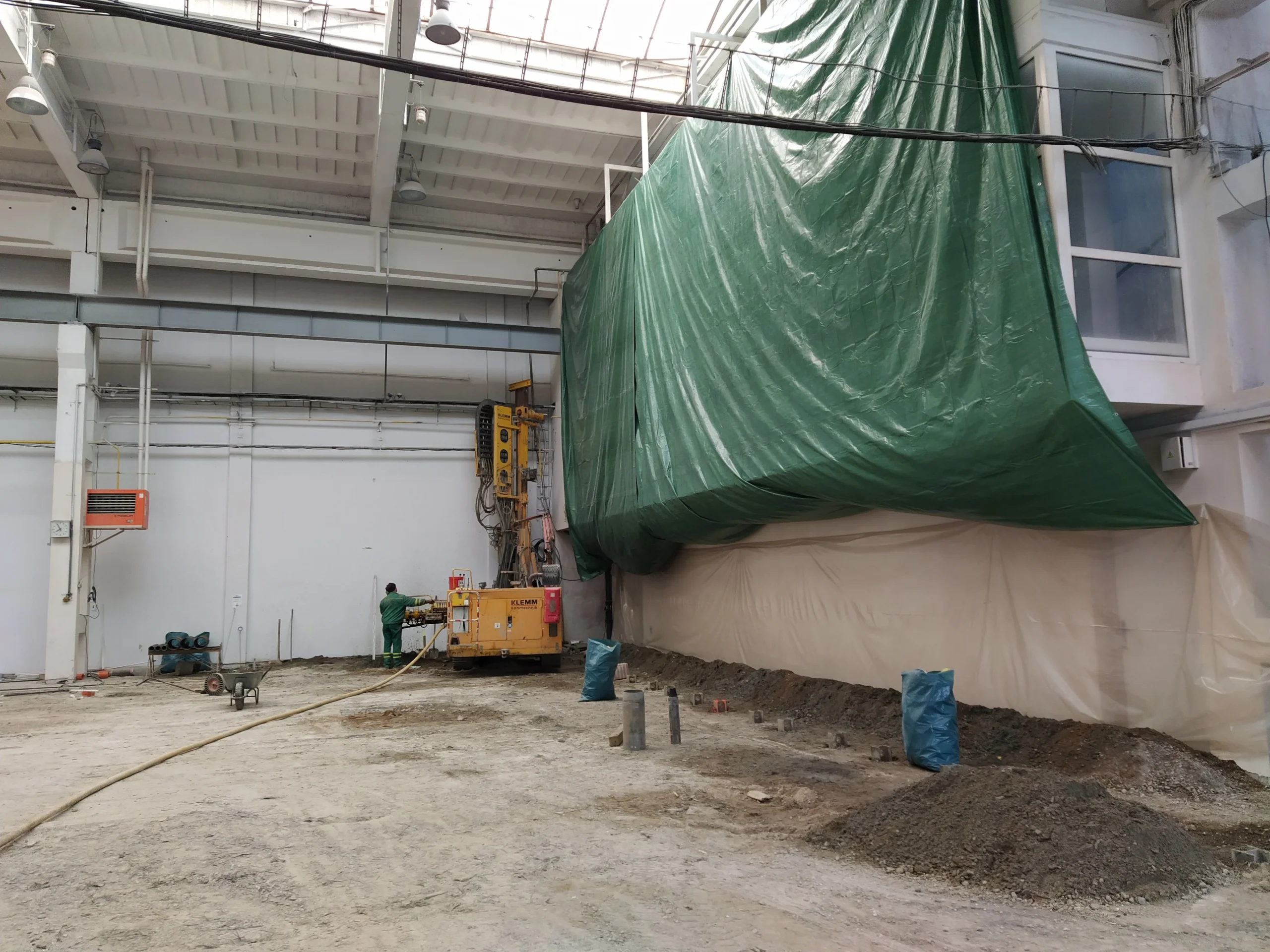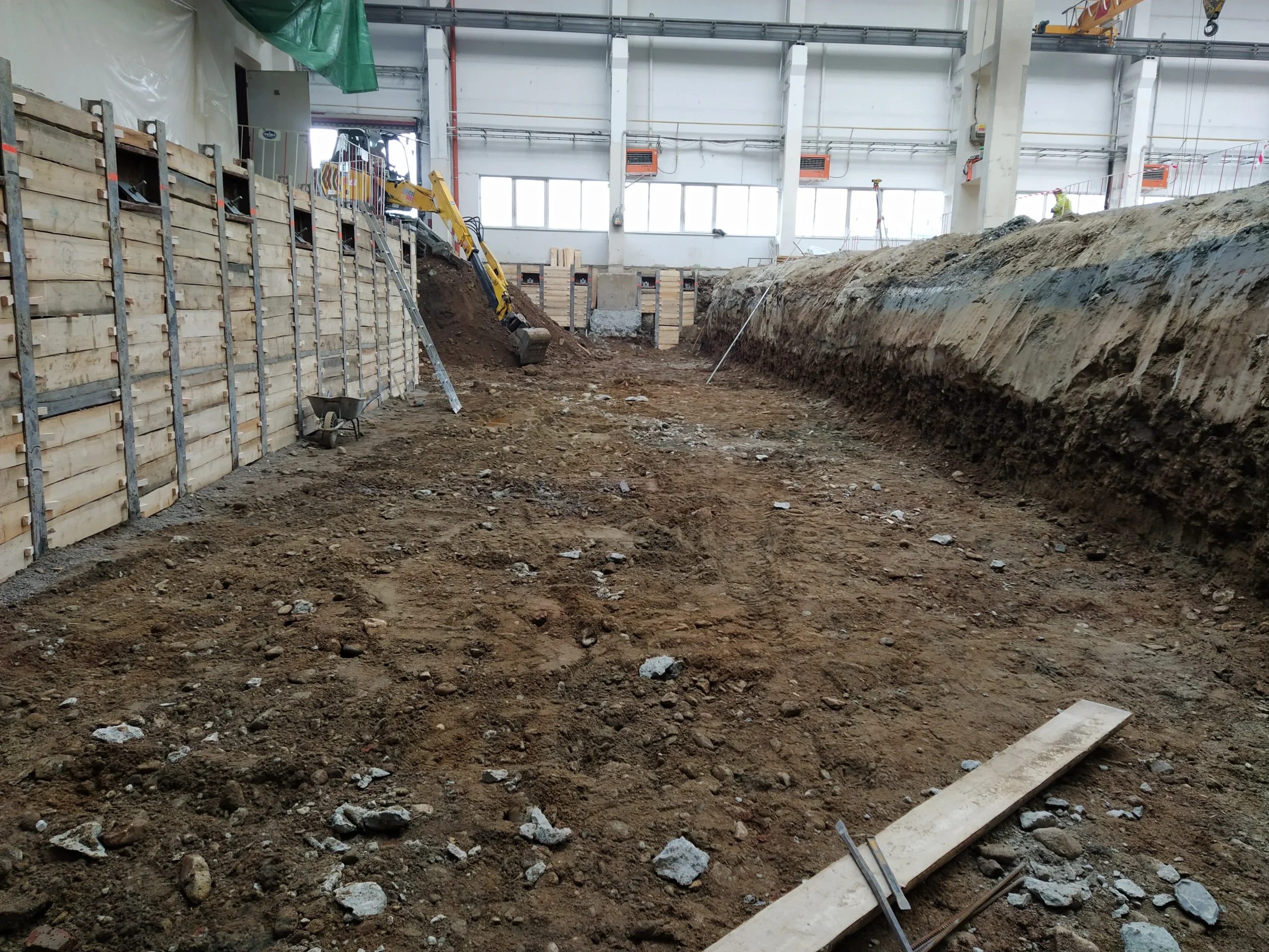 Úkol zněl jasně – do výrobní haly musí být umístěn stroj pro fixaci a dokončení sít. Bylo provedeno podchycení základů sloupů kolem nové jámy, provedena základová ŽB jáma pro stroj, provedeny základy pro kolejnice a provedena nová průmyslová podlaha.