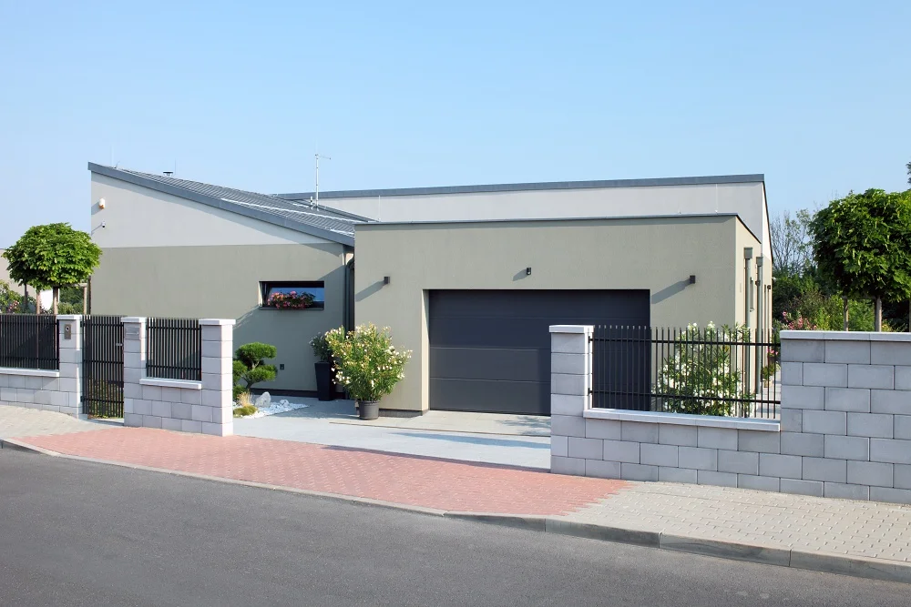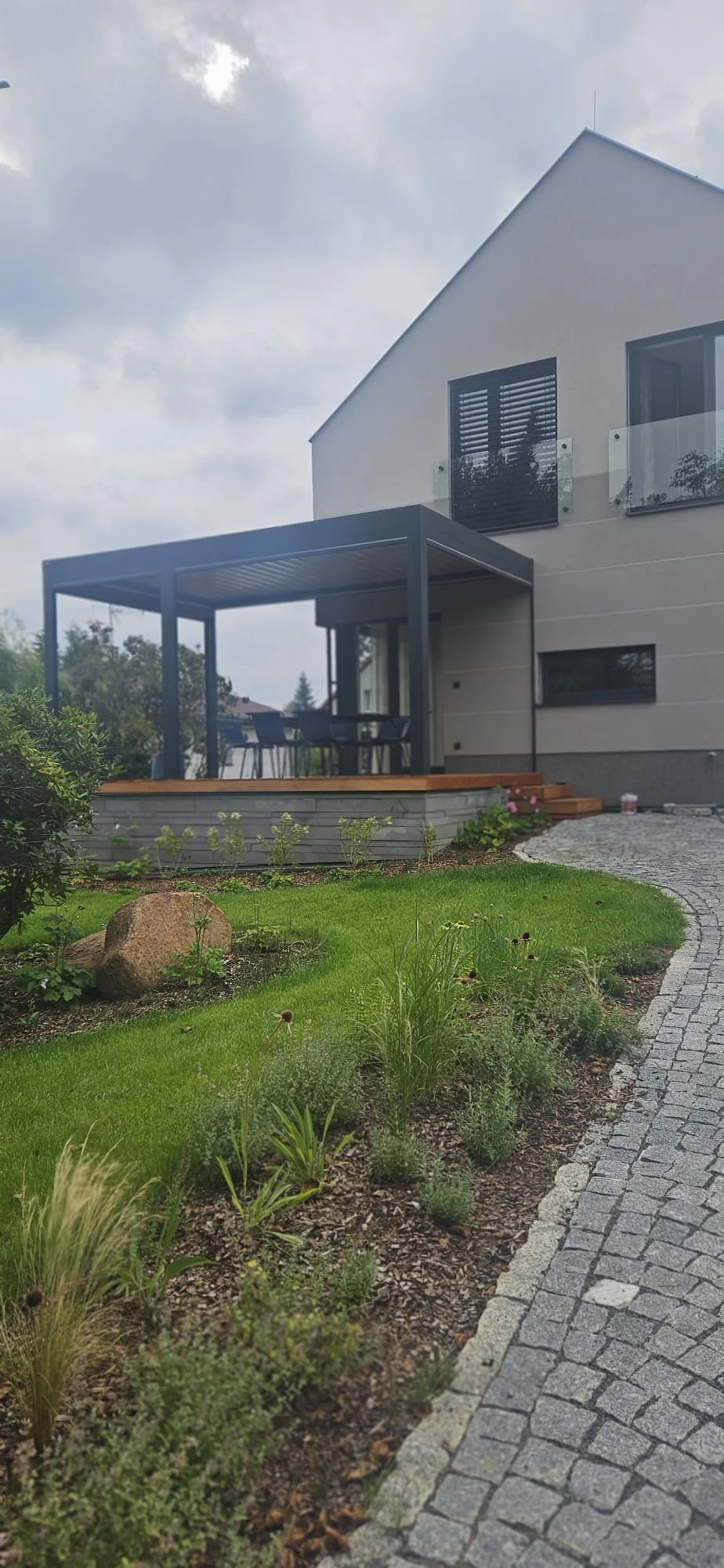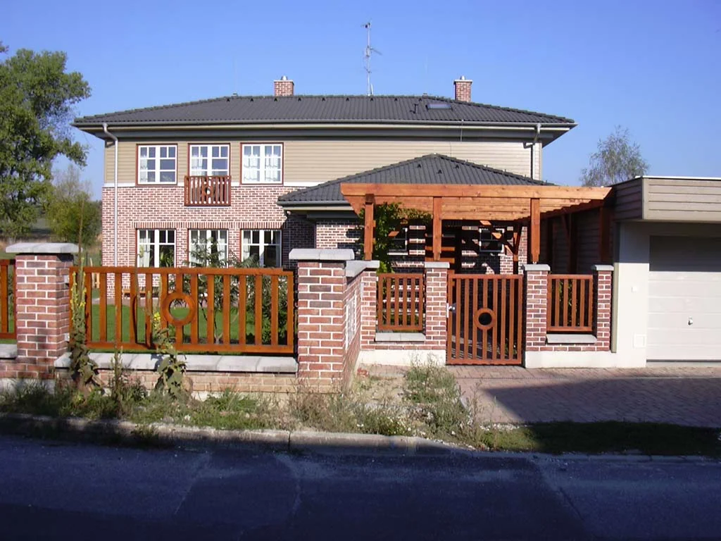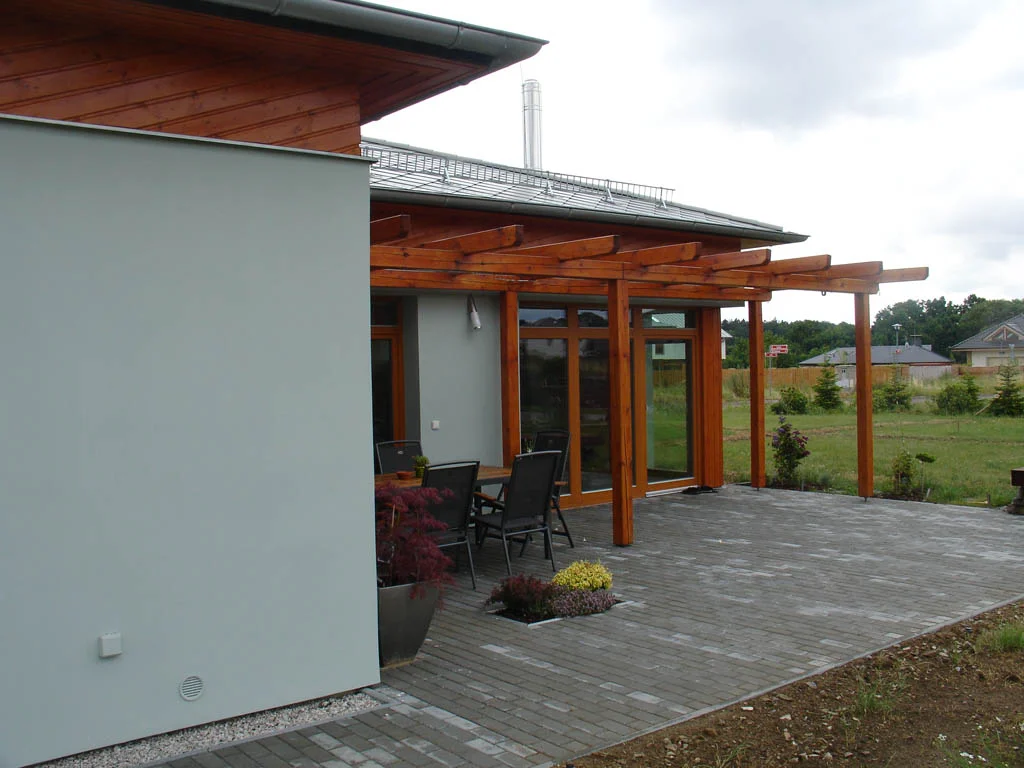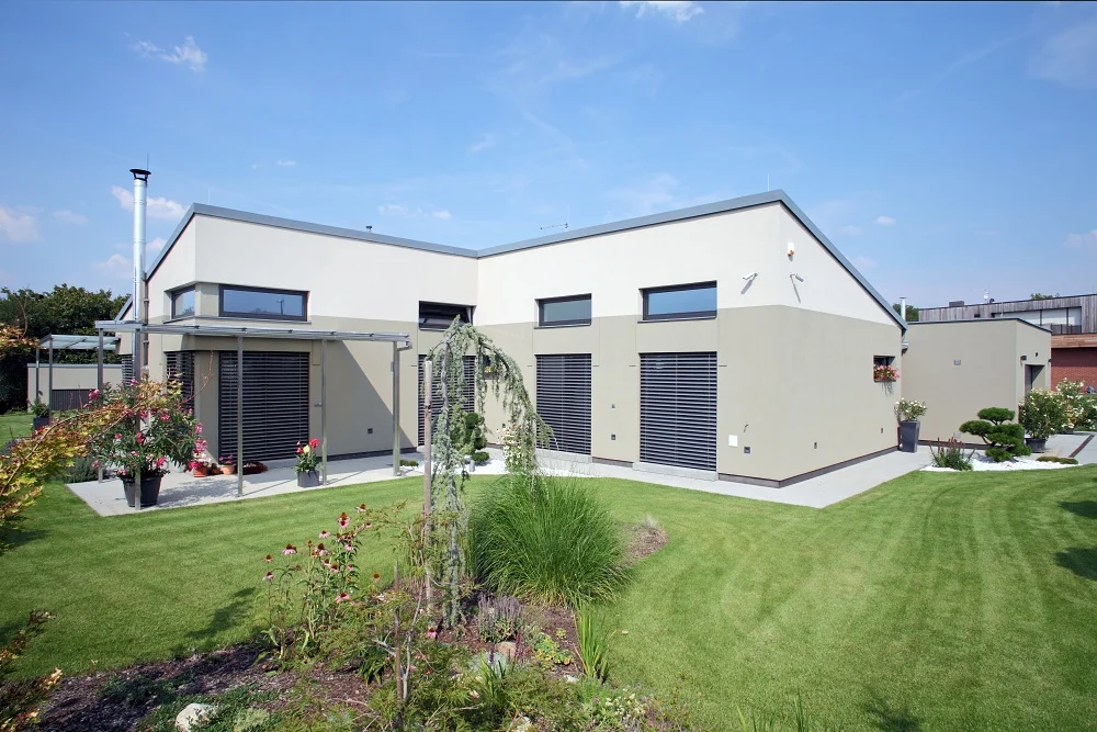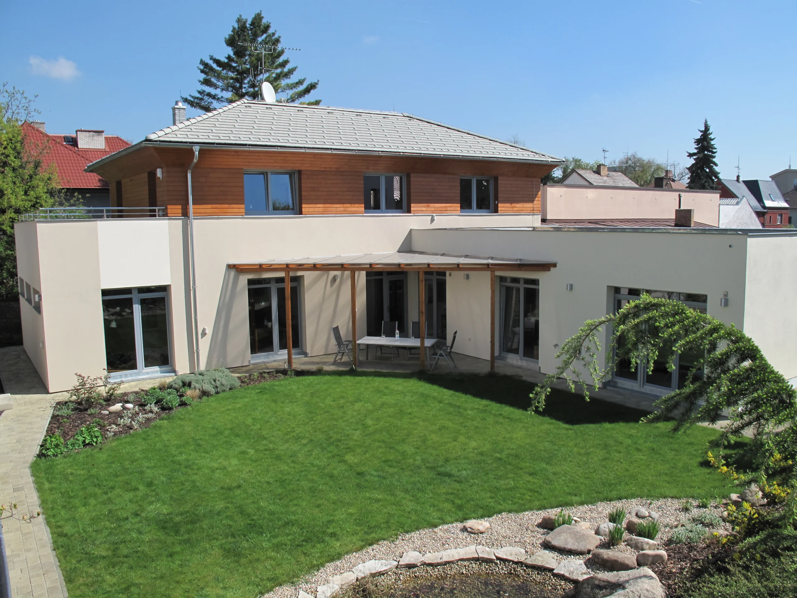 Rodinný dům atriové skladby do tvaru písmene „L“ s piltovou střechou a samostatným garážovým blokem.
