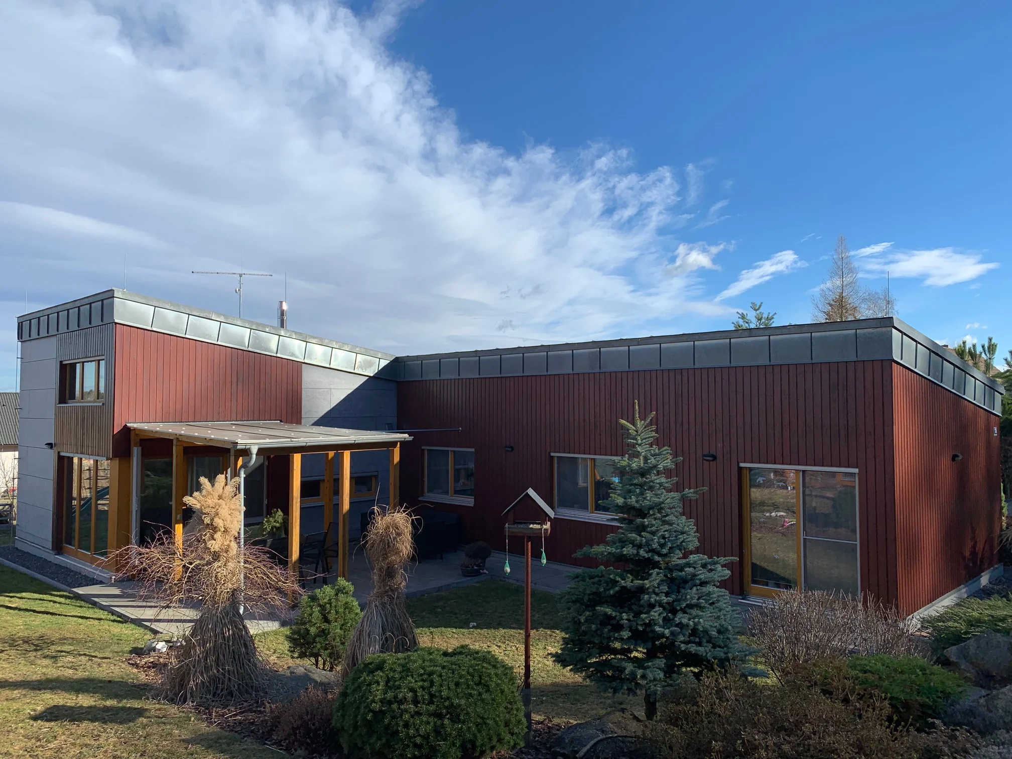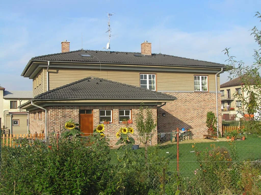 Na okraji malebného západočeského městečka bylo nutné užít sedlovou střechu se skládanou krytinou cihlové barvy a keramický obklad fasády.