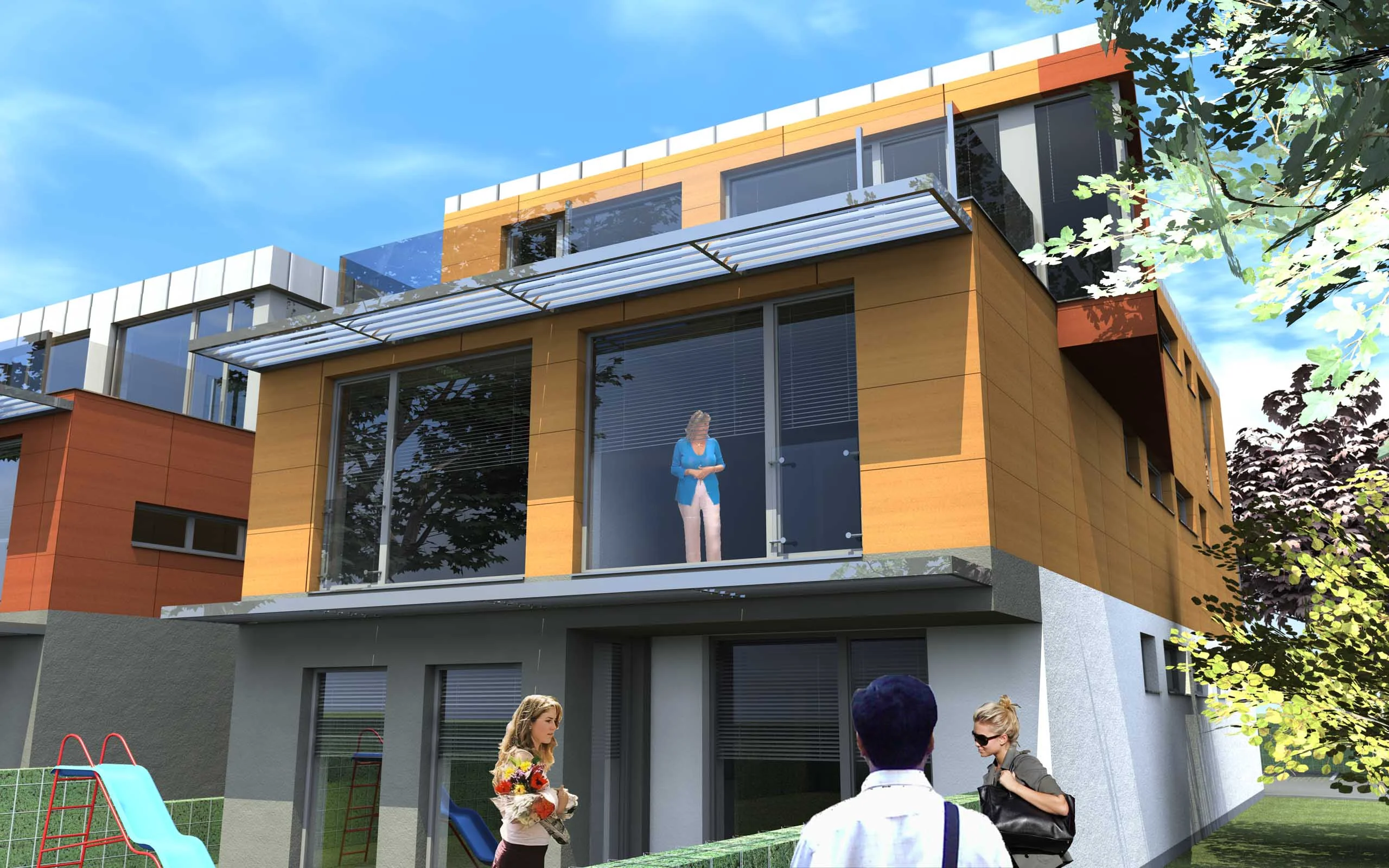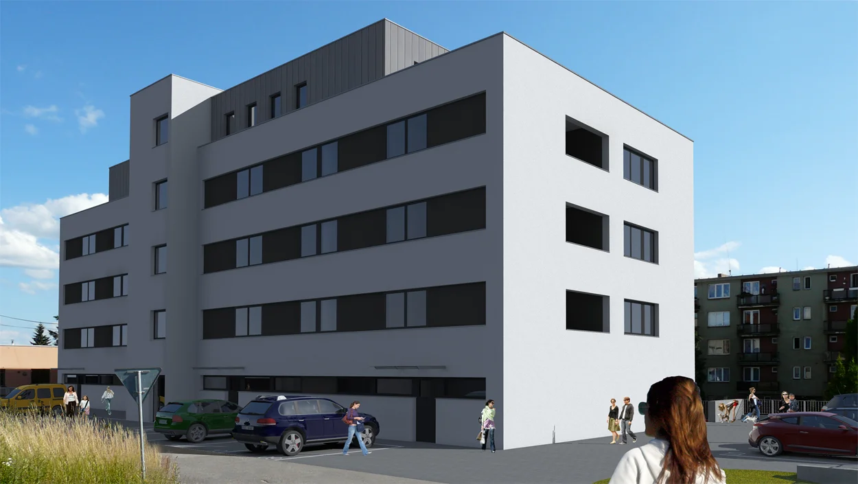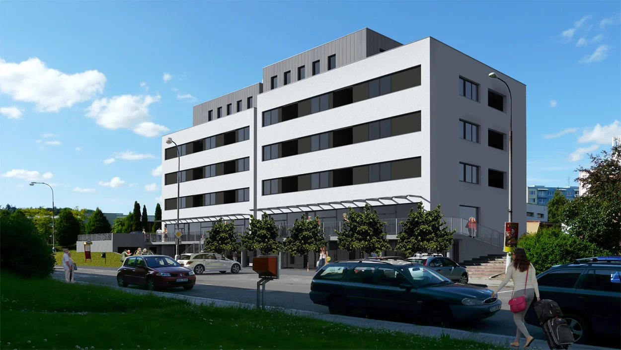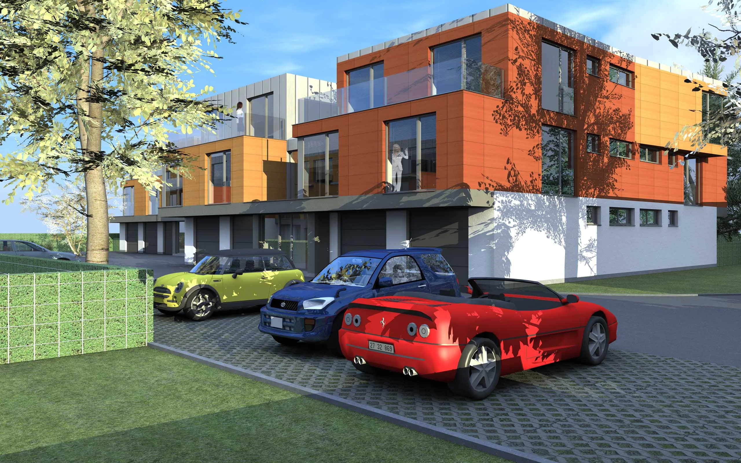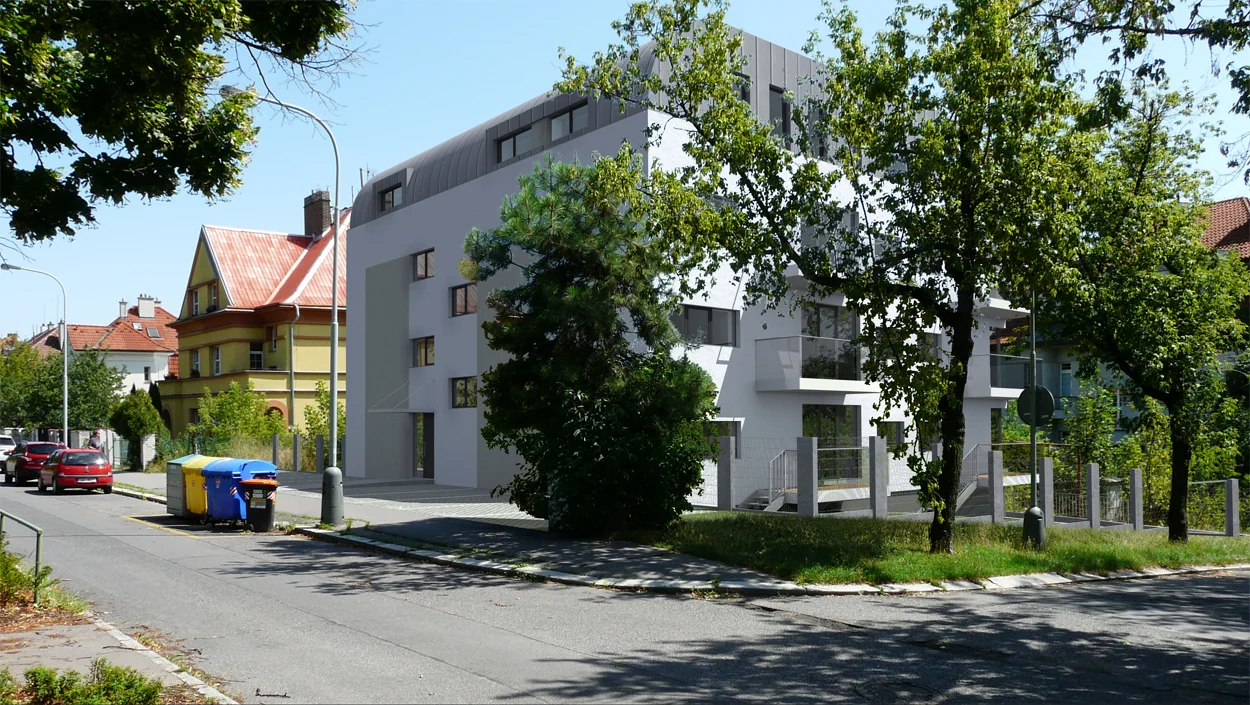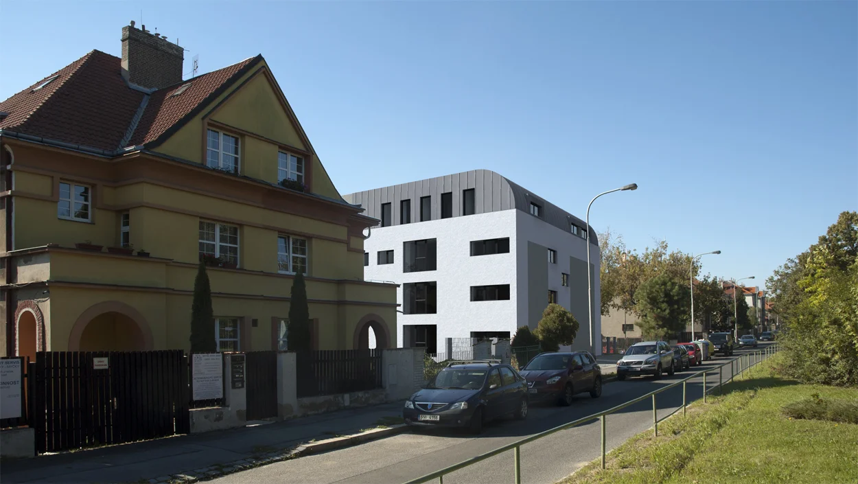 Dům uprostřed relativně nové části města na místě demolované nevyužívané stavby někdejších jeslí má zpevnit lokální urbánní strukturu a poskytnout nadstandardní bydlení vč. garáží v suterénu a pronajimatelných firemních prostor v přízemní podnoži.