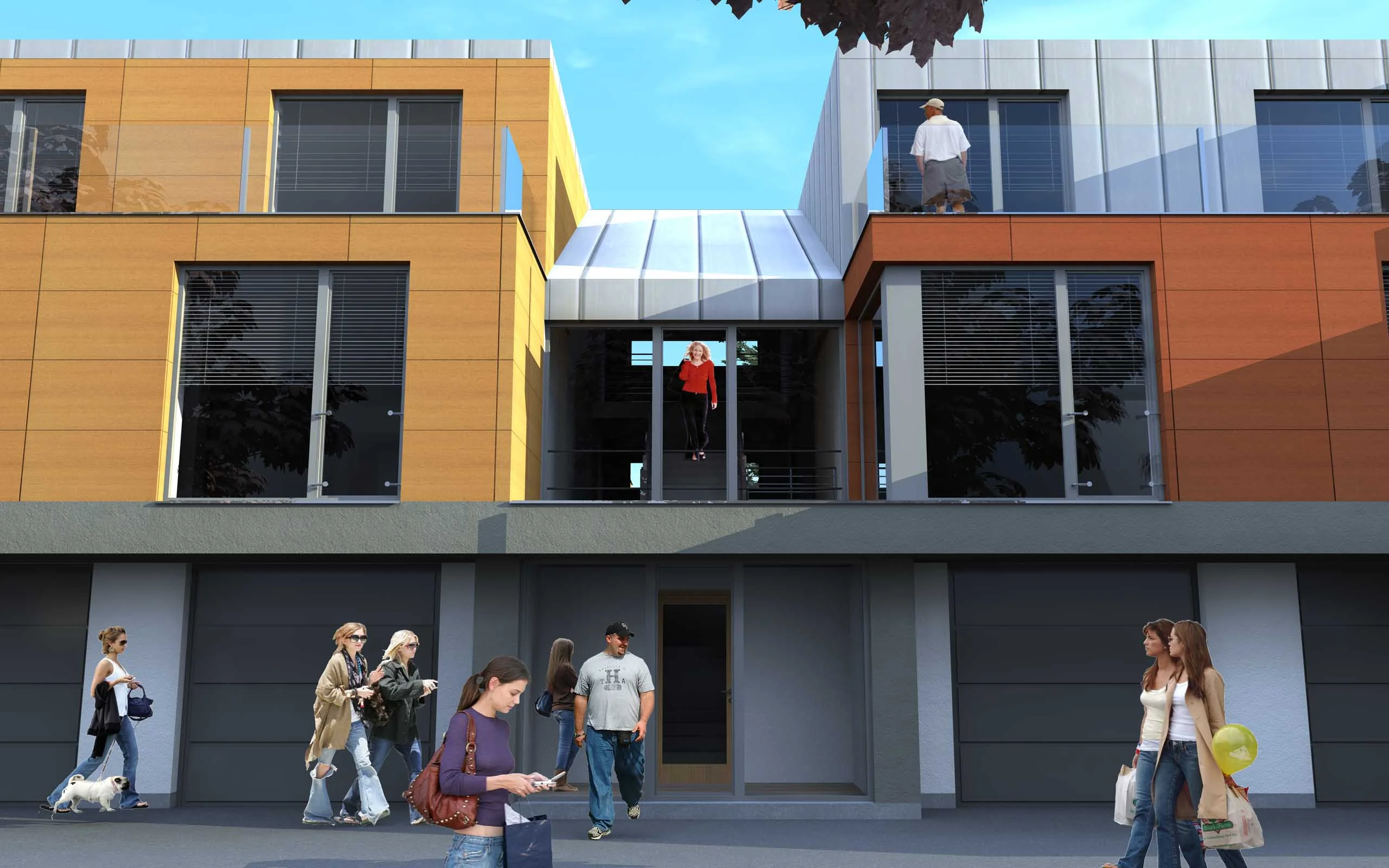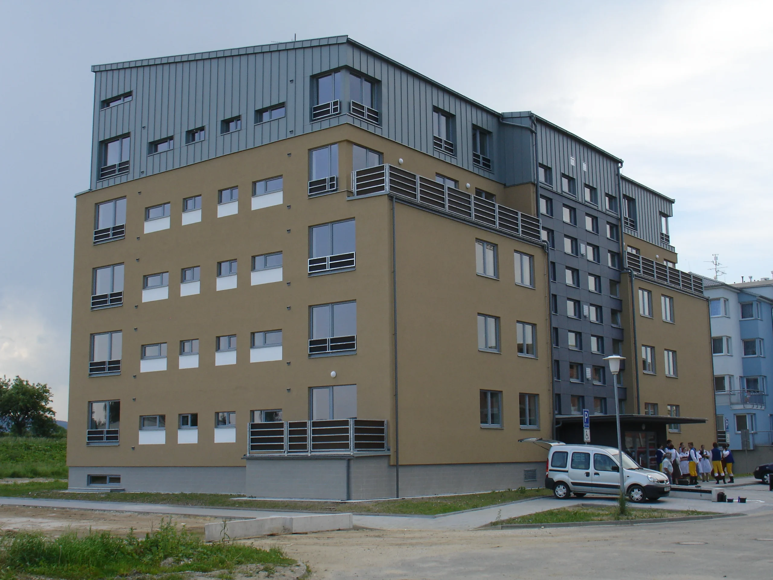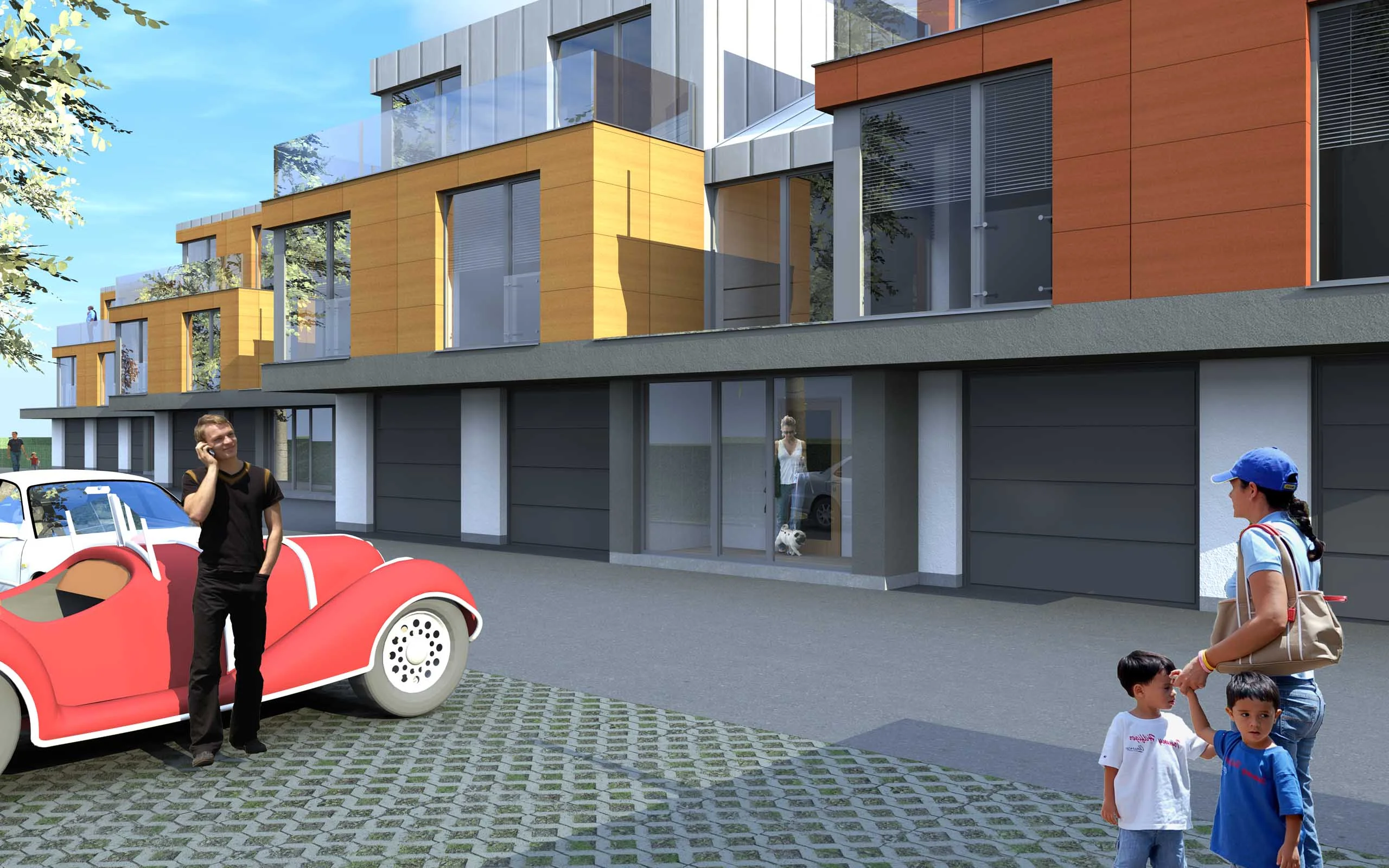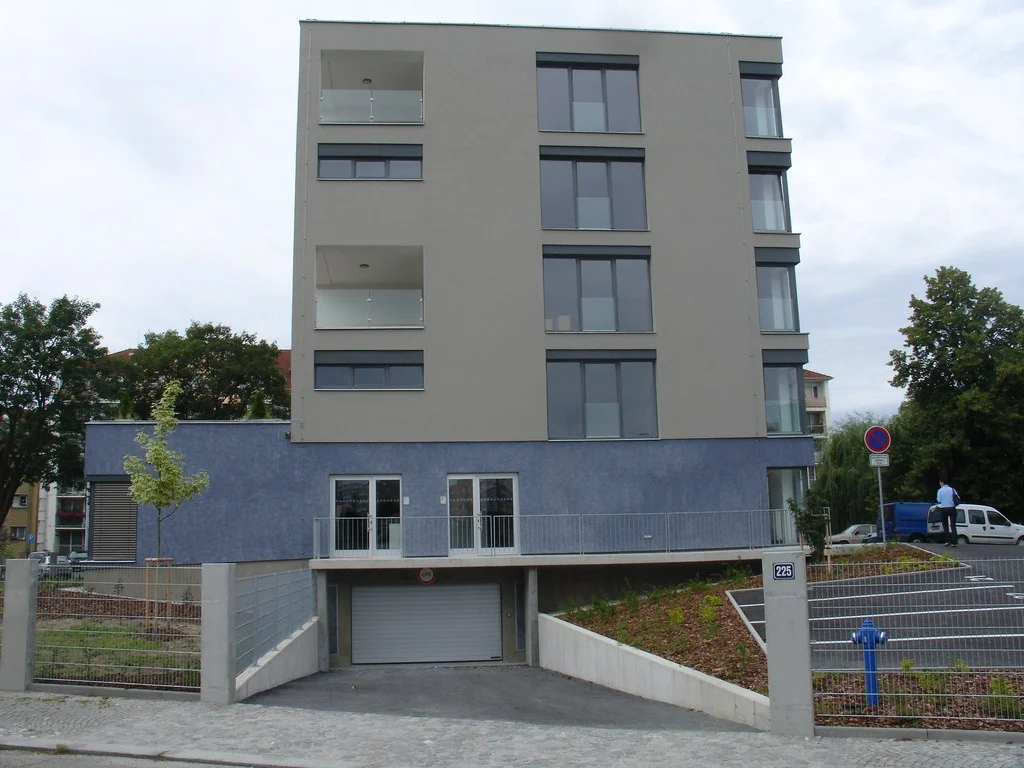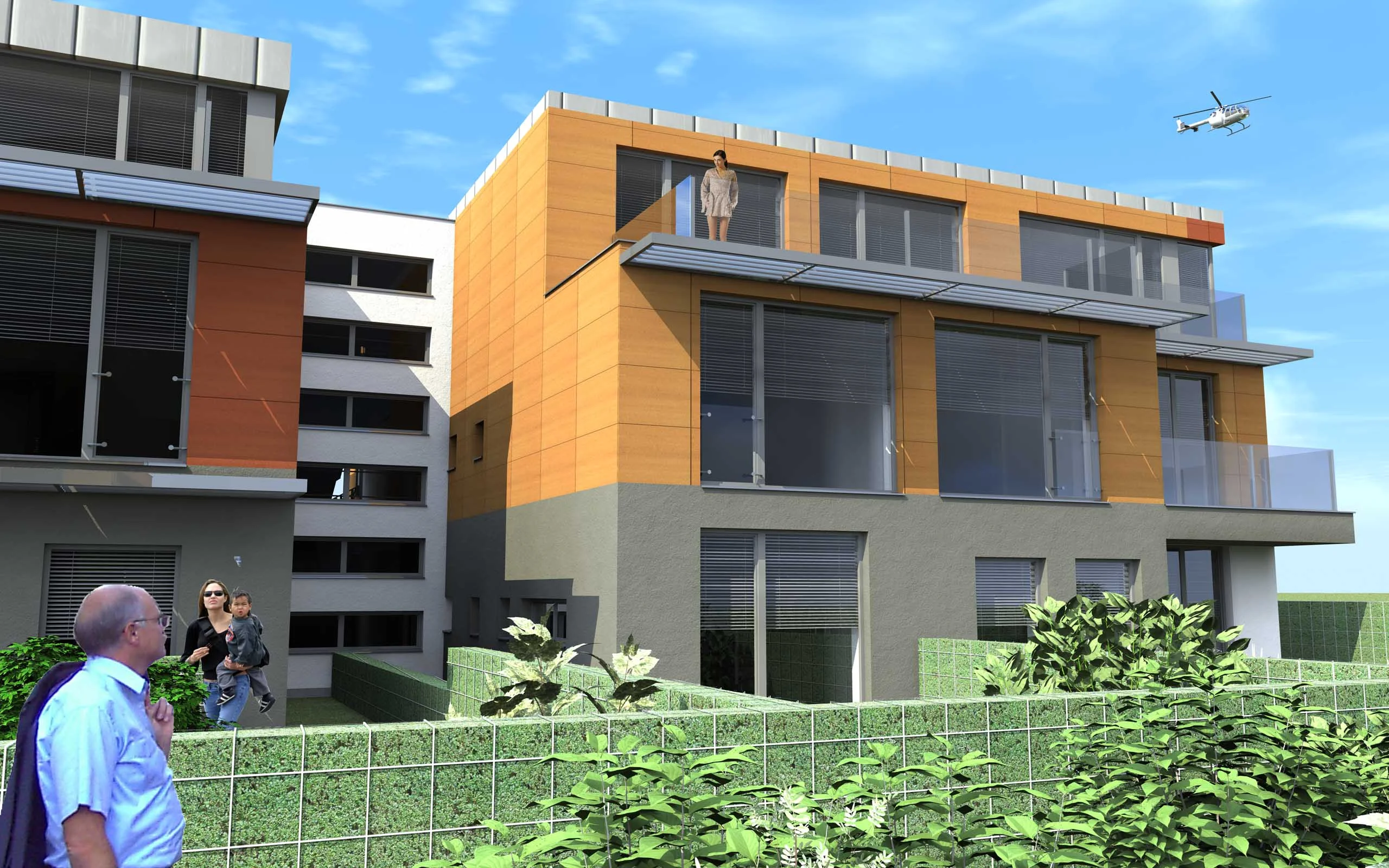 Dům uprostřed relativně nové části města na místě demolované nevyužívané stavby někdejších jeslí má zpevnit lokální urbánní strukturu a poskytnout nadstandardní bydlení vč. garáží v suterénu a pronajimatelných firemních prostor v přízemní podnoži.