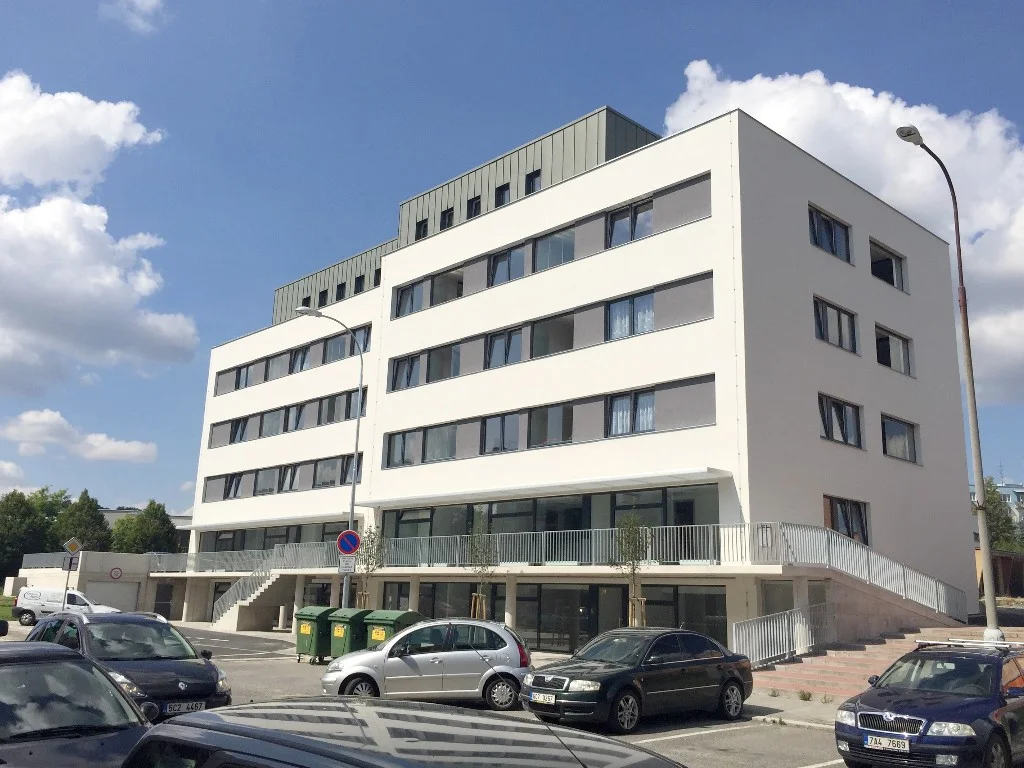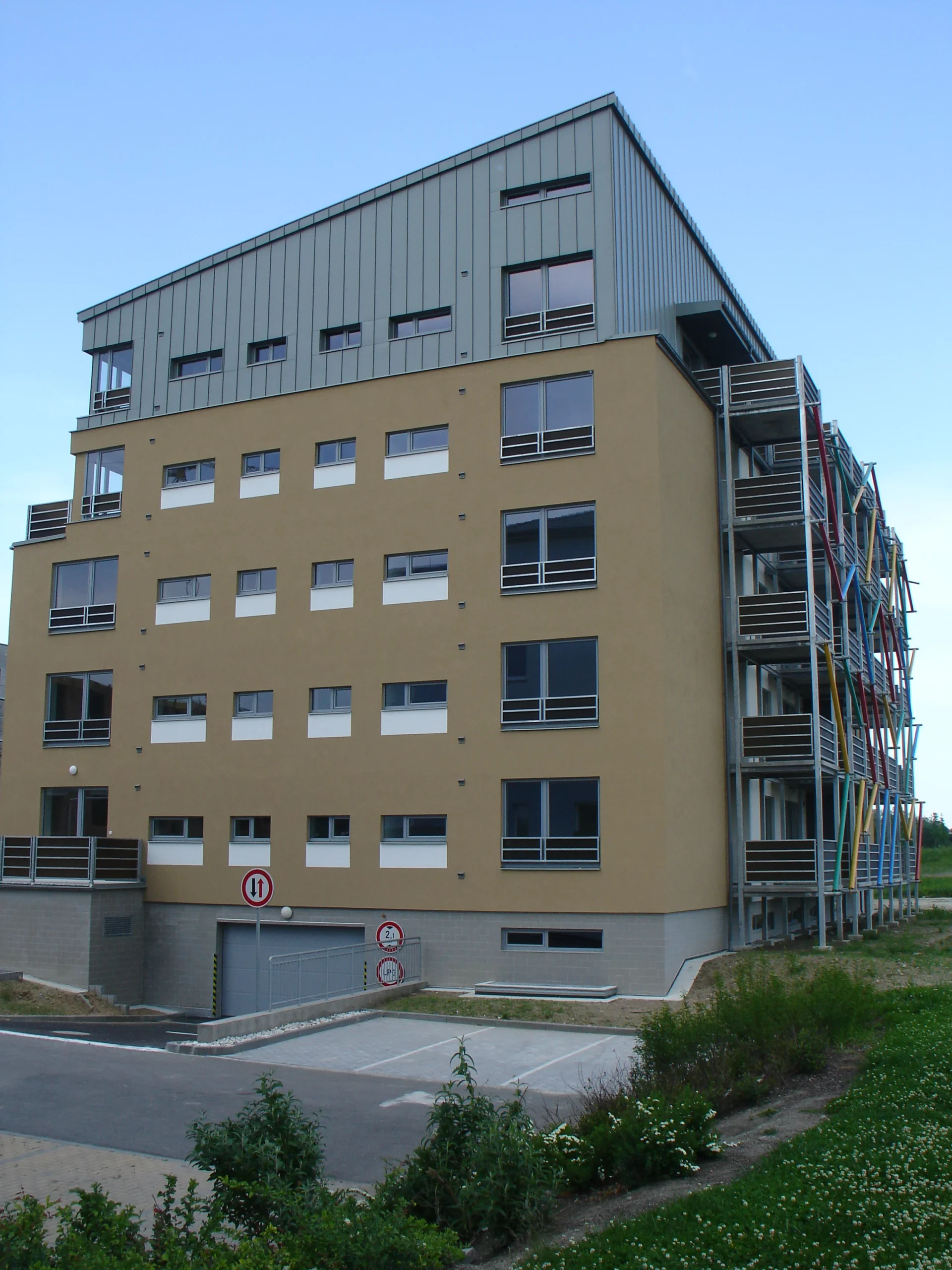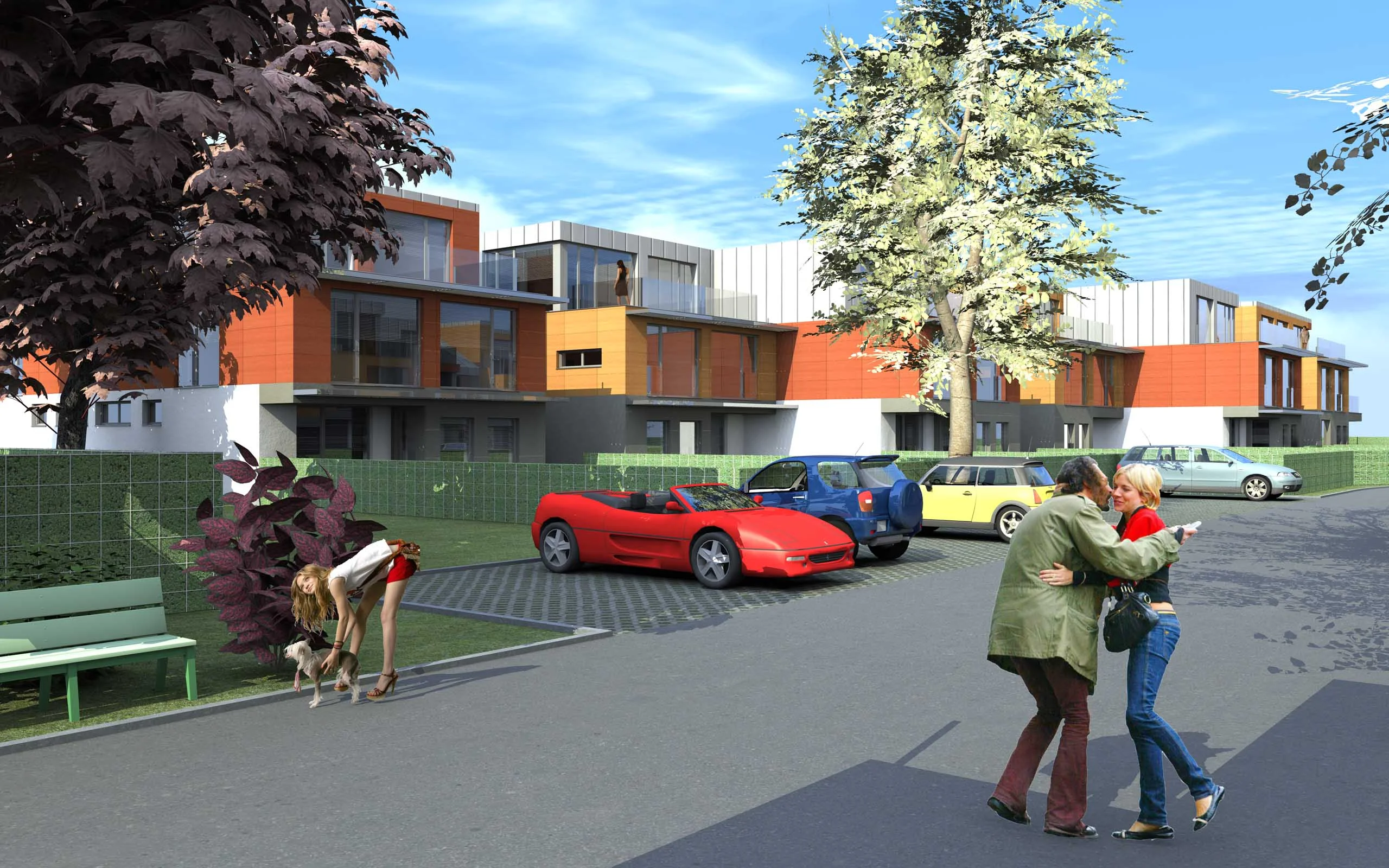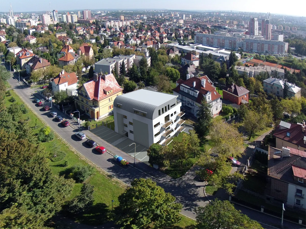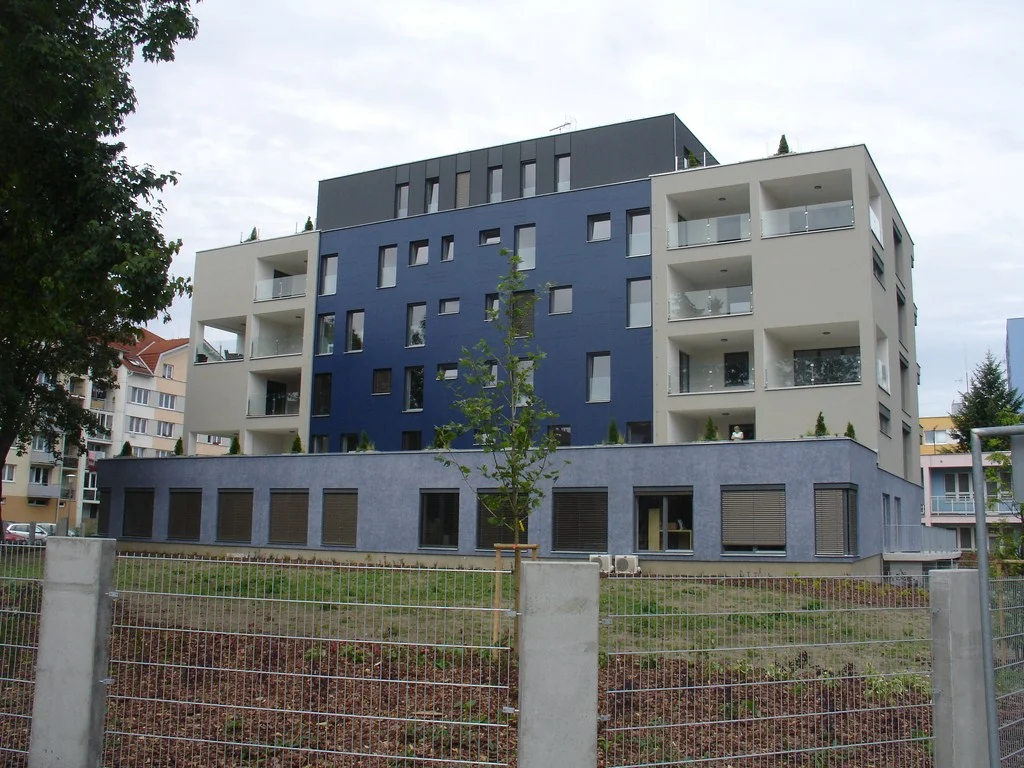 Dům uprostřed relativně nové části města na místě demolované nevyužívané stavby někdejších jeslí má zpevnit lokální urbánní strukturu a poskytnout nadstandardní bydlení vč. garáží v suterénu a pronajimatelných firemních prostor v přízemní podnoži.
