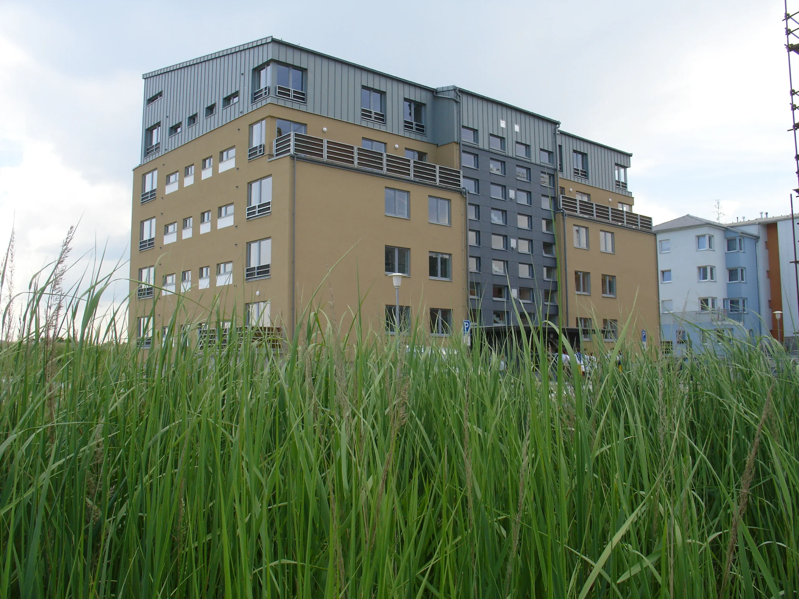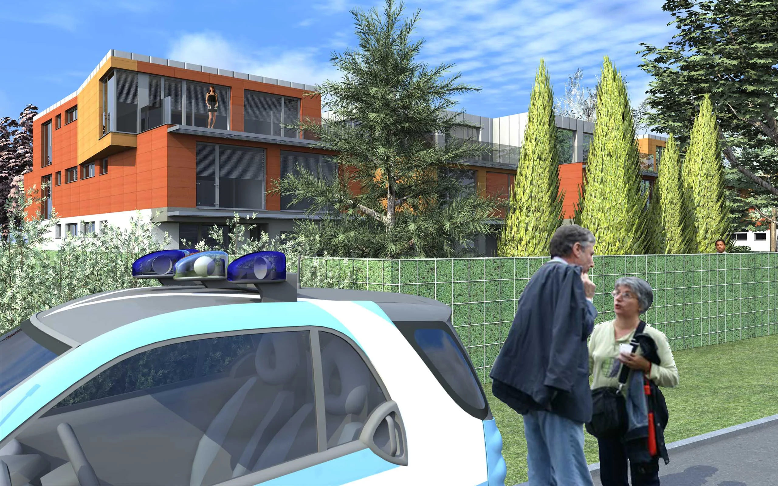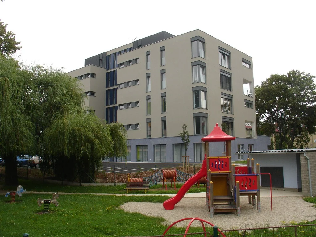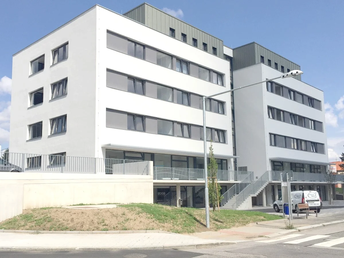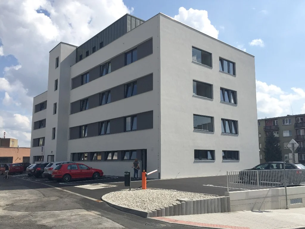 Dům uprostřed relativně nové části města na místě demolované nevyužívané stavby někdejších jeslí má zpevnit lokální urbánní strukturu a poskytnout nadstandardní bydlení vč. garáží v suterénu a pronajimatelných firemních prostor v přízemní podnoži.