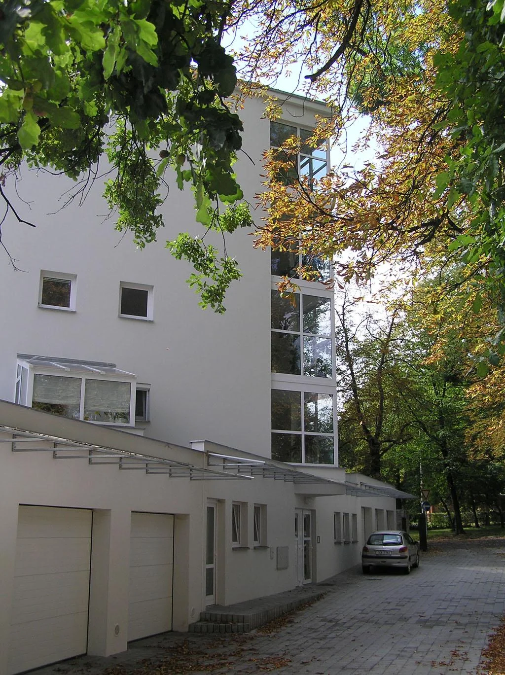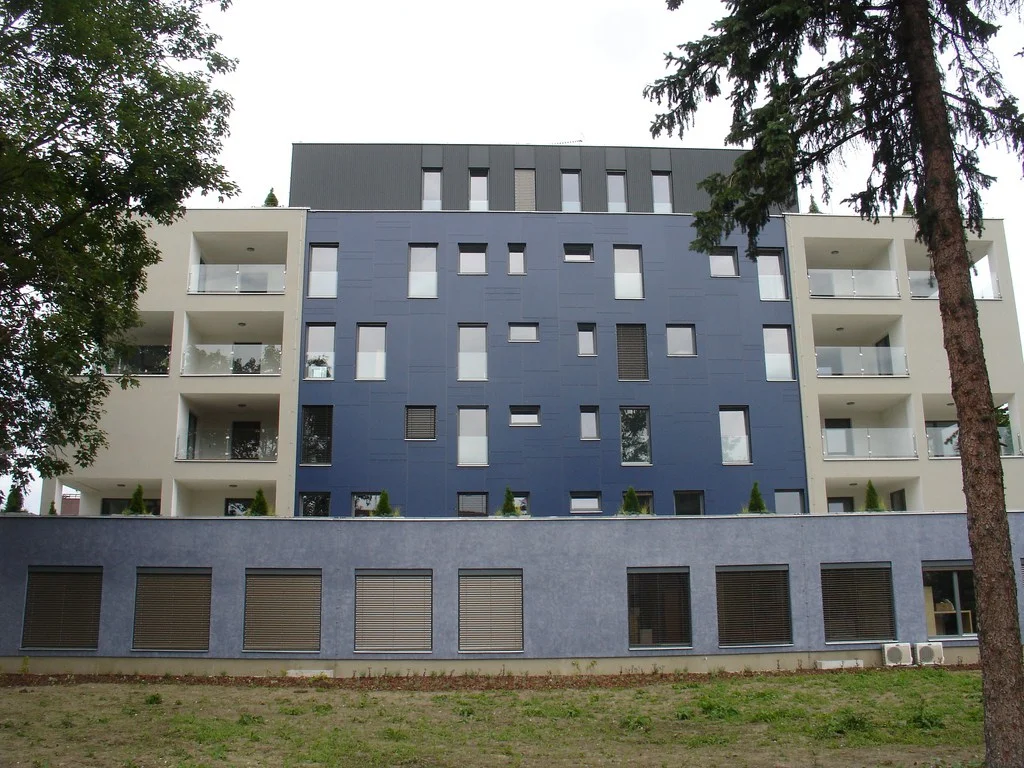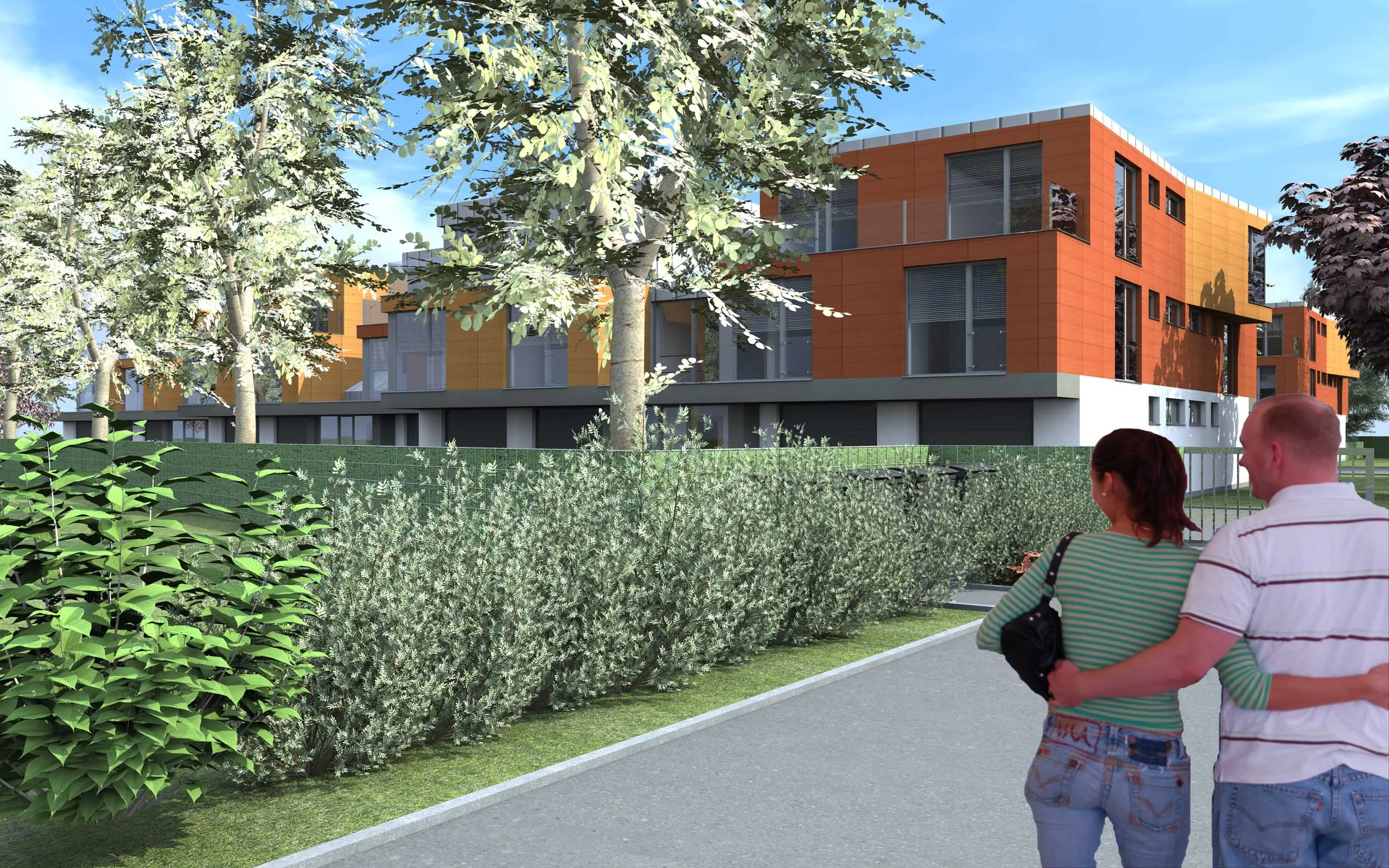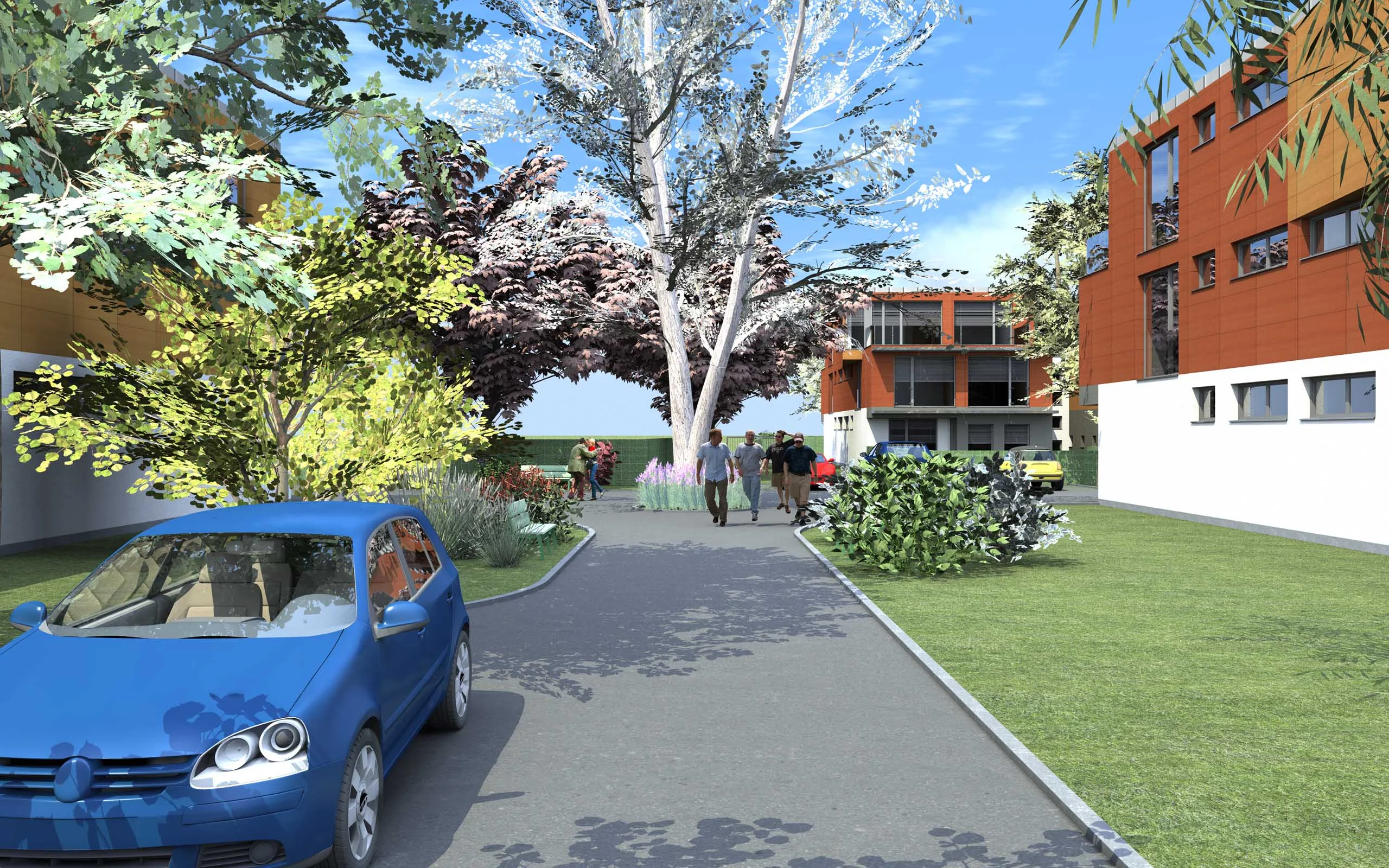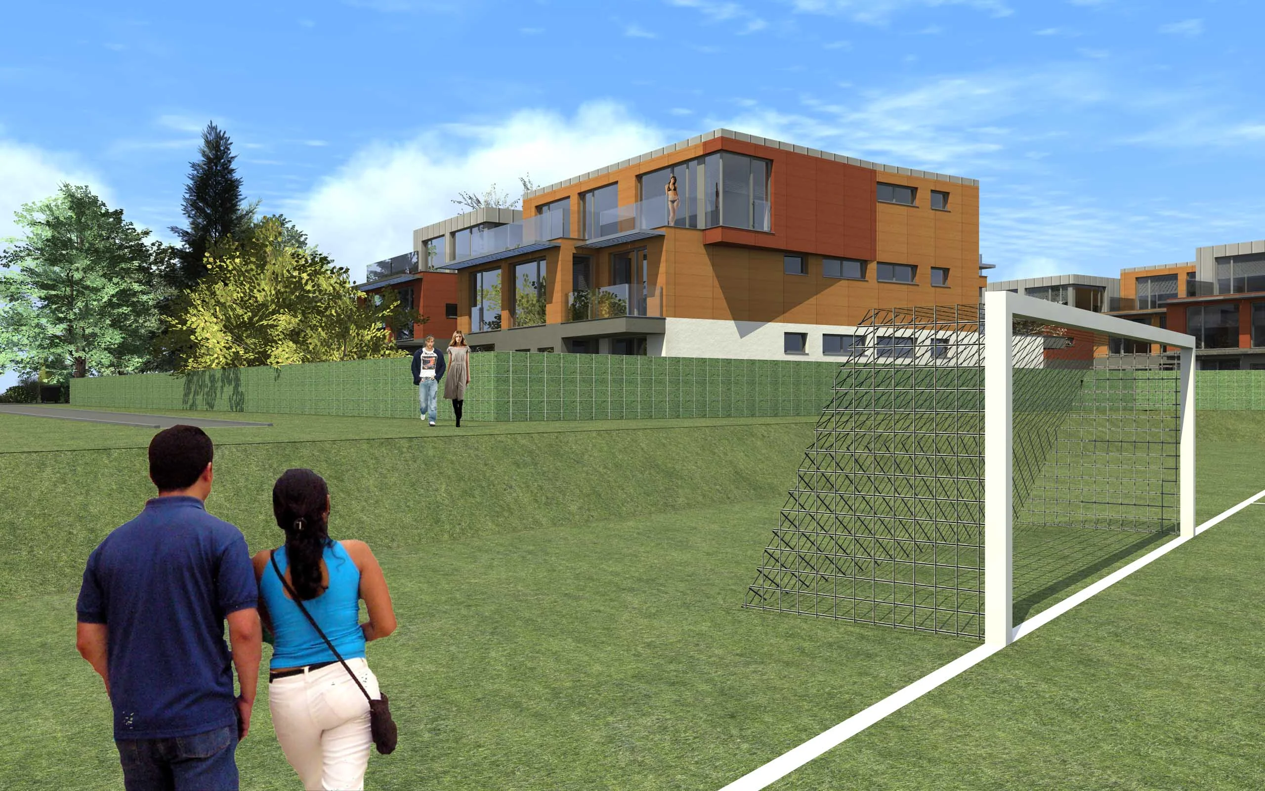 Dům uprostřed relativně nové části města na místě demolované nevyužívané stavby někdejších jeslí má zpevnit lokální urbánní strukturu a poskytnout nadstandardní bydlení vč. garáží v suterénu a pronajimatelných firemních prostor v přízemní podnoži.
