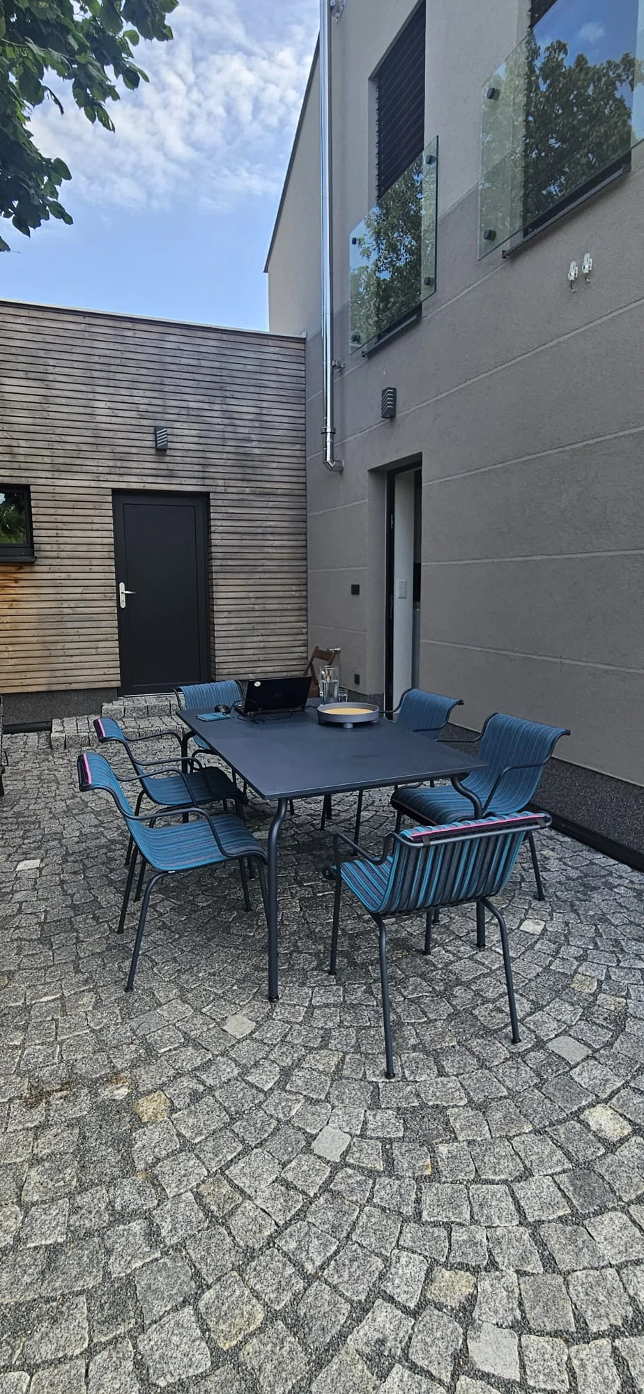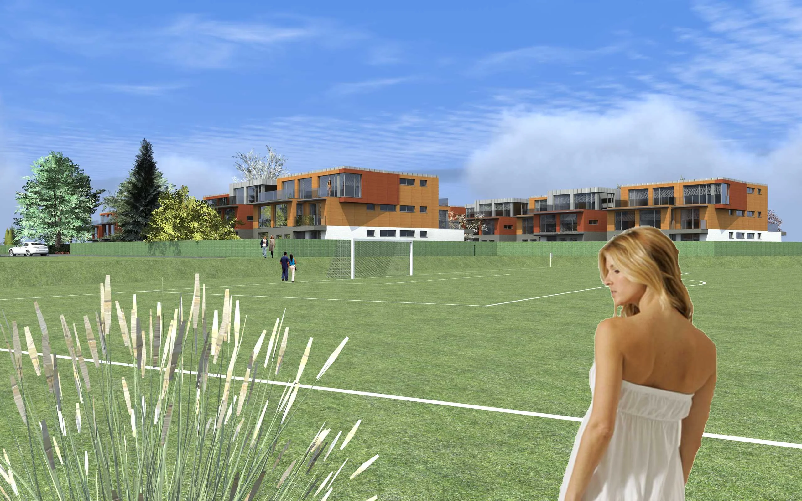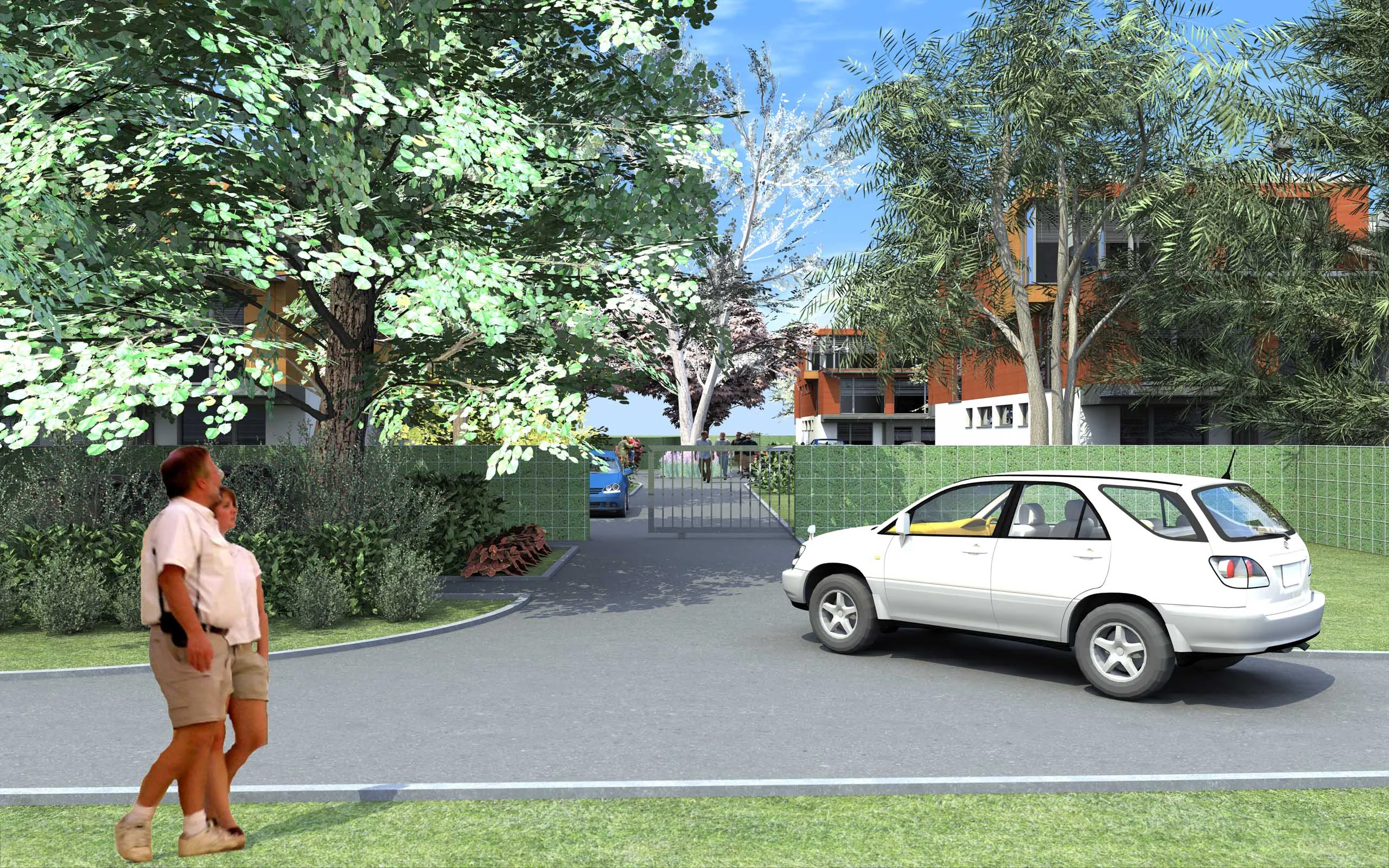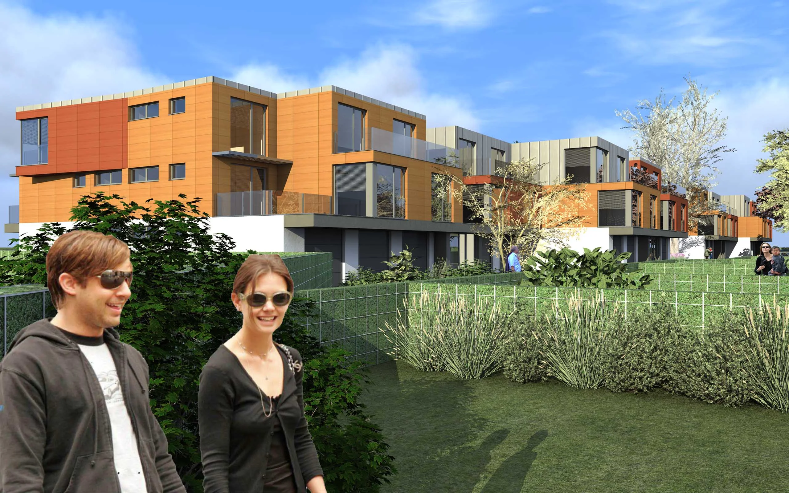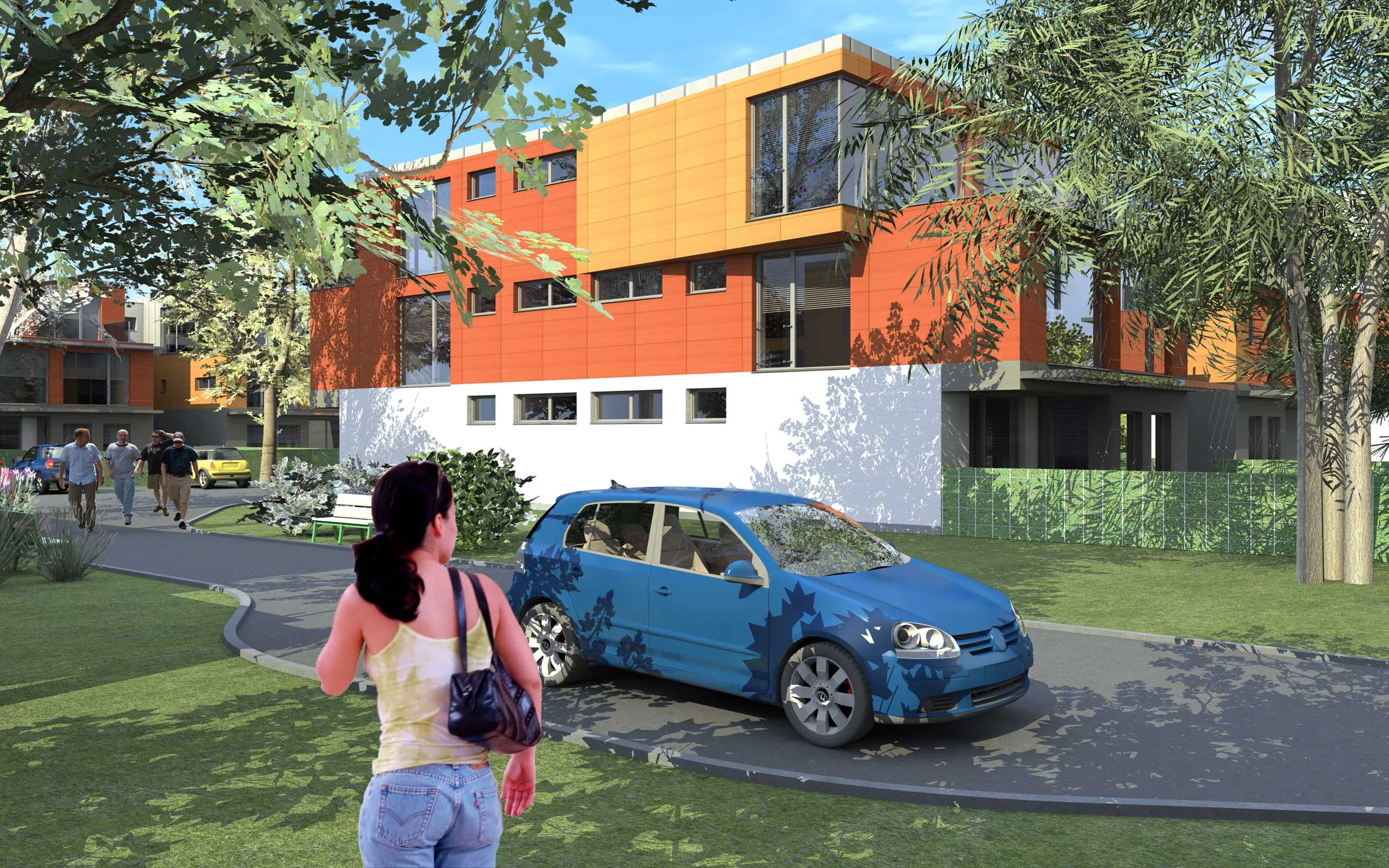 Dům uprostřed relativně nové části města na místě demolované nevyužívané stavby někdejších jeslí má zpevnit lokální urbánní strukturu a poskytnout nadstandardní bydlení vč. garáží v suterénu a pronajimatelných firemních prostor v přízemní podnoži.