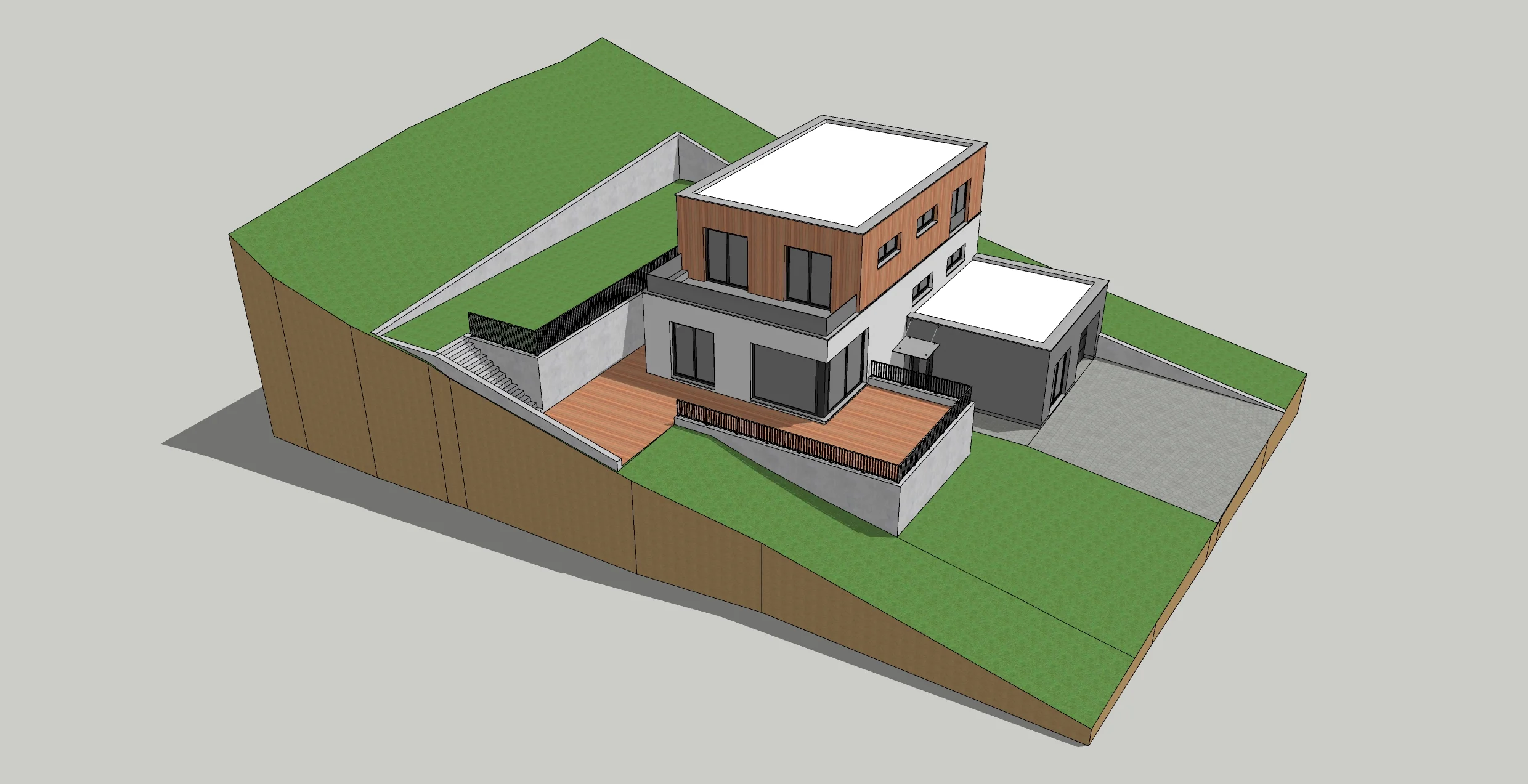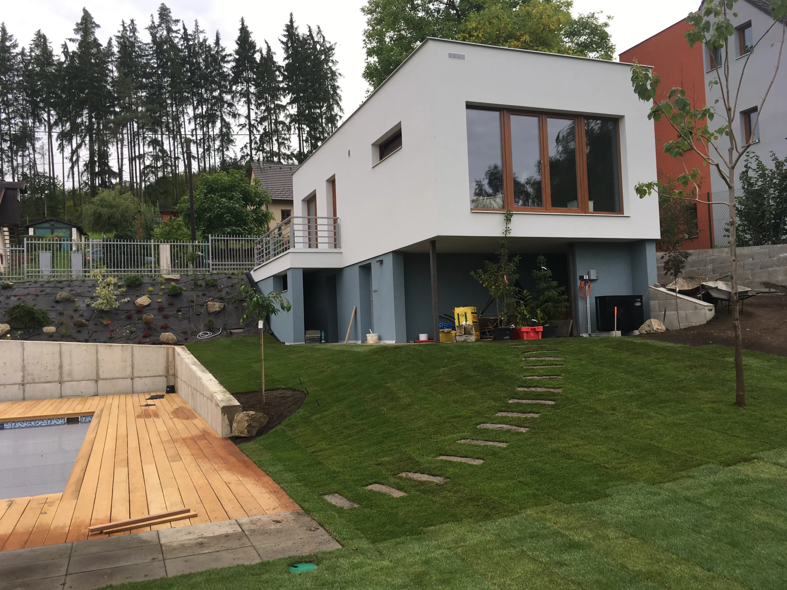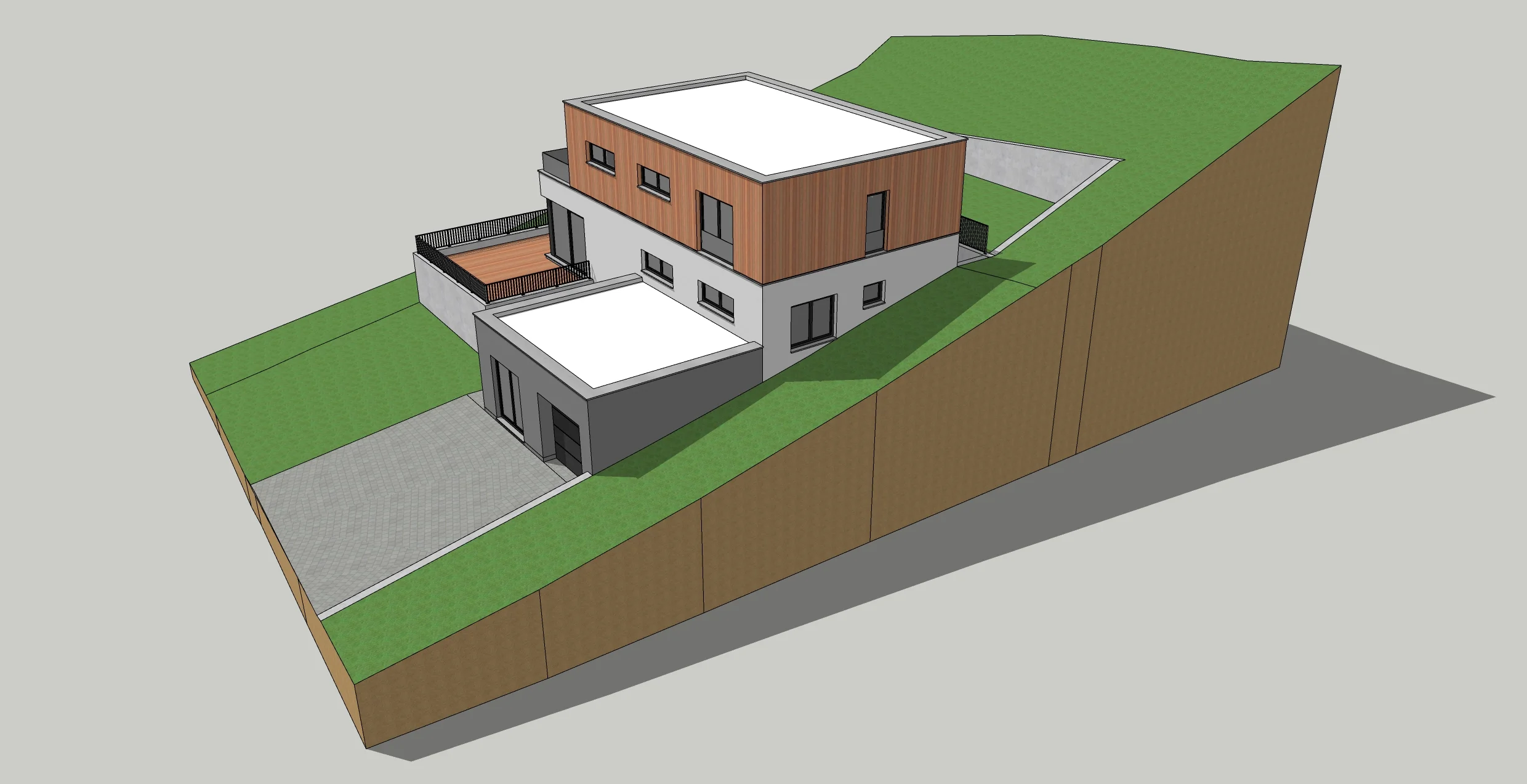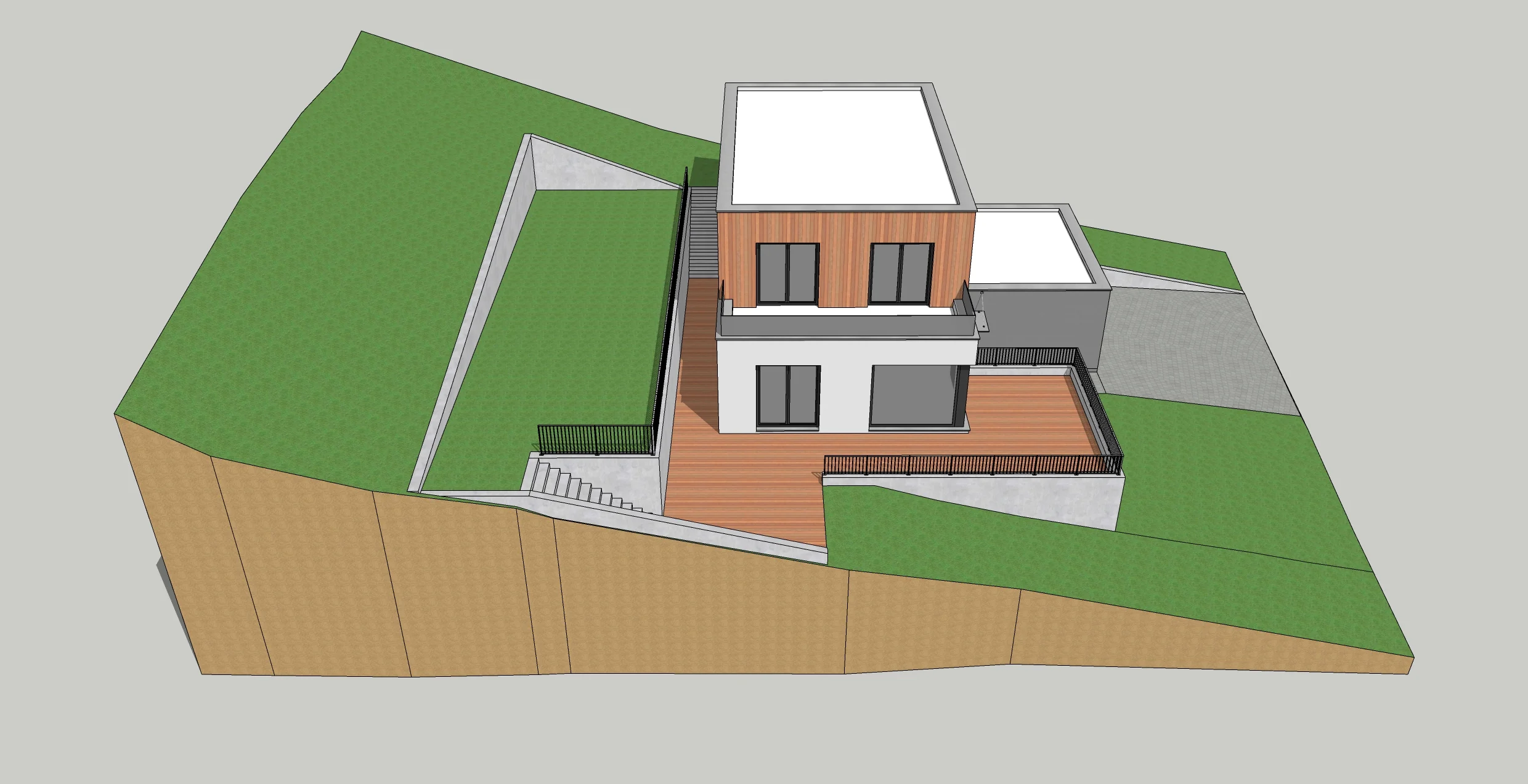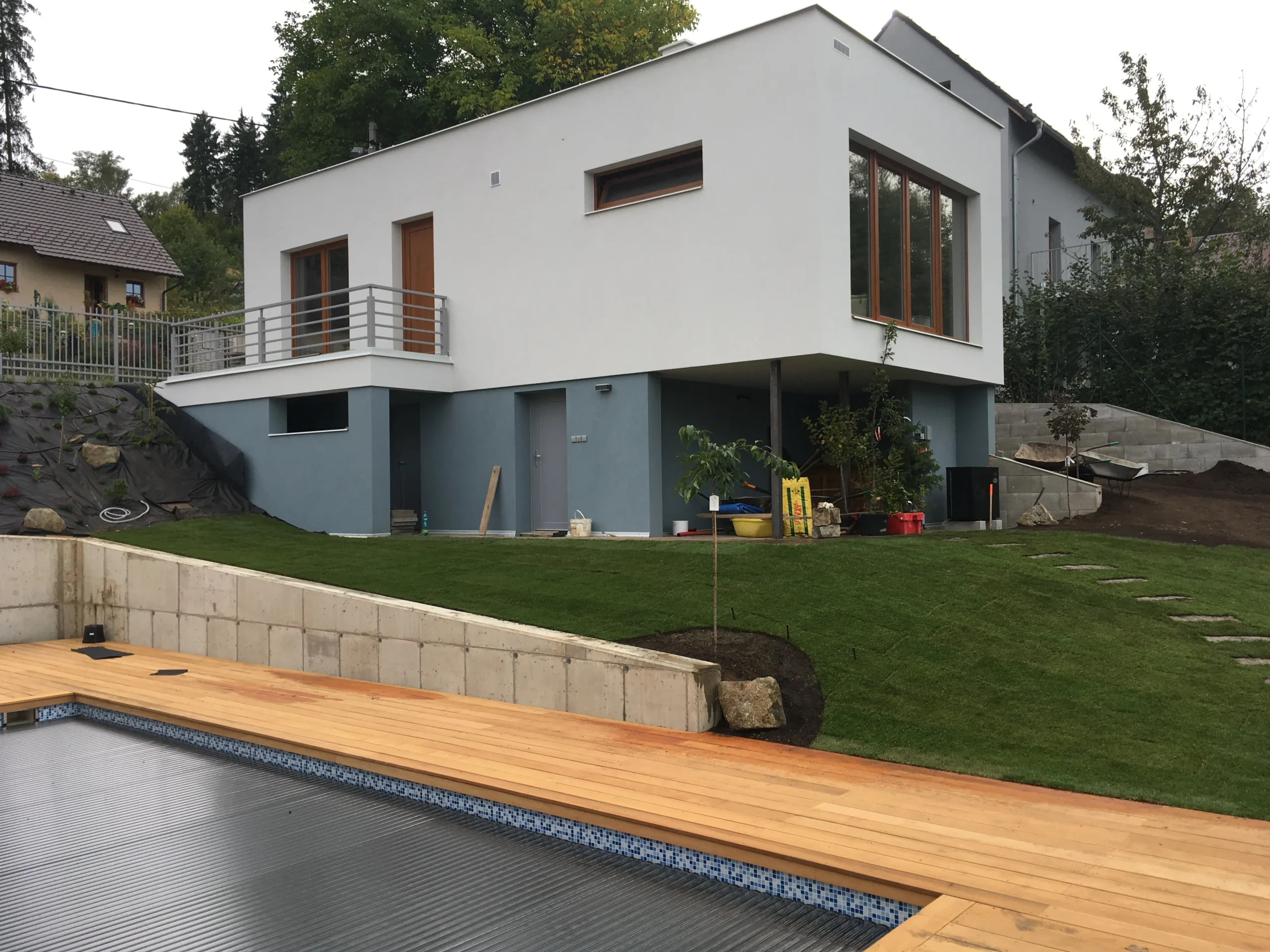 Moderní plochostřechý rodinný dům ve svažitém pozemku.