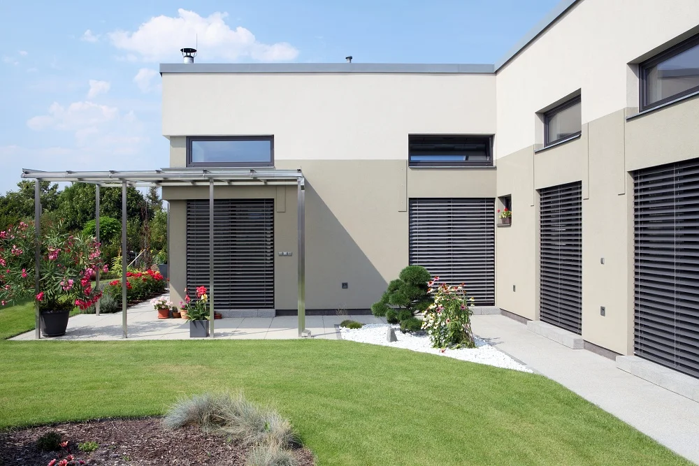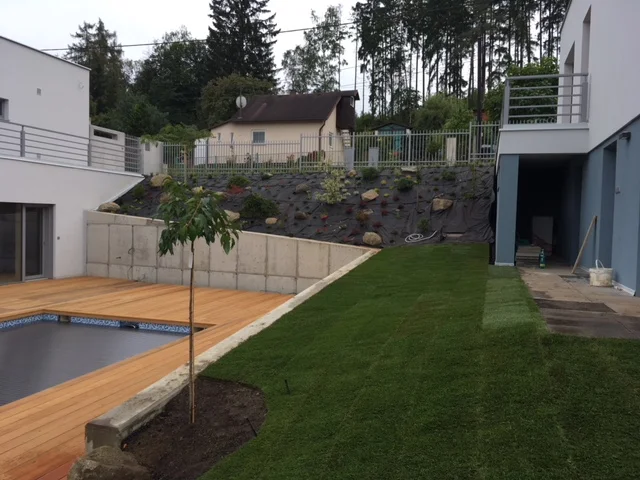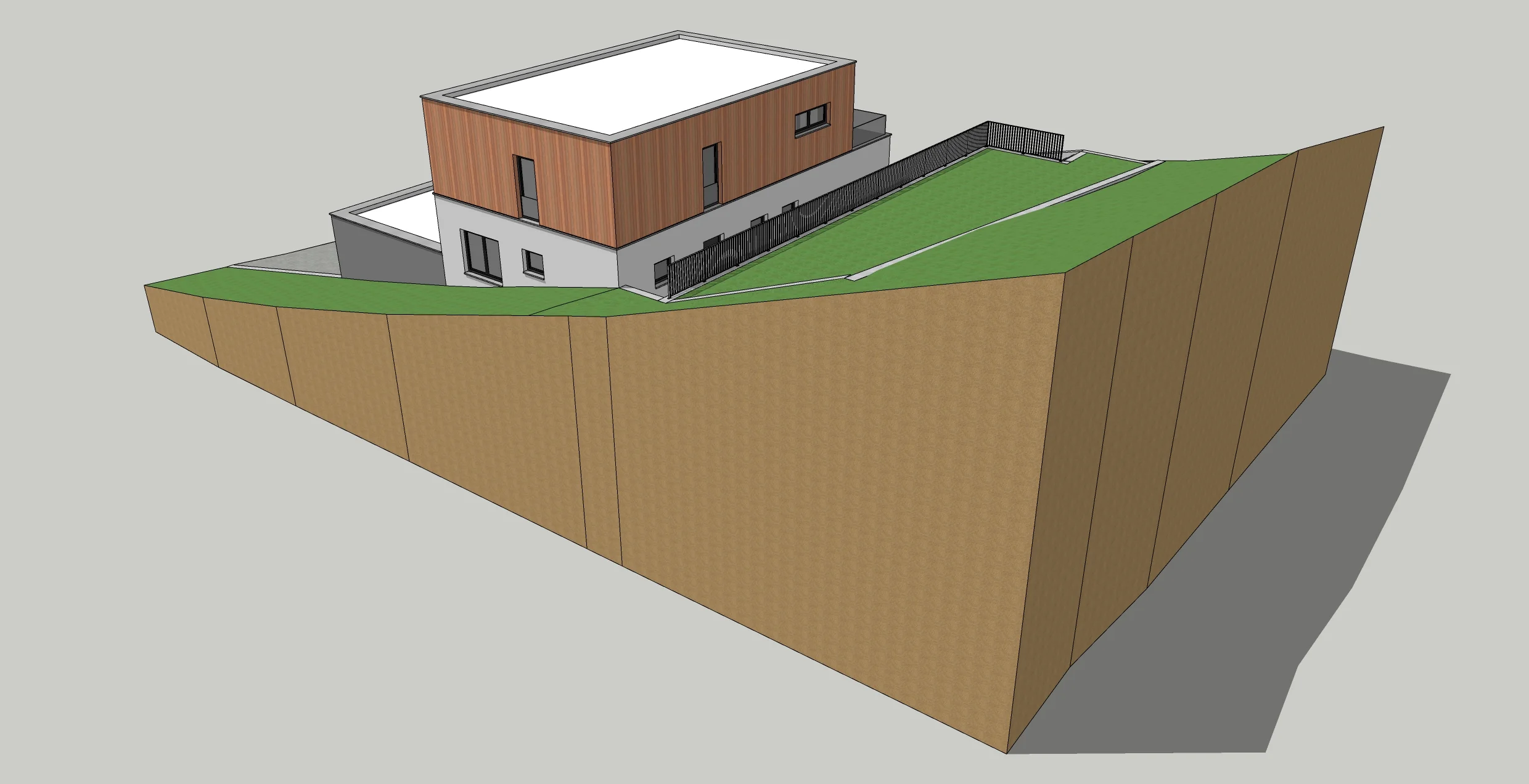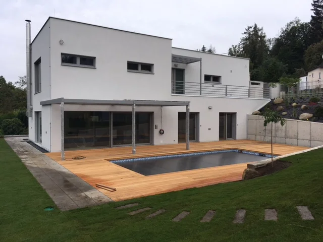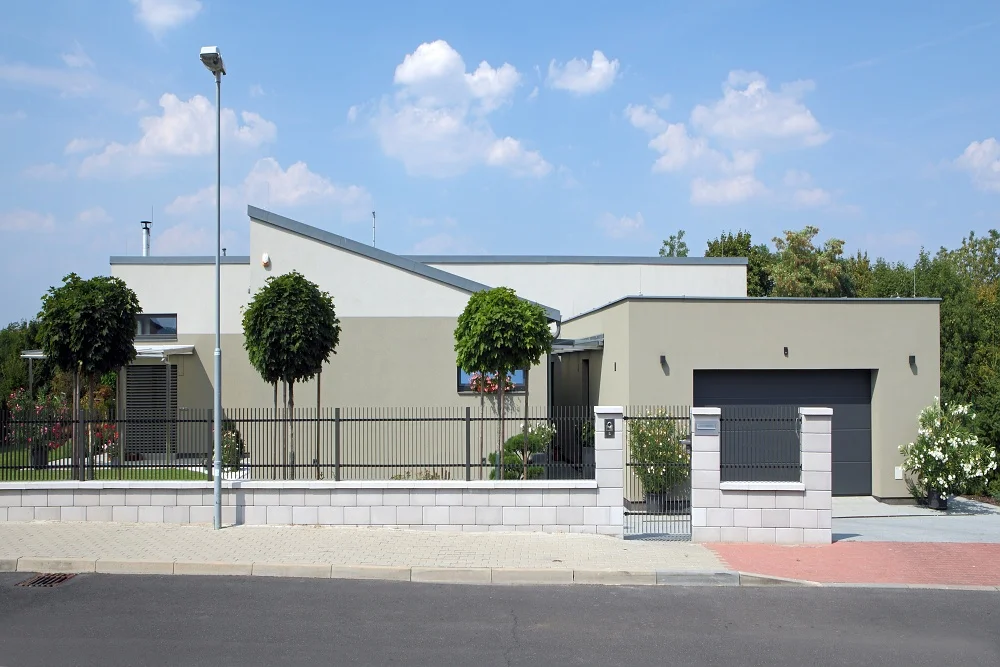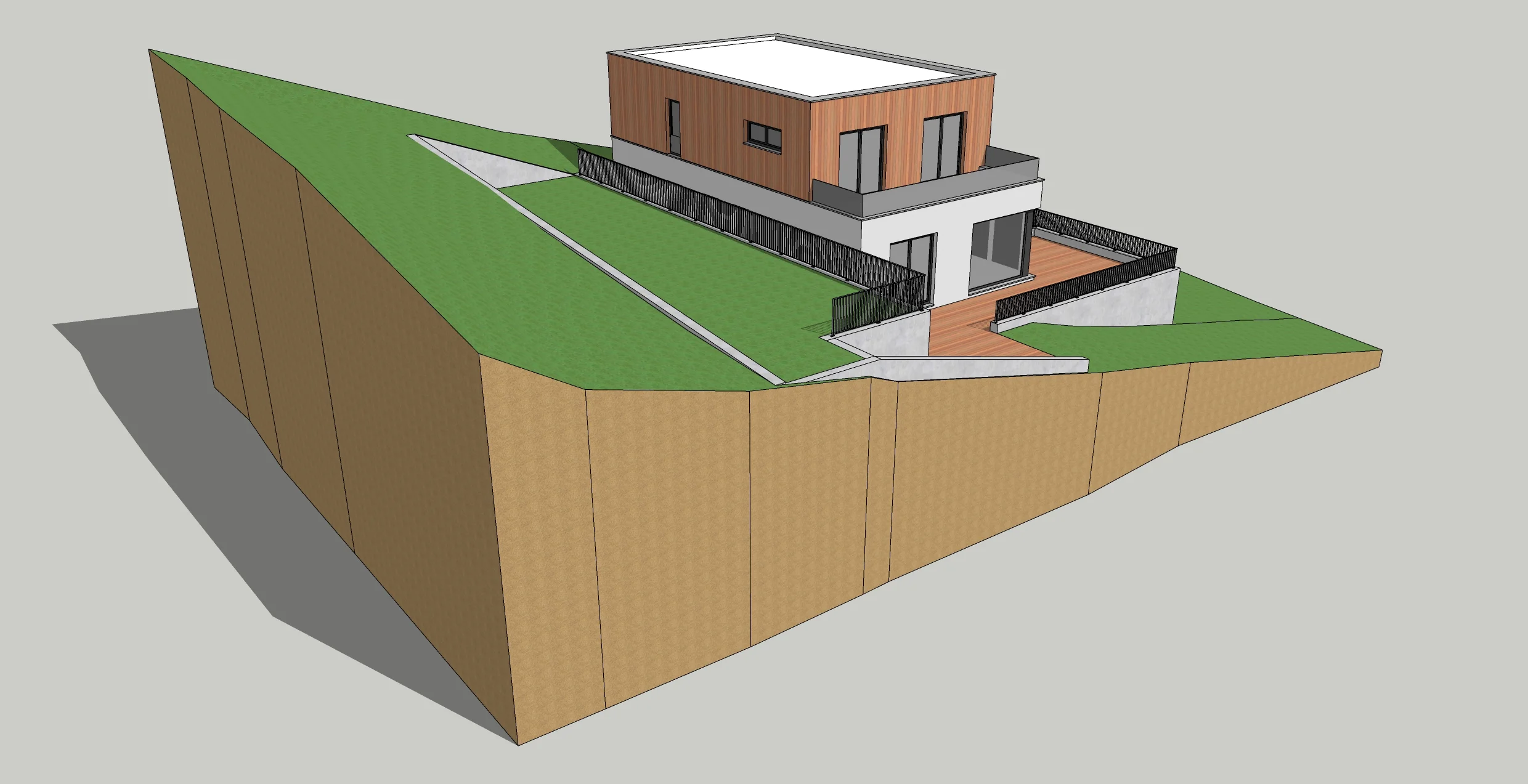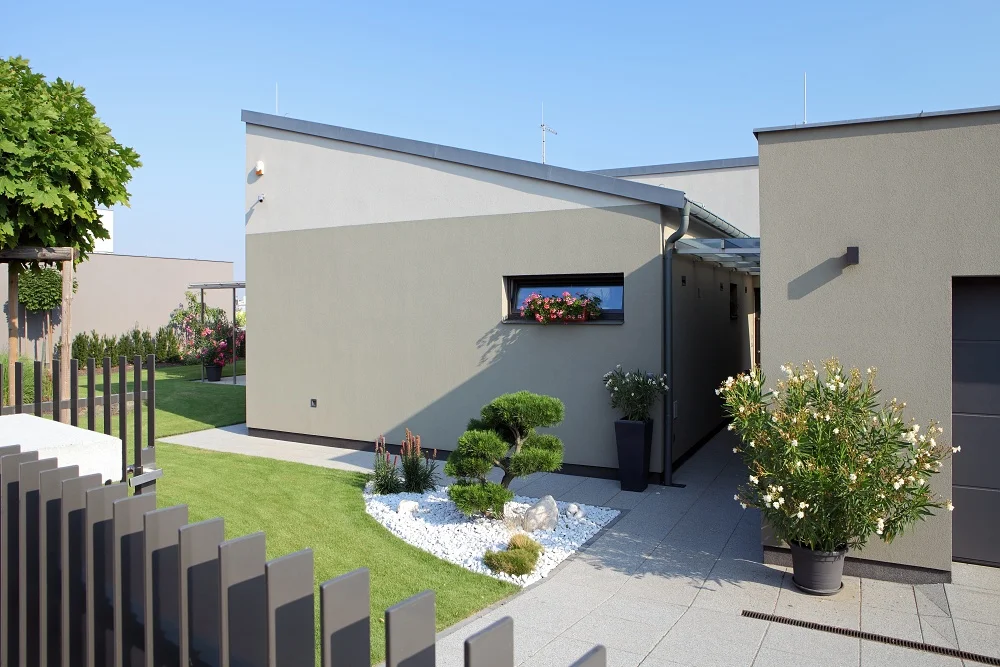 Moderní plochostřechý rodinný dům ve svažitém pozemku.