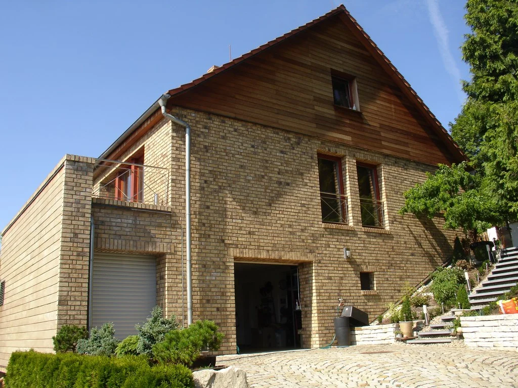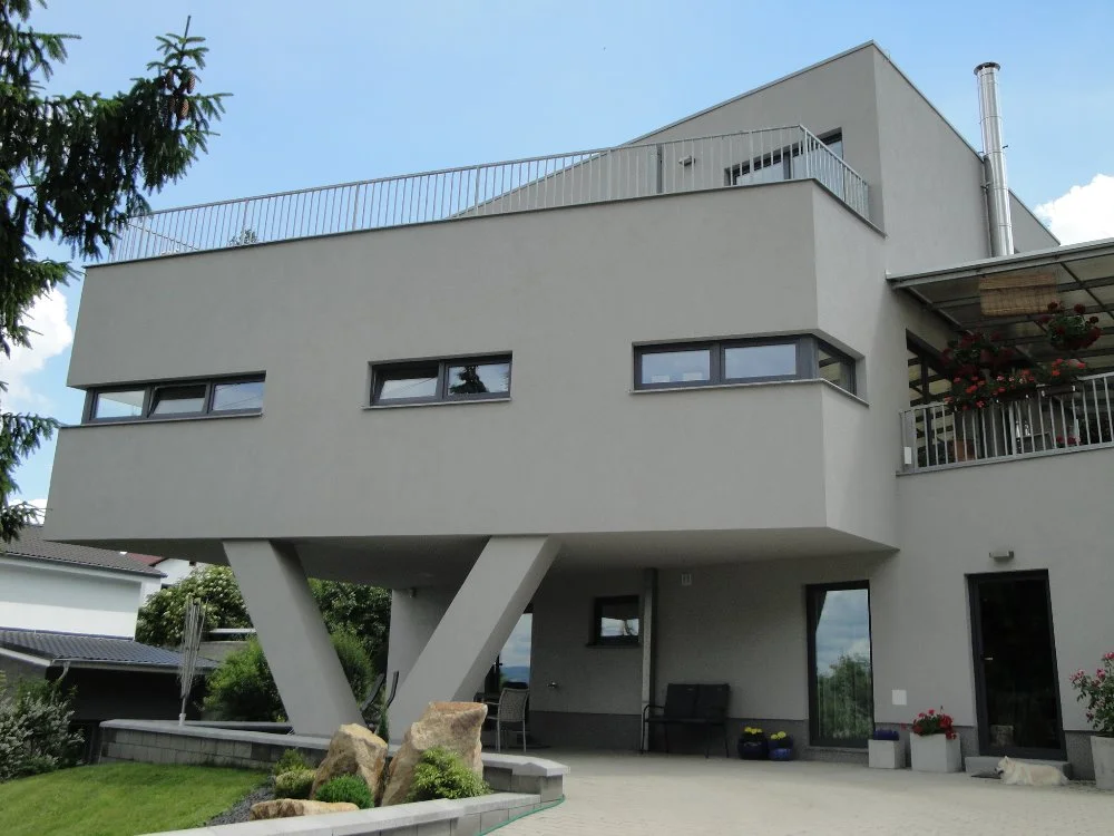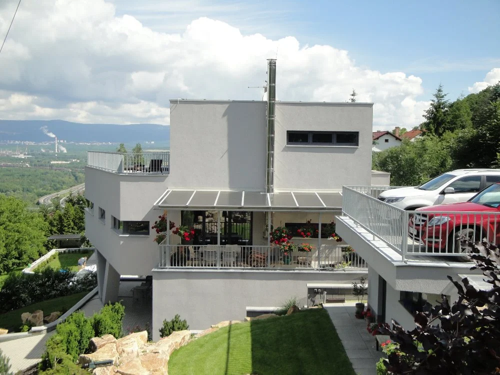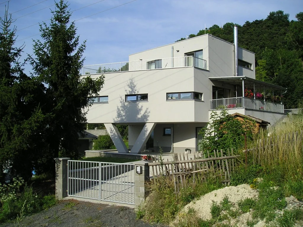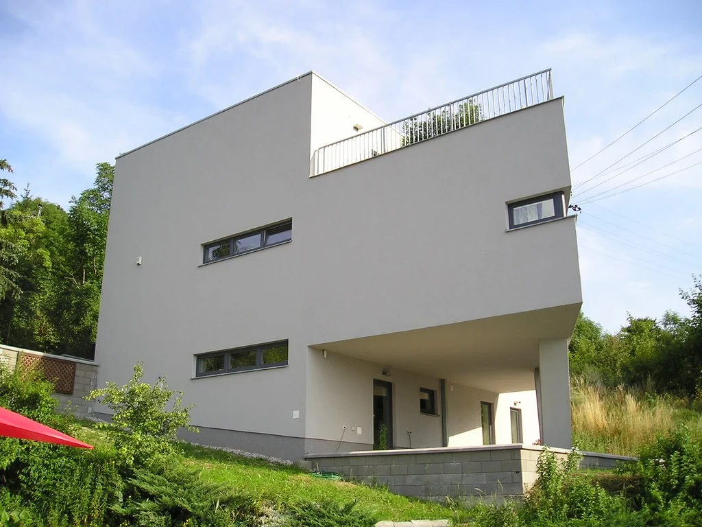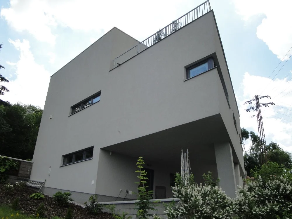 Do svahu pod Hněvínem zasazený rodinný dům s vystupujícím mezipatrem, osazeným na pilíř ve tvaru „V“.