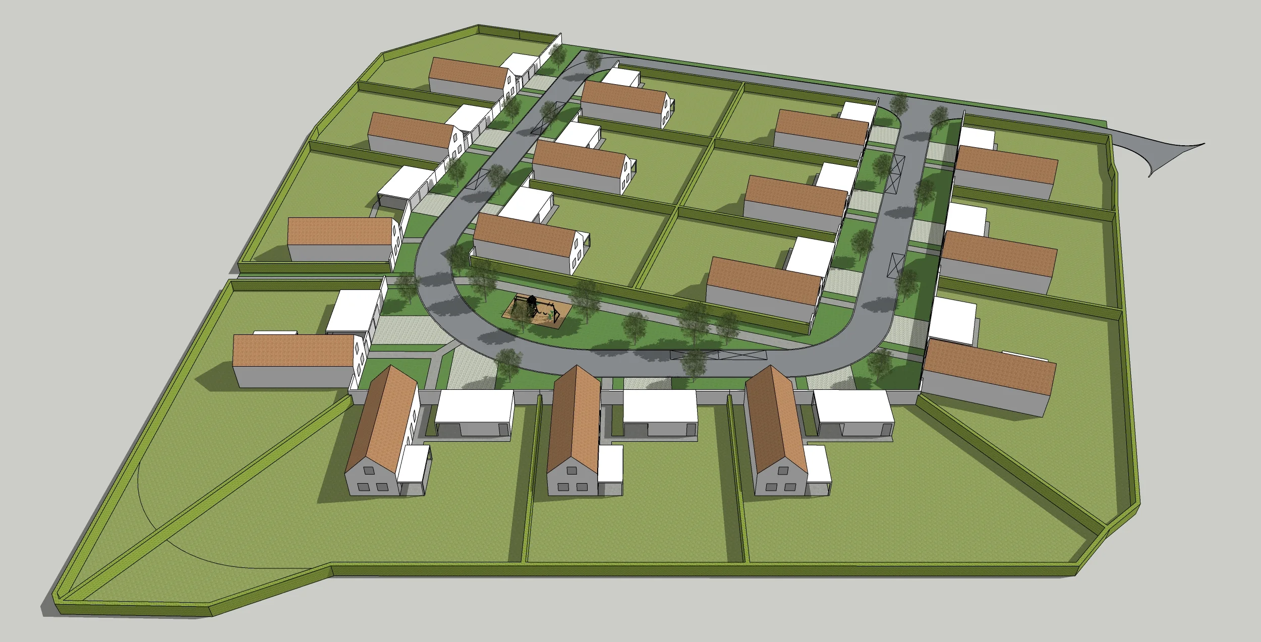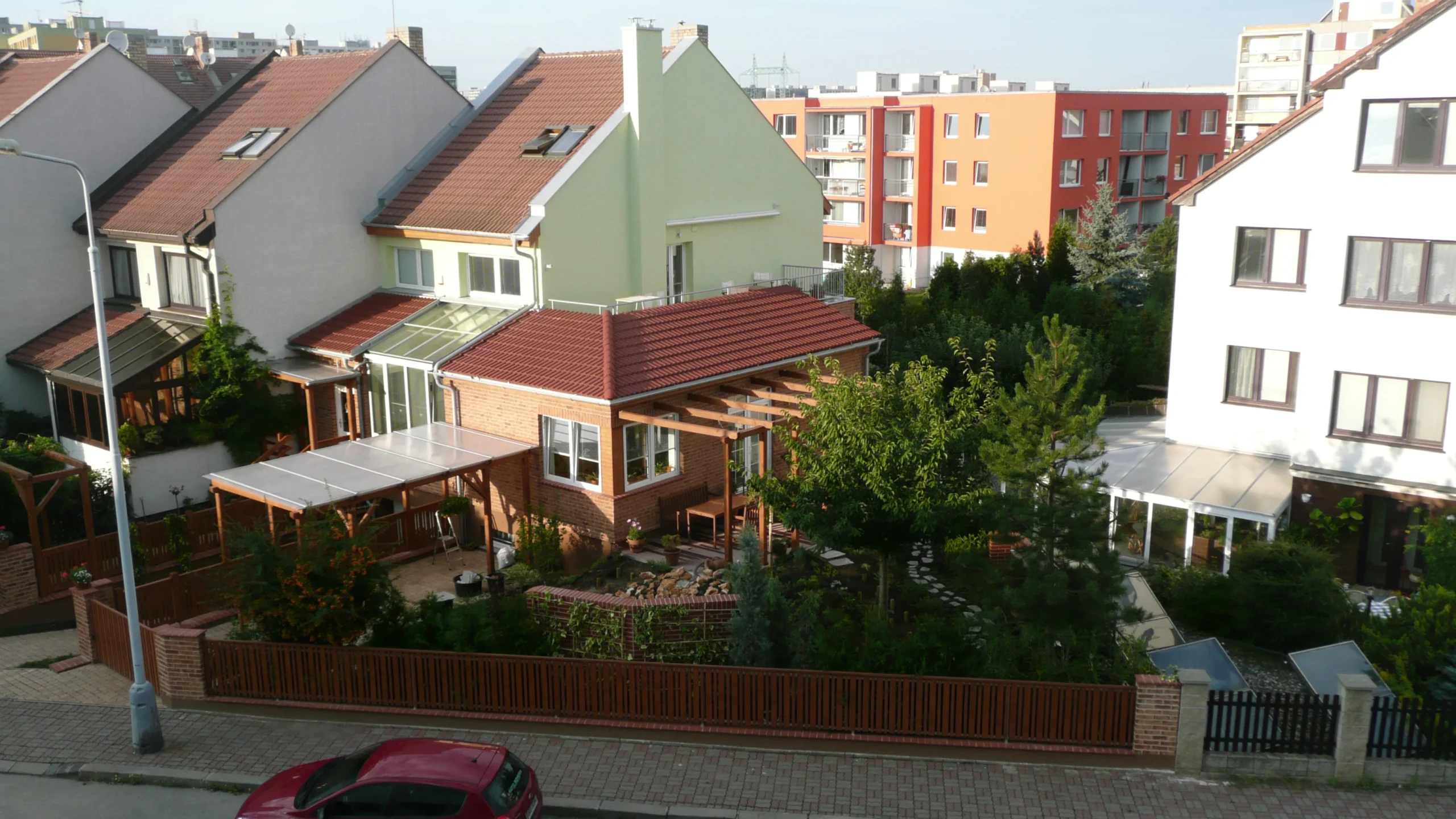 Úzká a dlouhá parcela s kůlnou a chatou v někdejší zahrádkářské kolonii, postupně se proměňující na vilkovou čtvrť.