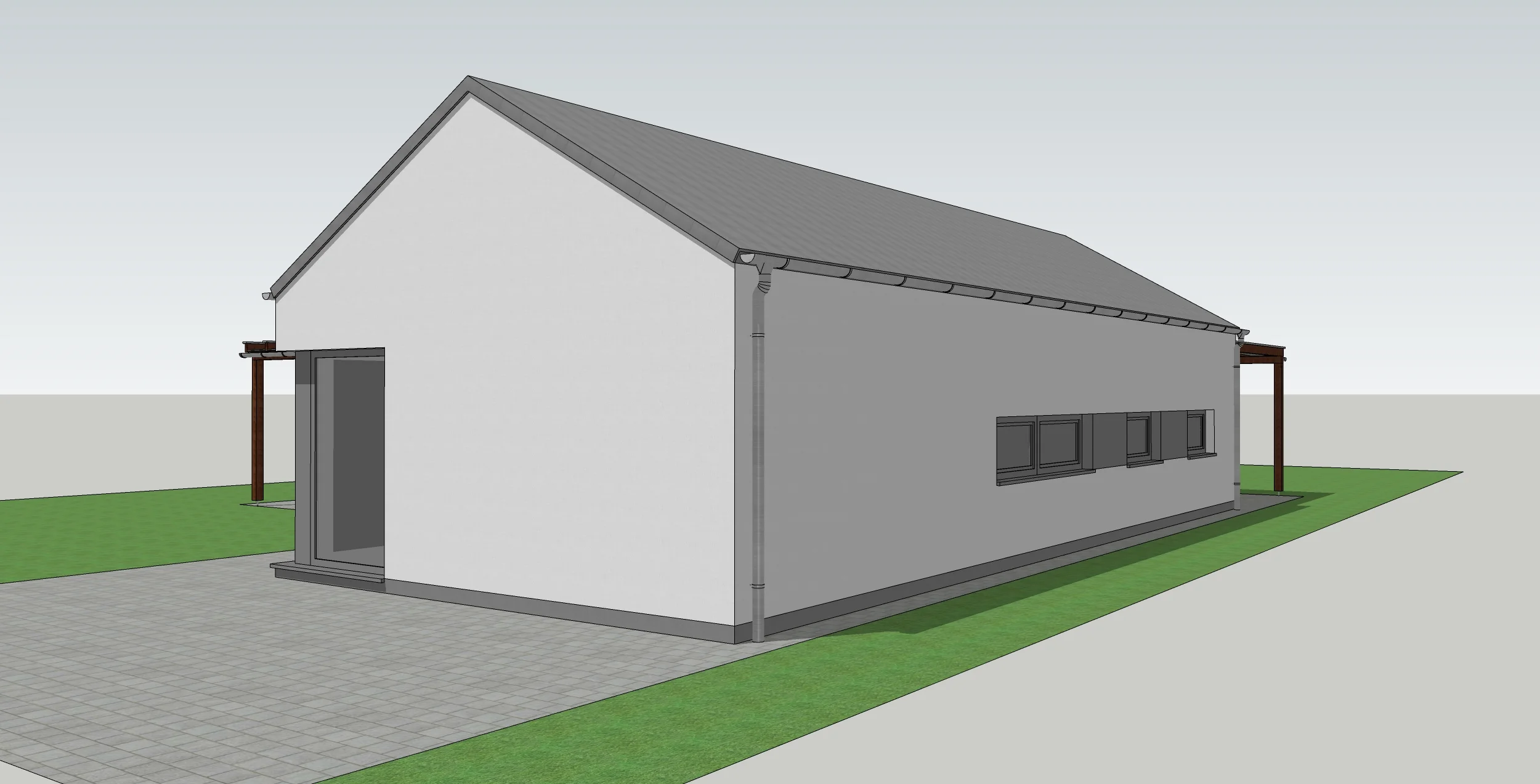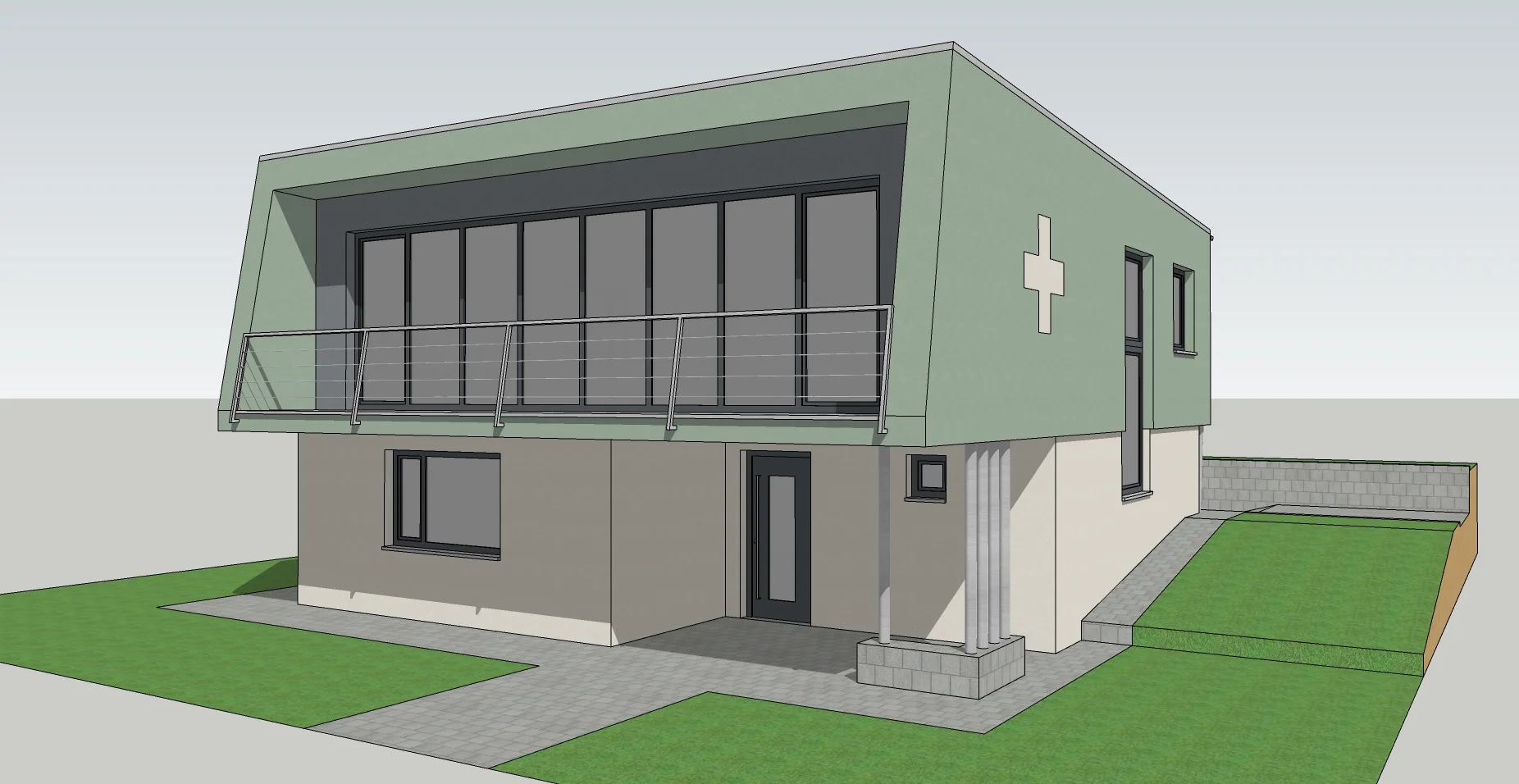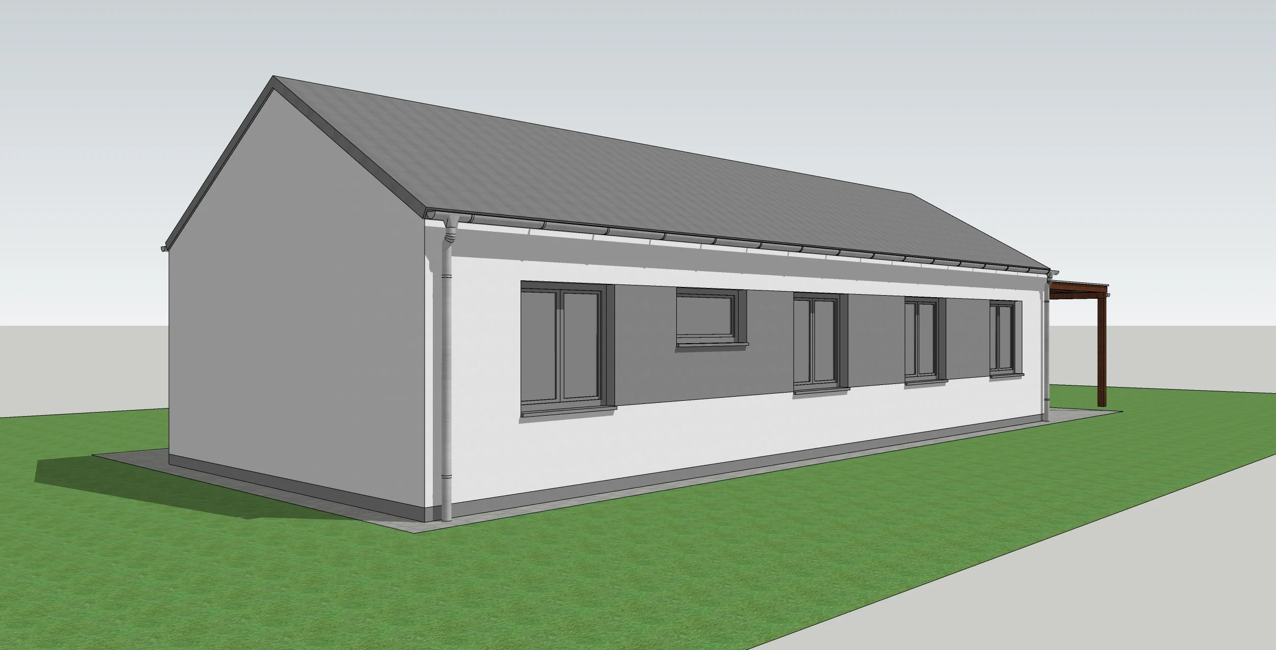 Rodinný dům s obdélníkovým půdorysem a sedlovou střechou, zasazený do svahu ve volné krajině.