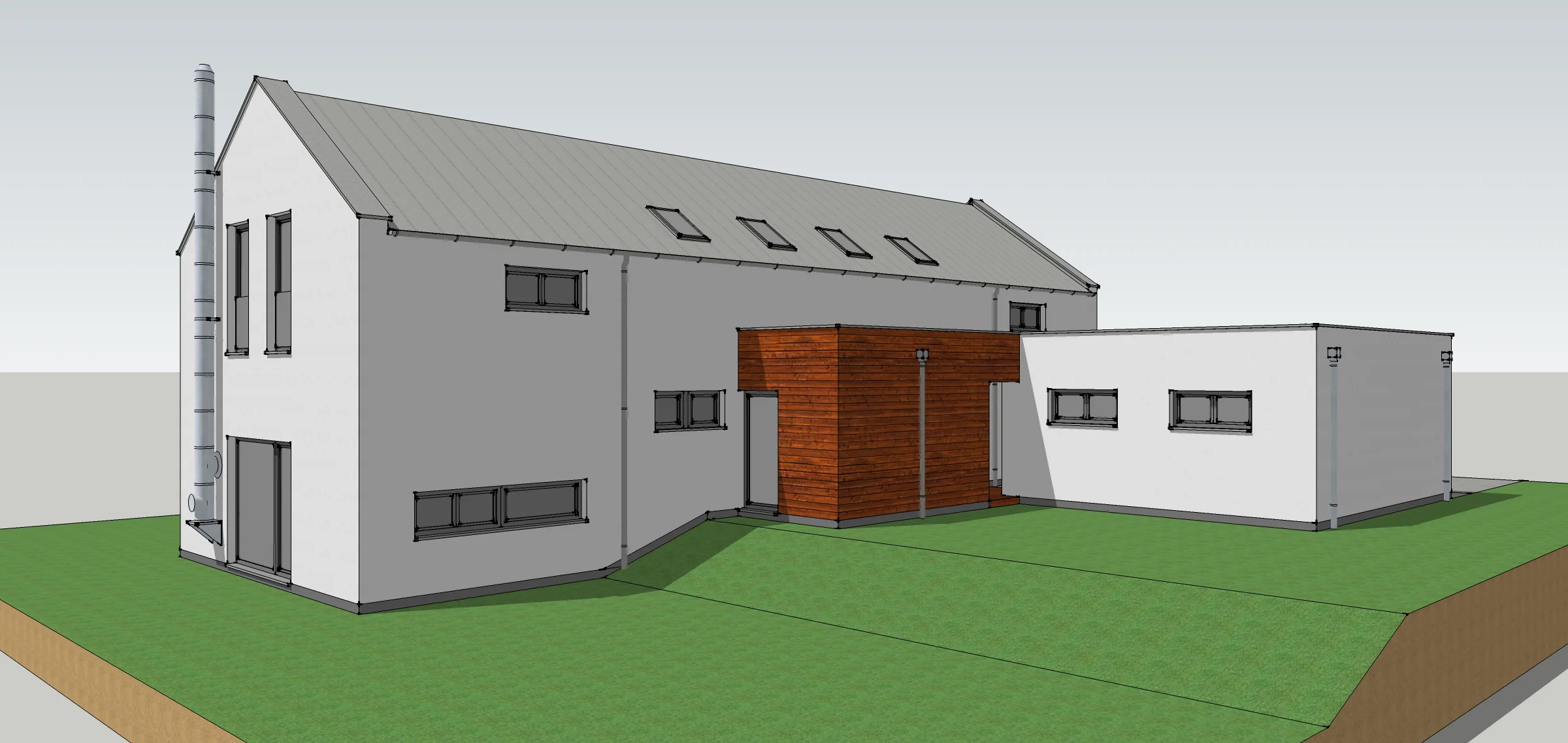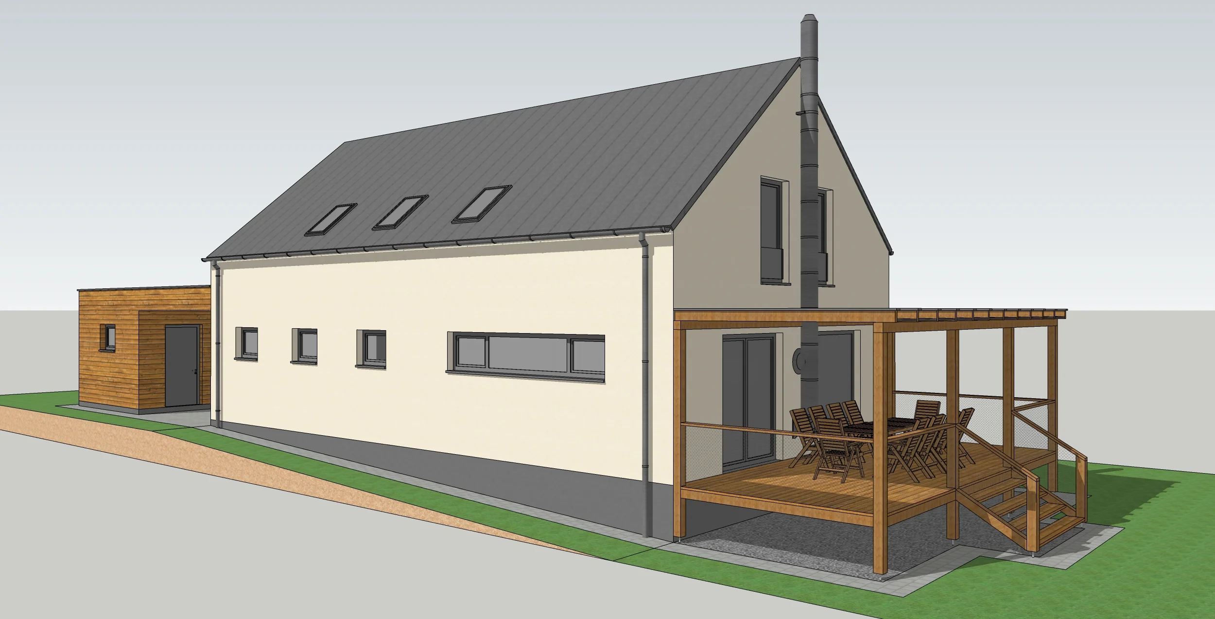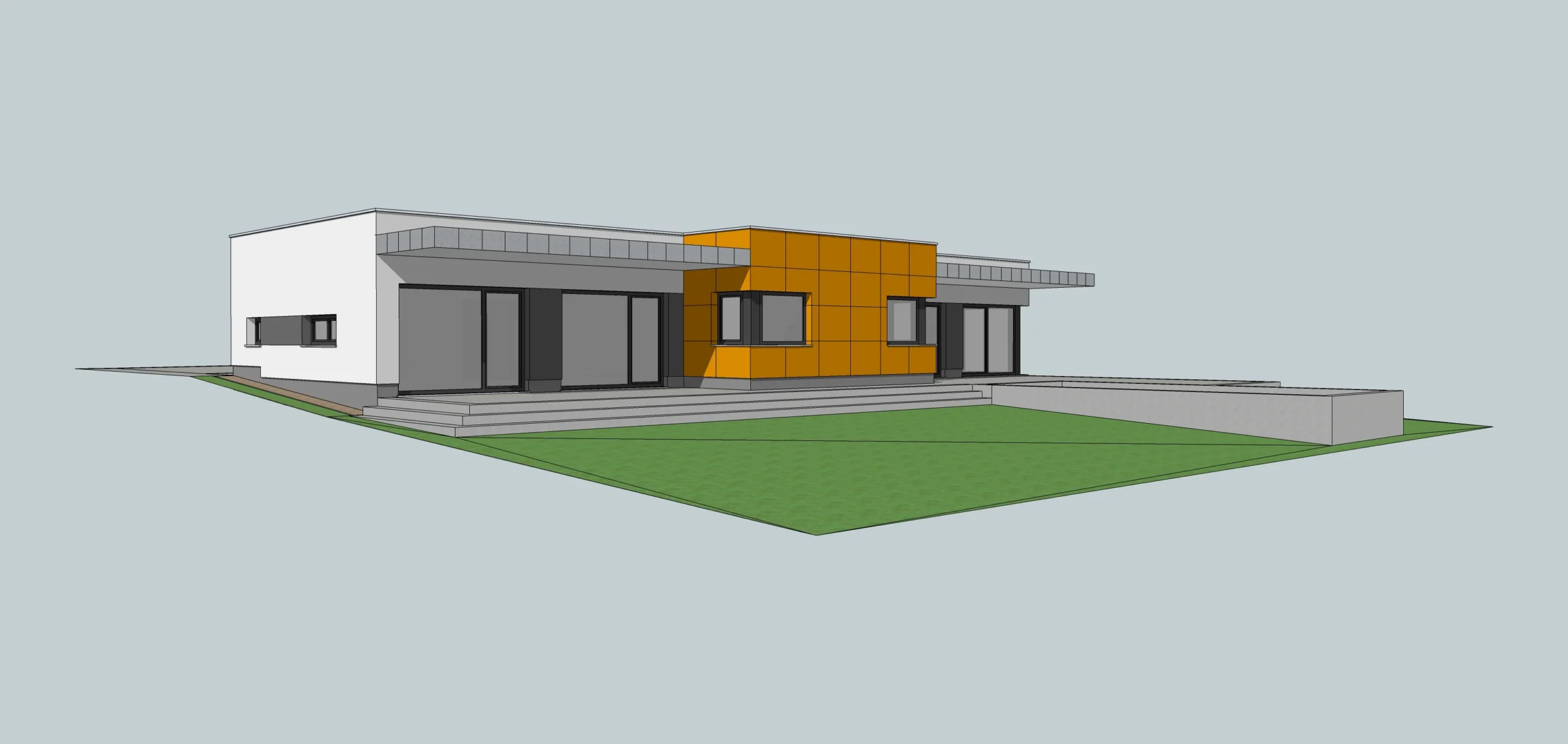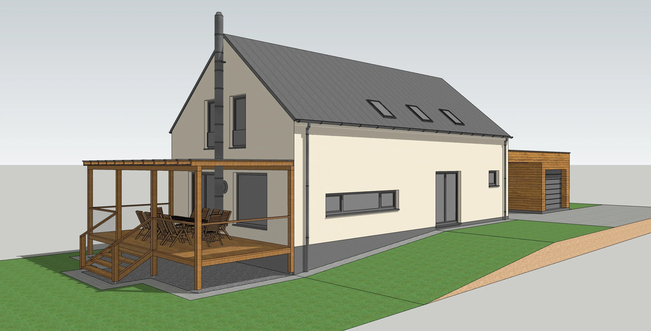 Rodinný dům s obdélníkovým půdorysem a sedlovou střechou, zasazený do svahu ve volné krajině.