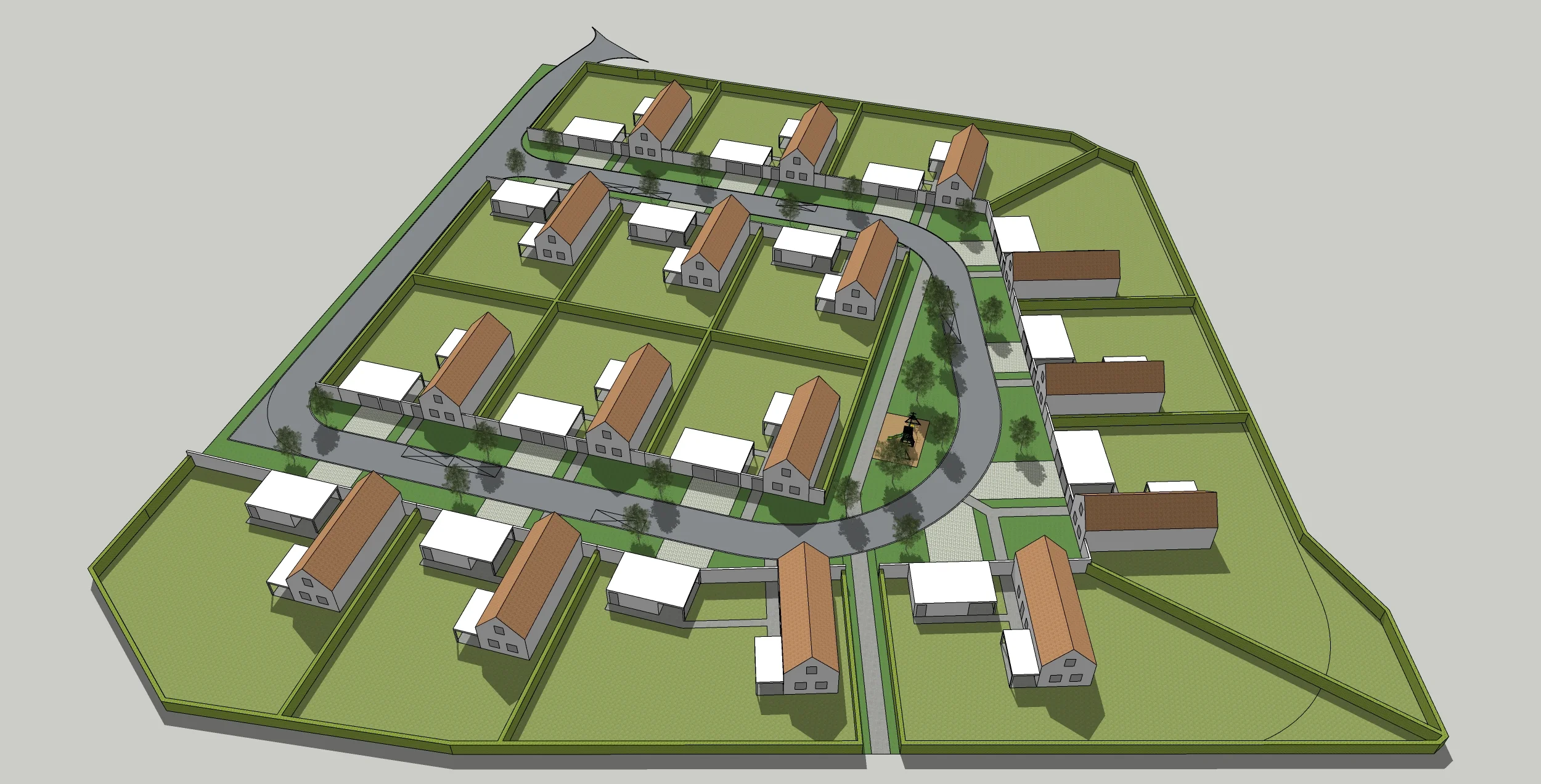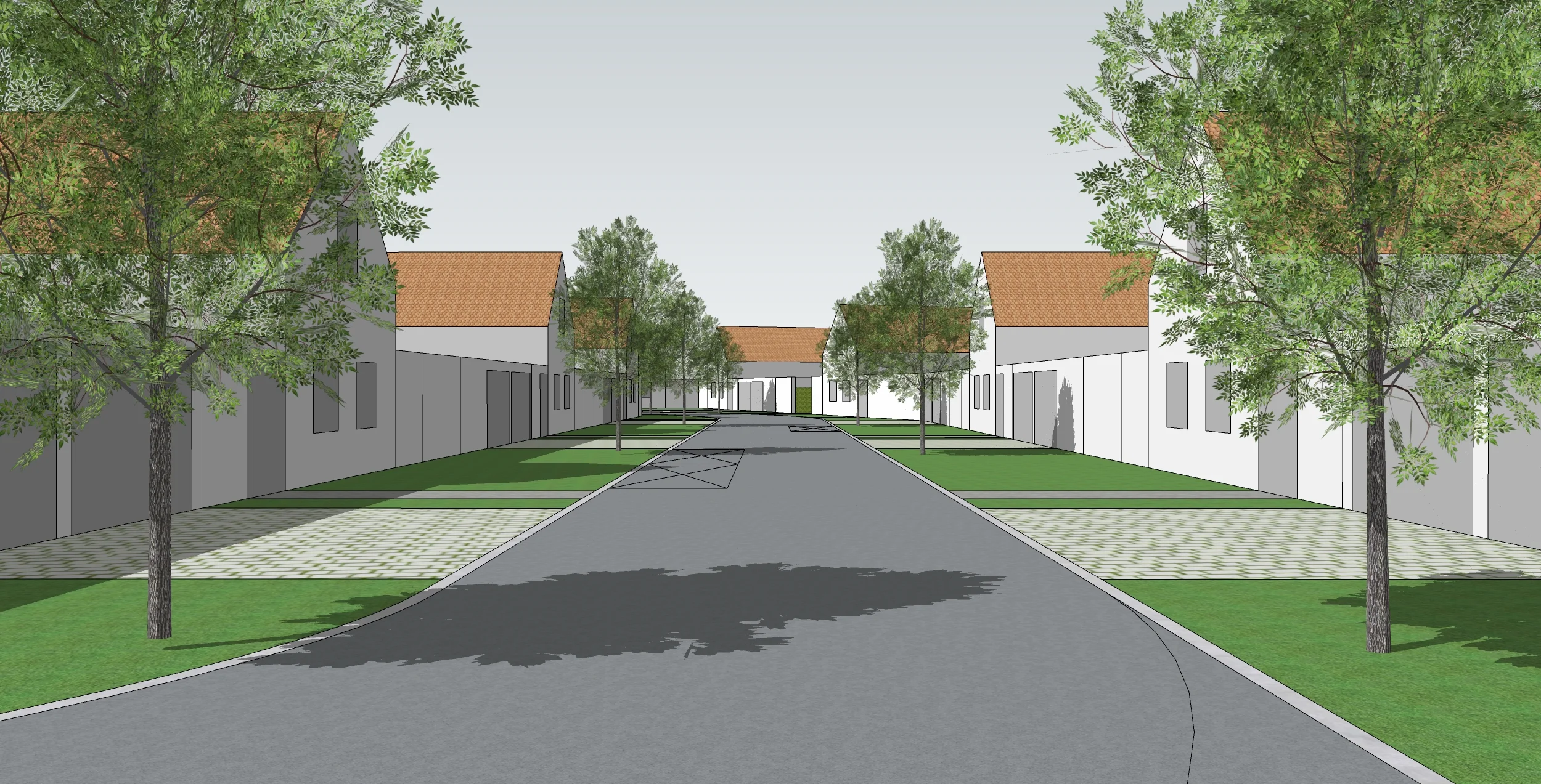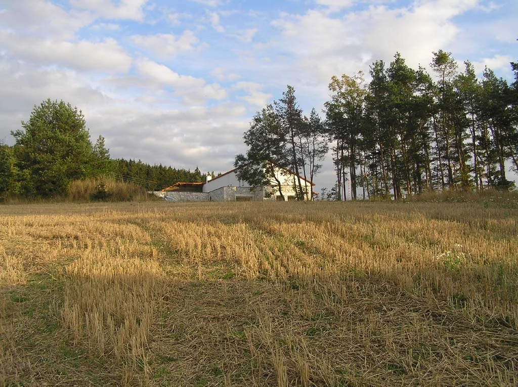Vilka s pultovými střechami a pasivním režimem uvnitř. Snaha o aluzi lehkosti a nenápadnosti v krajině sousedící s nádherným pietním parkem, zatíženým bolestnou vzpomínkou.